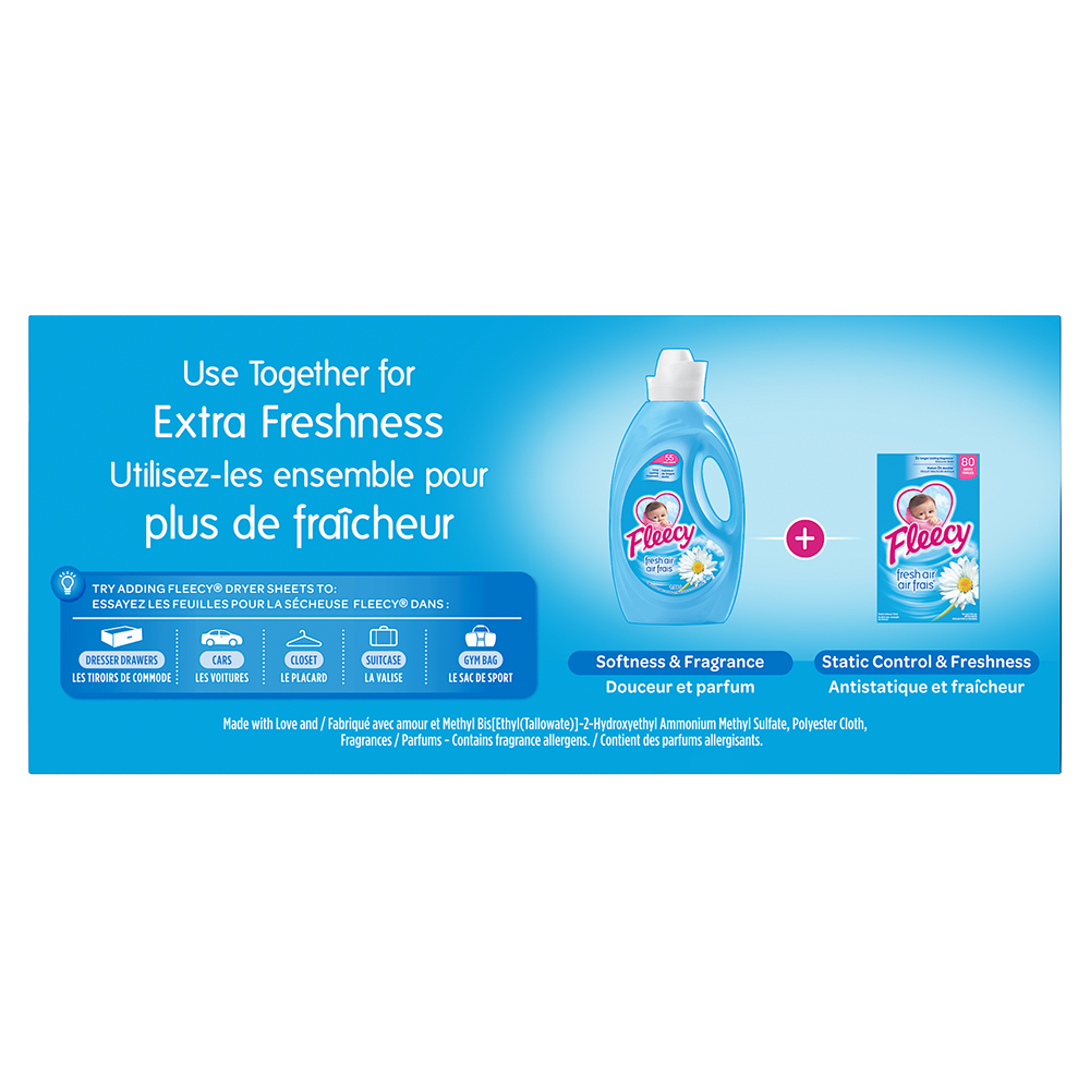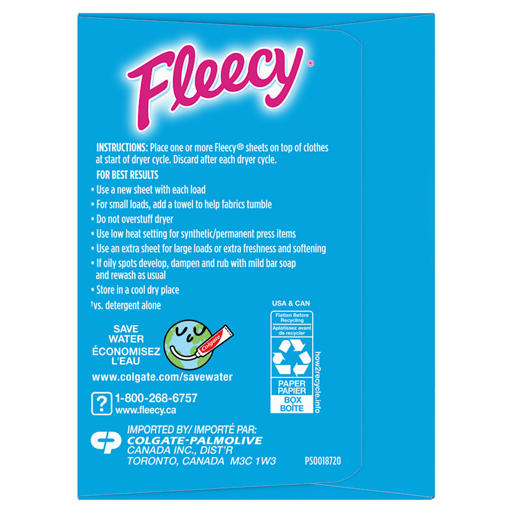 Product Title Fleecy Fabric Softener Dryer Sheets, Fresh Air, 120 sheets SKU 312304 SKU eCommerce Name Fleecy Fabric Softener Dryer Sheets, Fresh Air, 120 sheets Consumer Unit - GTIN 00058000006096 Case - GTIN 10058000006093 Product Category Home Care Product Sub Category FC Sheets Brand Fleecy Product Sub Brand Fleecy Sheets FC Consumer Unit Gross Weight 260.000 GR / 0.260 Consumer Unit Net Weight 0.233 KG / 0.514 LB Consumer Unit Length 11.000 MM / 0.433 IN Consumer Unit Width 18.000 MM / 0.709 IN Consumer Unit Height 79.000 MM / 3.110 IN Consumer Unit Volume 0.016 C8 / 0.001 CF Product Title Fleecy Fabric Softener Dryer Sheets, Fresh Air, 120 sheets eCommerce Copy- Long Description There's nothing like the smell of fresh clean clothes. Now you can have that fresh scent every day with Fleecy Fresh Air dryer sheets. Fleecy Fresh Air has that fresh outdoor fragrance your family loves with all the softness and static control you trust. Keywords (eCommerce) fleecy, flecy, fleecie, fleece, laundry, loads, softner, laundry, best, softness, freshness, best fragrance, softening, laundry, laundry detergent, laundry supplies, bedding, aroma, value, softens, bed sheets, towels, great smell, soothing, long lasting, sensitive, skin, washer, clothes, flowery OS Amazon Product Title Fleecy Dryer Sheets, Fabric Softener, Fresh Air Scent, 120 Sheets OS Amazon Product Description Experience the refreshing essence of Fleecy Dryer Sheets in Fresh Air Scent, designed to transform your laundry with the invigorating smell of the outdoors. Each box contains 120 sheets, each meticulously crafted to enhance your fabrics with irresistible softness and a delightful fresh air fragrance. These fabric softener dryer sheets are your ally in achieving perfectly soft, wonderfully scented linens every time. Fleecy Dryer Sheets are engineered not only to leave a fresh outdoor fragrance but also to help control static. They effectively repel lint and hair, ensuring your garments remain clean and smooth. For those who demand comprehensive fabric care, use both Fleecy liquid fabric softener and Fleecy dryer sheets for freshness and added static control (1). This combination maximizes freshness and gives your family’s laundry an irresistible softness and a long-lasting, fresh scent. Additionally, for a continuous touch of freshness, place these fabric conditioner dryer sheets in dresser drawers, closets, suitcases, or gym bags. Choose Fleecy Dryer Sheets for a more enjoyable and scent-enhanced laundry routine, where the simplicity of nature meets the comfort of your home. (1) when used with Fleecy Liquid Fabric Softener OS Amazon Bullet 1 One 120 count box of Fleecy Dryer Sheets, Fabric Conditioner, Fresh Air Scent OS Amazon Bullet 2 Infused with a fresh air scent to elevate your laundry experience OS Amazon Bullet 3 Engineered to leave a fresh outdoor fragrance and help control static OS Amazon Bullet 4 They effectively repel lint and hair, ensuring your fabrics remain clean and smooth OS Amazon Bullet 5 Our innovative formula provides a dual benefit: it softens your fabrics and infuses them with a freshness that lasts OS Walmart Product Title Fleecy Dryer Sheets, Fabric Softener, Fresh Air Scent, 120 Sheets OS Walmart Product Description Experience the refreshing essence of Fleecy Dryer Sheets in Fresh Air Scent, designed to transform your laundry with the invigorating smell of the outdoors. Each box contains 120 sheets, each meticulously crafted to enhance your fabrics with irresistible softness and a delightful fresh air fragrance. These fabric softener dryer sheets are your ally in achieving perfectly soft, wonderfully scented linens every time. Fleecy Dryer Sheets are engineered not only to leave a fresh outdoor fragrance but also to help control static. They effectively repel lint and hair, ensuring your garments remain clean and smooth. Our innovative formula provides a dual benefit: it softens your fabrics and infuses them with a freshness that lasts twice as long. For those who demand comprehensive fabric care, use both Fleecy liquid fabric softener and Fleecy dryer sheets for freshness and added static control (1). This combination maximizes freshness and gives your family’s laundry an irresistible softness and a long-lasting, fresh scent. Additionally, for a continuous touch of freshness, place these fabric conditioner dryer sheets in dresser drawers, closets, suitcases, or gym bags. Choose Fleecy Dryer Sheets for a more enjoyable and scent-enhanced laundry routine, where the simplicity of nature meets the comfort of your home. (1) when used with Fleecy Liquid Fabric Softener OS Walmart Bullet 1 One 120 count box of Fleecy Dryer Sheets, Fabric Conditioner, Fresh Air Scent OS Walmart Bullet 2 Infused with a fresh air scent to elevate your laundry experience OS Walmart Bullet 3 Engineered to leave a fresh outdoor fragrance and help control static OS Walmart Bullet 4 They effectively repel lint and hair, ensuring your fabrics remain clean and smooth OS Walmart Bullet 5 Our innovative formula provides a dual benefit: it softens your fabrics and infuses them with a freshness that lasts OS Walmart Bullet 6 For comprehensive fabric care, use both Fleecy liquid fabric softener and Fleecy dryer sheets for freshness and added static control (1) OS Walmart Bullet 7 This combination maximizes freshness and gives your family’s laundry an irresistible softness and a long-lasting, fresh scent OS Loblaws Product Title Dryer Sheets, Fabric Softener, Fresh Air Scent, 120 Sheets OS Loblaws Product Description Experience the refreshing essence of Fleecy Dryer Sheets in Fresh Air Scent, designed to transform your laundry with the invigorating smell of the outdoors. Each box contains 120 sheets, each meticulously crafted to enhance your fabrics with irresistible softness and a delightful fresh air fragrance. Our innovative formula provides a dual benefit: it softens your fabrics and infuses them with a freshness that lasts twice