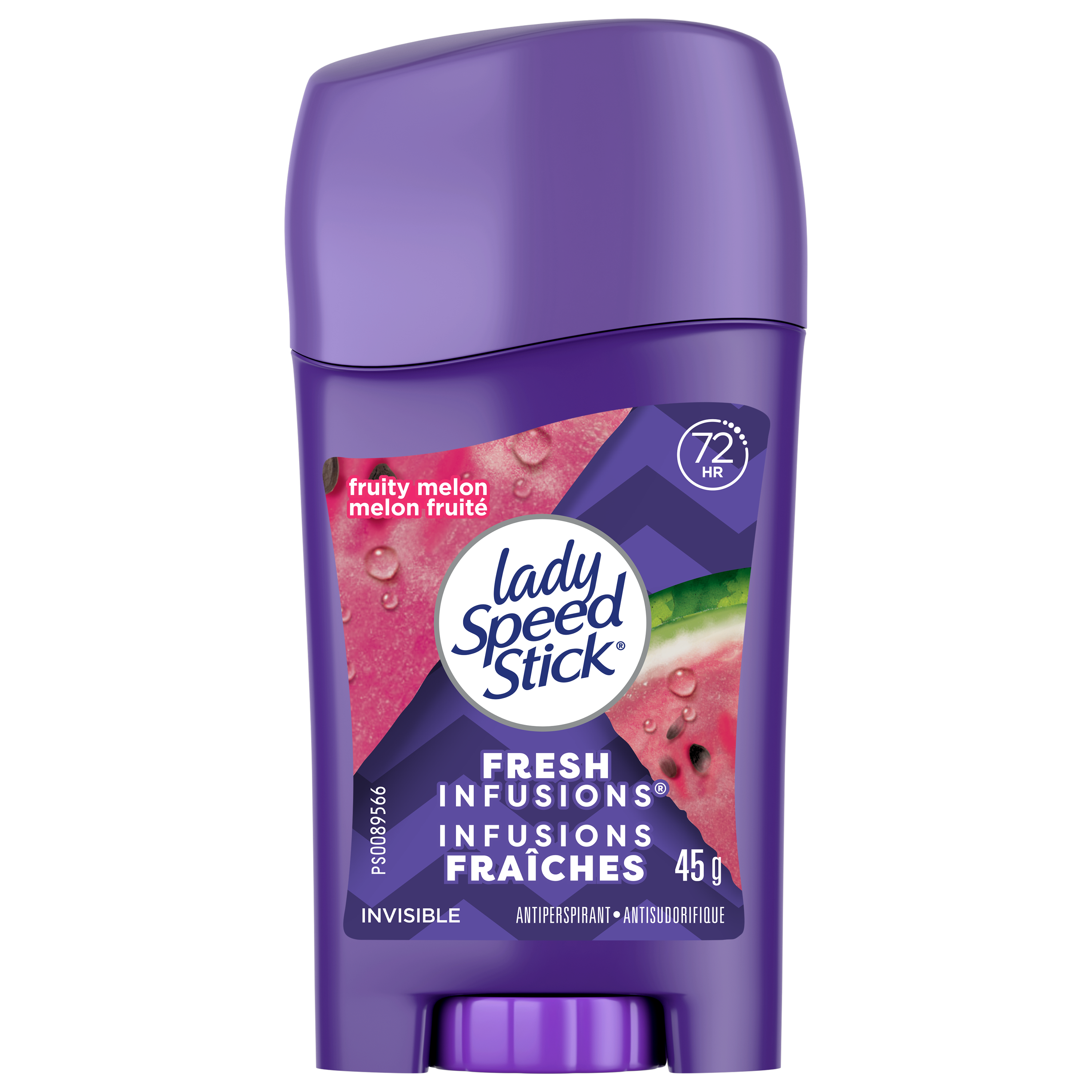 Product Title Lady Speed Stick Fresh Infusions Antiperspirant Deodorant for Women, 72 HR Sweat & Odor Protection, Invisible Dry, Fruity Melon Scent, 45 g Stick SKU 312519 Consumer Unit - GTIN 00058000006843 Case - GTIN 10058000006840 Product Category Personal Care Product Sub Category AP > Deo Brand Lady Speed Stick Product Sub Brand Lady Speed Stick Fresh Infusion AP/Deo Consumer Unit Gross Weight 0.091 KG / 0.201 LB Consumer Unit Net Weight 0.045 KG / 0.099 LB Consumer Unit Length 31.000 MM / 1.220 IN Consumer Unit Width 57.000 MM / 2.244 IN Consumer Unit Height 114.000 MM / 4.488 IN Consumer Unit Volume 0.198 C8 / 0.007 CF Product Title Lady Speed Stick Fresh Infusions Antiperspirant Deodorant for Women, 72 HR Sweat & Odor Protection, Invisible Dry, Fruity Melon Scent, 45 g Stick Product Description Lady Speed Stick Fresh Infusions Antiperspirant Deodorant Stick is your trusted solution for all-day protection and confidence. Designed specifically for women, this antiperspirant delivers 72 HR sweat and odor protection, with a Fruity Melon scent that keeps you feeling dry and confident throughout your day. Engineered for comfort and control, the unique comfort guard applicator delivers a smooth, precise glide and even coverage every time. With invisible dry protection, Lady Speed Stick keeps you dry and confident without leaving messy residue, so you can focus on your day instead of worrying about sweat marks. Whether you’re conquering the office, hitting the gym, or heading out after hours, Lady Speed Stick keeps you covered with premium performance you can rely on. Elevate your grooming routine with antiperspirant deodorant protection that helps you feel confident in any situation with Lady Speed Stick deodorant for women. Bullet 1 Includes one 45 g stick of Speed Stick Fresh Infusions Antiperspirant Deodorant For Women, Fruity Melon Scent Bullet 2 Experience a refreshing Fruity Melon scent that keeps you feeling clean and confident Bullet 3 Powered by long‑lasting antiperspirant protection, this solid stick delivers 72 hour sweat and odor protection Bullet 4 Enjoy invisible dry protection that lets you wear what you want, when you want, without concern about sweat marks Bullet 5 This women's antiperspirant includes a unique comfort guard applicator, ensuring a smooth application process Bullet 6 Reliable performance for gym sessions, busy workdays, and nights out—designed for women and ideal for active lifestyles OS Amazon Product Title Lady Speed Stick Fresh Infusions Antiperspirant Deodorant for Women, 72 HR Sweat & Odor Protection, Invisible Dry, Fruity Melon Scent, 45 g Stick OS Amazon Product Description Lady Speed Stick Fresh Infusions Antiperspirant Deodorant Stick is your trusted solution for all-day protection and confidence. Designed specifically for women, this antiperspirant delivers 72 HR sweat and odor protection, with a Fruity Melon scent that keeps you feeling dry and confident throughout your day. Engineered for comfort and control, the unique comfort guard applicator delivers a smooth, precise glide and even coverage every time. With invisible dry protection, Lady Speed Stick keeps you dry and confident without leaving messy residue, so you can focus on your day instead of worrying about sweat marks. Whether you’re conquering the office, hitting the gym, or heading out after hours, Lady Speed Stick keeps you covered with premium performance you can rely on. Elevate your grooming routine with antiperspirant deodorant protection that helps you feel confident in any situation with Lady Speed Stick deodorant for women. OS Amazon Bullet 1 WHAT'S INCLUDED: One 45 g stick of Speed Stick Fresh Infusions Antiperspirant Deodorant For Women, Fruity Melon Scent OS Amazon Bullet 2 DRY & FRESH: Enjoy invisible dry protection with a Fruity Melon scent that lets you wear what you want all day long while feeling clean and confident OS Amazon Bullet 3 72 HR PROTECTION: Powered by long‑lasting antiperspirant protection, this solid stick delivers 72 hour sweat and odor protection OS Amazon Bullet 4 SMOOTH APPLICATION: This women's antiperspirant includes a unique comfort guard applicator, ensuring a smooth application process, allowing you to glide through your grooming routine with ease OS Amazon Bullet 5 EVERYDAY READY: Reliable performance for gym sessions, busy workdays, and nights out—designed for women and ideal for active lifestyles OS Walmart Product Title Lady Speed Stick Fresh Infusions Antiperspirant, Fruity Melon Scent, 45 g OS Walmart Product Description Lady Speed Stick Fresh Infusions Antiperspirant Deodorant Stick is your trusted solution for all-day protection and confidence. Designed specifically for women, this antiperspirant delivers 72 HR sweat and odor protection, with a Fruity Melon scent that keeps you feeling dry and confident throughout your day. Engineered for comfort and control, the unique comfort guard applicator delivers a smooth, precise glide and even coverage every time. With invisible dry protection, Lady Speed Stick keeps you dry and confident without leaving messy residue, so you can focus on your day instead of worrying about sweat marks. Whether you’re conquering the office, hitting the gym, or heading out after hours, Lady Speed Stick keeps you covered with premium performance you can rely on. Elevate your grooming routine with antiperspirant deodorant protection that helps you feel confident in any situation with Lady Speed Stick deodorant for women. OS Walmart Bullet 1 Includes one 1.4 oz stick of Speed Stick Fresh Infusions Antiperspirant Deodorant For Women, Fruity Melon Scent OS Walmart Bullet 2 Experience a refreshing Fruity Melon scent that keeps you feeling clean and confident OS Walmart Bullet 3 Powered by long‑lasting antiperspirant protection, this solid stick delivers 72 hour sweat and odor protection OS Walmart Bullet 4 Enjoy invisible dry protection that lets you wear what you want, when you want, without concern abo