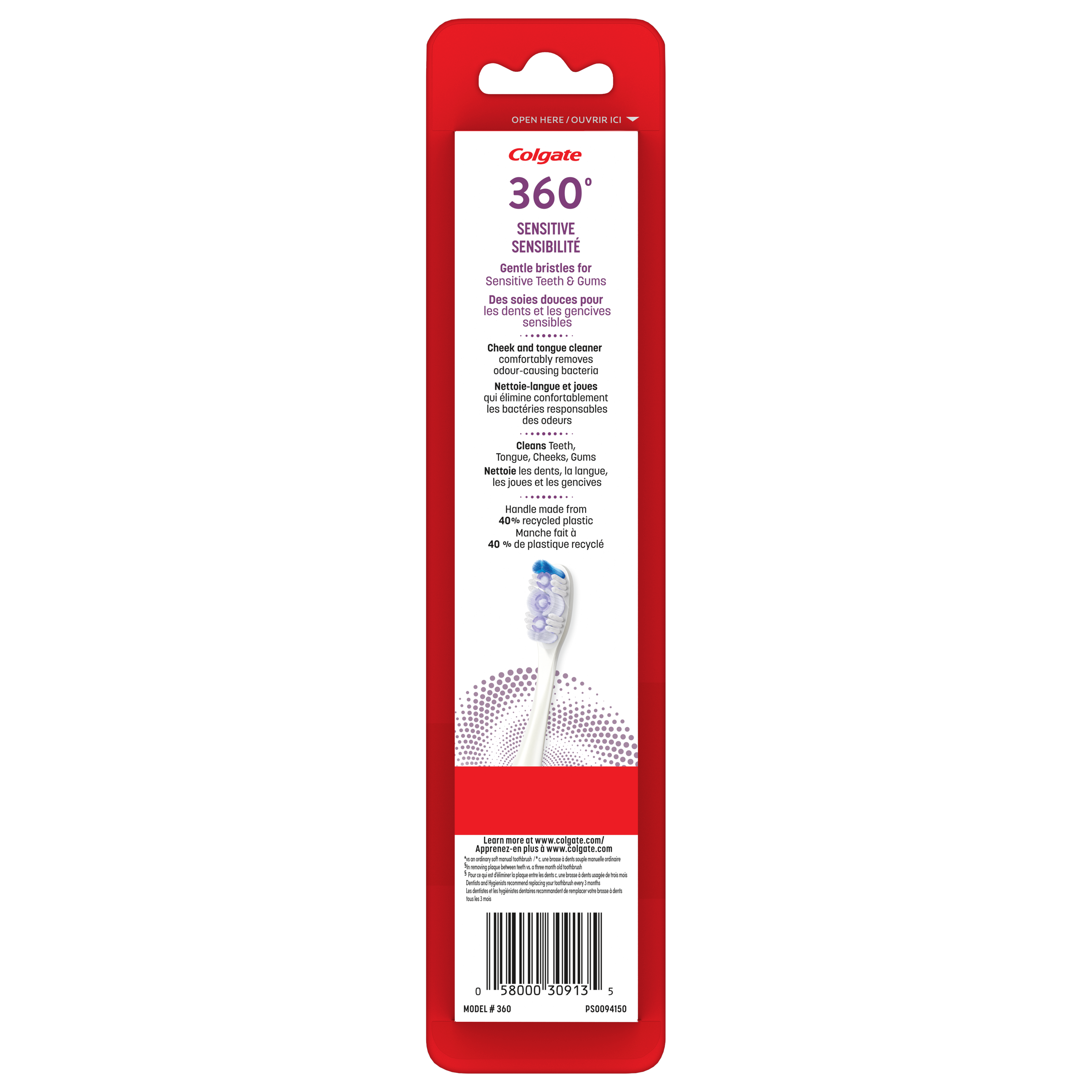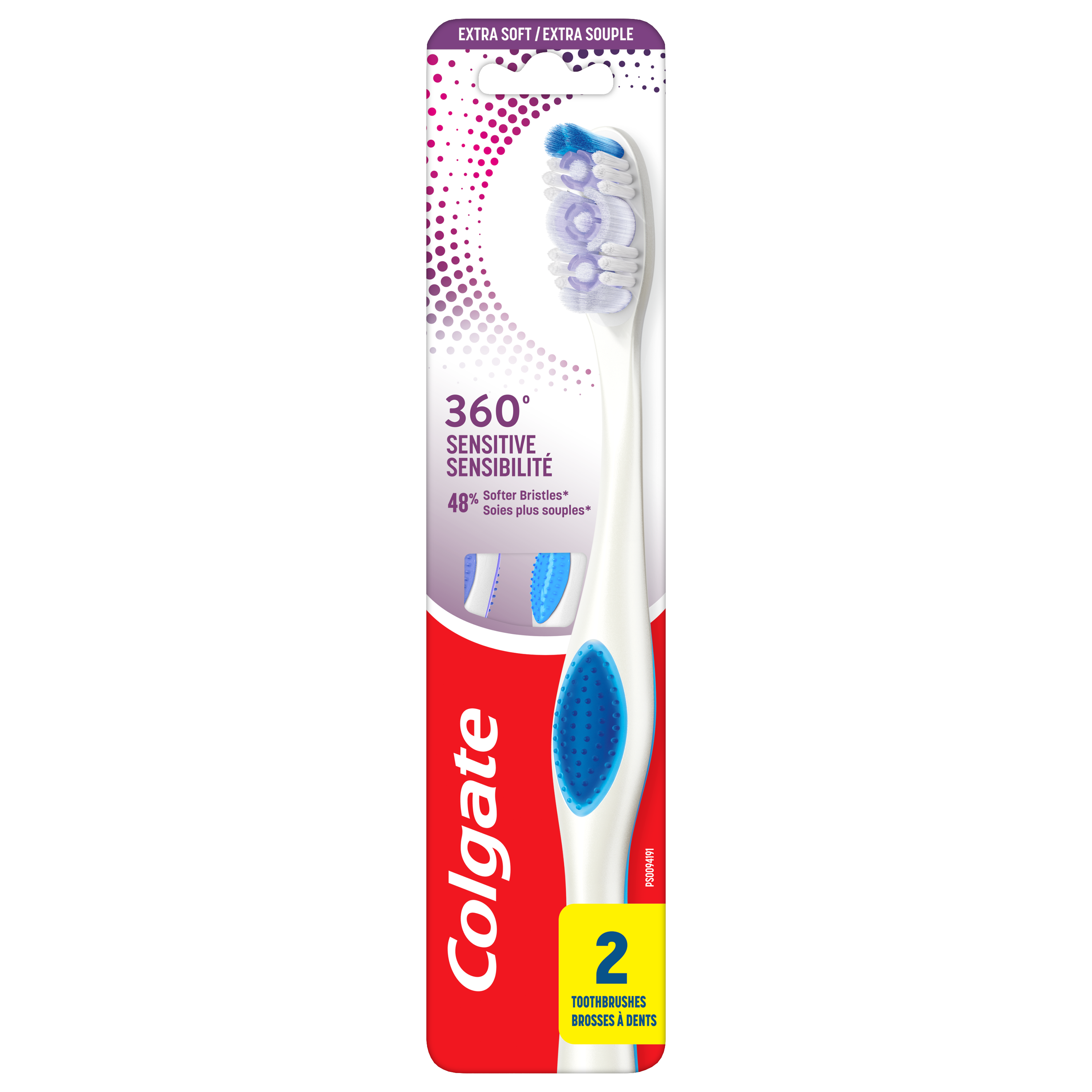 Product Title Colgate 360° Sensitive Pro Relief Toothbrush, Ultra Soft - 2 Count SKU 312906 SKU eCommerce Name Colgate 360° Sensitive Pro Relief Toothbrush, Ultra Soft - 2 Count Consumer Unit - GTIN 00058000309135 Case - GTIN 10058000309132 Product Category Oral Care Product Sub Category Manual TB Brand Colgate Product Sub Brand Colgate 360 Man TB Consumer Unit Gross Weight 0.066 KG / 0.146 LB Consumer Unit Net Weight 0.066 KG / 0.146 LB Consumer Unit Length 24.000 MM / 0.945 IN Consumer Unit Width 53.000 MM / 2.087 IN Consumer Unit Height 222.000 MM / 8.740 IN Consumer Unit Volume 0.255 C8 / 0.009 CF Product Title Colgate 360° Sensitive Pro Relief Toothbrush, Ultra Soft - 2 Count eCommerce Copy Colgate 360⁰ Sensitive Pro-Relief manual toothbrush provides an effective and gentle cleaning, featuring 48% softer bristles for sensitive teeth (vs. an ordinary soft manual toothbrush). eCommerce Copy- Long Description Colgate 360⁰ Sensitive Pro-Relief manual toothbrush provides an effective and gentle cleaning. It is designed with ultra soft cleaning bristles for sensitive teeth & gums and our unique cheek & tongue cleaner comfortably removes odor-causing bacteria. Use Colgate 360⁰ Sensitive Pro-Relief manual toothbrush for a healthier whole mouth clean! (vs. brushing teeth alone with an ordinary flat-trim toothbrush). Keywords (eCommerce) teethbrush, tooth, brush, tooth brush, manual, tongue, cheek, cleaner, scraper, scarper, best, sensitivity, gums, interdental, dentist recommended, gentle, cleans gently, non-electric, mouth care, good, handle, non irritating, ultra soft