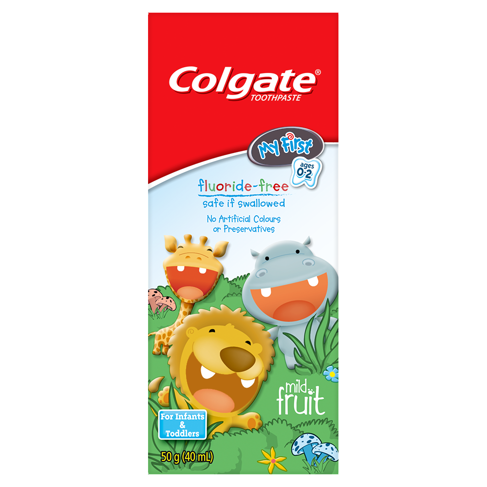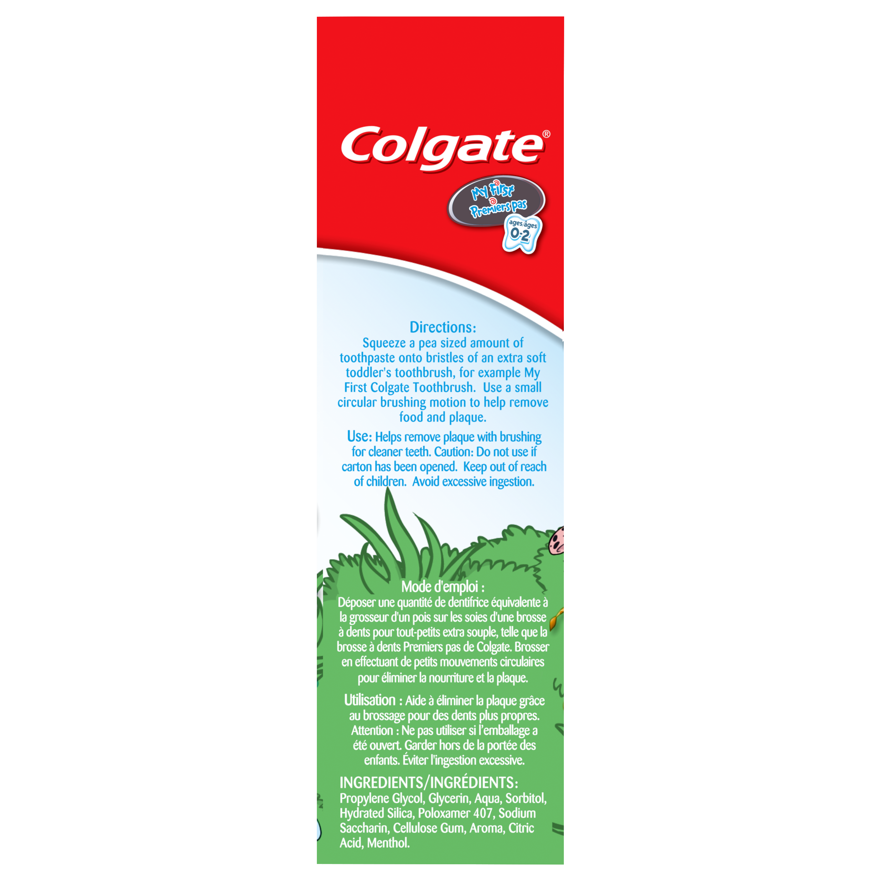Product Title Colgate My First Infant and Toddler Training Toothpaste, Fluoride Free, Mild Fruit Flavour, 40 mL SKU 313196 SKU eCommerce Name Colgate My First Infant & Toddler Fluoride-Free Toothpaste, Mild Fruit, 40 mL, 12 Pack Consumer Unit - GTIN 00058000008328 Case - GTIN 10058000008325 Product Category Oral Care Product Sub Category Toothpaste Brand Colgate Product Sub Brand Colgate Kids TP Consumer Unit Gross Weight 0.078 KG / 0.172 LB Consumer Unit Net Weight 0.050 KG / 0.110 LB Consumer Unit Length 40.000 MM / 1.575 IN Consumer Unit Width 56.000 MM / 2.205 IN Consumer Unit Height 58.000 MM / 2.283 IN Consumer Unit Volume 0.283 C8 / 0.010 CF Product Title Colgate My First Infant and Toddler Training Toothpaste, Fluoride Free, Mild Fruit Flavour, 40 mL Product Description Make brushing time easy and enjoyable for little ones with Colgate My First Infant and Toddler Training Toothpaste. Specially developed for infants and toddlers ages 0-2 years old, this low-foaming fluoride free baby toothpaste gently cleans little teeth and gums and allows for easy cleaning without excess bubbles. Infused with a pleasant, Mild Fruit flavour that is safe if swallowed, this infant toothpaste is designed with both kids and parents in mind and is free from artificial colours and preservatives. The convenient, no-mess toothpaste dispenser means less cleanup for you, and the kids fluoride free toothpaste works with gentle brushing to help remove food and plaque, promoting cleaner teeth. When paired with an extra soft Colgate baby toothbrush and gentle circular motions, this fluoride free training toothpaste helps sweep away food and plaque. Turn daily brushing into a sweet, simple routine for your growing child with Colgate Toddler and Baby Training Toothpaste. eCommerce Copy Colgate My First Baby and Toddler Toothpaste gently cleans teeth and does not contain any artificial colors, fluoride, preservatives, or sodium lauryl sulfate. This baby and toddler toothpaste is safe if swallowed. eCommerce Copy- Long Description Colgate My First Baby and Toddler Toothpaste is a safe fluoride-free formula for the littlest ones at home. This formulation, specially designed for kids under 2 years old, gently cleans teeth and does not contain artificial colors, preservatives, or sodium lauryl sulfate. With a mild fruit flavor, this baby and toddler toothpaste is designed with a convenient stand-up tube with twist off cap for less mess dispensing. Bullet 1 Includes one (1) 40 mL tube of Colgate My First Infant and Toddler Training Toothpaste, Fluoride Free Baby Toothpaste, Mild Fruit Flavour Bullet 2 This fluoride free baby toothpaste is formulated to softly clean baby teeth for children ages 0-2 years old and is designed for no mess dispensing Bullet 3 Use this kids fluoride free toothpaste as a training toothpaste for kids who are still learning how to brush their teeth Bullet 4 Made with both kids and parents in mind, this baby toothpaste is safe if accidentally swallowed for children still learning how to spit Bullet 5 This infant and childrens toothpaste features a subtle Mild Fruit taste to make brushing fun and encourage regular brushing Bullet 6 The low-foaming formula allows for easy cleaning and helps cut down on excess bubbles when brushing Keywords (eCommerce) baby infant toddler toothpaste gluten free sls-free sls free non-fluoride fluoride free toothpaste training tooth paste clean baby teeth fruit flavor gluten free safe no preservatives OS Amazon Product Title Colgate My First Infant and Toddler Training Toothpaste, Fluoride Free Baby Toothpaste, Ages 0 - 24 Months, Safe If Swallowed, Gently Cleans and Removes Plaque with Brushing, Mild Fruit Flavour, 40 mL OS Amazon Product Description Make brushing time easy and enjoyable for little ones with Colgate My First Infant and Toddler Training Toothpaste. Specially developed for infants and toddlers ages 0-2 years old, this low-foaming fluoride free baby toothpaste gently cleans little teeth and gums and allows for easy cleaning without excess bubbles. Infused with a pleasant, Mild Fruit flavour that is safe if swallowed, this infant toothpaste is designed with both kids and parents in mind and is free from artificial colours and preservatives. The convenient, no-mess toothpaste dispenser means less cleanup for you, and the kids fluoride free toothpaste works with gentle brushing to help remove food and plaque, promoting cleaner teeth. When paired with an extra soft Colgate baby toothbrush and gentle circular motions, this fluoride free training toothpaste helps sweep away food and plaque. Turn daily brushing into a sweet, simple routine for your growing child with Colgate Toddler and Baby Training Toothpaste. OS Amazon Bullet 1 PACKAGE INCLUDES: One (1) 40 mL tube of Colgate My First Infant and Toddler Training Toothpaste, Fluoride Free Baby Toothpaste, Mild Fruit Flavour OS Amazon Bullet 2 FOR AGES 0-2 YEARS OLD: This fluoride free baby toothpaste is formulated to softly clean baby teeth for children ages 0-2 years old and is designed for no mess dispensing OS Amazon Bullet 3 FLUORIDE FREE FORMULA: Use this kids fluoride free toothpaste as a training toothpaste for kids who are still learning how to brush their teeth OS Amazon Bullet 4 SAFE IF SWALLOWED: Made with both kids and parents in mind, this baby toothpaste is safe if accidentally swallowed for children still learning how to spit OS Amazon Bullet 5 MILD FRUIT FLAVOUR: This infant and childrens toothpaste features a subtle Mild Fruit taste to make brushing fun and encourage regular brushing OS Walmart Product Title Colgate My First Infant and Toddler Training Toothpaste, Fluoride Free, Mild Fruit Flavour, 40 mL OS Walmart Product Description Make brushing time easy and enjoyable for little ones with Colgate My First Infant and Toddler Training Toothpaste. Specially developed for infants and toddlers ages 0-2 years old, this low-foaming fluoride free baby toothpaste gently cleans little teeth and g