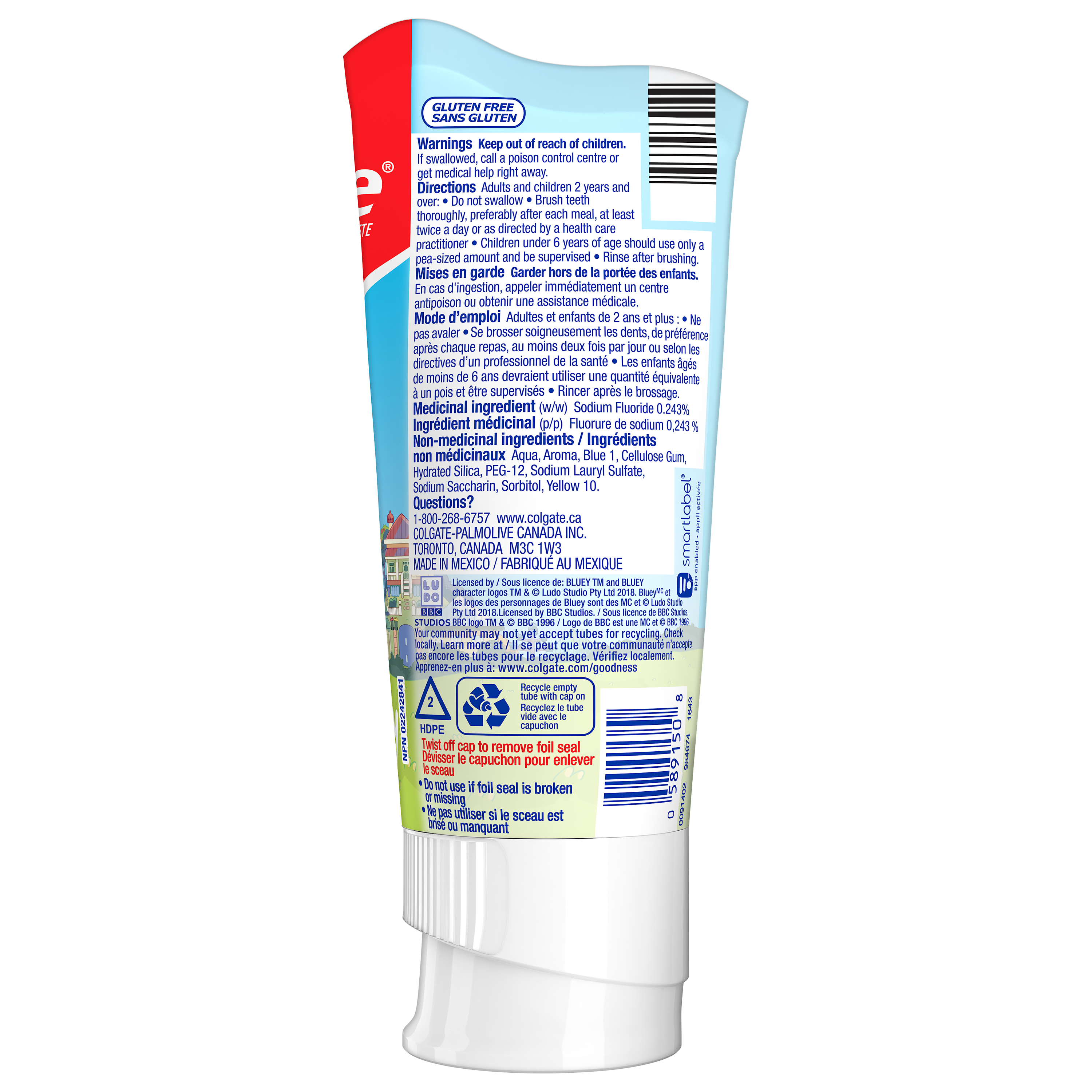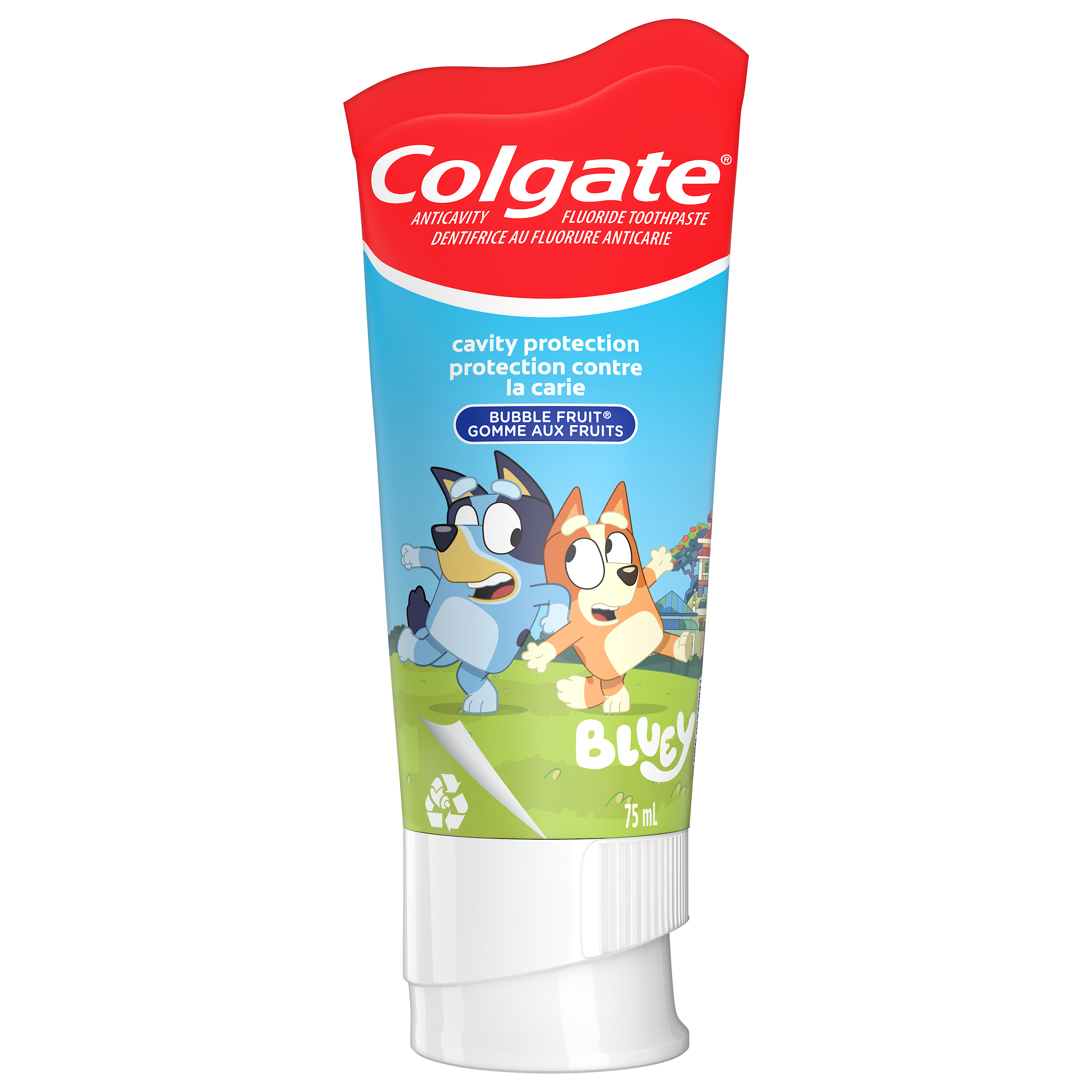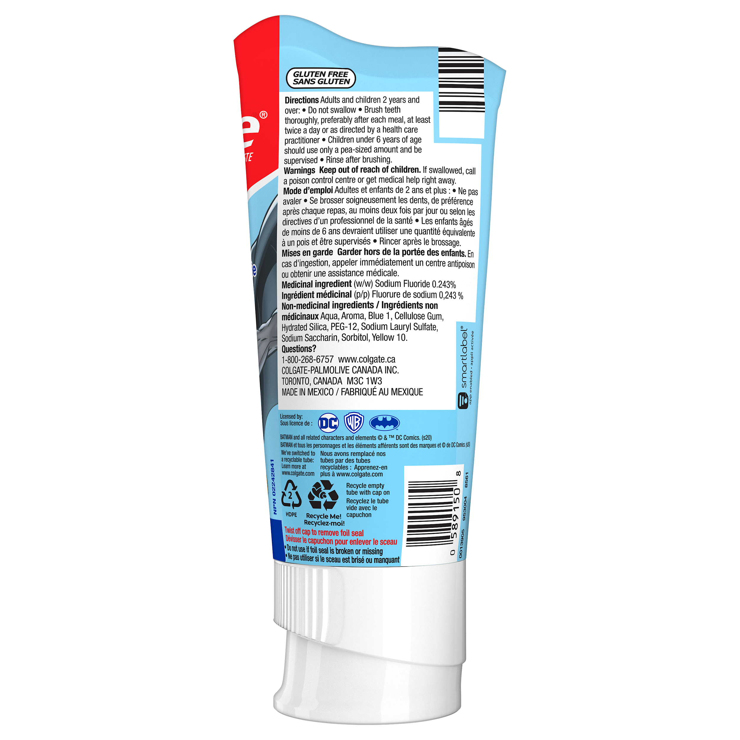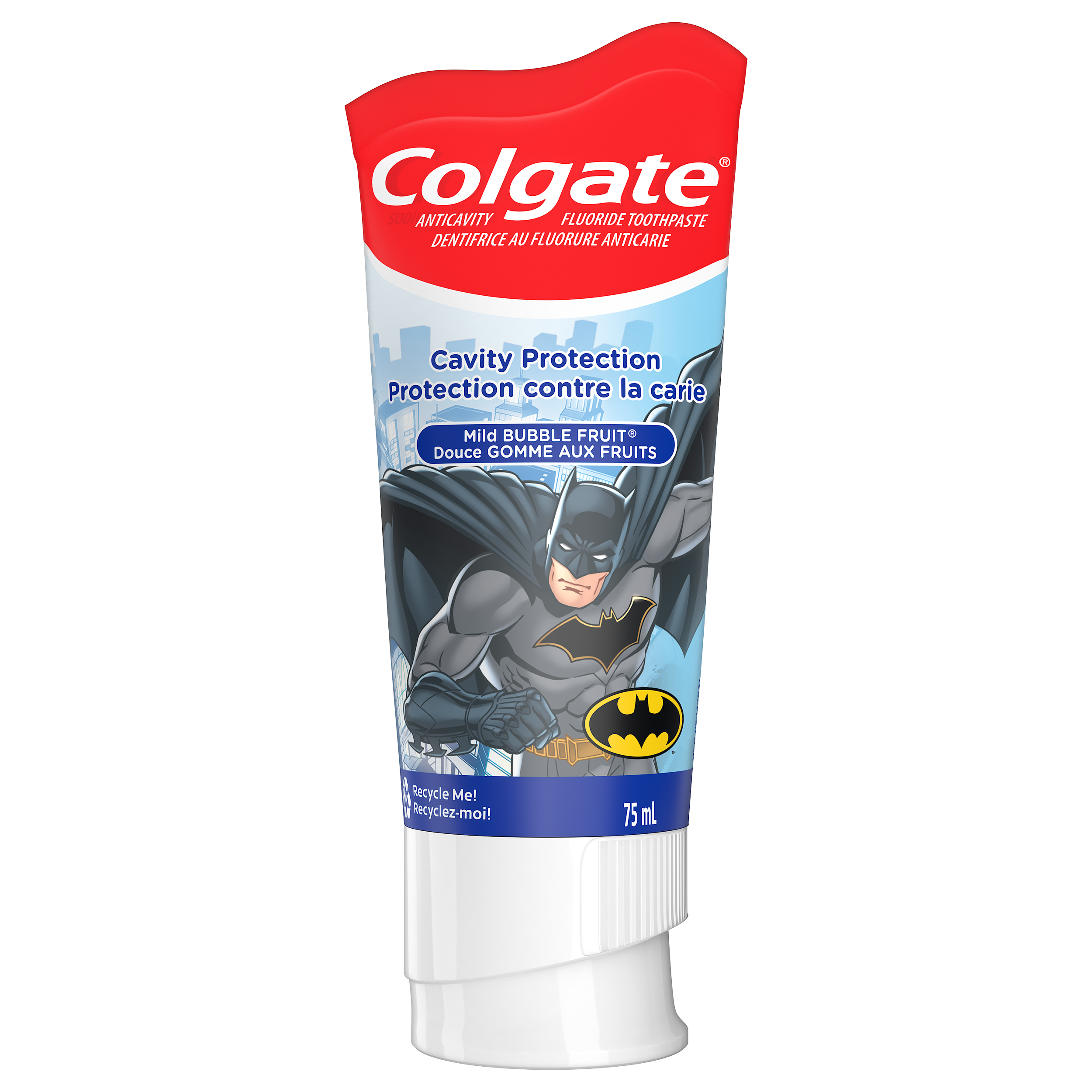 Product Title Colgate Kids Fluoride Toothpaste - Kids Licensed SUT - Mixed Case Boys (Minions, Batman, Minecraft) - 75 mL SKU 313770 SKU eCommerce Name Colgate Kids Fluoride Toothpaste - Kids Licensed SUT - Mixed Case Boys (Minions, Batman, Minecraft) - 75 mL Consumer Unit - GTIN 00058000009158 Case - GTIN 10058000009155 Product Category Oral Care Product Sub Category Toothpaste Brand Colgate Product Sub Brand Colgate Kids TP Consumer Unit Gross Weight 0.112 KG / 0.247 LB Consumer Unit Net Weight 0.100 KG / 0.221 LB Consumer Unit Length 38.000 MM / 1.496 IN Consumer Unit Width 38.000 MM / 1.496 IN Consumer Unit Height 147.000 MM / 5.787 IN Consumer Unit Volume 0.212 C8 / 0.007 CF Product Title Colgate Kids Fluoride Toothpaste - Kids Licensed SUT - Mixed Case Boys (Minions, Batman, Minecraft) - 75 mL Product Description Make brushing time extra fun and exciting for kids with the Colgate Cavity Protection Kids Fluoride Toothpaste Surprise Pack. This surprise kids toothpaste pack features one of three unique character designs inside the box, including Bluey, Minecraft, or Minions, making every unboxing a delightful experience for kids who love surprises. Designed for children ages 2 and older, this kids anticavity toothpaste offers a Mild Bubble Fruit bubblegum toothpaste flavour that kids love to brush with every day. The fluoride kids toothpaste also offers cavity protection. Parents will love that this Colgate kids toothpaste contains fluoride, a clinically proven anticavity ingredient that fights cavities and provides protection for developing teeth. In addition to fighting cavities, this kids fluoride toothpaste is also gentle on kids’ tooth enamel. Plus, parents will appreciate that this kids cavity protection toothpaste is sugar free, gluten free, paraben free, vegan, and contains no preservatives. This kids fluoride toothpaste is ideal for parents who want an effective anticavity toothpaste for their young kids or toddlers. Unbox delight where every pack is a fun surprise with the Colgate Cavity Protection Kids Fluoride Toothpaste Surprise Pack. eCommerce Copy Colgate Kids Toothpaste with Fluoride, Anticavity & Cavity Protection, For Ages 2+, Minions, Batman, and Minecraft. Mild Bubble Fruit Flavour is a fluoride kids enamel toothpaste that helps maintain a healthy smile. Made especially for kids ages 2 and up, this kids anticavity toothpaste provides clinically-proven cavity and enamel protection that protects developing teeth from cavities. This sugar- and gluten-free toothpaste also features fun Minions, Batman, and Minecraft characters, a convenient stand up-tube with flip-top cap and a mild bubble fruit flavour kids will love during brushing. Fun Flavoured Toothpaste Loved by Kids When it comes to dental care, encouraging children to start brushing early and regularly is important. As their oral health care needs are evolving, Colgate Kids Toothpaste with Fluoride, Anticavity & Cavity Protection Toothpaste, For Ages 2+, Minions, Batman, and Minecraft. Mild Bubble Fruit Flavor made especially for kids 2 and up offers an enamel safe children’s toothpaste formula that works on developing teeth. This kids anticavity toothpaste offers cavity and enamel protection, convenient tube packaging and a fun flavour making brushing enjoyable for a lifetime of bright smiles. Healthy Smiles With Colgate At Colgate, we make toothpaste that promotes healthy smiles. Not only because having a healthy smile is important to your overall health, but because when you have a healthy smile, you actually smile more – and that’s a powerful thing. Smiles are the simplest form of optimism, something we need now more than ever. That’s why we’re committed to raising oral healthcare standards everywhere. Bullet 1 Includes one (1) surprise 75 mL tube of Colgate Cavity Protection Kids Fluoride Toothpaste in an exciting Mild Bubble Fruit bubblegum toothpaste flavour Bullet 2 Each surprise kids toothpaste pack contains one of three unique character designs including Bluey, Minecraft, or Minions Bullet 3 You can use this fluoride-formulated kids toothpaste for children ages 2 and up, making this a great toddler toothpaste Bullet 4 This toothpaste for kids contains fluoride, clinically proven to fight against cavities, and strengthen enamel Bullet 5 This kids anticavity toothpaste is gluten free, sugar free, paraben free, vegan, and contains no preservatives Bullet 6 The Mild Bubble Fruit flavour delivers an awesome bubblegum toothpaste flavour that kids love and encourages healthy oral care habits Keywords (eCommerce) toothpaste, tooth paste, child, kid's, children, boys, girls, taste, best, fluoride, safe, flavored, anticavity, kid's, tartar control, not spicy, gentle, sensitive, character OS Amazon Product Title Colgate Cavity Protection Kids Fluoride Toothpaste Surprise Pack, Kids Toothpaste with Bluey, Minecraft, or Minions Design in Each Mystery Pack, Mild Bubble Fruit, Ages 2 and Up, 75 mL OS Amazon Product Description Make brushing time extra fun and exciting for kids with the Colgate Cavity Protection Kids Fluoride Toothpaste Surprise Pack. This surprise kids toothpaste pack features one of three unique character designs inside the box, including Bluey, Minecraft, or Minions, making every unboxing a delightful experience for kids who love surprises. Designed for children ages 2 and older, this kids anticavity toothpaste offers a Mild Bubble Fruit bubblegum toothpaste flavour that kids love to brush with every day. The fluoride kids toothpaste also offers cavity protection. Parents will love that this Colgate kids toothpaste contains fluoride, a clinically proven anticavity ingredient that fights cavities and provides protection for developing teeth. In addition to fighting cavities, this kids fluoride toothpaste is also gentle on kids’ tooth enamel. Plus, parents will appreciate that this kids cavity protection toothpaste is sugar free, gluten free, paraben free, vegan, and contains no preserv
