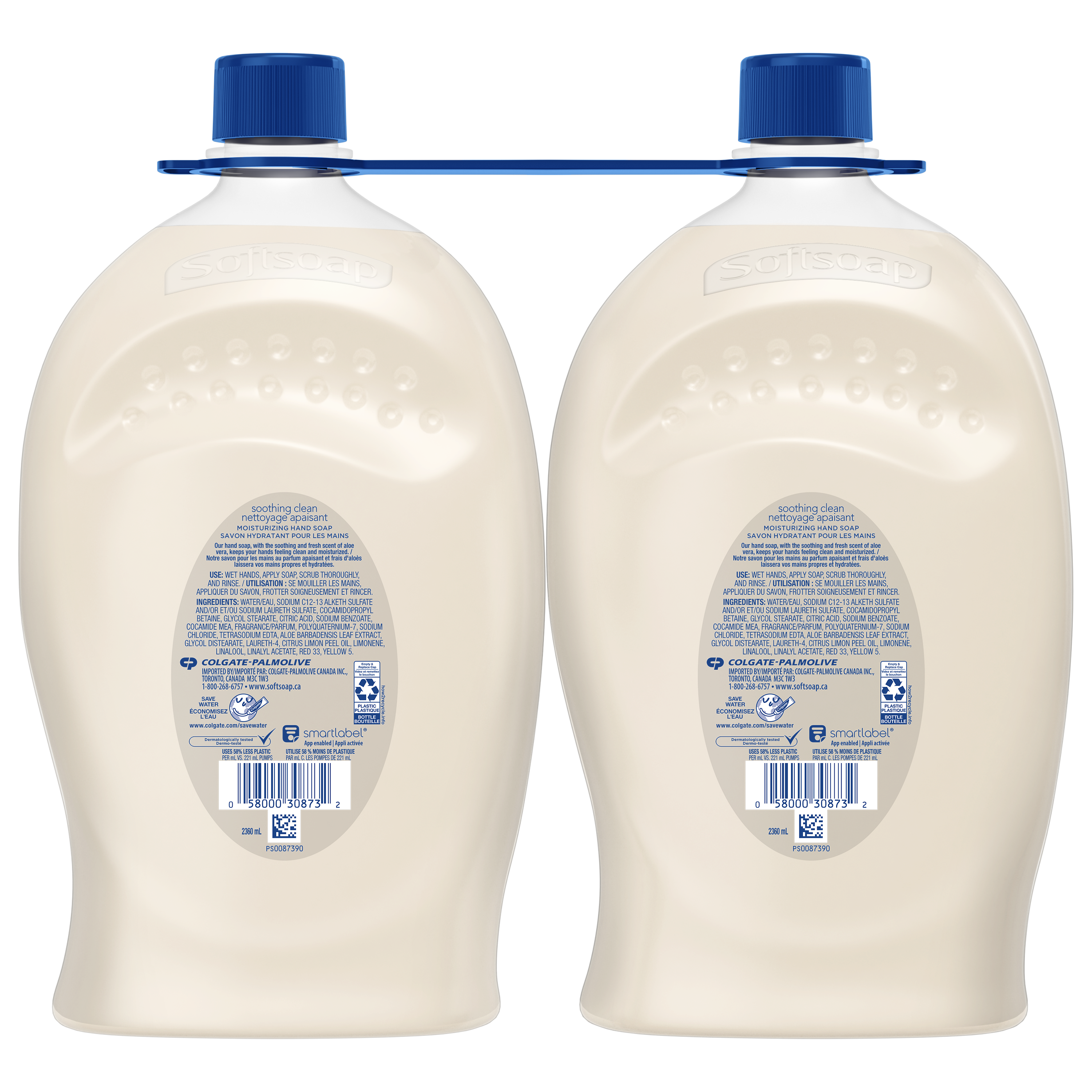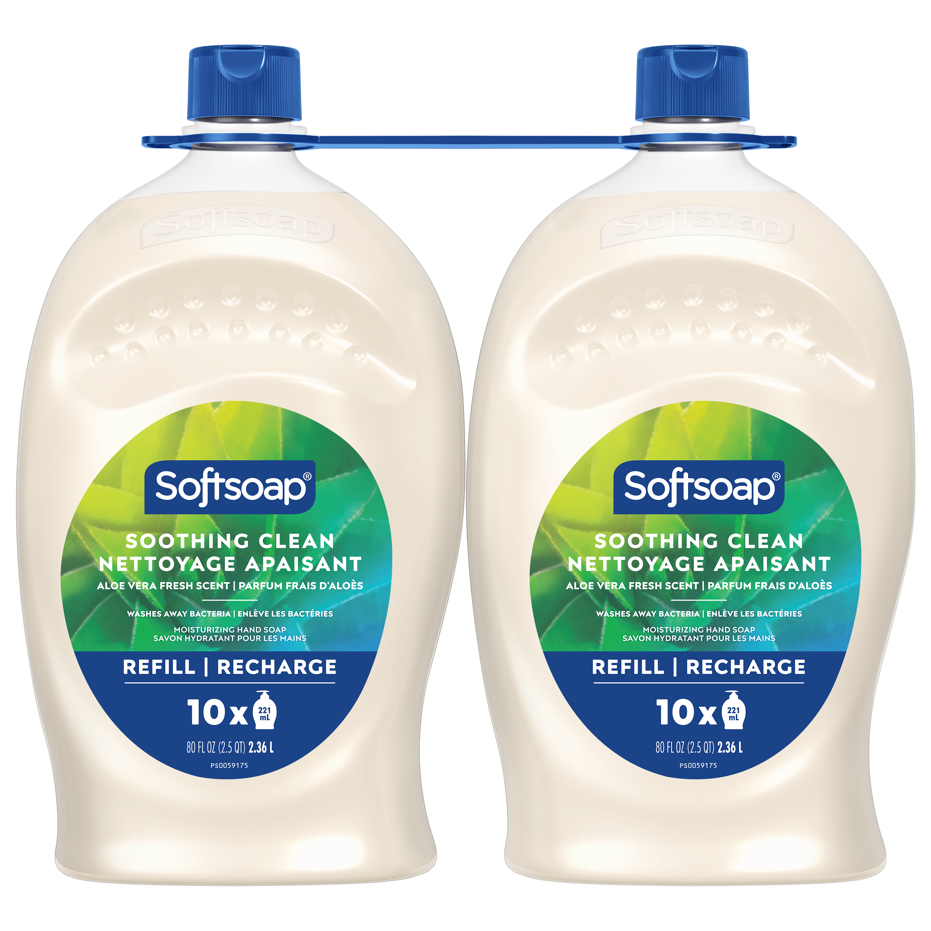 Product Title Softsoap Liquid Hand Soap Refill, Soothing clean, Aloe Vera Fresh Scent, 2.36 L 2pk SKU 320698 SKU eCommerce Name Softsoap Liquid Hand Soap Refill, Soothing clean, Aloe Vera Fresh Scent, 2.36 L 2pk Consumer Unit - GTIN 00058000308732 Product Category Personal Care Product Sub Category Liquid Hand Wash Brand Softsoap Product Sub Brand Softsoap LHW Consumer Unit Gross Weight 5.026 KG / 11.082 LB Consumer Unit Net Weight 4.826 KG / 10.641 LB Consumer Unit Length 239.000 MM / 9.409 IN Consumer Unit Width 138.000 MM / 5.433 IN Consumer Unit Height 242.000 MM / 9.528 IN Consumer Unit Volume 16.565 C8 / 0.585 CF Product Title Softsoap Liquid Hand Soap Refill, Soothing clean, Aloe Vera Fresh Scent, 2.36 L 2pk Product Description Keep your favorite Softsoap Soothing Clean Liquid Hand Soap stocked and ready for use. As the #1 liquid hand soap brand (1), Softsoap delivers an uplifting experience with each use. Give your hands a clean and fresh experience with our convenient refill size — perfect for refilling your soap dispensers. Our Soothing Clean Aloe Vera Fresh Scent hand soap not only provides a refreshing scent, but it also washes away bacteria, leaving your hands feeling clean. It effectively removes dirt, grease, grime, oil, and food. Softsoap Hand Soap is dermatologist tested and helps retain your skin's natural moisture leaving your skin feeling soft and smooth. Softsoap is paraben-free and made without phthalates. Softsoap liquid hand soap is perfect for refilling your bathroom soap bottles or to use as a kitchen hand soap bottle. Embrace the Soothing Aloe Vera scent by keeping a liquid hand soap refill bottle on hand so you can infuse every small moment with joy. (1) Based in part on data reported by Nielsen through its Market Track Service for the Liquid Hand Soap Category for the 52 week period ending 02/14/25, for the All Outlet market. Copyright © 2025 Nielsen. eCommerce Copy Softsoap Moisturizing Liquid Hand Soap, Soothing Clean has a delightful aloe vera fresh scent. Give your hands a soothing experience while keeping your hands feeling moisturized and clean. Softsoap is America's #1 Liquid Hand Soap brand, trusted to clean your hands since 1975. eCommerce Copy- Long Description Give your hands the soothing experience of Softsoap Moisturizing Liquid Hand Soap, Soothing Clean, with an aloe vera fresh scent to keep your hands feeling moisturized. Wash away dirt and bacteria with Softsoap liquid hand soap (health care agencies recommend washing hands in warm water for at least 20 seconds to wash away dirt and bacteria). Softsoap is America's #1 Liquid Hand Soap brand, trusted to clean your hands since 1975. Bullet 1 Two 2.36 L refill bottles of Softsoap Soothing Clean Liquid Hand Soap Bullet 2 Softsoap is the #1 liquid hand soap brand (1) Bullet 3 Each refill bottle holds enough liquid to refill a standard 221 mL liquid hand soap pump bottle over 6x Bullet 4 Our hand soap refill is mess free making it versatile to use in the bathroom or as a kitchen hand soap Bullet 5 Proudly formulated without parabens or phthalates, this dermatologist-tested hand soap will keep your hands clean and fresh Bullet 6 This hand soap washes away bacteria so you can confidently clean your hands, aligning with health care recommendations to wash hands with soap and clean running water for 20 seconds Keywords (eCommerce) liquid hand soap, hand soap, hand soap pump, hand soap refill, kitchen hand soap, bathroom hand soap, scented hand soap, gentle hand soap, best hand soap, aloe vera hand soap, moisturizing hand soap, handsoap, hand wash, best, hydrating, nice smell, protection, colds, virus, sensitive skin, allergies, non-irritating, bar soap, non-drying, easy rinse, illness, infection, lather, environmentally friendly, value, quality, premium, safe, children, kids, schools, fresh scent, lightly scented, value, dry skin, soothing, moisturizing, refillable Walmart Bullet 1 Aloe vera fresh scent Walmart Bullet 2 Leaves skin feeling soft and smooth Walmart Bullet 3 Keep on your sink to uplift every small moment Walmart Bullet 4 Washes away bacteria so you can confidently clean your hands Walmart Bullet 5 Paraben free & formulated without phthalates Walmart Bullet 6 Retains skin’s natural moisture Walmart Bullet 7 Biodegradable cleaning ingredients [OECD B,D] Walmart Bullet 8 pH balanced for your skin Walmart Bullet 9 - Suitable for all ages and all skin types.