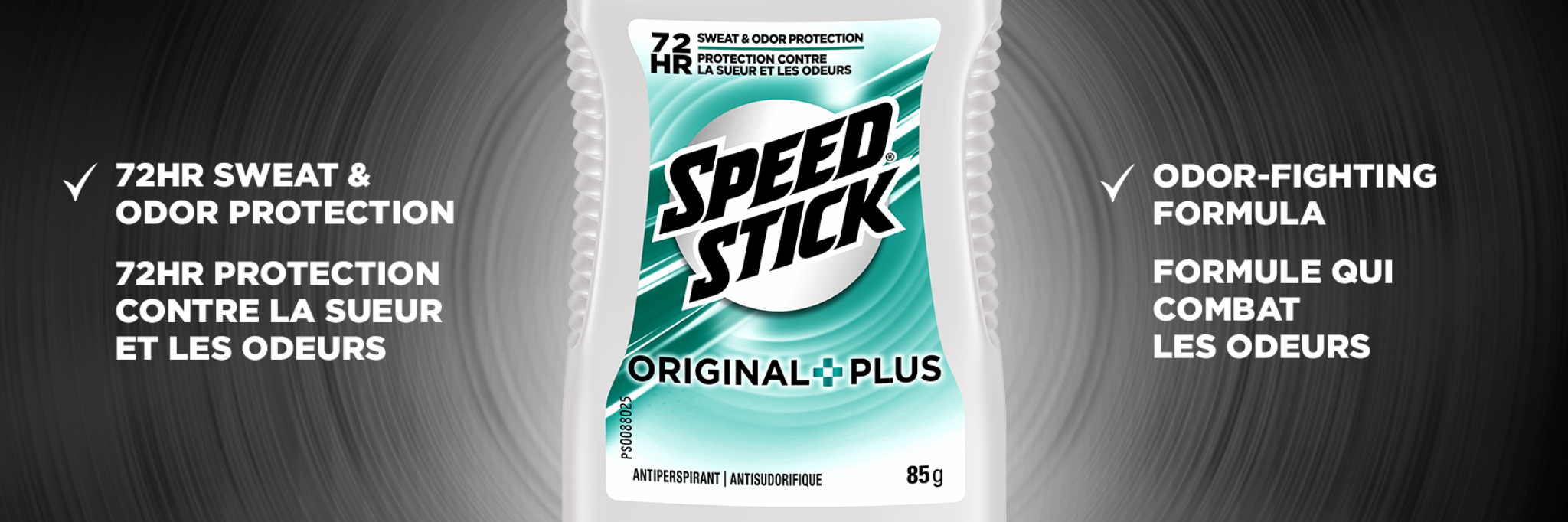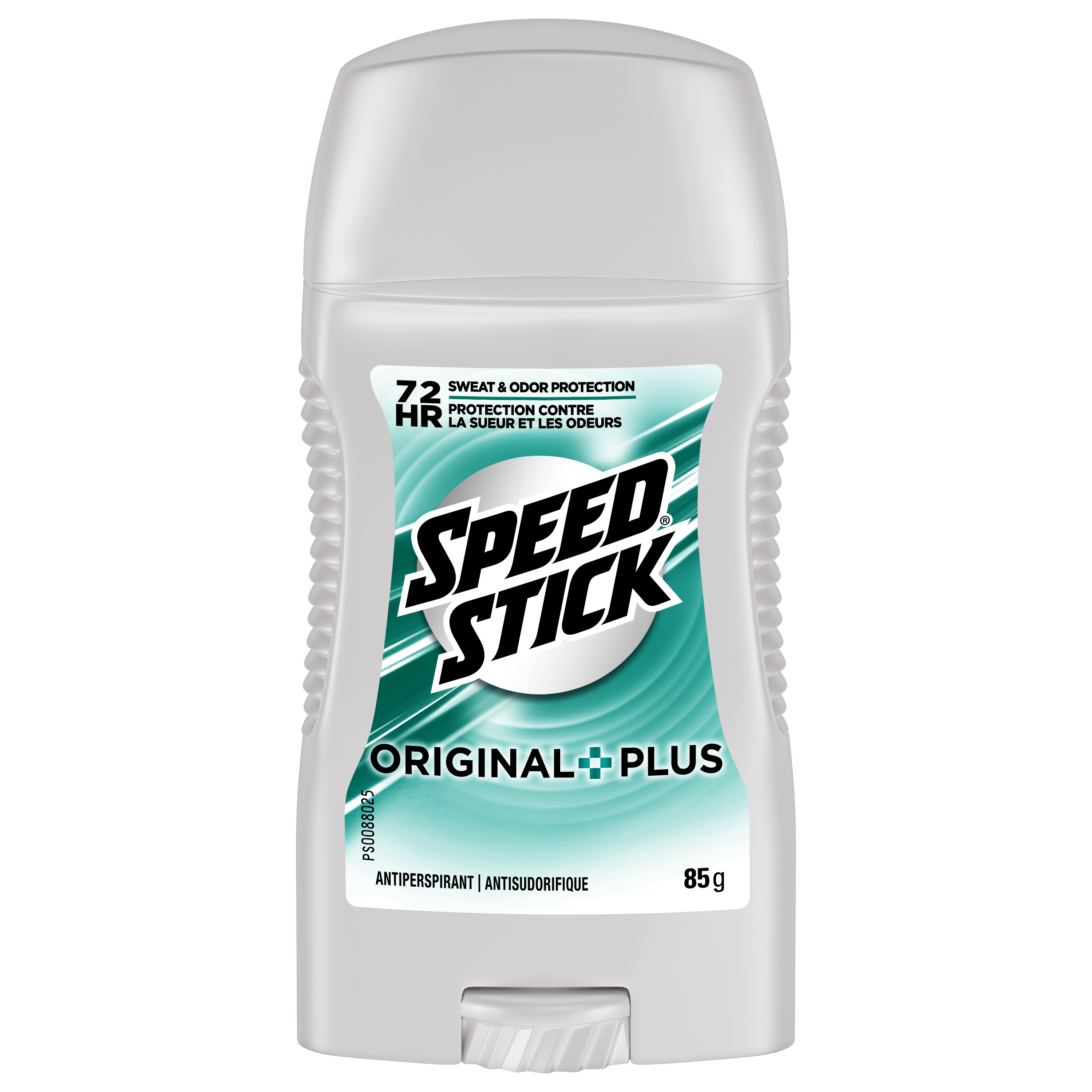 Product Title Speed Stick Antiperspirant Deodorant for Men, 72 HR Sweat & Odor Protection, Original Plus, 85 g Stick SKU 320787 Consumer Unit - GTIN 00058000008571 Case - GTIN 10058000008578 Product Category Personal Care Product Sub Category AP > Deo Brand Mennen Speed Stick Product Sub Brand Mennen Speed Stick AP/Deo Consumer Unit Gross Weight 0.141 KG / 0.311 LB Consumer Unit Net Weight 0.085 KG / 0.187 LB Consumer Unit Length 32.000 MM / 1.260 IN Consumer Unit Width 69.000 MM / 2.717 IN Consumer Unit Height 144.000 MM / 5.669 IN Consumer Unit Volume 0.311 C8 / 0.011 CF Product Title Speed Stick Antiperspirant Deodorant for Men, 72 HR Sweat & Odor Protection, Original Plus, 85 g Stick Product Description Speed Stick Original Plus Antiperspirant Deodorant is powered by long‑lasting antiperspirant protection. This solid stick delivers 72 hour sweat and odor protection, so you stay fresh, dry, and confident from your morning to night. Engineered for comfort and control, the unique comfort guard applicator delivers a smooth, precise glide and even coverage every time. Whether you’re conquering the office, hitting the gym, or heading out after hours, Speed Stick keeps you covered with premium performance you can rely on. Elevate your grooming routine with antiperspirant deodorant protection that helps you feel confident in any situation—clean, dry, and ready to move with Speed Stick Deodorant for Men. Bullet 1 Includes one 85 g stick of Speed Stick Antiperspirant Deodorant For Men, Original Plus Bullet 2 Experience the timeless appeal of Original Plus—a classic fragrance that complements any lifestyle Bullet 3 Powered by long‑lasting antiperspirant protection, this solid stick delivers 72 hour sweat and odor protection, so you stay fresh, dry, and confident Bullet 4 This men's antiperspirant includes a unique comfort guard applicator, ensuring a smooth application process Bullet 5 Reliable performance for gym sessions, busy workdays, and nights out—designed for men and ideal for active lifestyles Bullet 6 Elevate your grooming routine with antiperspirant deodorant protection that helps you feel confident in any situation with Speed Stick Deodorant for Men OS Amazon Product Title Speed Stick Antiperspirant Deodorant for Men, 72 HR Sweat & Odor Protection, Original Plus, 85 g Stick OS Amazon Product Description Speed Stick Original Plus Antiperspirant Deodorant is powered by long‑lasting antiperspirant protection. This solid stick delivers 72 hour sweat and odor protection, so you stay fresh, dry, and confident from your morning to night. Engineered for comfort and control, the unique comfort guard applicator delivers a smooth, precise glide and even coverage every time. Whether you’re conquering the office, hitting the gym, or heading out after hours, Speed Stick keeps you covered with premium performance you can rely on. Elevate your grooming routine with antiperspirant deodorant protection that helps you feel confident in any situation—clean, dry, and ready to move with Speed Stick Deodorant for Men. OS Amazon Bullet 1 WHAT'S INCLUDED: One 85 g stick of Speed Stick Antiperspirant Deodorant For Men, Original Plus OS Amazon Bullet 2 FRAGRANCE & PROTECTION: Experience the timeless appeal of Original Plus—a classic fragrance that complements any lifestyle OS Amazon Bullet 3 72 HR PROTECTION: Powered by long‑lasting antiperspirant protection, this solid stick delivers 72 hour sweat and odor protection, so you stay fresh, dry, and confident from your morning to night OS Amazon Bullet 4 SMOOTH APPLICATION: This men's antiperspirant includes a unique comfort guard applicator, ensuring a smooth application process, allowing you to glide through your grooming routine with ease OS Amazon Bullet 5 EVERYDAY READY: Reliable performance for gym sessions, busy workdays, and nights out—designed for men and ideal for active lifestyles OS Walmart Product Title Speed Stick Antiperspirant Deodorant for Men, Original Plus, 85 g Stick OS Walmart Product Description Speed Stick Original Plus Antiperspirant Deodorant is powered by long‑lasting antiperspirant protection. This solid stick delivers 72 hour sweat and odor protection, so you stay fresh, dry, and confident from your morning to night. Engineered for comfort and control, the unique comfort guard applicator delivers a smooth, precise glide and even coverage every time. Whether you’re conquering the office, hitting the gym, or heading out after hours, Speed Stick keeps you covered with premium performance you can rely on. Elevate your grooming routine with antiperspirant deodorant protection that helps you feel confident in any situation—clean, dry, and ready to move with Speed Stick Deodorant for Men. OS Walmart Bullet 1 Includes one 85 g stick of Speed Stick Antiperspirant Deodorant For Men, Original Plus OS Walmart Bullet 2 Experience the timeless appeal of Original Plus—a classic fragrance that complements any lifestyle OS Walmart Bullet 3 Powered by long‑lasting antiperspirant protection, this solid stick delivers 72 hour sweat and odor protection, so you stay fresh, dry, and confident OS Walmart Bullet 4 This men's antiperspirant includes a unique comfort guard applicator, ensuring a smooth application process OS Walmart Bullet 5 Reliable performance for gym sessions, busy workdays, and nights out—designed for men and ideal for active lifestyles OS Walmart Bullet 6 Elevate your grooming routine with antiperspirant deodorant protection that helps you feel confident in any situation with Speed Stick Deodorant for Men OS Walmart Bullet 7 Whether you're hitting the gym, conquering the office, or enjoying a night out, Speed Stick offers the ultimate protection against unpleasant odors OS Loblaws Product Title Speed Stick Antiperspirant Deodorant for Men, Original Plus, 85 g OS Loblaws Product Description Speed Stick Original Plus Antiperspirant Deodorant is powered by long‑lasting antiperspirant protection. This solid