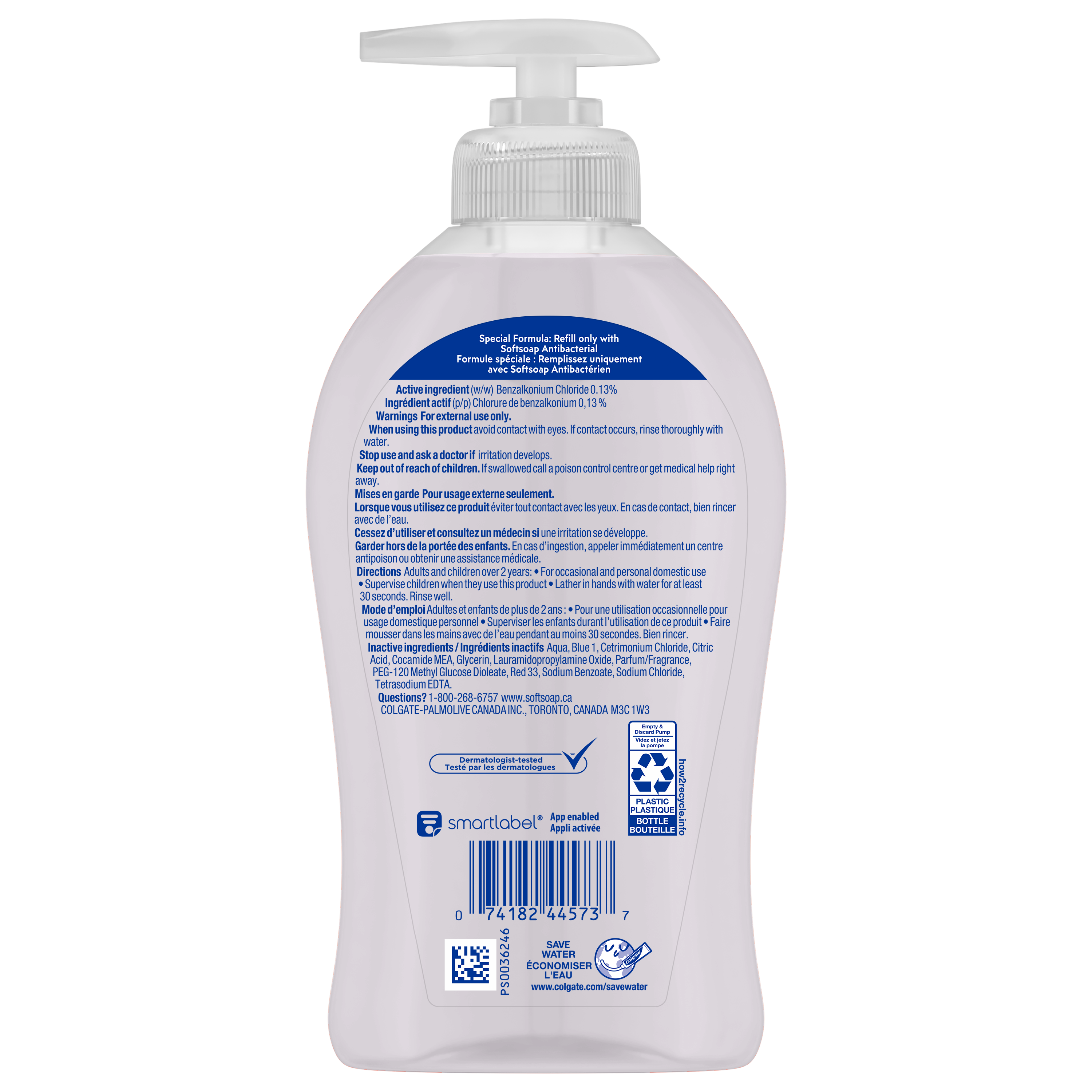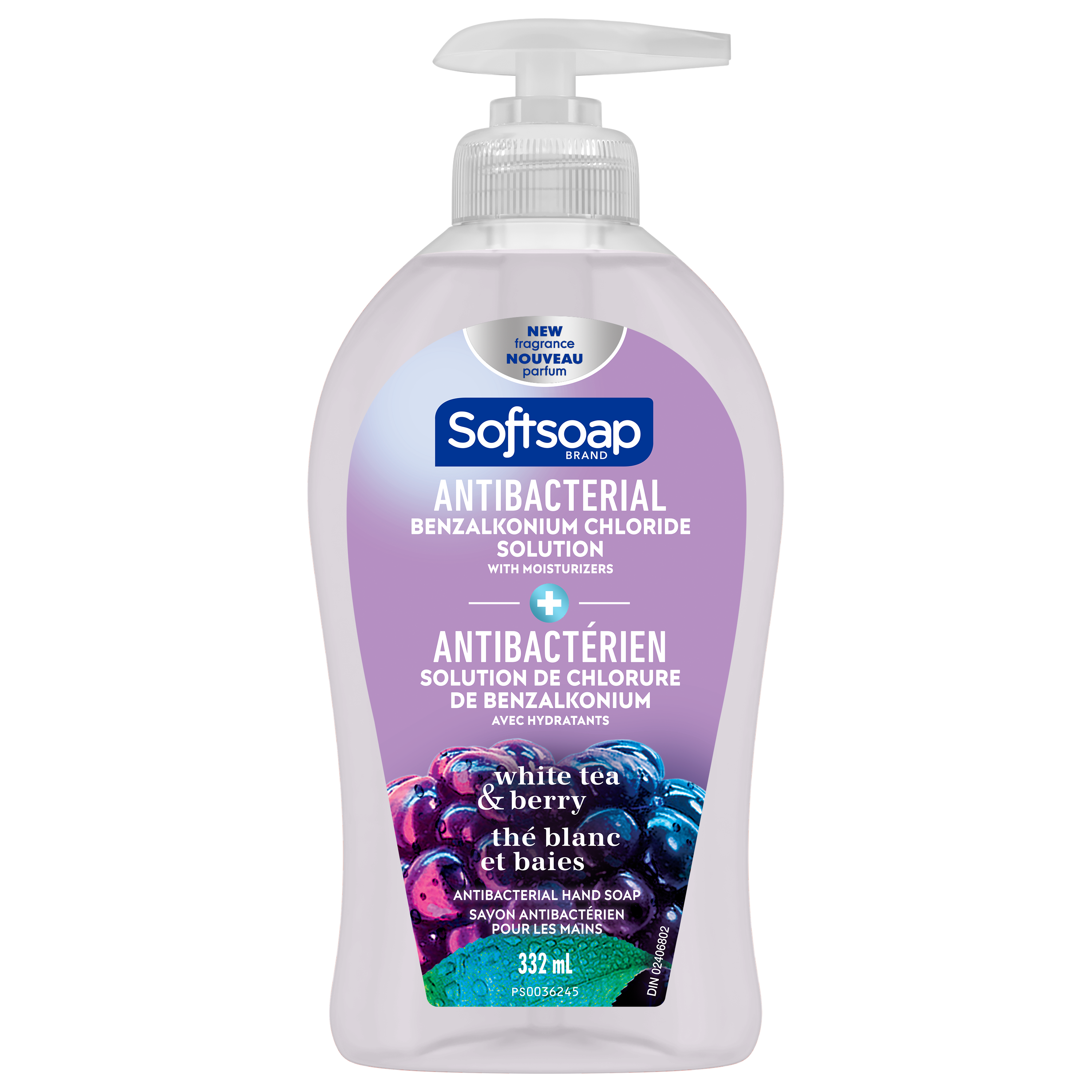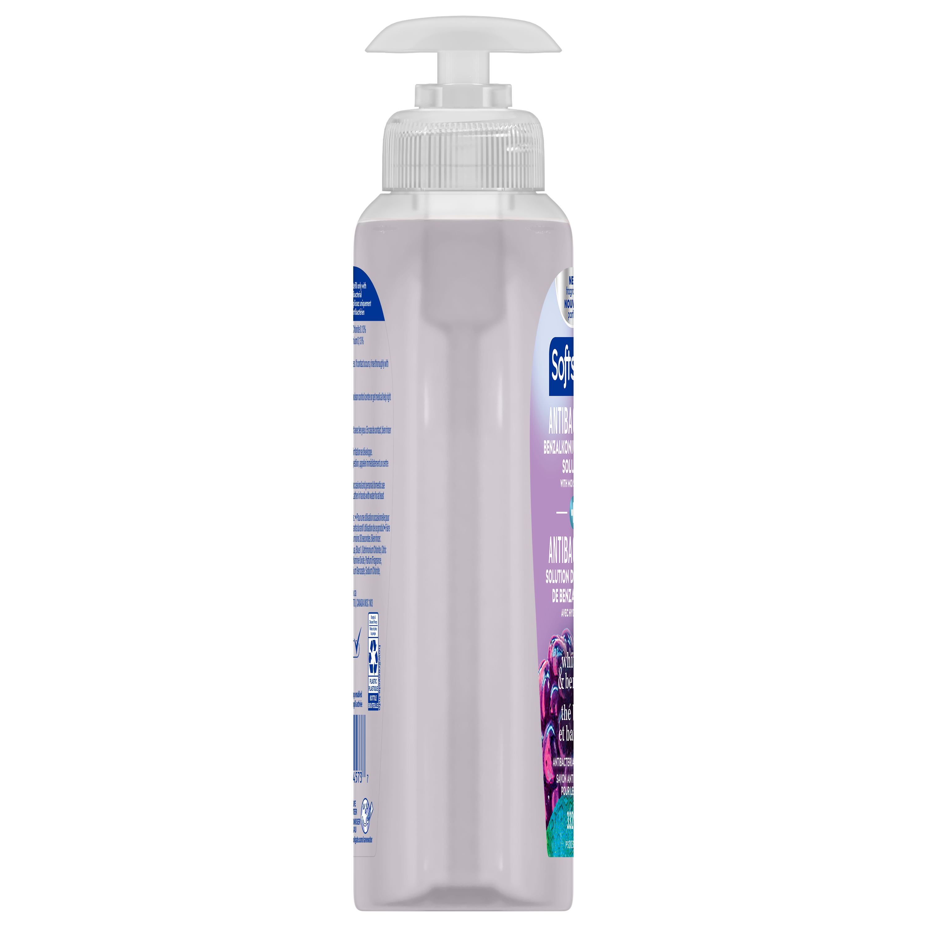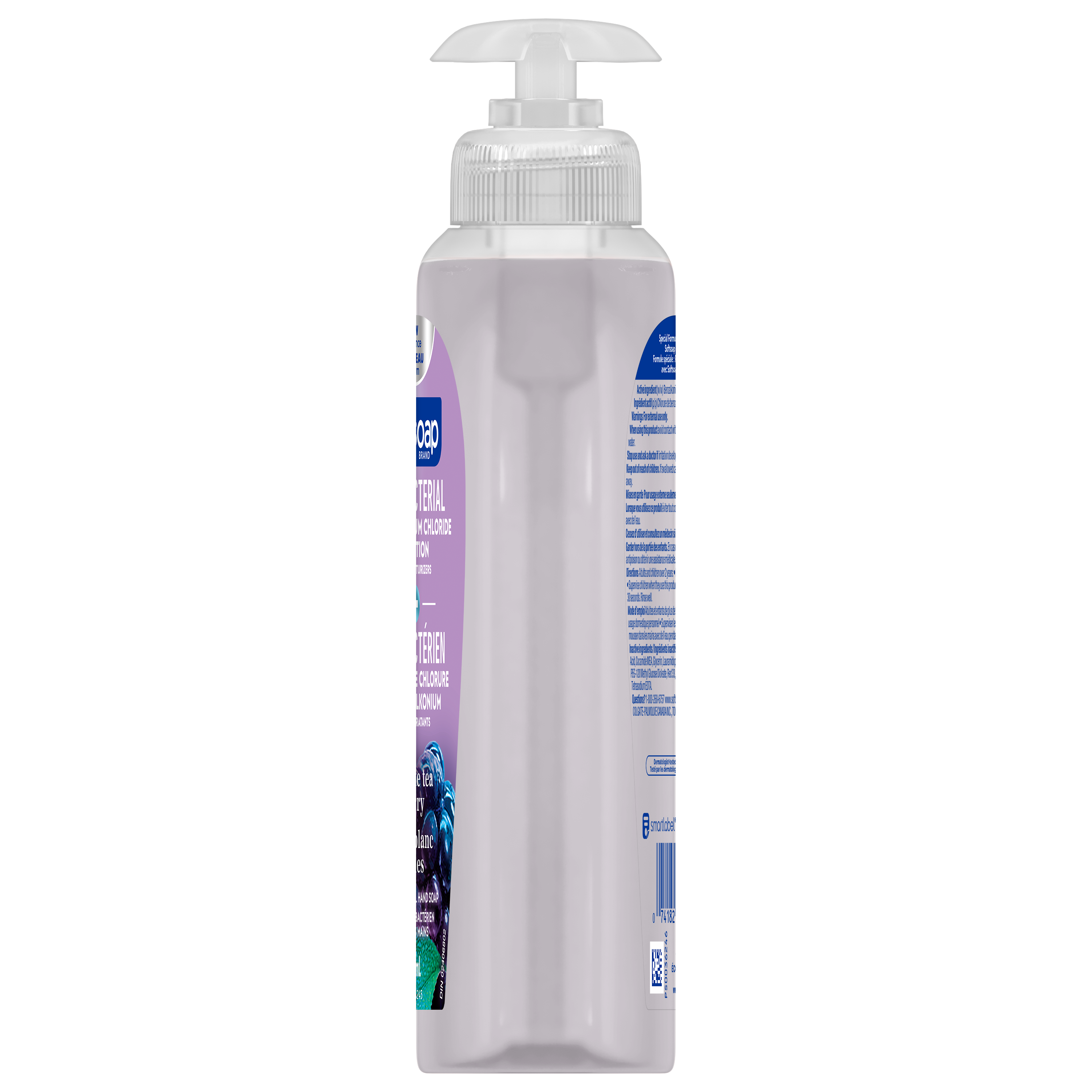 Product Title Softsoap Antibacterial Liquid Hand Soap Pump, White Tea and Berry - 332 ML SKU 61011748 SKU eCommerce Name Softsoap Antibacterial Liquid Hand Soap Pump, White Tea and Berry - 332 ML Consumer Unit - GTIN 00074182445737 Case - GTIN 10074182445734 Product Category Personal Care Product Sub Category Liquid Hand Wash Brand Softsoap Product Sub Brand Softsoap Antibacterial LHW Consumer Unit Gross Weight 0.376 KG / 0.829 LB Consumer Unit Net Weight 0.348 KG / 0.767 LB Consumer Unit Length 45.000 MM / 1.772 IN Consumer Unit Width 84.000 MM / 3.307 IN Consumer Unit Height 184.000 MM / 7.244 IN Consumer Unit Volume 0.680 C8 / 0.024 CF Product Title Softsoap Antibacterial Liquid Hand Soap Pump, White Tea and Berry - 332 ML eCommerce Copy Softsoap Antibacterial Liquid Hand Soap, White Tea & Berry contains benzalkonium chloride which is proven to kill harmful bacteria/germs. The White Tea & Berry scent of this antibacterial hand soap makes this the perfect addition to any kitchen or bathroom. Due to its antibacterial formula, the liquid hand soap pump should only be refilled with Softsoap Antibacterial Liquid Hand Soap. It is best to wash hands with soap and clean running water for 30 seconds eCommerce Copy- Long Description Softsoap Antibacterial Liquid Hand Soap, White Tea & Berry is clinically proven to eliminate 99.9% of bacteria (in a handwashing test vs. the following common harmful bacteria: S. Aureus & E. coli). Softsoap is Canada's #1 Liquid Hand Soap brand, trusted to clean your hands since 1975. Keywords (eCommerce) handsoap, hand wash, handwashing, business, best, hydrating, nice smell, protection, non-irritating, bar soap, non-drying, easy rinse, infection, lather, environmentally friendly, value, quality, premium, safe, children, kids, schools, fresh scent, lightly scented, fragrance, large size, antibacterial, AB, antibac Walmart Bullet 9 Suitable for all ages and all skin types.