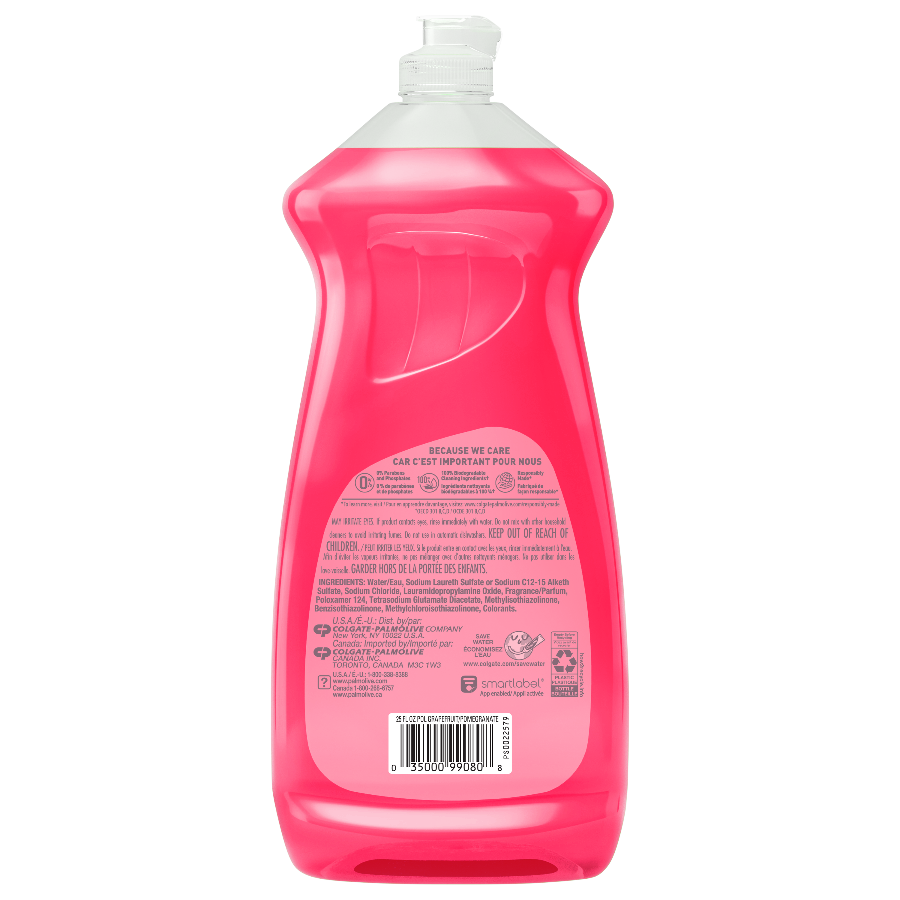 Palmolive Essential Clean Grapefruit Pomegranate-scented liquid dish soap is great for everyday clean-up in the kitchen and beyond. Palmolive Essential Clean’s Grapefruit Pomegranate-scented formula is tough on grease and soft on hands. It leaves your dishes sparkling clean, and has 100% biodegradable cleaning ingredients [OECD 301 B,C,D / OCDE 301 B,C,D], 0% parabens and phosphates, and is made in a TRUE-certified zero waste facility.* It removes grease and grime from your dishes. This phosphate-free liquid dish soap with a fruity scent offers you a basic cleaning action you can always rely on! Enjoy cooking more because Palmolive Essential Clean has clean-up covered!
