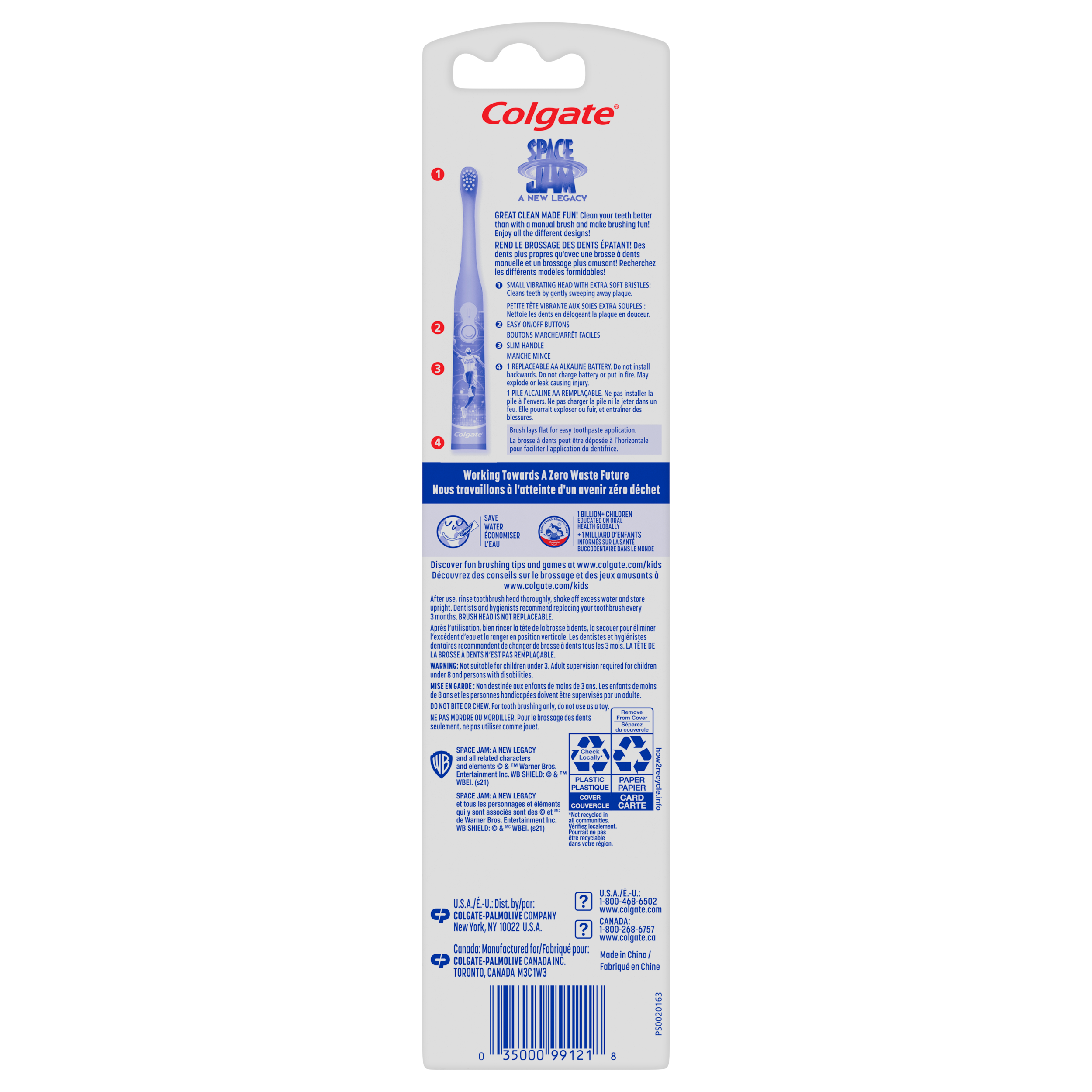 Product Title Colgate Kids Battery Toothbrush, For Ages 3+, Extra Soft Kids Toothbrush, Space Jam, 1 Pack SKU 61012992 SKU eCommerce Name Colgate Kids Battery Toothbrush, For Ages 3+, Extra Soft Kids Toothbrush, Space Jam, 1 Pack Consumer Unit - GTIN 00035000991218 Case - GTIN 10035000991215 Product Category Oral Care Product Sub Category Battery TB Brand Colgate Product Sub Brand Colgate Kids BTB Consumer Unit Gross Weight 0.071 KG / 0.157 LB Consumer Unit Net Weight 0.058 KG / 0.128 LB Consumer Unit Length 26.000 MM / 1.024 IN Consumer Unit Width 54.000 MM / 2.126 IN Consumer Unit Height 229.000 MM / 9.016 IN Consumer Unit Volume 0.322 C8 / 0.011 CF Product Title Colgate Kids Battery Toothbrush, For Ages 3+, Extra Soft Kids Toothbrush, Space Jam, 1 Pack eCommerce Copy The Colgate Kids Space Jam Battery Toothbrush provides a great clean made fun. Made for ages 3 and up, this kids battery toothbrush was designed with a slim, easy-to-hold handle to let them do the brushing, while the vibrating brush head does all the work. Its small, oscillating head has extra soft bristles that are gentle on delicate gums while cleaning teeth and sweeping away plaque. This soft toothbrush for kids is battery-powered, so it’s easy to replace the battery wherever you are (1 AA battery is included). eCommerce Copy- Long Description The Colgate Kids Space Jam Battery Toothbrush provides a great clean made fun. With a vibrating brush head, this kids toothbrush cleans better than a manual toothbrush. Its small, oscillating head has extra soft bristles that are gentle on delicate gums while cleaning teeth and sweeping away plaque. This soft toothbrush for kids is battery-powered, so it’s easy to replace the battery wherever you are (1 AA battery is included). Get the classic Colgate clean you can count on with the Colgate Kids Space Jam Battery Toothbrush. Made for ages 3 and up, this kids battery toothbrush was designed with a slim, easy-to-hold handle to let them do the brushing, while the vibrating brush head does all the work. This kids toothbrush also has a flat-laying handle so kids can easily apply toothpaste without the brush rolling over or away when you set it down on the counter. And its vibrating brush head is small enough to reach every corner of the mouth, while extra soft bristles are delicate on gums. Keywords (eCommerce) electric toothbrush, kids toothbrush, toddler toothbrush, colgate toothbrush, manual toothbrush, soft toothbrush bristles, adult toothbrush, cheek tongue cleaner, full head, travel toothbrush, bulk toothbrushes, family toothbrushes, value pack toothbrushes, toothbrushes
