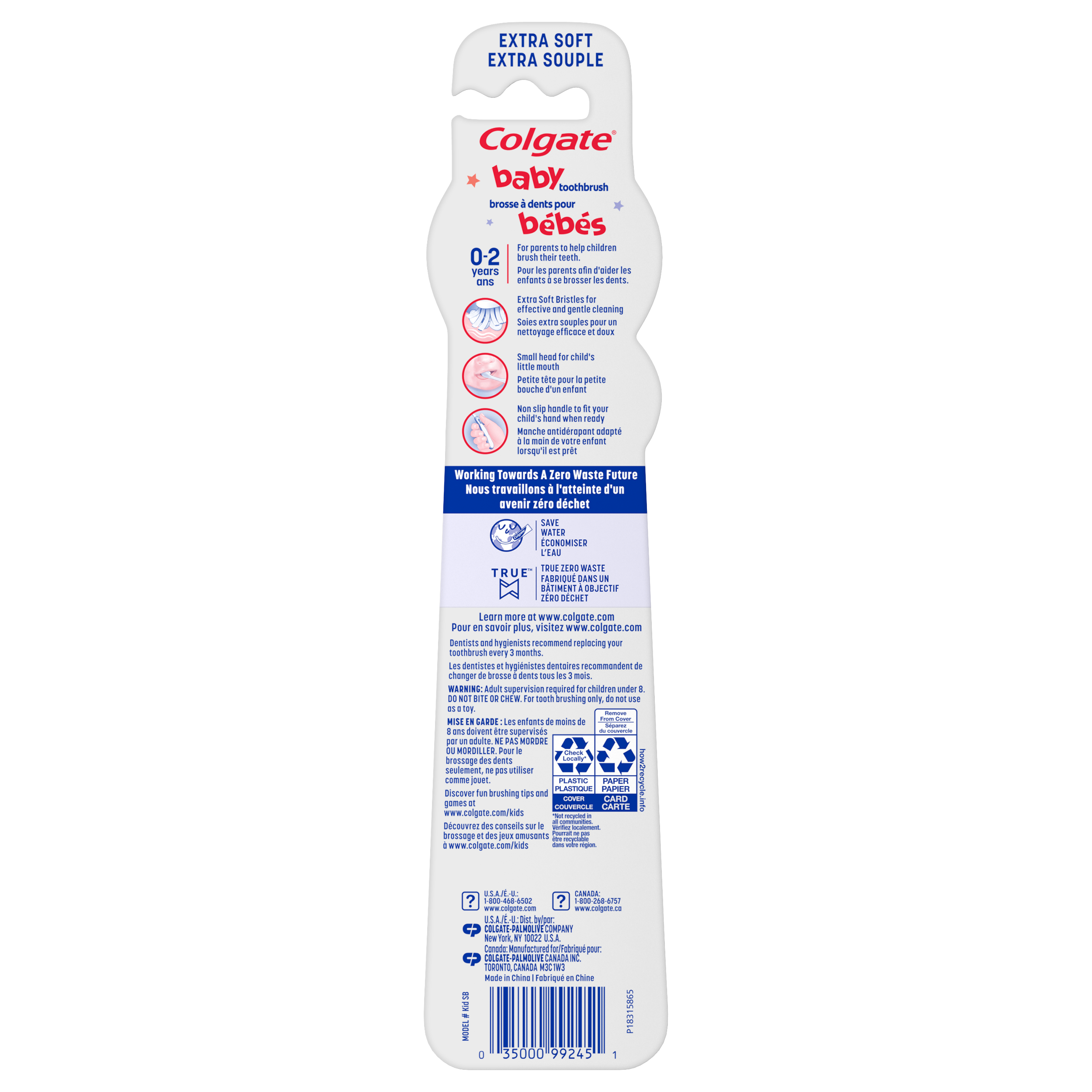 Product Title Colgate Kids My First Toothbrush, Extra Soft Baby Toothbrushes, 2 Pack SKU 61015362 SKU eCommerce Name Colgate Kids My First Toothbrush, Extra Soft Baby Toothbrushes, 2 Pack Consumer Unit - GTIN 00035000992451 Case - GTIN 10035000992458 Product Category Oral Care Product Sub Category Manual TB Brand Colgate Product Sub Brand Colgate Kids Man TB Consumer Unit Gross Weight 0.031 KG / 0.068 LB Consumer Unit Net Weight 0.027 KG / 0.060 LB Consumer Unit Length 23.000 MM / 0.906 IN Consumer Unit Width 52.000 MM / 2.047 IN Consumer Unit Height 216.000 MM / 8.504 IN Consumer Unit Volume 0.258 C8 / 0.009 CF Product Title Colgate Kids My First Toothbrush, Extra Soft Baby Toothbrushes, 2 Pack Product Description Start your child’s oral care journey with the Colgate Kids Extra Soft Baby Toothbrush Pack. Designed for babies and toddlers ages 3-24 months, these specially designed baby toothbrushes feature extra soft toothbrush bristles for effective and gentle cleaning. Each Colgate baby toothbrush can also be used as a training toothbrush for parents who want to help their children learn to brush their teeth. Each baby toothbrush features a small toothbrush head for easy access to a child’s mouth. Plus, the non-slip handle is designed for your child's hand when ready, making it simple for both parents and little ones to grip the extra soft toothbrush securely. Colgate Kids Extra Soft Baby Toothbrushes use extra soft bristles for effective and gentle cleaning of baby teeth and can also be used with older children as a toddler toothbrush. These soft toothbrushes help remove plaque with brushing for cleaner teeth. Establish good oral hygiene habits early on with this Colgate baby toothbrush pack. eCommerce Copy The Colgate Kids My First Toothbrush is an extra soft baby toothbrush for ages 0-2. This baby soft toothbrush is made for parents to help children brush their teeth and is designed with extra soft bristles for effective and gentle cleaning. eCommerce Copy- Long Description The Colgate Kids My First Toothbrush is an extra soft baby toothbrush for ages 0-2. This baby soft toothbrush is made for parents to help children brush their teeth, and is designed with extra soft bristles for effective and gentle cleaning and a small head for a child's mouth. A non-slip handle fits your child's hand when they're ready to hold this baby toothbrush. Plus, this Colgate toothbrush for kids is made in a zero true waste facility. Bullet 1 Includes two (2) individual Colgate Kids Extra Soft Baby Toothbrushes, Training Toothbrush for Young Children Bullet 2 Each Colgate baby toothbrush in this double pack uses extra soft toothbrush bristles for effective and gentle cleaning Bullet 3 This baby toothbrush can be used as a toddler toothbrush and as a training toothbrush for parents who want to teach their young kids how to brush Bullet 4 The small toothbrush head makes it easy to fit inside little mouths and reach all their growing baby teeth when brushing Bullet 5 The non-slip handle on each baby toothbrush makes it easier for parents to control the extra soft toothbrush when it’s teeth brushing time Keywords (eCommerce) kids toothbrush, toddler toothbrush, colgate toothbrush, manual toothbrush, soft toothbrush bristles, adult toothbrush, cheek tongue cleaner, full head, travel toothbrush, bulk toothbrushes, family toothbrushes, value pack toothbrushes, toothbrushes OS Amazon Product Title Colgate Kids Extra Soft Baby Toothbrush Pack, Baby and Toddler Training Toothbrush for Ages 3-24 Months, Non Slip Handle, Extra Soft Bristles, 2 Count OS Amazon Product Description Start your child’s oral care journey with the Colgate Kids Extra Soft Baby Toothbrush Pack. Designed for babies and toddlers ages 3-24 months, these specially designed baby toothbrushes feature extra soft toothbrush bristles for effective and gentle cleaning. Each Colgate baby toothbrush can also be used as a training toothbrush for parents who want to help their children learn to brush their teeth. Each baby toothbrush features a small toothbrush head for easy access to a child’s mouth. Plus, the non-slip handle is designed for your child's hand when ready, making it simple for both parents and little ones to grip the extra soft toothbrush securely. Colgate Kids Extra Soft Baby Toothbrushes use extra soft bristles for effective and gentle cleaning of baby teeth and can also be used with older children as a toddler toothbrush. These soft toothbrushes help remove plaque with brushing for cleaner teeth. Establish good oral hygiene habits early on with this Colgate baby toothbrush pack. OS Amazon Bullet 1 WHAT’S INCLUDED: Two (2) individual Colgate Kids Extra Soft Baby Toothbrushes, Training Toothbrush for Young Children OS Amazon Bullet 2 EXTRA SOFT BRISTLES: Each Colgate baby toothbrush in this double pack uses extra soft toothbrush bristles for effective and gentle cleaning OS Amazon Bullet 3 FOR KIDS 3-24 MONTHS: This baby toothbrush can be used as a toddler toothbrush and as a training toothbrush for parents who want to teach their young kids how to brush OS Amazon Bullet 4 SMALL BRUSH HEAD: The small toothbrush head makes it easy to fit inside little mouths and reach all their growing baby teeth when brushing OS Amazon Bullet 5 NON-SLIP GRIP: The non-slip handle on each baby toothbrush makes it easier for parents to control the extra soft toothbrush when it’s teeth brushing time OS Amazon On Page Keywords baby toothbrush, baby toothbrushes, toothbrushes, small toothbrush, soft toothbrushes, Colgate baby toothbrush, toddler toothbrush, extra soft toothbrush OS Walmart Product Title Colgate Kids Extra Soft Baby Toothbrush Pack, 2 Count OS Walmart Product Description ##Colgate Kids Extra Soft Baby Toothbrush Pack, 2 Count Start your child’s oral care journey with the Colgate Kids Extra Soft Baby Toothbrush Pack. Designed for babies and toddlers ages 3-24 months, these specially designed baby toothbrushes feature extra soft too