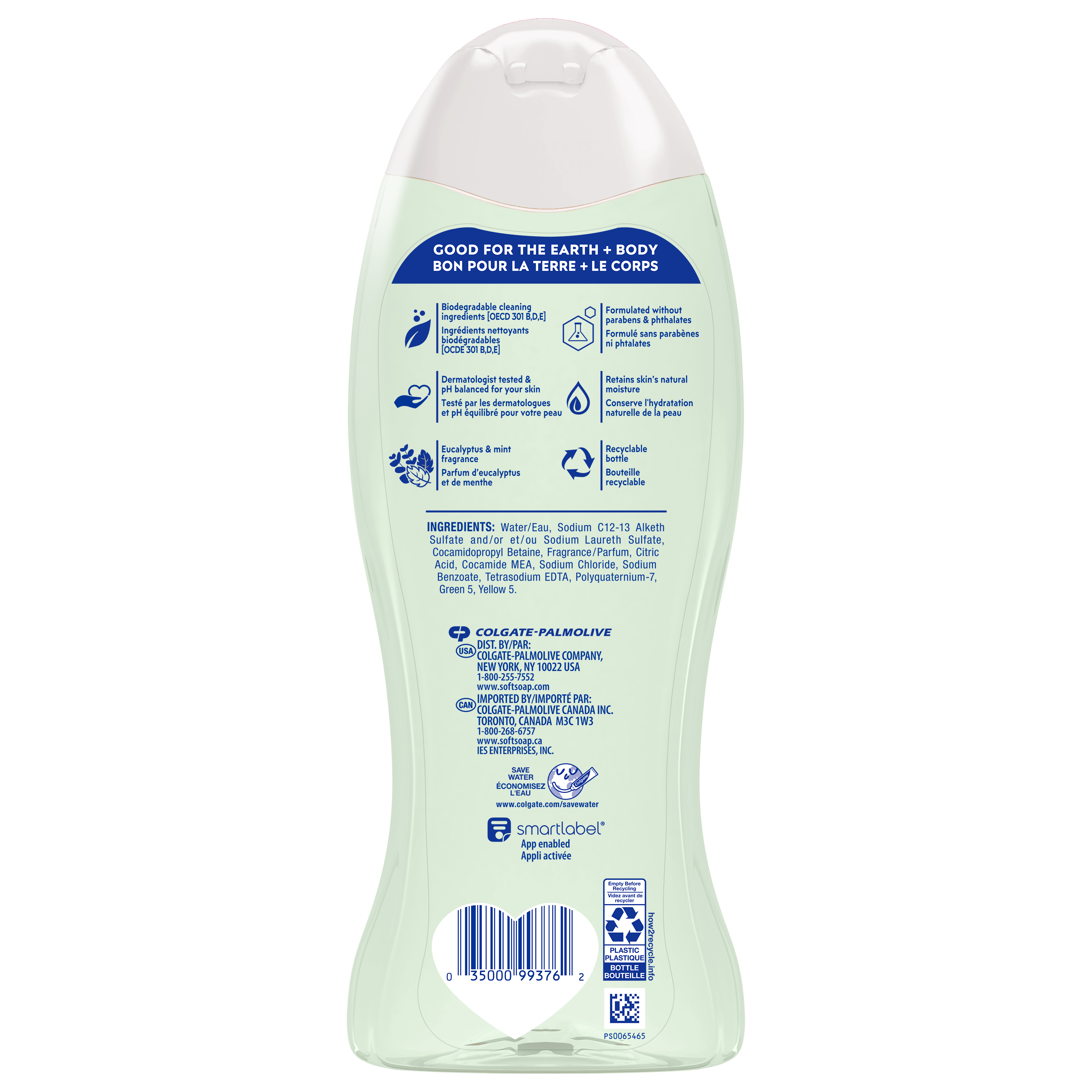 Product Title Softsoap Body Fresh Eucalyptus & Mint Scent Body Wash, 591 mL SKU 61016887 SKU eCommerce Name Softsoap Body Fresh Eucalyptus & Mint Scent Body Wash, 591 mL Consumer Unit - GTIN 00035000993762 Case - GTIN 10035000993769 Product Category Personal Care Product Sub Category Body Wash Brand Softsoap Product Sub Brand Softsoap BW Consumer Unit Gross Weight 0.640 KG / 1.411 LB Consumer Unit Net Weight 0.607 KG / 1.338 LB Consumer Unit Length 54.000 MM / 2.126 IN Consumer Unit Width 91.000 MM / 3.583 IN Consumer Unit Height 240.000 MM / 9.449 IN Consumer Unit Volume 1.179 C8 / 0.042 CF Product Title Softsoap Body Fresh Eucalyptus & Mint Scent Body Wash, 591 mL eCommerce Copy- Long Description Softsoap Body Fresh Eucalyptus & Mint Scent, 591 mL Softsoap Body Fresh Eucalyptus & Mint Scent Body Wash helps retain skin’s natural moisture and gives you a delightfully yet effective clean. This body wash is great to invigorate your senses and, with eucalyptus & mint scents, will uplift your spirit. This body wash is dermatologist tested and pH balanced for your skin. Feel the joy of clean with Softsoap Body! New Look, Same Great Clean Softsoap labels may have a fresh look, but they still deliver the same great clean and same great scents. Confidently wash with Softsoap Body while enjoying fragrant scents and fun labels that will bring you joy. For everyone, every mood, and every shower, Softsoap Body is designed to make you joyfully clean. Softsoap Body Fresh Eucalyptus & Mint Scent body wash is the perfect way to add a moment of joy to your life. Feel Good About Your Body Wash This body wash formula retains skin’s natural moisture and is made with biodegradable cleaning ingredients. Plus, this body wash is formulated without parabens or phthalates, so you can feel good about your body wash. Feel the Joy of Clean At Softsoap, we believe that the little moments throughout your day should be fun! With delightful bubbles and surprisingly fragrant scents, every trip to the sink and every shower leaves you feeling uplifted. Enjoy those small moments of joy and get brilliantly clean with Softsoap liquid hand soaps and body washes—now, you’re ready to take on the world! OS Amazon On Page Keywords aloe body wash, aloe vera body wash, mint body wash, hydrating body wash, moisturizing body wash, soothing body wash, sensitive body wash, body wash for sensitive skin, gender neutral body wash, organic body wash, men's shower gel, women's shower gel, coconut body wash, scented body wash, citrus body wash, antiperspirant body wash, antibacterial body wash, body wash for dry skin, natural body wash, body wash for men, men's body wash OS Walmart On Page Keywords aloe body wash, aloe vera body wash, mint body wash, hydrating body wash, moisturizing body wash, soothing body wash, sensitive body wash, body wash for sensitive skin, gender neutral body wash, organic body wash, men's shower gel, women's shower gel, coconut body wash, scented body wash, citrus body wash, antiperspirant body wash, antibacterial body wash, body wash for dry skin, natural body wash, body wash for men, men's body wash Walmart Bullet 1 One 20 oz bottle of Softsoap Mint and Eucalyptus Body Wash, Moisturizing Body Wash for Dry Skin with Biodegradable Cleaning Ingredients Walmart Bullet 2 Mint and eucalyptus body wash fragrance will invigorate your senses Walmart Bullet 3 This soothing body wash is the perfect way to add a moment of joy to your night Walmart Bullet 4 Softsoap body wash is pH balanced for your skin Walmart Bullet 5 Hydrating body wash retains the skin’s natural moisture Walmart Bullet 6 Softsoap liquid body wash is made with biodegradable cleansing ingredients Walmart Bullet 7 Paraben free body wash is also formulated without phthalates Walmart Bullet 8 Dry skin body wash is dermatologically tested Walmart Bullet 9 Suitable for all ages and all skin types.