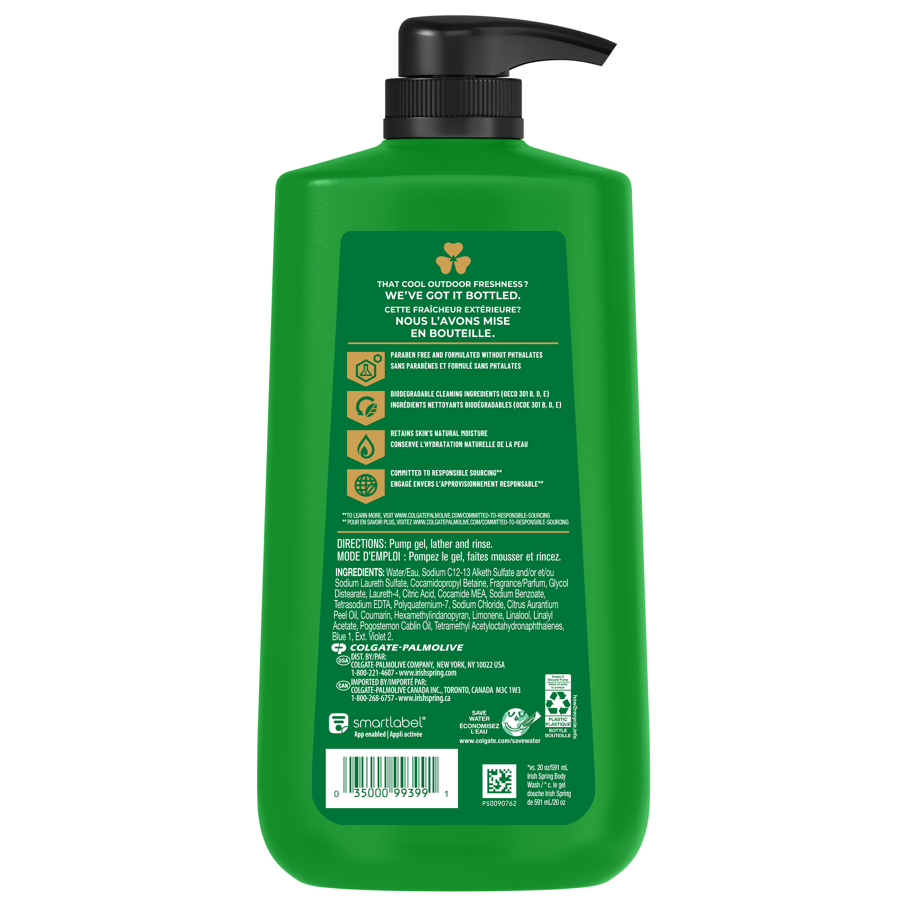 Product Title Irish Spring Moisture Blast Body Wash for Men, 887 mL Pump SKU 61017105 SKU eCommerce Name Irish Spring Moisture Blast Body Wash for Men, 887 mL Pump Consumer Unit - GTIN 00035000993991 Case - GTIN 10035000993998 Product Category Personal Care Product Sub Category Body Wash Brand Irish Spring Product Sub Brand Irish Spring BW Consumer Unit Gross Weight 0.987 KG / 2.176 LB Consumer Unit Net Weight 0.905 KG / 1.996 LB Consumer Unit Length 67.000 MM / 2.638 IN Consumer Unit Width 105.000 MM / 4.134 IN Consumer Unit Height 232.000 MM / 9.134 IN Consumer Unit Volume 1.731 C8 / 0.061 CF Product Title Irish Spring Moisture Blast Body Wash for Men, 887 mL Pump Product Description Start your day with the invigorating clean of Irish Spring Moisture Blast Body and Face Wash for Men, designed to provide 24 hours of long-lasting freshness. Infused with a cool outdoor fresh scent, it transports you to nature with every wash, so you are ready to take on the day. Our body wash for men is specially crafted to retain skin’s moisture. It’s also paraben free and formulated without phthalates. Designed for use on both the face and body, it simplifies your daily routine while delivering the same refreshing experience you expect from Irish Spring. Irish Spring has a new cap with leak-proof design ensuring you stay fresh no matter where your journey takes you. eCommerce Copy Irish Spring body wash might have a new design, but it’s still the same great body wash you love to smell. Feel clean, smell serene with Irish Spring Moisture Blast Body Wash. The convenient body wash pump has a refreshed look and is shower-shelf ready. Irish Spring Moisture Blast Body Wash leaves your skin feeling clean, retains skin’s natural moisture and washes away bacteria. Use this shower gel pump as a face wash or hand soap, too, and feel good while washing from head-to-toe with Irish Spring. Irish Spring Body Wash keeps you fresh for 24 hours. eCommerce Copy- Long Description Feel clean, smell serene with Irish Spring Body Wash. Count on Irish Spring Moisture Blast Body Wash to leave your skin feeling clean — our body wash for men retains skin’s natural moisture while keeping you fresh for 24 hours. Our body wash pump might have a new design, but it’s still the same great body wash you love to smell. Our packaging refresh is all part of our master plan to bring the amazing places you love to smell straight to your bathroom. The sleeker design is convenient and shower-shelf ready. Stock up on this body wash pump and never go without smelling your best. Keep it in your bathroom, in the pantry, give it to your friends and keep the good smells going. Irish Spring Moisture Blast Body Wash has a sudsy lather that washes away bacteria, so you can use it as a face wash or hand soap and feel good while washing from head-to-toe with Irish Spring. Made with biodegradable cleansing ingredients, this men’s shower gel is paraben free and formulated without phthalates. Get as fresh as the great outdoors and add some adventure to your everyday with the whole Spring of bar soaps and body washes for men. Smell like you came from a nice-smelling place with the new Irish Spring. Bullet 1 What’s Included: One 887 mL pump bottle of Irish Spring Moisture Blast Face and Body Wash for Men Bullet 2 Feel Clean and Fresh: Enjoy 24 hours of long-lasting freshness Bullet 3 Retains Skin’s Moisture: Use as a men’s body wash or face wash Bullet 4 Cap With Leak-Proof Design: Comes with a new cap with leak-proof design so you can stay fresh no matter where your journey takes you Bullet 5 Feeling Clean: Formulated without phthalates and parabens leaving you clean Bullet 6 Moisturizing Body Wash: Our body wash for men is specially crafted to retain skin’s moisture Keywords (eCommerce) aloe body wash, aloe vera body wash, mint body wash, hydrating body wash, moisturizing body wash, soothing body wash, sensitive body wash, body wash for sensitive skin, gender neutral body wash, organic body wash, men's shower gel, women's shower gel, coconut body wash, scented body wash, citrus body wash, antiperspirant body wash, antibacterial body wash, body wash for dry skin, natural body wash, fly insect repellent, backyard pest repeller, bug repellent, citronella, mosquito repellent, insect repellent, insect repellant OS Amazon Product Title Irish Spring Moisture Blast Moisturizing Body Wash for Men, 24-Hour Fresh, Face and Body Wash, Men’s Body Wash, Biodegradable Ingredients, Paraben Free, Cool Fresh Scent, 887 mL Pump Bottle OS Amazon Product Description Start your day with the invigorating clean of Irish Spring Moisture Blast Body and Face Wash for Men, designed to provide 24 hours of long-lasting freshness. Infused with a cool outdoor fresh scent, it transports you to nature with every wash, so you are ready to take on the day. Our body wash for men is specially crafted to retain skin’s moisture. It’s also paraben free and formulated without phthalates. Designed for use on both the face and body, it simplifies your daily routine while delivering the same refreshing experience you expect from Irish Spring. Irish Spring has a new cap with leak-proof design ensuring you stay fresh no matter where your journey takes you. OS Amazon Bullet 1 What’s Included: One 887 mL pump bottle of Irish Spring Moisture Blast Face and Body Wash for Men OS Amazon Bullet 2 Feel Clean and Fresh: Enjoy 24 hours of long-lasting freshness OS Amazon Bullet 3 Retains Skin’s Moisture: Use as a men’s body wash or face wash OS Amazon Bullet 4 Cap With Leak-Proof Design: Comes with a new cap with leak-proof design so you can stay fresh no matter where your journey takes you OS Amazon Bullet 5 Feeling Clean: Formulated without phthalates and parabens leaving you clean OS Walmart Product Title Irish Spring Moisture Blast Moisturizing Body Wash for Men, 887 mL Pump Bottle OS Walmart Product Description Start your day with the invigorating clean of Irish Spring Moi