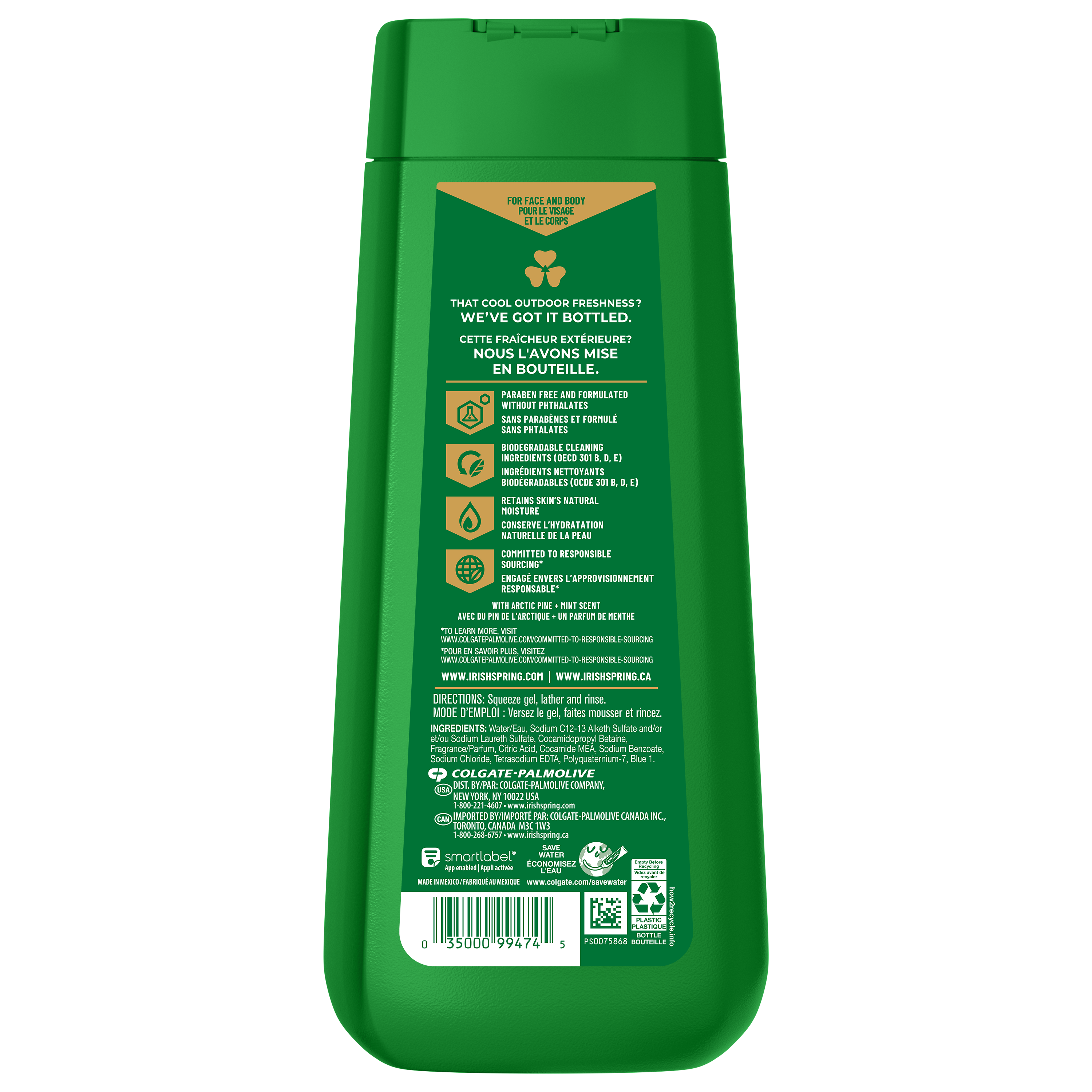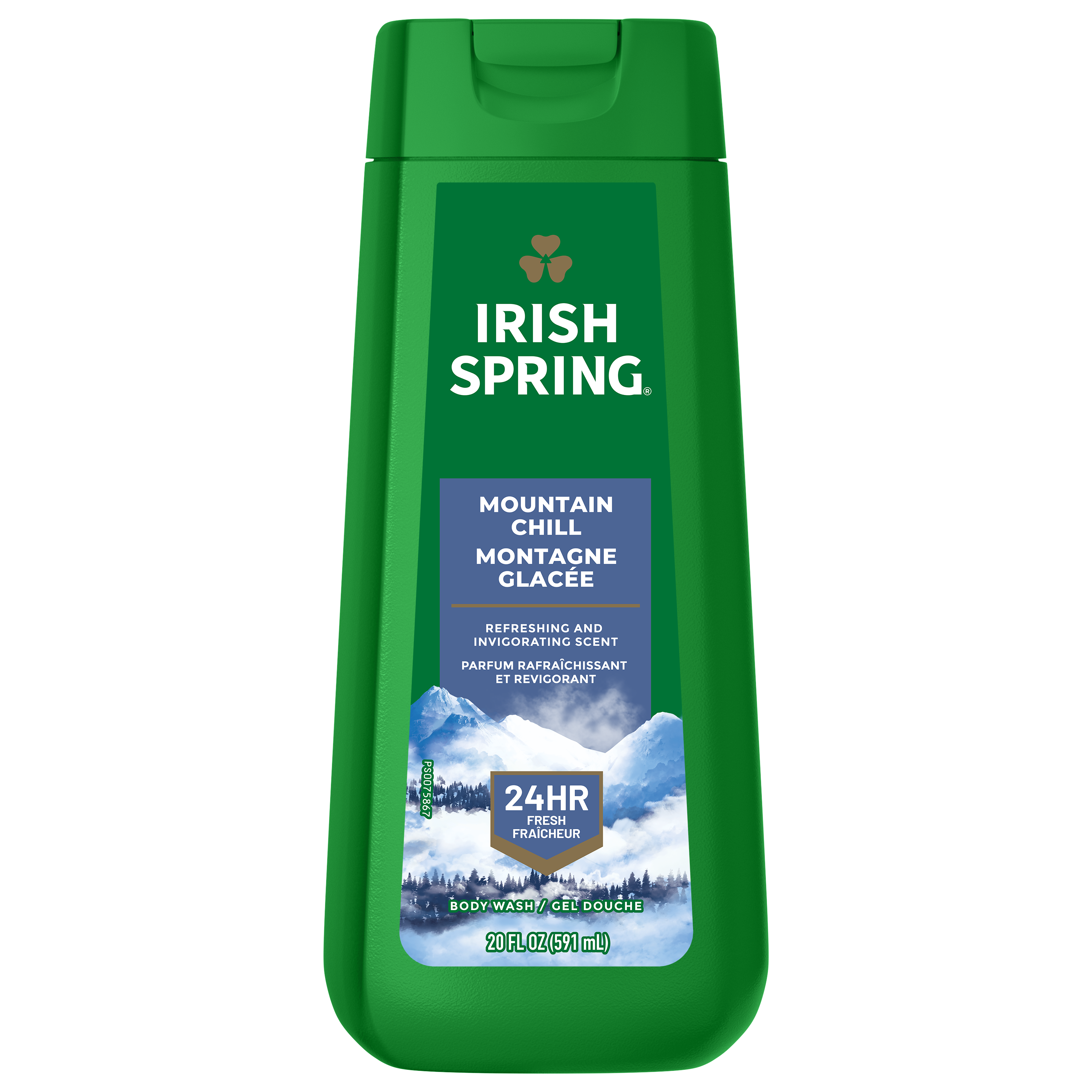 Product Title Irish Spring Mountain Chill Body Wash for Men, 591 mL SKU 61017736 SKU eCommerce Name Irish Spring Mountain Chill Body Wash for Men, 591 mL Consumer Unit - GTIN 00035000994745 Case - GTIN 10035000994742 Product Category Personal Care Product Sub Category Body Wash Brand Irish Spring Product Sub Brand Irish Spring BW Consumer Unit Gross Weight 0.659 KG / 1.453 LB Consumer Unit Net Weight 0.567 KG / 1.250 LB Consumer Unit Length 53.000 MM / 2.087 IN Consumer Unit Width 90.000 MM / 3.543 IN Consumer Unit Height 227.000 MM / 8.937 IN Consumer Unit Volume 0.111 C8 / 0.004 CF Product Title Irish Spring Mountain Chill Body Wash for Men, 591 mL Product Description Experience the cool outdoor freshness in every bottle of Irish Spring Mountain Chill Moisturizing Face and Body Wash. Your ultimate solution for a refreshing, moisturizing cleanse. This moisturizing face and body wash helps to retain your skin's natural moisture. Its refreshing and invigorating scent will keep you fresh for 24 hours. Plus, it’s paraben free and formulated without phthalates. This moisturizing body wash lathers up beautifully and effectively washes away bacteria, leaving you with a sense of cleanliness and confidence. Irish Spring has a new cap with leak-proof design ensuring you stay fresh no matter where your journey takes you. eCommerce Copy Irish Spring body wash might have a new design, but it’s still the same great body wash you love to smell. Feel clean, smell serene with Irish Spring Mountain Chill Body Wash. The larger size bottle (591 mL vs. 532 mL) of shower gel for men gives you more smell, so you don’t have to replace it as often. Irish Spring Mountain Chill Body Wash leaves your skin feeling clean, retains skin’s natural moisture and washes away bacteria. Use this shower gel as a face wash, too. Irish Spring Body Wash keeps you fresh for 24 hours. eCommerce Copy- Long Description Feel clean, smell serene with Irish Spring Body Wash. Count on Irish Spring Mountain Chill Body Wash to leave your skin feeling clean — our body wash for men retains skin’s natural moisture while keeping you fresh for 24 hours. Our bottle might have a new design, but it’s still the same great body wash you love to smell. Our packaging refresh is all part of our master plan to bring the amazing places you love to smell straight to your bathroom. Plus, the larger size body wash bottle (591 mL vs. 532 mL) gives you more smell in a sleeker design, so it’s shower-shelf ready and you don’t have to replace it as often. Irish Spring Mountain Chill Body Wash has a sudsy lather that washes away bacteria, so you can use it as a face wash or hand soap and feel good while washing from head-to-toe with Irish Spring. Made with biodegradable cleansing ingredients, this men’s shower gel is paraben free and formulated without phthalates. Get as fresh as the great outdoors and add some adventure to your everyday with the whole Spring of bar soaps and body washes for men. Smell like you came from a nice-smelling place with the new Irish Spring. Bullet 1 What’s Included: One 591 mL bottle of Irish Spring Mountain Chill Face and Body Wash for Men Bullet 2 Feel Clean and Fresh: Enjoy 24 hours of long-lasting freshness Bullet 3 Retains Skin’s Natural Moisture: Use as a men’s body wash or face wash Bullet 4 Cap With Leak-Proof Design: Comes with a new cap with leak-proof design so you can stay fresh no matter where your journey takes you Bullet 5 Feeling Clean: Formulated without phthalates and parabens leaving you clean Bullet 6 Refreshing and Invigorating Scent: Your ultimate solution for a moisturizing cleanse Keywords (eCommerce) aloe body wash, aloe vera body wash, mint body wash, hydrating body wash, moisturizing body wash, soothing body wash, sensitive body wash, body wash for sensitive skin, gender neutral body wash, organic body wash, men's shower gel, women's shower gel, coconut body wash, scented body wash, citrus body wash, antiperspirant body wash, antibacterial body wash, body wash for dry skin, natural body wash, fly insect repellent, backyard pest repeller, bug repellent, citronella, mosquito repellent, insect repellent, insect repellant OS Amazon Product Title Irish Spring Mountain Chill Moisturizing Body Wash for Men, 24-Hour Fresh, Face and Body Wash, Men’s Body Wash, Biodegradable Ingredients, Paraben Free, Cool Fresh Scent, 591 mL Bottle OS Amazon Product Description Experience the cool outdoor freshness in every bottle of Irish Spring Mountain Chill Moisturizing Face and Body Wash. Your ultimate solution for a refreshing, moisturizing cleanse. This moisturizing face and body wash helps to retain your skin's natural moisture. Its refreshing and invigorating scent will keep you fresh for 24 hours. Plus, it’s paraben free and formulated without phthalates. This moisturizing body wash lathers up beautifully and effectively washes away bacteria, leaving you with a sense of cleanliness and confidence. Irish Spring has a new cap with leak-proof design ensuring you stay fresh no matter where your journey takes you. OS Amazon Bullet 1 What’s Included: One 591 mL bottle of Irish Spring Mountain Chill Face and Body Wash for Men OS Amazon Bullet 2 Feel Clean and Fresh: Enjoy 24 hours of long-lasting freshness OS Amazon Bullet 3 Retains Skin’s Natural Moisture: Use as a men’s body wash or face wash OS Amazon Bullet 4 Cap With Leak-Proof Design: Comes with a new cap with leak-proof design so you can stay fresh no matter where your journey takes you OS Amazon Bullet 5 Feeling Clean: Formulated without phthalates and parabens leaving you clean OS Walmart Product Title Irish Spring Mountain Chill Moisturizing Body Wash for Men, 591 mL Bottle OS Walmart Product Description Experience the cool outdoor freshness in every bottle of Irish Spring Mountain Chill Moisturizing Face and Body Wash. Your ultimate solution for a refreshing, moisturizing cleanse. This moisturizing face and body wash helps to retain