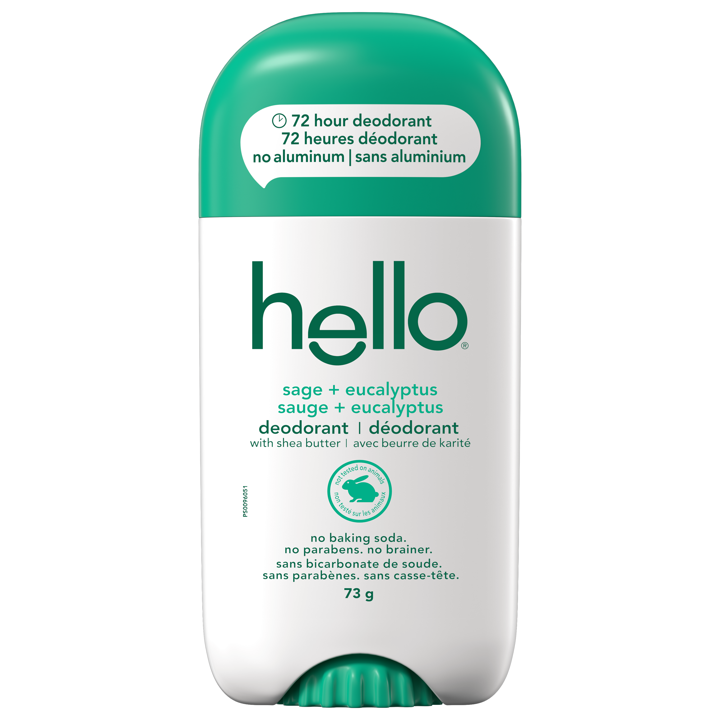 Product Title Déodorant Hello sauge + eucalyptus sans aluminium pour femmes et hommes, bâton de 73 g SKU 61019914 SKU eCommerce Name Déodorant Hello sauge + eucalyptus sans aluminium pour femmes et hommes, bâton de 73 g Consumer Unit - GTIN 00827854000532 Case - GTIN 10827854000539 Product Category Personal Care Product Sub Category AP > Deo Brand hello Product Sub Brand Hello AP/Deo Consumer Unit Gross Weight 0.120 KG / 0.265 LB Consumer Unit Net Weight 0.072 KG / 0.159 LB Consumer Unit Length 30.000 MM / 1.181 IN Consumer Unit Width 58.000 MM / 2.283 IN Consumer Unit Height 125.000 MM / 4.921 IN Consumer Unit Volume 0.218 C8 / 0.008 CF Product Title Déodorant Hello sauge + eucalyptus sans aluminium pour femmes et hommes, bâton de 73 g Product Description Say hello to hello Sage + Eucalyptus Aluminum Free Deodorant. Give your pits a wake-up call with the crisp, herbal zing of sage and a refreshing blast of eucalyptus. Our 24-hour deodorant with shea butter is dermatologically tested and naturally scented to keep you feeling fresh all day. Say goodbye to aluminum, baking soda, parabens, and dyes. Plus, it glides on easily for a smooth application and won’t stain your clothes. Choose friendly with a deodorant that's not tested on animals and vegan for happy underarms. Anything less would be the pits. eCommerce Copy Say hello to hello Sage + Eucalyptus Aluminum Free Deodorant. Give your pits a wake up call with the crisp, herbal zing of sage and a refreshing blast of eucalyptus. Our 24-hour deodorant with shea butter is dermatologically tested and naturally scented to keep you feeling fresh all day. Say goodbye to aluminum, baking soda, parabens, and dyes. Plus, it glides on easily for a smooth application and won’t stain your clothes. Choose friendly with a deodorant that's not tested on animals and vegan for happy underarms. Anything less would be the pits eCommerce Copy- Long Description Say hello to hello Sage + Eucalyptus Aluminum Free Deodorant. Give your pits a wake up call with the crisp, herbal zing of sage and a refreshing blast of eucalyptus. Our 24-hour deodorant with shea butter is dermatologically tested and naturally scented to keep you feeling fresh all day. Say goodbye to aluminum, baking soda, parabens, and dyes. Plus, it glides on easily for a smooth application and won’t stain your clothes. Choose friendly with a deodorant that's not tested on animals and vegan for happy underarms. Anything less would be the pits Bullet 1 WHAT I’M GETTING: Includes one 73 g deodorant stick of hello Sage + Eucalyptus Aluminum Free Deodorant for Men and Women Bullet 2 ALUMINUM FREE PROTECTION: Free of aluminum, dyes, baking soda, and parabens Bullet 3 NATURALLY SCENTED: Give your pits a wake-up call with the crisp, herbal sing of sage and refreshing blast of eucalyptus Bullet 4 24-HOUR DEODORANT WITH SHEA BUTTER: Keeps you fresh + friendly for 24 hours, so you can take on the day with confidence Bullet 5 KNOW YOUR DEODORANT: Vegan and dermatologically tested Keywords (eCommerce) déodorant pour hommes, déodorant naturel, déodorant, désodorisant naturel, déodorants, déodorant pour aisselles pour femmes, déodorant végétalien, déo, déodorant naturel, déodorant sans aluminium OS Amazon Product Title hello Sage and Eucalyptus Aluminum Free Deodorant for Women and Men with Shea Butter, 24-Hour Freshness, Baking Soda Free Deodorant, Dermatologically Tested, 73 g Stick OS Amazon Product Description Say hello to hello Sage and Eucalyptus Aluminum Free Deodorant. Give your pits a wake-up call with the crisp, herbal zing of sage and a refreshing blast of eucalyptus. Our 24-hour deodorant with shea butter is dermatologically tested and naturally scented to keep you feeling fresh all day. Say goodbye to aluminum, baking soda, parabens, and dyes. Plus, it glides on easily for a smooth application and won’t stain your clothes. Choose friendly with a deodorant that's not tested on animals and vegan for happy underarms. Anything less would be the pits. OS Amazon Bullet 1 WHAT I’M GETTING: Includes one 73 g deodorant stick of hello Sage and Eucalyptus Aluminum Free Deodorant for Men and Women OS Amazon Bullet 2 ALUMINUM FREE PROTECTION: Free of aluminum, dyes, baking soda, and parabens OS Amazon Bullet 3 NATURALLY SCENTED: Give your pits a wake-up call with the crisp, herbal sing of sage and refreshing blast of eucalyptus OS Amazon Bullet 4 24-HOUR DEODORANT WITH SHEA BUTTER: Keeps you fresh and friendly for 24 hours, so you can take on the day with confidence OS Amazon Bullet 5 KNOW YOUR DEODORANT: Vegan and dermatologically tested OS Walmart Product Title hello Sage + Eucalyptus Aluminum Free Deodorant with Shea Butter, 73 g Stick OS Walmart Product Description Say hello to hello Sage + Eucalyptus Aluminum Free Deodorant. Give your pits a wake-up call with the crisp, herbal zing of sage and a refreshing blast of eucalyptus. Our 24-hour deodorant with shea butter is dermatologically tested and naturally scented to keep you feeling fresh all day. Say goodbye to aluminum, baking soda, parabens, and dyes. Plus, it glides on easily for a smooth application and won’t stain your clothes. Choose friendly with a deodorant that's not tested on animals and vegan for happy underarms. Anything less would be the pits. OS Walmart Bullet 1 WHAT I’M GETTING: Includes one 73 g deodorant stick of hello Sage + Eucalyptus Aluminum Free Deodorant for Men and Women OS Walmart Bullet 2 ALUMINUM FREE PROTECTION: Free of aluminum, dyes, baking soda, and parabens OS Walmart Bullet 3 NATURALLY SCENTED: Give your pits a wake-up call with the crisp, herbal sing of sage and refreshing blast of eucalyptus OS Walmart Bullet 4 24-HOUR DEODORANT WITH SHEA BUTTER: Keeps you fresh + friendly for 24 hours, so you can take on the day with confidence OS Walmart Bullet 5 KNOW YOUR DEODORANT: Vegan and dermatologically tested OS Loblaws Product Title hello Sage + Eucalyptus Aluminum Free Deodorant for Women, 73 g