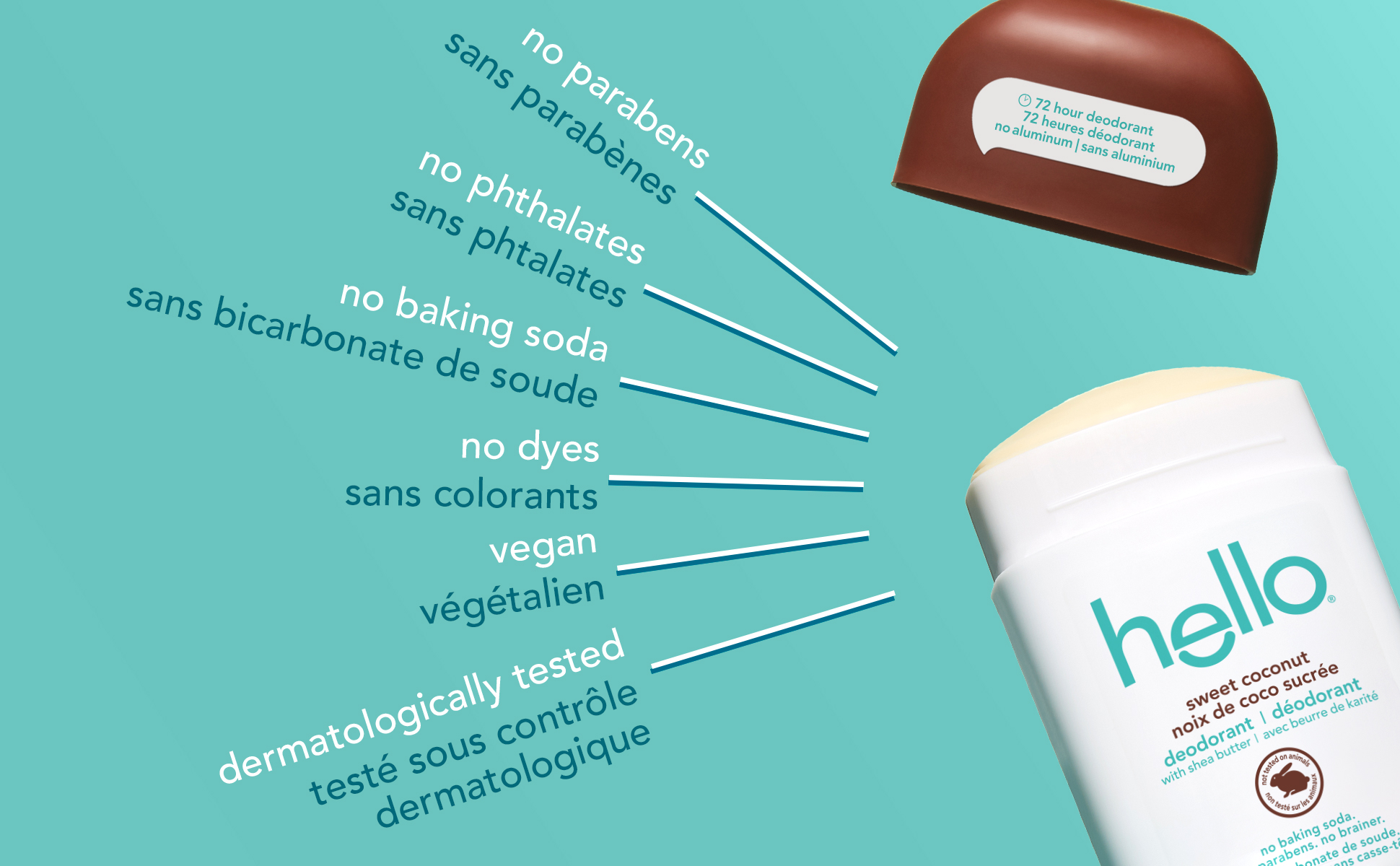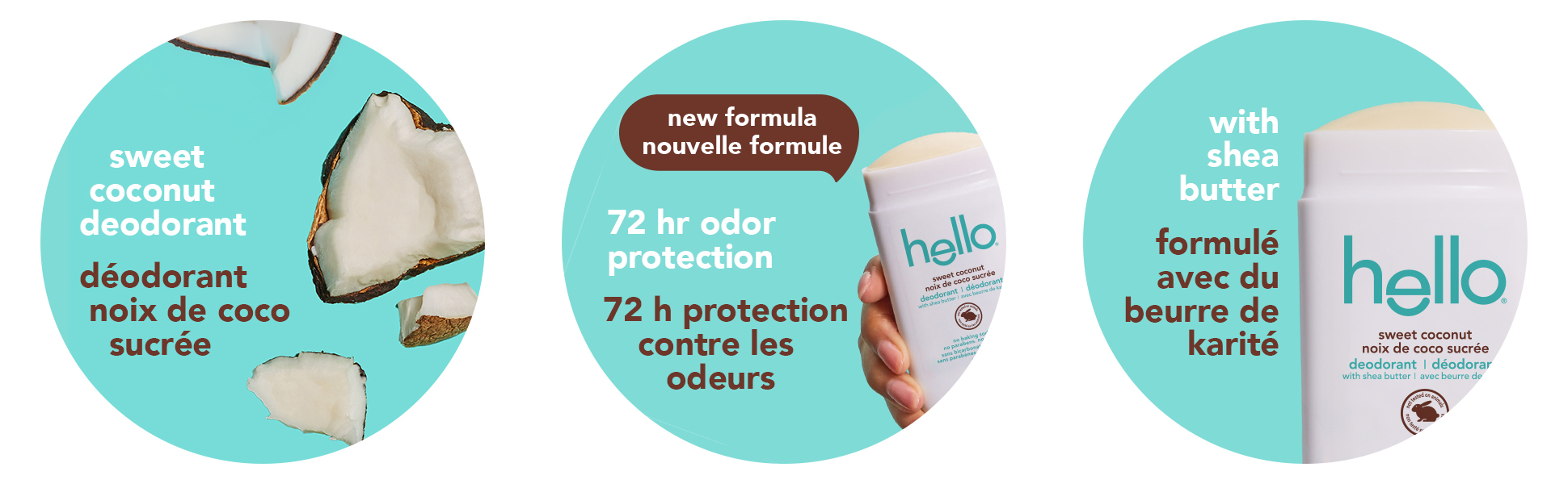 Product Title hello Sweet Coconut Aluminum Free Deodorant for Women and Men, 72-Hour Deodorant, Baking Soda Free, Enriched with Shea Butter, Vegan, 76 g Stick Deodorant SKU 61022929 SKU eCommerce Name hello Sweet Coconut Aluminum Free Deodorant for Women and Men with Shea Butter, 24-Hour Freshness, Baking Soda Free Deodorant, Dermatologically Tested, 73 g Deodorant Stick Consumer Unit - GTIN 00827854000471 Case - GTIN 10827854003035 Product Category Personal Care Product Sub Category AP > Deo Brand hello Product Sub Brand Hello AP/Deo Consumer Unit Gross Weight 0.120 KG / 0.265 LB Consumer Unit Net Weight 0.020 KG / 0.044 LB Consumer Unit Length 58.000 MM / 2.283 IN Consumer Unit Width 30.000 MM / 1.181 IN Consumer Unit Height 125.000 MM / 4.921 IN Consumer Unit Volume 0.218 C8 / 0.008 CF Product Title hello Sweet Coconut Aluminum Free Deodorant for Women and Men, 72-Hour Deodorant, Baking Soda Free, Enriched with Shea Butter, Vegan, 76 g Stick Deodorant Product Description Say hello to hello Sweet Coconut Aluminum Free Deodorant. Stay fresh all day (and then some) with this 72-hour deodorant. Made without aluminum, parabens, phthalates, dyes, or baking soda, now that’s a no-brainer. This deodorant stick delivers an amazing scent that lasts and brings a little extra sunshine wherever you go. Creamy coconut and vanilla blend with swirls of sandalwood and musk—call it a wearable daydream. All of our deodorants are dermatologically tested, vegan, and not tested on animals. Goodbye staining. Our deos glide easily, providing even coverage. Plus, we packed it with shea butter, so your skin gets a little extra love every time you swipe. Perfect for everyday use—men, women, and teen-friendly (younger kids, ask an adult first). Don't wait. Put it on and make any day a sweet escape with hello Sweet Coconut Aluminum Free Deodorant. eCommerce Copy Say hello to hello Sweet Coconut Aluminum Free Deodorant. Head to the tropics (no sunscreen needed!) with the rich, creamy scent of coconut. Our 24-hour deodorant with shea butter is dermatologically tested and naturally scented to keep you feeling fresh all day. Say goodbye to aluminum, baking soda, parabens,and dyes. Plus, it glides on easily for a smooth application and won’t stain your clothes. Choose friendly with a deodorant that's not tested on animals and vegan for happy underarms. Anything less would be the pits. eCommerce Copy- Long Description Say hello to hello Sweet Coconut Aluminum Free Deodorant. Head to the tropics (no sunscreen needed!) with the rich, creamy scent of coconut. Our 24-hour deodorant with shea butter is dermatologically tested and naturally scented to keep you feeling fresh all day. Say goodbye to aluminum, baking soda, parabens,and dyes. Plus, it glides on easily for a smooth application and won’t stain your clothes. Choose friendly with a deodorant that's not tested on animals and vegan for happy underarms. Anything less would be the pits. Bullet 1 Includes one 76 g stick of hello Sweet Coconut Aluminum Free Deodorant is for anyone who wants to bring vacation energy wherever they go Bullet 2 Made without aluminum, parabens, phthalates, dyes, or baking soda, now that’s a no-brainer Bullet 3 Stay fresh for up to 3 days—this shea butter deodorant keeps you confidently smelling great Bullet 4 Lush coconut, pineapple, jasmine, and vanilla mingle with amber, sandalwood, and musk—bringing warmth, ease, and a touch of escape Bullet 5 Dermatologically tested for peace of mind and picky-skin approved—vegan and not tested on animals Bullet 6 Perfect for everyday use—men, women, and teen-friendly (younger kids, ask an adult first) Keywords (eCommerce) deodorant for women, deodorant for men, natural deodorant, deodorant, natural deodorizing, deodorants, underarm deodorant for women, vegan deodorant, deo, natural deodorant, aluminum free deodorant, hello deo, deodorant for women, naturally scented deodorant, shea butter, deodorant stick, underarm deodorant, dermatologically tested deodorant, sensitive skin, coconut scent, coconut