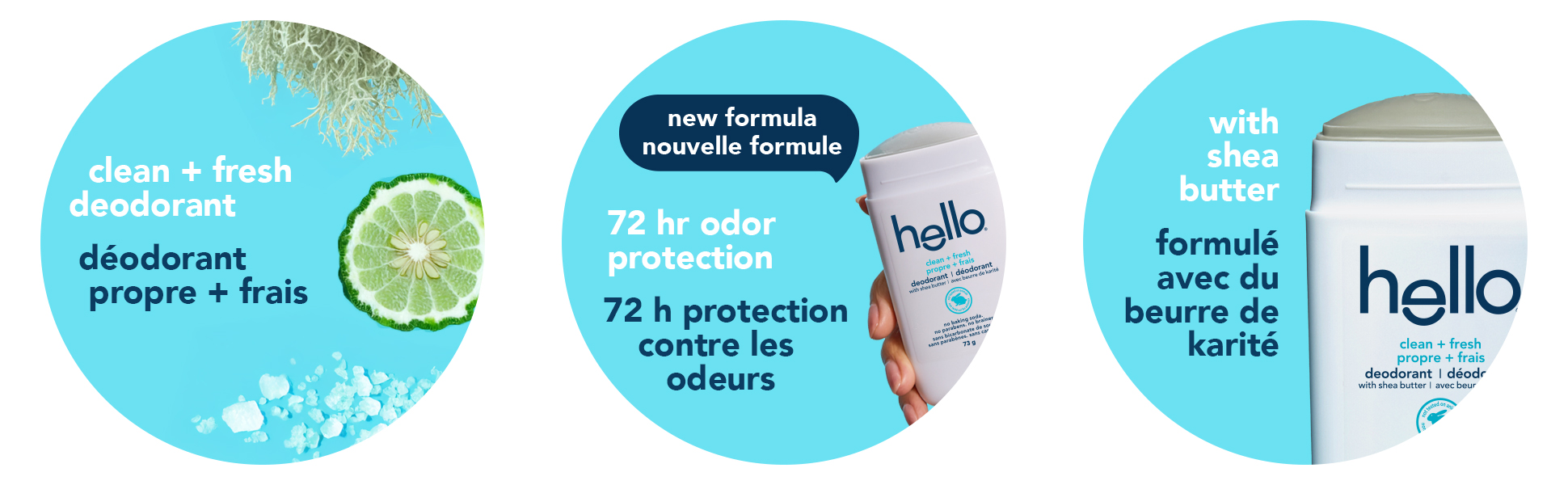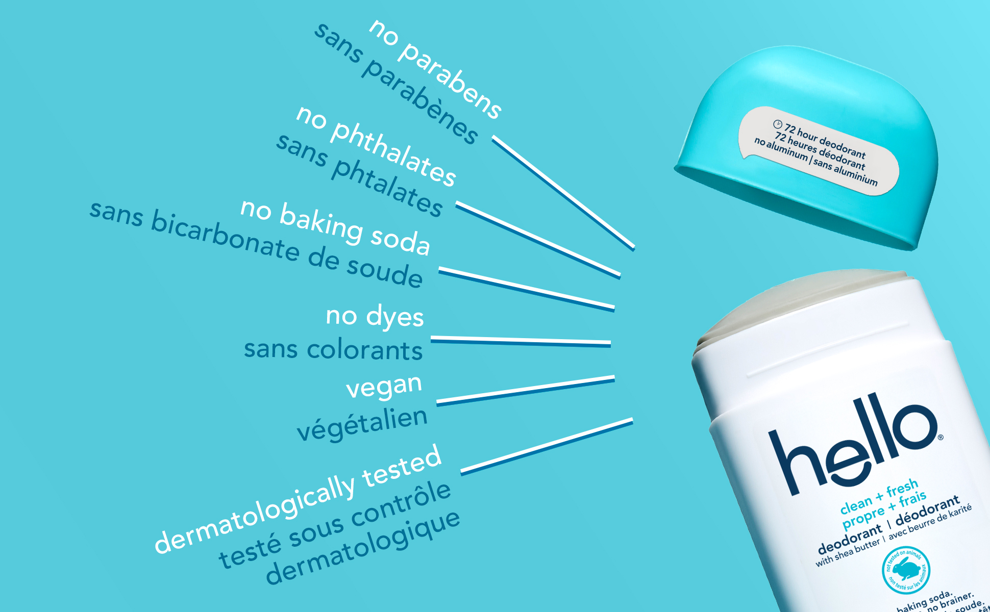 Product Title hello Clean + Fresh Aluminum Free Deodorant for Women and Men, 72-Hour Deodorant, Baking Soda Free, Enriched with Shea Butter, Vegan, 76 g Stick Deodorant SKU 61022934 SKU eCommerce Name hello Clean + Fresh Aluminum Free Deodorant for Women and Men with Charcoal, 24-Hour Freshness, Baking Soda Free Deodorant, Dermatologically Tested, 73 g Deodorant Stick Consumer Unit - GTIN 00827854000433 Case - GTIN 10827854003011 Product Category Personal Care Product Sub Category AP > Deo Brand hello Product Sub Brand Hello AP/Deo Consumer Unit Gross Weight 0.120 KG / 0.265 LB Consumer Unit Net Weight 0.072 KG / 0.159 LB Consumer Unit Length 58.000 MM / 2.283 IN Consumer Unit Width 30.000 MM / 1.181 IN Consumer Unit Height 125.000 MM / 4.921 IN Consumer Unit Volume 0.218 C8 / 0.008 CF Product Title hello Clean + Fresh Aluminum Free Deodorant for Women and Men, 72-Hour Deodorant, Baking Soda Free, Enriched with Shea Butter, Vegan, 76 g Stick Deodorant Product Description Say hello to hello Clean + Fresh Aluminum Free Deodorant. Stay fresh all day (and then some) with this 72-hour deodorant. Made without aluminum, parabens, phthalates, dyes, or baking soda, now that’s a no-brainer. This deodorant stick delivers an amazing scent that lasts and makes every day a little more renewed. Bright citrus and a splash of marine salt combine with oakmoss and amber, capturing an easy, breezy confidence in every swipe. All of our deodorants are dermatologically tested, vegan, and not tested on animals. Goodbye staining. Our deos glide easily providing even coverage. Plus, we packed it with shea butter, so your skin gets a little extra love every time you swipe. Perfect for everyday use—men, women, and teen-friendly (younger kids, ask an adult first). hello Clean + Fresh Deodorant is the ultimate “I’ve got my life together” scent—like just-washed sheets meets a spontaneous beach day. Smells like a fresh start. eCommerce Copy Say hello to hello Clean + Fresh Aluminum Free Deodorant. Breathe in the clean smell of the ocean mixed with an aromatic blend of herbs when you swipe on this deo. Our 24-hour deodorant with charcoal is dermatologically tested and naturally scented to keep you feeling fresh all day. Say goodbye to aluminum, baking soda, parabens, and dyes. Plus, it glides on easily for a smooth application and won’t stain your clothes. Choose friendly with a deodorant that's not tested on animals and vegan for happy underarms. Anything less would be the pits. eCommerce Copy- Long Description Say hello to hello Clean + Fresh Aluminum Free Deodorant. Breathe in the clean smell of the ocean mixed with an aromatic blend of herbs when you swipe on this deo. Our 24-hour deodorant with charcoal is dermatologically tested and naturally scented to keep you feeling fresh all day. Say goodbye to aluminum, baking soda, parabens, and dyes. Plus, it glides on easily for a smooth application and won’t stain your clothes. Choose friendly with a deodorant that's not tested on animals and vegan for happy underarms. Anything less would be the pits. Bullet 1 Includes one 76 g stick of hello Clean + Fresh Aluminum Free Deodorant for when you want to smell like the main character Bullet 2 Made without aluminum, parabens, phthalates, dyes, or baking soda, now that’s a no-brainer Bullet 3 Stay fresh for up to 3 days—this shea butter deodorant keeps you confidently odor-free Bullet 4 Zesty bergamot and lime meet sea salt and fresh florals, finished with oakmoss, amber, and musk—capturing easy, breezy confidence in every swipe Bullet 5 Dermatologically tested for peace of mind and picky-skin approved—vegan and not tested on animals Bullet 6 Perfect for everyday use—men, women, and teen-friendly (younger kids, ask an adult first) Keywords (eCommerce) deodorant for women, deodorant for men, natural deodorant, deodorant, natural deodorizing, deodorants, underarm deodorant for women, vegan deodorant, deo, aluminum free deodorant, hello deo, deodorant for women, naturally scented deodorant, shea butter, deodorant stick, underarm deodorant, dermatologically tested deodorant, sensitive skin, charcoal