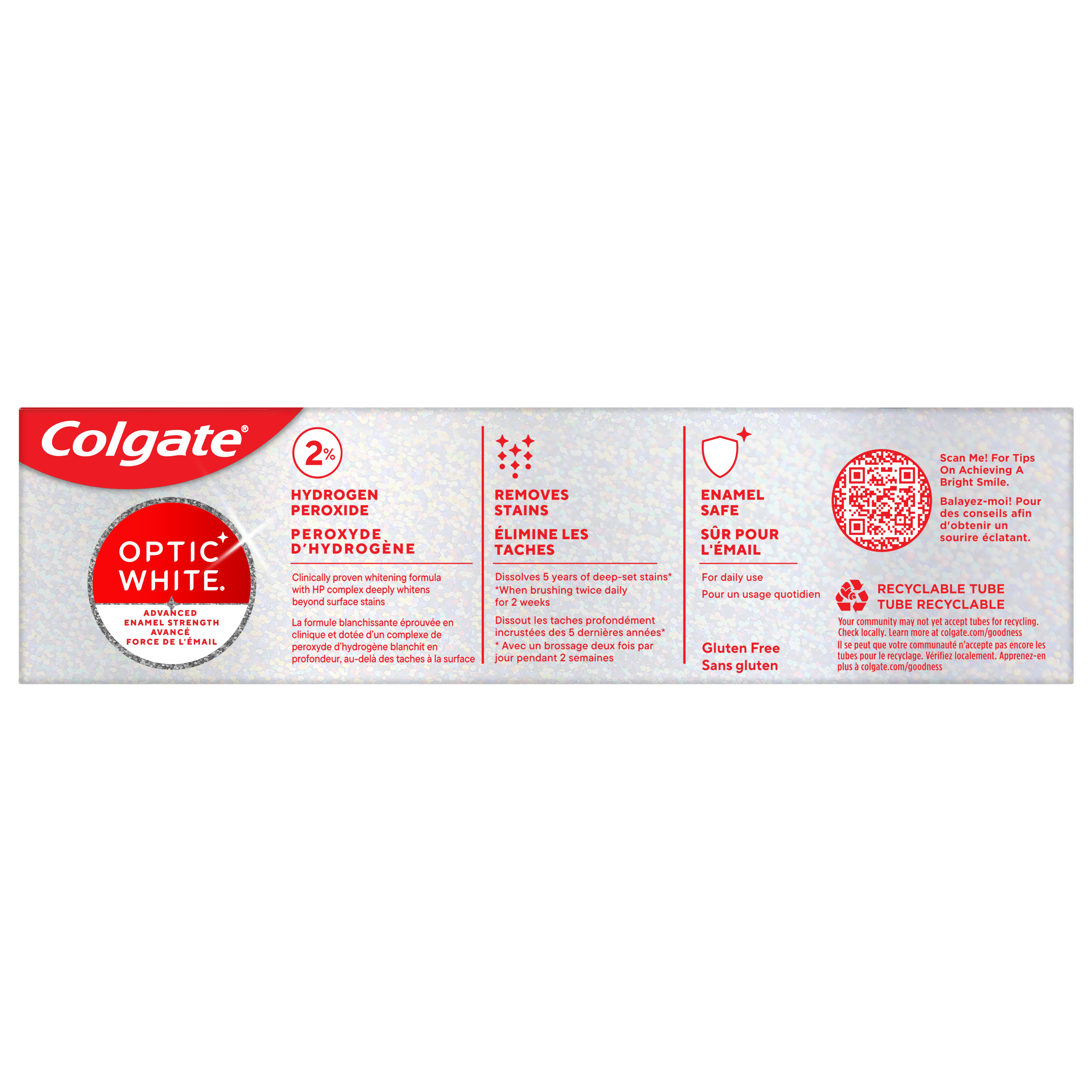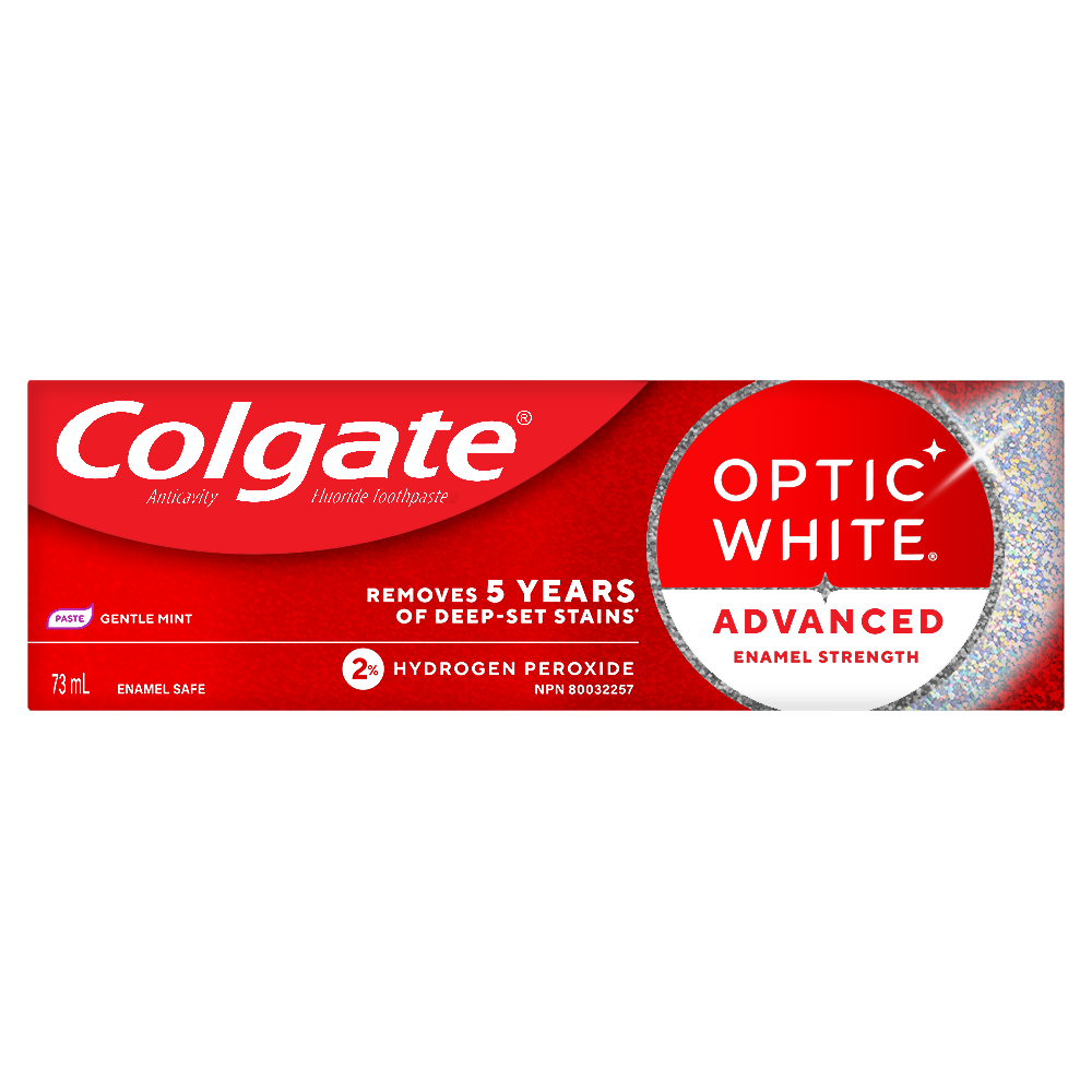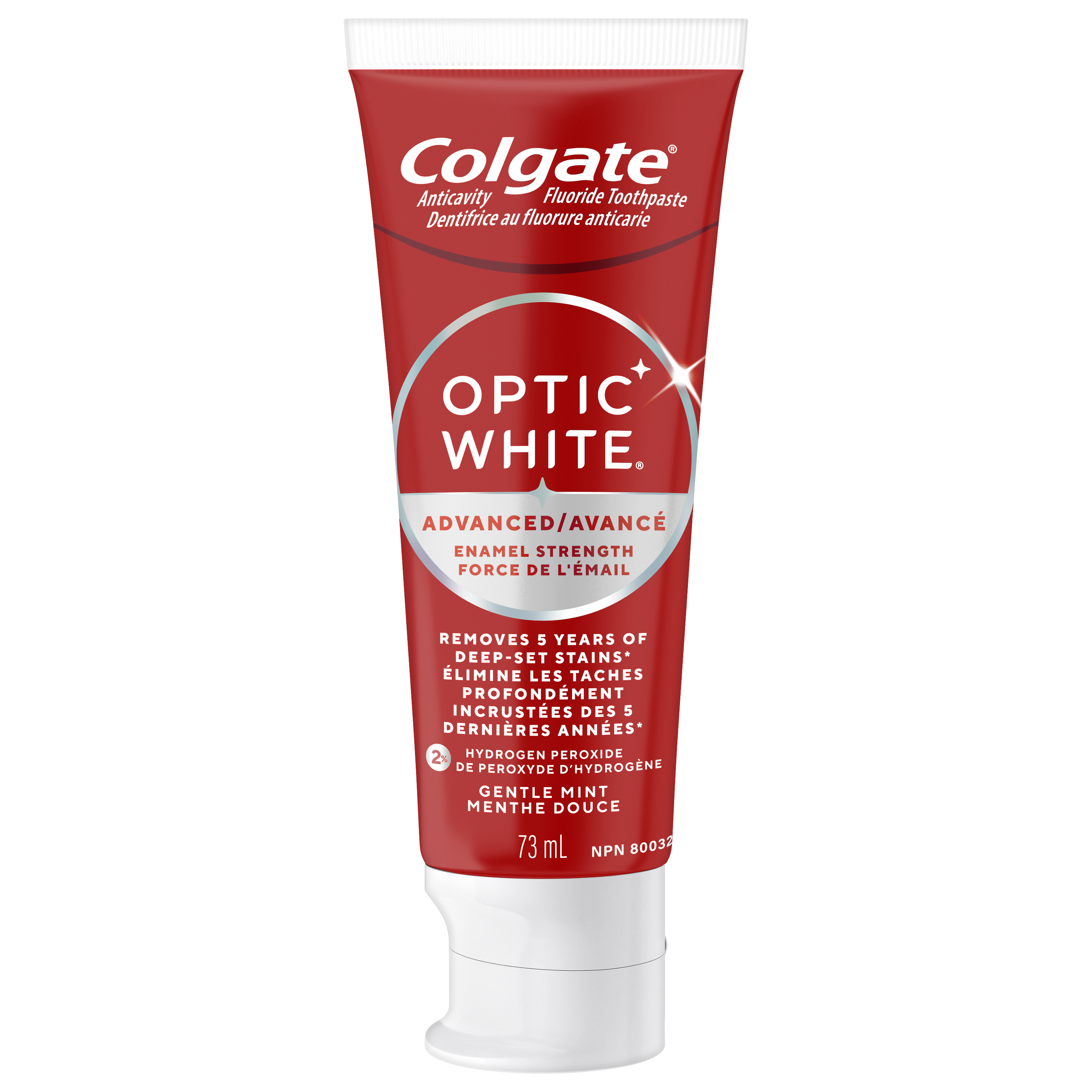 Product Title Colgate Optic White Advanced Enamel Strength Toothpaste with 2% Hydrogen Peroxide, 73 mL SKU 61029103 SKU eCommerce Name Colgate Optic White Advanced Teeth Whitening Toothpaste, Oxygenating White, 73 mL, 1 pack Consumer Unit - GTIN 00827854006060 Case - GTIN 10827854006067 Product Category Oral Care Product Sub Category Toothpaste Brand Colgate Product Sub Brand Colgate Optic White TP Consumer Unit Gross Weight 0.116 KG / 0.256 LB Consumer Unit Net Weight 0.091 KG / 0.201 LB Consumer Unit Length 41.000 MM / 1.614 IN Consumer Unit Width 159.000 MM / 6.260 IN Consumer Unit Height 50.000 MM / 1.969 IN Consumer Unit Volume 0.326 C8 / 0.012 CF Product Title Colgate Optic White Advanced Enamel Strength Toothpaste with 2% Hydrogen Peroxide, 73 mL Product Description Powered by HP Complex, our whitening formulation of Hydrogen Peroxide, Colgate Optic White Advanced toothpaste removes 5 years of deep-set stains for visibly whiter teeth*. This clinically proven whitening formula contains Hydrogen Peroxide, the same whitening ingredient used by dentists. For those who want to get visibly whiter teeth* without tooth sensitivity, our mint toothpaste provides enamel-safe stain removal for noticeable results*. Colgate Optic White Advanced is an anticavity fluoride toothpaste that whitens teeth with 2% hydrogen peroxide. Most other whitening toothpastes** only target surface stains, but Colgate Optic White's dual-action whitening formula with HP Complex gently diffuses below the surface of teeth as a deep-set stain remover toothpaste while micropolishers brush the surface clean. Colgate Optic White Advanced Enamel Strength helps protect and strengthen enamel. It’s a whitening toothpaste designed to dissolve deep-set stains without weakening enamel. Get visibly whiter teeth* without tooth sensitivity. With a delicate balance of peppermint and wintergreen flavours, Colgate Optic White Advanced Enamel Strength mint toothpaste delivers a mild sensation from start to finish. *when brushing twice daily for 2 weeks **without hydrogen peroxide eCommerce Copy <bulletlist><bullet>One 73 mL tube of Colgate Optic White Advanced Oxygenating White</bullet> <bullet>Deeply whitens teeth for up to 4 shades(1) with hydrogen peroxide</bullet> <bullet>Contains dentist recommended Hydrogen Peroxide for teeth whitening</bullet> <bullet>Goes beyond surface stains with Colgate’s patented 2% hydrogen peroxide formula</bullet> <bullet>Deeply whitens teeth inside and out, unlike ordinary toothpaste</bullet> <bullet>Enamel-safe teeth whitening, that’s good for daily use</bullet> <bullet>Fluoride toothpaste formula to protect against cavities</bullet> <bullet>Vegan toothpaste</bullet> <bullet>Sugar free and gluten free toothpaste</bullet></bulletlist> eCommerce Copy- Long Description Colgate Optic White Advanced Oxygenating White Teeth Whitening Toothpaste, Oxygenating White, 73 mL, 1 pack