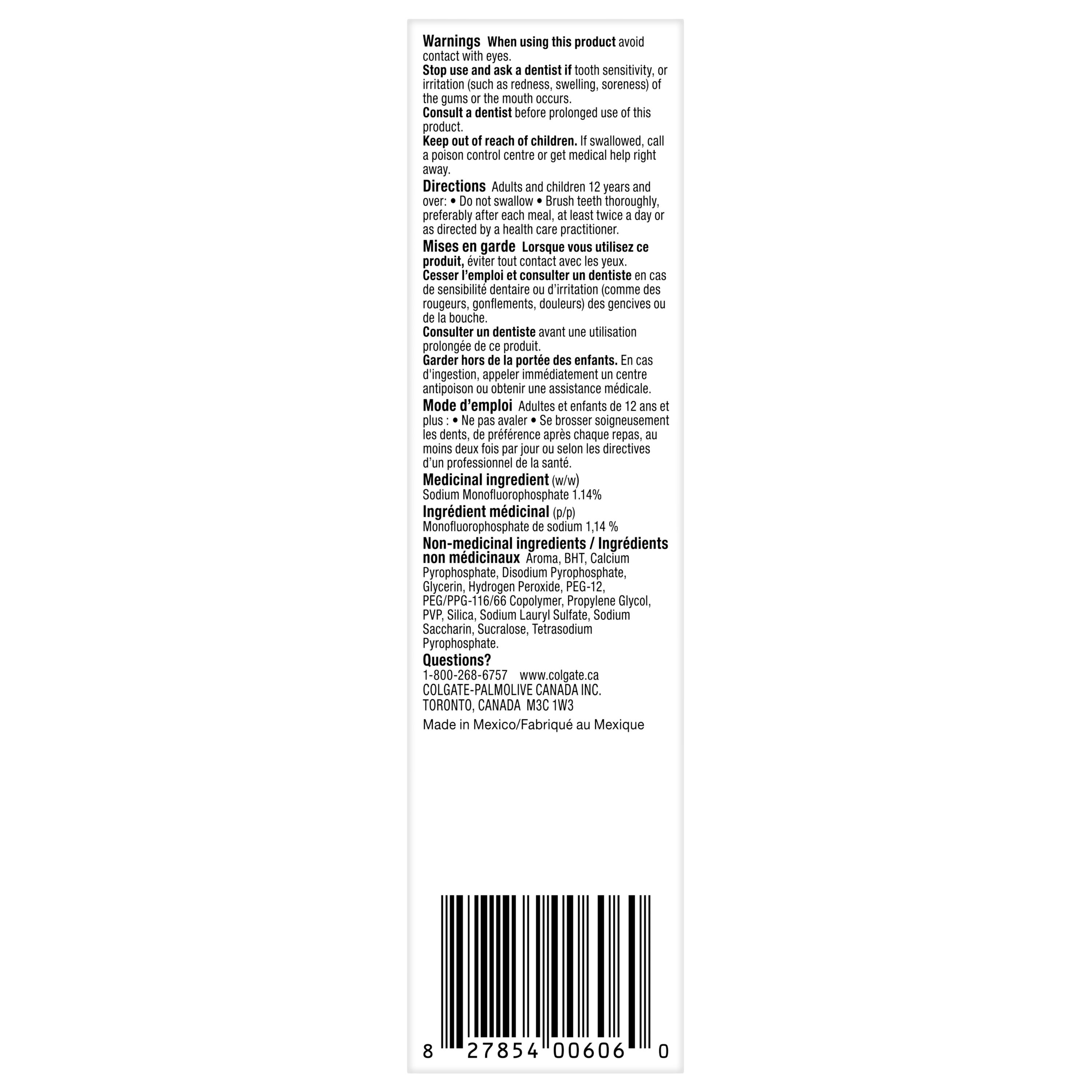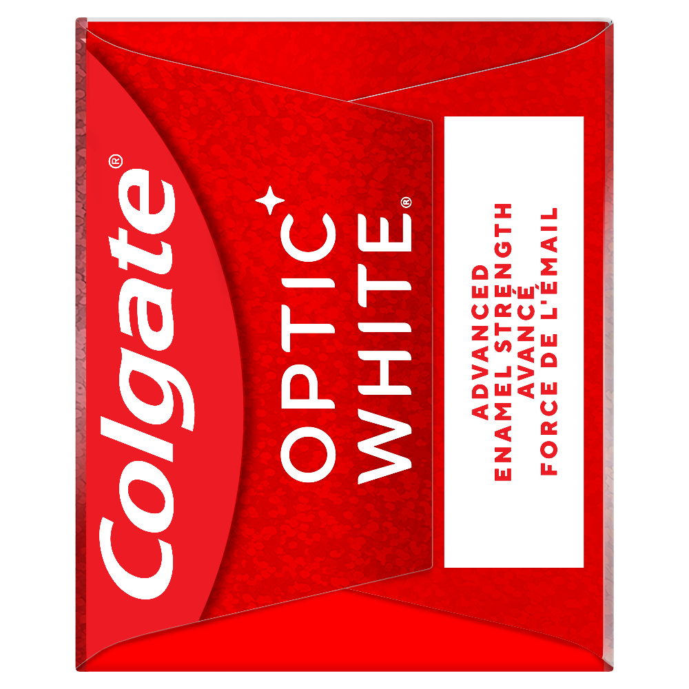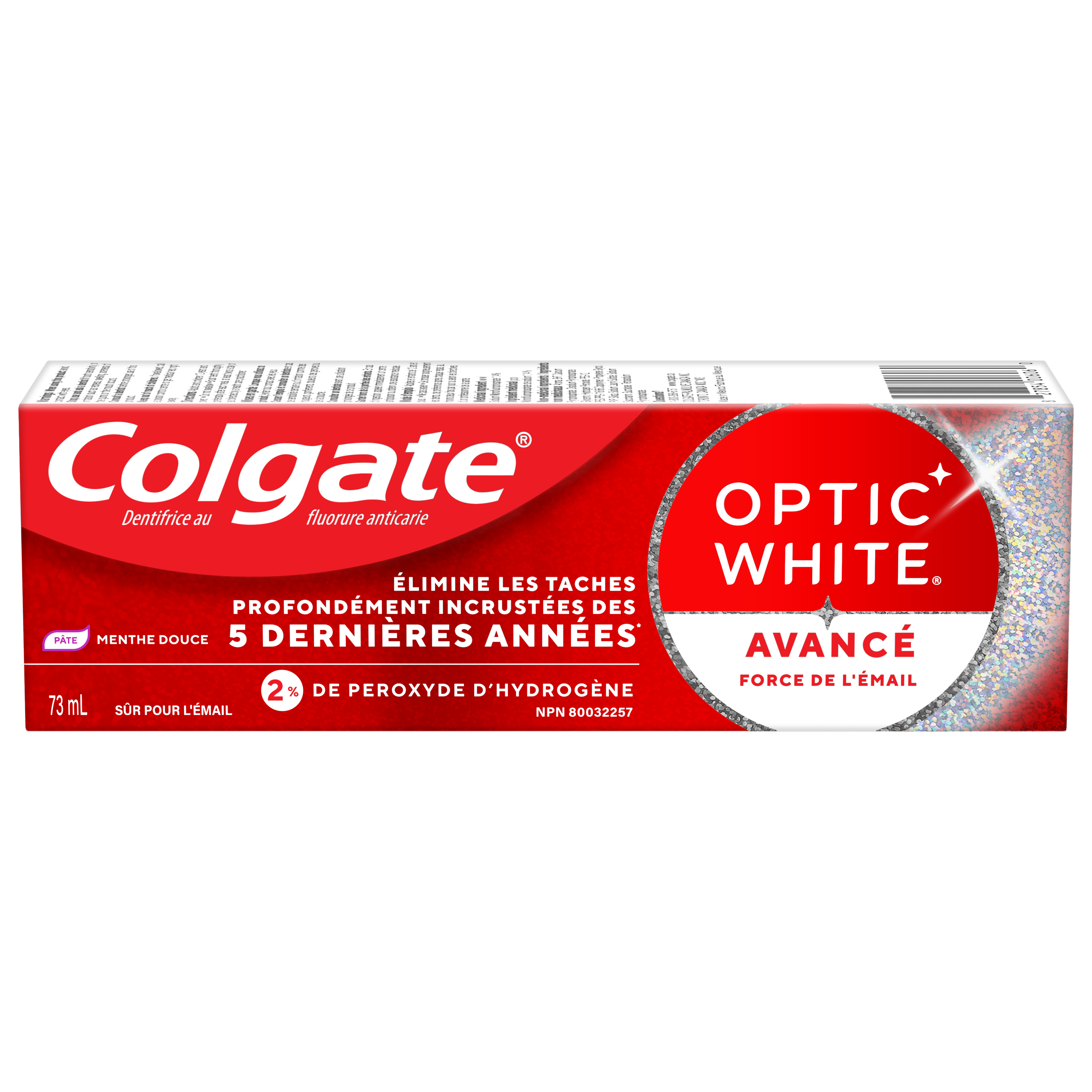Product Title Colgate Optic White Advanced Enamel Strength Toothpaste with 2% Hydrogen Peroxide, 73 mL SKU 61029103 SKU eCommerce Name Colgate Optic White Advanced Teeth Whitening Toothpaste, Oxygenating White, 73 mL, 1 pack Consumer Unit - GTIN 00827854006060 Case - GTIN 10827854006067 Product Category Oral Care Product Sub Category Toothpaste Brand Colgate Product Sub Brand Colgate Optic White TP Consumer Unit Gross Weight 0.116 KG / 0.256 LB Consumer Unit Net Weight 0.091 KG / 0.201 LB Consumer Unit Length 41.000 MM / 1.614 IN Consumer Unit Width 159.000 MM / 6.260 IN Consumer Unit Height 50.000 MM / 1.969 IN Consumer Unit Volume 0.326 C8 / 0.012 CF Product Title Colgate Optic White Advanced Enamel Strength Toothpaste with 2% Hydrogen Peroxide, 73 mL Product Description Powered by HP Complex, our whitening formulation of Hydrogen Peroxide, Colgate Optic White Advanced toothpaste removes 5 years of deep-set stains for visibly whiter teeth*. This clinically proven whitening formula contains Hydrogen Peroxide, the same whitening ingredient used by dentists. For those who want to get visibly whiter teeth* without tooth sensitivity, our mint toothpaste provides enamel-safe stain removal for noticeable results*. Colgate Optic White Advanced is an anticavity fluoride toothpaste that whitens teeth with 2% hydrogen peroxide. Most other whitening toothpastes** only target surface stains, but Colgate Optic White's dual-action whitening formula with HP Complex gently diffuses below the surface of teeth as a deep-set stain remover toothpaste while micropolishers brush the surface clean. Colgate Optic White Advanced Enamel Strength helps protect and strengthen enamel. It’s a whitening toothpaste designed to dissolve deep-set stains without weakening enamel. Get visibly whiter teeth* without tooth sensitivity. With a delicate balance of peppermint and wintergreen flavours, Colgate Optic White Advanced Enamel Strength mint toothpaste delivers a mild sensation from start to finish. *when brushing twice daily for 2 weeks **without hydrogen peroxide eCommerce Copy <bulletlist><bullet>One 73 mL tube of Colgate Optic White Advanced Oxygenating White</bullet> <bullet>Deeply whitens teeth for up to 4 shades(1) with hydrogen peroxide</bullet> <bullet>Contains dentist recommended Hydrogen Peroxide for teeth whitening</bullet> <bullet>Goes beyond surface stains with Colgate’s patented 2% hydrogen peroxide formula</bullet> <bullet>Deeply whitens teeth inside and out, unlike ordinary toothpaste</bullet> <bullet>Enamel-safe teeth whitening, that’s good for daily use</bullet> <bullet>Fluoride toothpaste formula to protect against cavities</bullet> <bullet>Vegan toothpaste</bullet> <bullet>Sugar free and gluten free toothpaste</bullet></bulletlist> eCommerce Copy- Long Description Colgate Optic White Advanced Oxygenating White Teeth Whitening Toothpaste, Oxygenating White, 73 mL, 1 pack