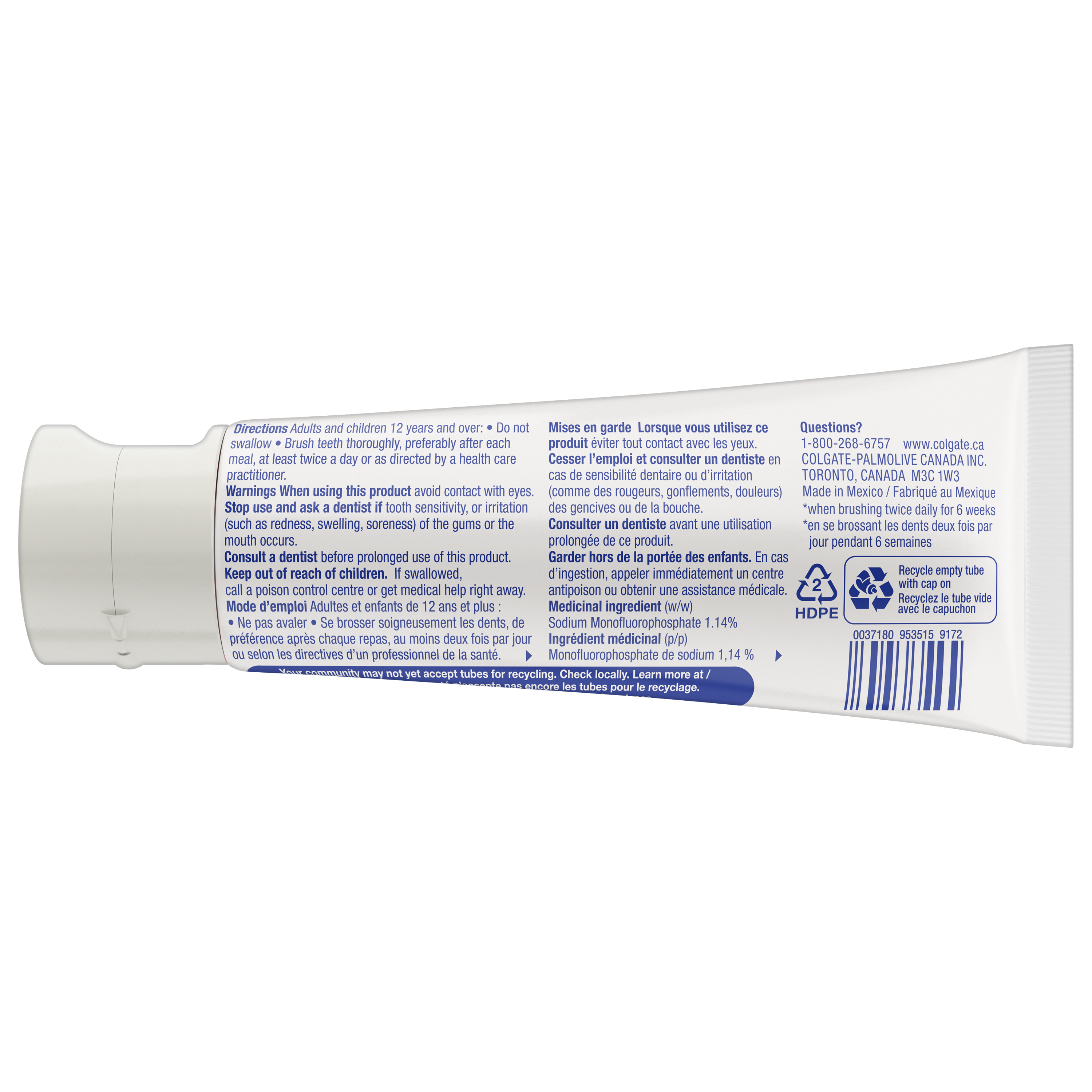 Bullet 1 One 73 mL tube of Colgate Optic White Advanced Enamel Strength Toothpaste Bullet 2 Advanced Enamel Strength Toothpaste removes 5 years of deep-set stains* *When brushing twice daily for 2 weeks Bullet 3 Our proprietary whitening formula with HP Complex includes hydrogen peroxide, the same whitening ingredient used by dentists, for deep whitening beyond surface stains Bullet 4 Helps protect and strengthen enamel Bullet 5 Clinically proven whitening formula with 2% hydrogen peroxide to dissolve stains beyond the surface of teeth Bullet 6 Mint toothpaste combines mild peppermint and wintergreen flavours Keywords (eCommerce) Colgate whitening toothpaste; colgate toothpaste; whitening toothpaste; colgate toothpaste; mint toothpaste; fluoride toothpaste; teeth whitening toothpaste; tooth whitening toothpaste; vegan toothpaste OS Amazon Product Title Colgate Optic White Advanced Enamel Strength Toothpaste with 2% Hydrogen Peroxide and Fluoride, Teeth Whitening Toothpaste, Mint Flavour, 73 mL OS Amazon Product Description Powered by HP Complex, our whitening formulation of Hydrogen Peroxide, Colgate Optic White Advanced toothpaste removes 5 years of deep-set stains for visibly whiter teeth*. This clinically proven whitening formula contains Hydrogen Peroxide, the same whitening ingredient used by dentists. For those who want to get visibly whiter teeth* without tooth sensitivity, our mint toothpaste provides enamel-safe stain removal for noticeable results*. Colgate Optic White Advanced is an anticavity fluoride toothpaste that whitens teeth with 2% hydrogen peroxide. Most other whitening toothpastes** only target surface stains, but Colgate Optic White's dual-action whitening formula with HP Complex gently diffuses below the surface of teeth as a deep-set stain remover toothpaste while micropolishers brush the surface clean. Colgate Optic White Advanced Enamel Strength helps protect and strengthen enamel. It’s a whitening toothpaste designed to dissolve deep-set stains without weakening enamel. Get visibly whiter teeth* without tooth sensitivity. With a delicate balance of peppermint and wintergreen flavours, Colgate Optic White Advanced Enamel Strength mint toothpaste delivers a mild sensation from start to finish. *when brushing twice daily for 2 weeks **without hydrogen peroxide OS Amazon Bullet 1 WHAT’S INCLUDED: One 73 mL tube of Colgate Optic White Advanced Enamel Strength Toothpaste OS Amazon Bullet 2 DEEP STAIN REMOVAL: Colgate Optic White Advanced Enamel Strength Toothpaste removes 5 years of deep-set stains* *When brushing twice daily for 2 weeks OS Amazon Bullet 3 2% HYDROGEN PEROXIDE: Our proprietary whitening formula with HP Complex is powered by hydrogen peroxide—the same whitening ingredient used by dentists—to deeply whiten beyond surface stains OS Amazon Bullet 4 ENAMEL STRENGTH: Helps protect and strengthen enamel OS Amazon Bullet 5 ANTICAVITY TOOTHPASTE: Colgate Optic White Advanced Enamel Strength contains fluoride to fight cavities OS Amazon On Page Keywords teeth whitening toothpaste, whitening toothpaste, hydrogen peroxide toothpaste OS Walmart Product Title Colgate Optic White Advanced Enamel Strength Toothpaste with Fluoride, 73 mL OS Walmart Product Description Powered by HP Complex, our whitening formulation of Hydrogen Peroxide, Colgate Optic White Advanced toothpaste removes 5 years of deep-set stains for visibly whiter teeth*. This clinically proven whitening formula contains Hydrogen Peroxide, the same whitening ingredient used by dentists. For those who want to get visibly whiter teeth* without tooth sensitivity, our mint toothpaste provides enamel-safe stain removal for noticeable results*. Proven Whitening Formulas. Visible Results.* Colgate Optic White Advanced is an anticavity fluoride toothpaste that whitens teeth with 2% hydrogen peroxide. Most other whitening toothpastes** only target surface stains, but Colgate Optic White's dual-action whitening formula with HP Complex gently diffuses below the surface of teeth as a deep-set stain remover toothpaste while micropolishers brush the surface clean. Enamel Strength Colgate Optic White Advanced Enamel Strength helps protect and strengthen enamel. It’s a whitening toothpaste designed to dissolve deep-set stains without weakening enamel. Get visibly whiter teeth* without tooth sensitivity. Mint Toothpaste With a delicate balance of peppermint and wintergreen flavours, Colgate Optic White Advanced Enamel Strength mint toothpaste delivers a mild sensation from start to finish. *when brushing twice daily for 2 weeks **without hydrogen peroxide OS Walmart Bullet 1 One 73 mL tube of Colgate Optic White Advanced Enamel Strength Toothpaste OS Walmart Bullet 2 Advanced Enamel Strength Toothpaste removes 5 years of deep-set stains* *When brushing twice daily for 2 weeks OS Walmart Bullet 3 Our proprietary whitening formula with HP Complex includes hydrogen peroxide, the same whitening ingredient used by dentists, for deep whitening beyond surface stains OS Walmart Bullet 4 Helps protect and strengthen enamel OS Walmart Bullet 5 Clinically proven whitening formula with 2% hydrogen peroxide to dissolve stains beyond the surface of teeth OS Walmart Bullet 6 Mint toothpaste combines mild peppermint and wintergreen flavours OS Walmart Bullet 7 Advanced Enamel Strength is an anticavity toothpaste OS Walmart On Page Keywords teeth whitening toothpaste, whitening toothpaste, hydrogen peroxide toothpaste Walmart Bullet 1 Includes one (1) 73 mL tube of Colgate Optic White Advanced Oxygenating White Hydrogen Peroxide Toothpaste, Teeth Whitening Toothpaste Walmart Bullet 2 Remove 5 years of stains* with the Colgate Optic White Advanced Teeth Whitening Toothpaste (*when brushing twice daily for 2 weeks) Walmart Bullet 3 This 2% hydrogen peroxide toothpaste uses a patented whitening formula and comes in an Oxygenating White mint toothpaste flavor Walmart Bullet 4 Enamel-safe and effectively removes tea, coffee and w