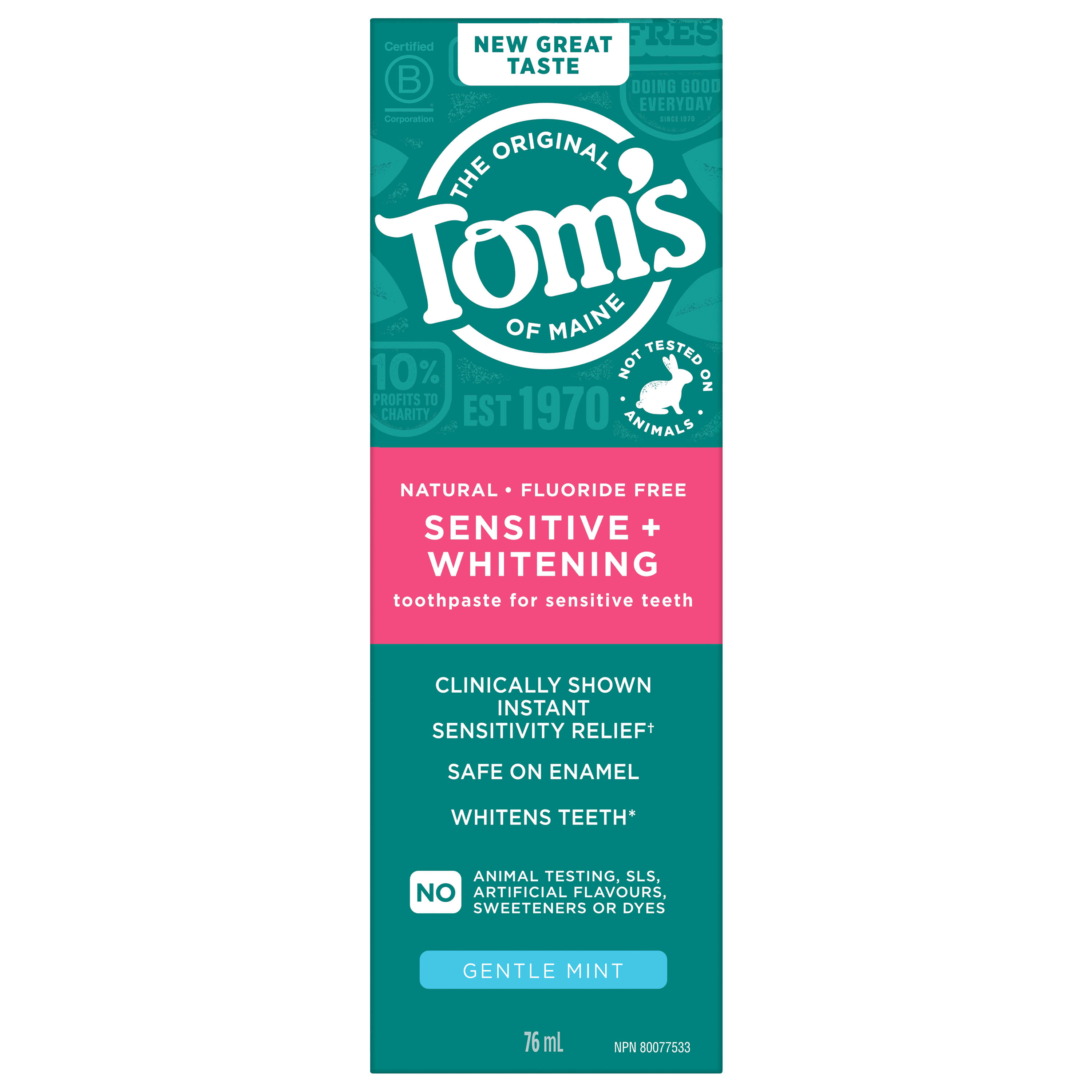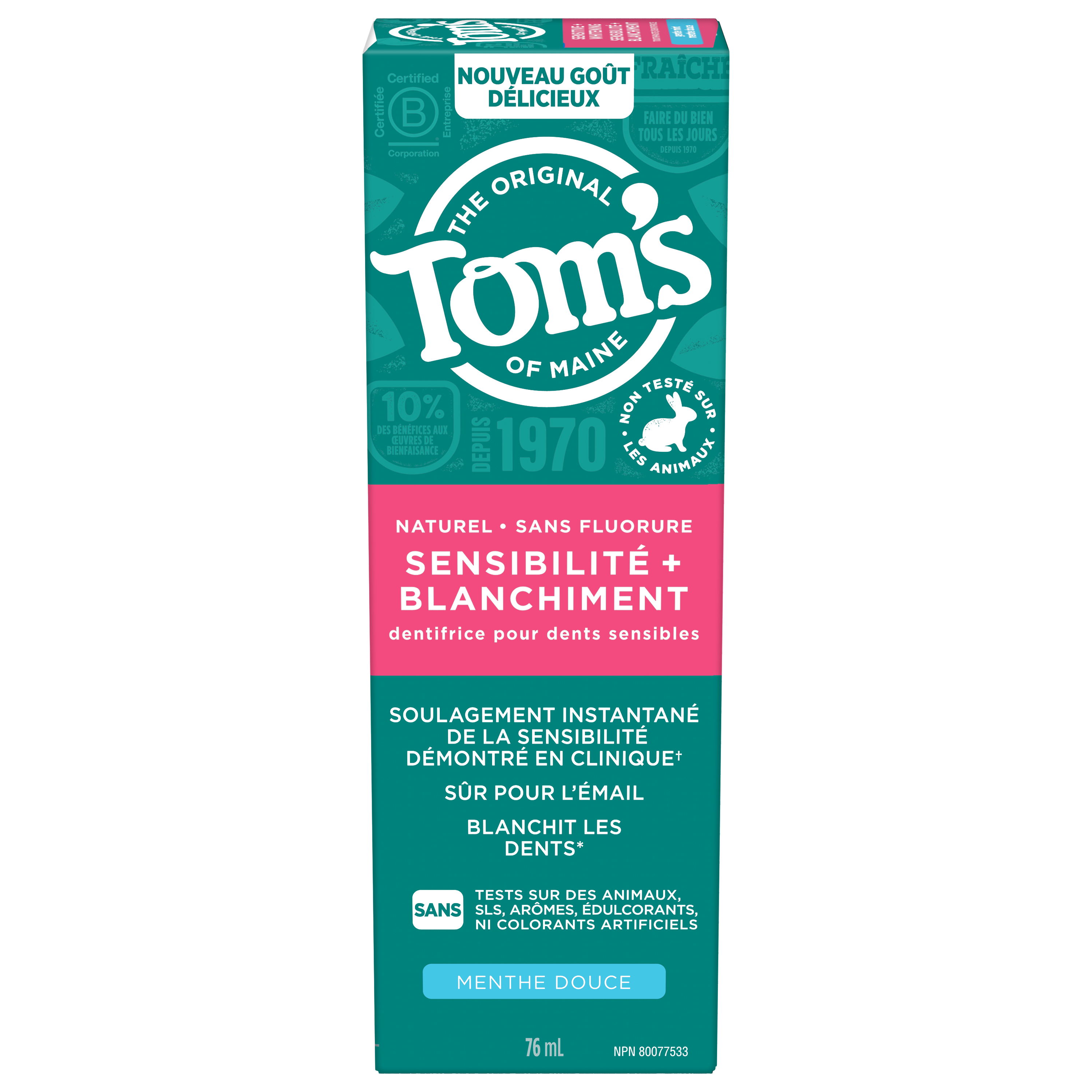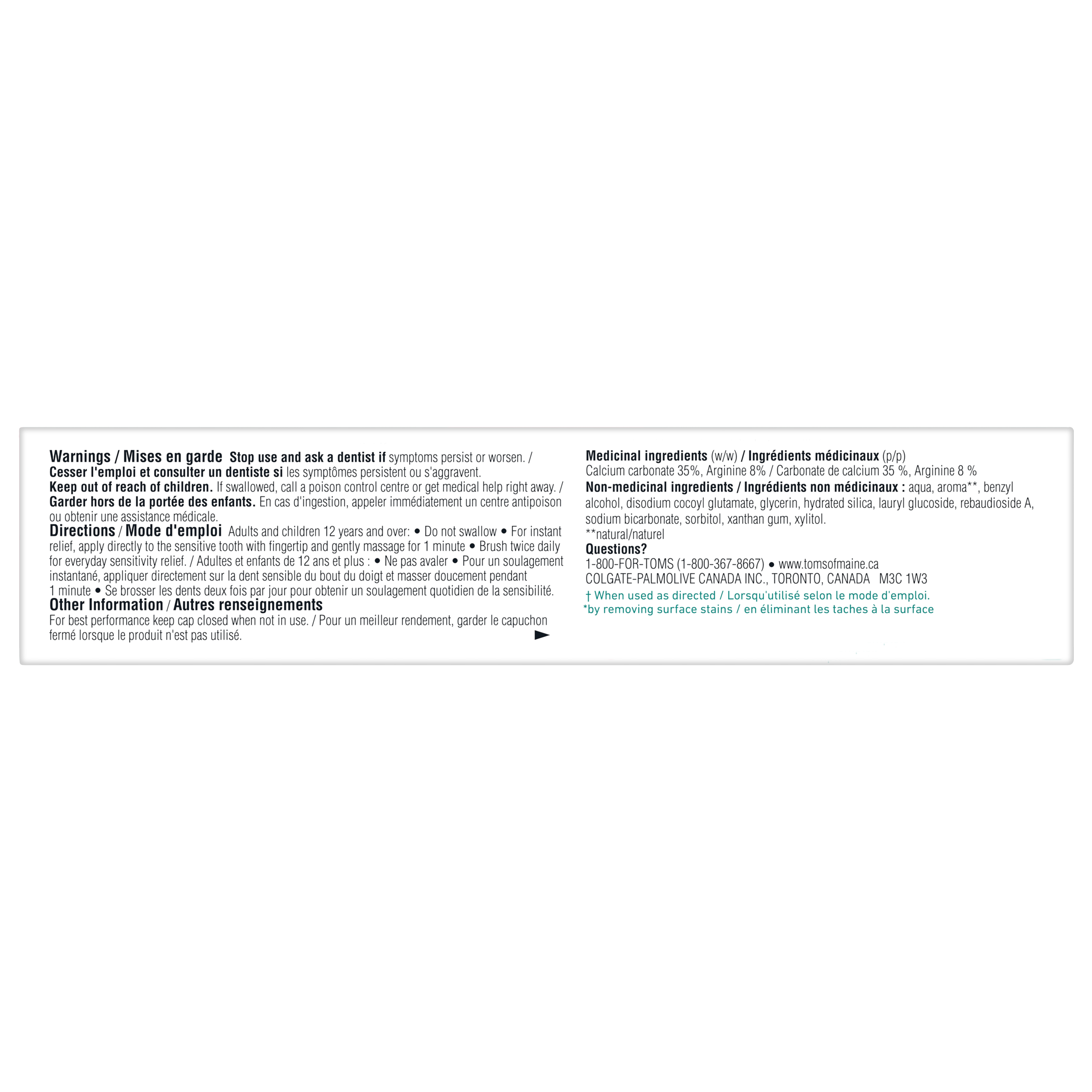 Product Title Tom’s of Maine PureActiv Sensitive + Whitening Fluoride Free Toothpaste, Calming Mint SKU 61029191 SKU eCommerce Name Tom’s of Maine PureActiv Sensitive + Whitening Fluoride Free Toothpaste, Calming Mint Consumer Unit - GTIN 00827854006596 Case - GTIN 10827854006593 Product Category Oral Care Product Sub Category Toothpaste Brand Tom's Product Sub Brand Tom's PureActiv Solutions TP Consumer Unit Gross Weight 0.151 KG / 0.333 LB Consumer Unit Net Weight 0.131 KG / 0.289 LB Consumer Unit Length 37.000 MM / 1.457 IN Consumer Unit Width 56.000 MM / 2.205 IN Consumer Unit Height 166.000 MM / 6.535 IN Consumer Unit Volume 0.311 C8 / 0.011 CF Product Title Tom’s of Maine PureActiv Sensitive + Whitening Fluoride Free Toothpaste, Calming Mint eCommerce Copy "Dentifrice sans fluorure Sensibilité et blanchiment de Tom's of Maine, menthe apaisante, 76 mL Pour un dentifrice pour dents sensibles qui aide à blanchir les dents*, choisissez le dentifrice Sensibilité et blanchiment de Tom's of Maine. Ce dentifrice sans fluorure naturel offre un soulagement instantané de la sensibilité démontré en clinique lorsqu’utilisé selon le mode d’emploi. Le dentifrice Sensibilité et blanchiment de Tom's of Maine utilise une formule de dentifrice blanchissant qui est sûre pour l'émail. *c. un dentifrice non blanchissant ordinaire eCommerce Copy- Long Description Dentifrice sans fluorure Sensibilité et blanchiment de Tom's of Maine, menthe apaisante, 76 mL Pour un dentifrice pour dents sensibles qui aide à blanchir les dents*, choisissez le dentifrice Sensibilité et blanchiment de Tom's of Maine. Ce dentifrice sans fluorure naturel offre un soulagement instantané de la sensibilité démontré en clinique lorsqu’utilisé selon le mode d’emploi. Le dentifrice Sensibilité et blanchiment de Tom's of Maine utilise une formule de dentifrice blanchissant qui est sûre pour l'émail. Blanchiment avancé Le dentifrice Sensibilité et blanchiment de Tom's of Maine aide à blanchir les dents sensibles en éliminant les taches à la surface. Ce dentifrice pour dents sensibles offre également une action blanchissante avancée* pour aider à blanchir les dents. Des ingrédients de soins buccodentaires mélangés soigneusement Tom's of Maine utilise des ingrédients naturellement dérivés et d’origine naturelle pour créer des produits de soins buccodentaires qui fonctionnent. Le dentifrice sans fluorure est offert avec une saveur rafraîchissante de menthe apaisante, pour que vous puissiez profiter d’une fraîcheur mentholée à chaque brossage. De plus, il est exempt de gluten ainsi que d'arômes, d'édulcorants et de colorants artificiels, et n'a pas été testé sur les animaux. Voilà une chose dont on peut se réjouir. *c. un dentifrice non blanchissant ordinaire **en éliminant les taches à la surface Keywords (eCommerce) Dentifrice pour dents sensibles Dentifrice blanchissant Dentifrice sans fluorure Dentifrice pour dents sensibles Dentifrice à la menthe Dentifrice végétalien OS Amazon Product Title Tom's of Maine Sensitive and Whitening Toothpaste, Fluoride Free Sensitive Toothpaste, Helps with Sensitivity Relief and Helps Whiten Teeth, Safe on Teeth Enamel, Calming Mint, 76 mL OS Amazon Product Description For a sensitive toothpaste that helps whiten teeth*, choose the Tom’s of Maine Sensitive and Whitening Toothpaste. This natural fluoride free toothpaste offers clinically shown instant sensitivity relief when used as directed. Tom’s of Maine Whitening and Sensitive Toothpaste uses a whitening toothpaste formula that is safe on enamel. Tom’s of Maine Sensitive and Whitening Toothpaste helps whiten sensitive teeth by removing surface stains. This sensitive toothpaste also offers Advanced Whitening Action** to help whiten teeth. Tom's of Maine uses naturally derived and naturally sourced ingredients to create oral care products that work. The fluoride free toothpaste comes in a refreshing Calming Mint flavour so you can enjoy minty freshness every time you brush. Plus, it’s gluten free and free from artificial flavours, sweeteners, and dyes, and has not been tested on animals. Now that’s something you can feel good about. *vs a regular non-whitening toothpaste **by removing surface stains OS Amazon Bullet 1 Includes one (1) 76 mL tube of Tom's of Maine Sensitive and Whitening Toothpaste, Fluoride Free Toothpaste OS Amazon Bullet 2 Offers clinically shown instant sensitivity relief when used as directed OS Amazon Bullet 3 Natural whitening toothpaste for sensitive teeth helps whiten sensitive teeth** and is enamel safe OS Amazon Bullet 4 For rapid relief, apply the product directly to the sensitive tooth with fingertip and gently massage for 60 seconds OS Amazon Bullet 5 The refreshing Calming Mint toothpaste flavour helps freshen your breath every time you brush OS Walmart Product Title Tom's of Maine Sensitive Whitening Toothpaste, Fluoride Free, Calm Mint, 76 mL OS Walmart Product Description Tom's of Maine Sensitive and Whitening Toothpaste, Fluoride Free, Calming Mint, 76 mL For a sensitive toothpaste that helps whiten teeth*, choose the Tom’s of Maine Sensitive and Whitening Toothpaste. This natural fluoride free toothpaste offers clinically shown instant sensitivity relief when used as directed. Tom’s of Maine Whitening and Sensitive Toothpaste uses a whitening toothpaste formula that is safe on enamel. Advanced Whitening Tom’s of Maine Sensitive and Whitening Toothpaste helps whiten sensitive teeth by removing surface stains. This sensitive toothpaste also offers Advanced Whitening Action* to help whiten teeth. Thoughtfully Blended Oral Care Ingredients Tom's of Maine uses naturally derived and naturally sourced ingredients to create oral care products that work. The fluoride free toothpaste comes in a refreshing Calming Mint flavour so you can enjoy minty freshness every time you brush. Plus, it’s gluten free and free from artificial flavours, s