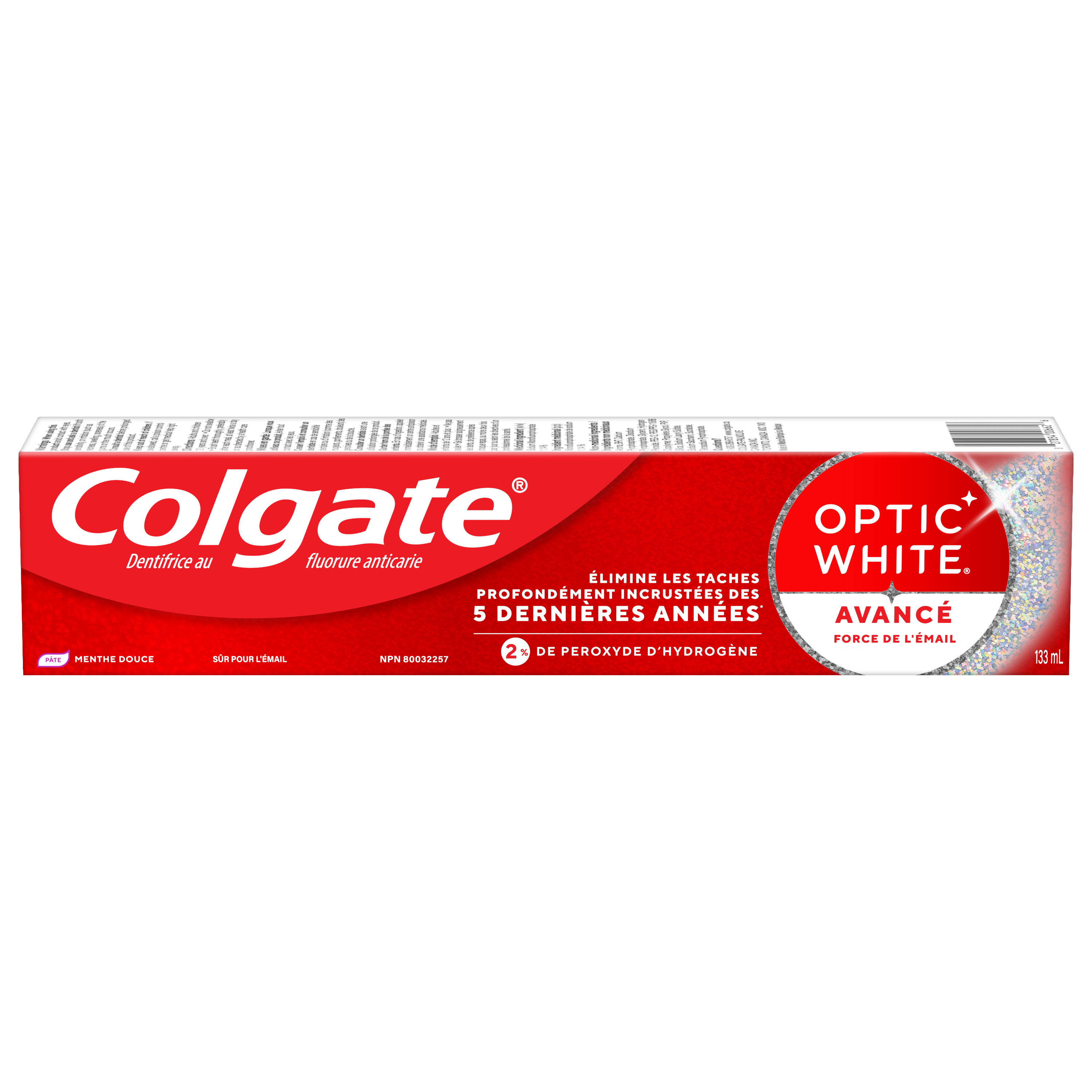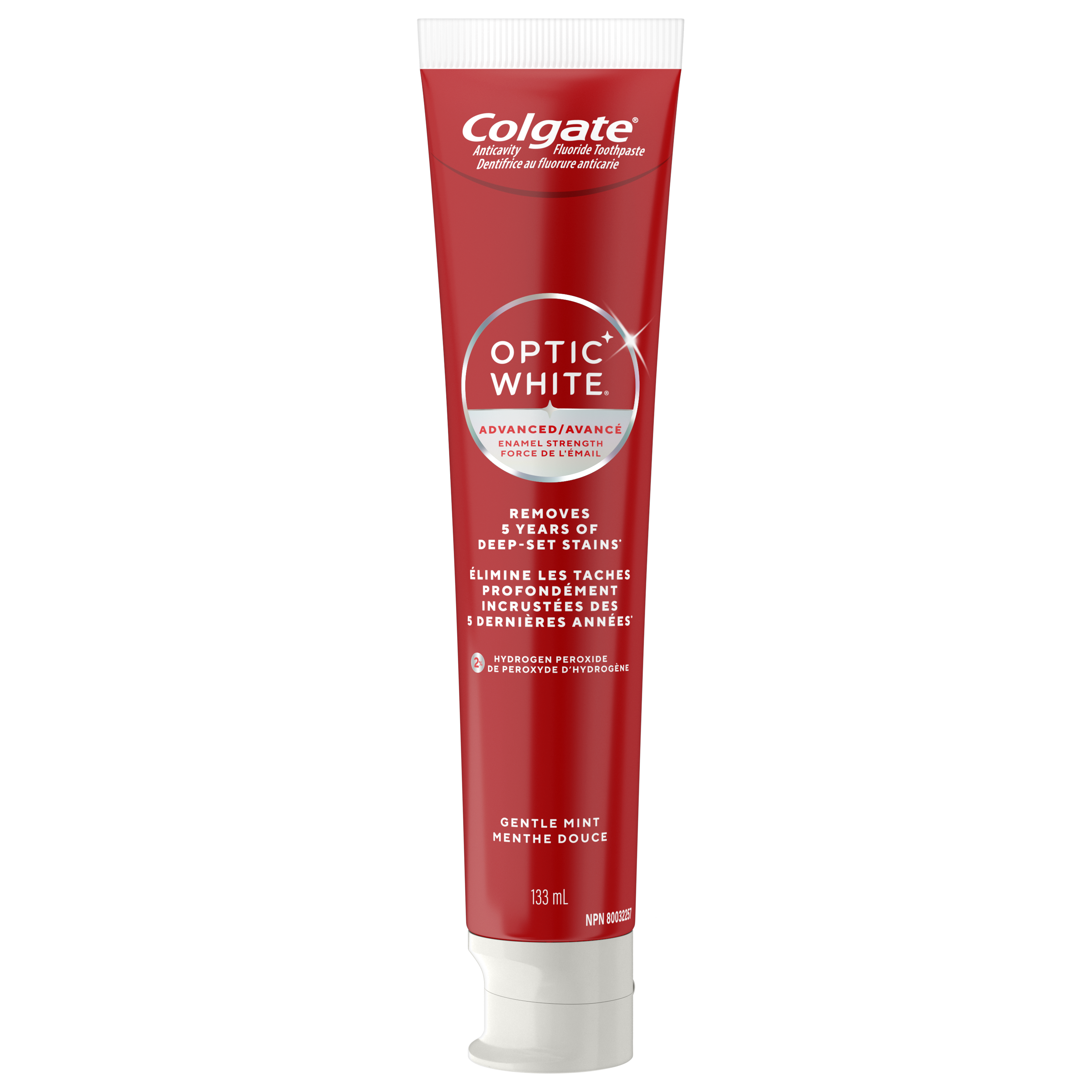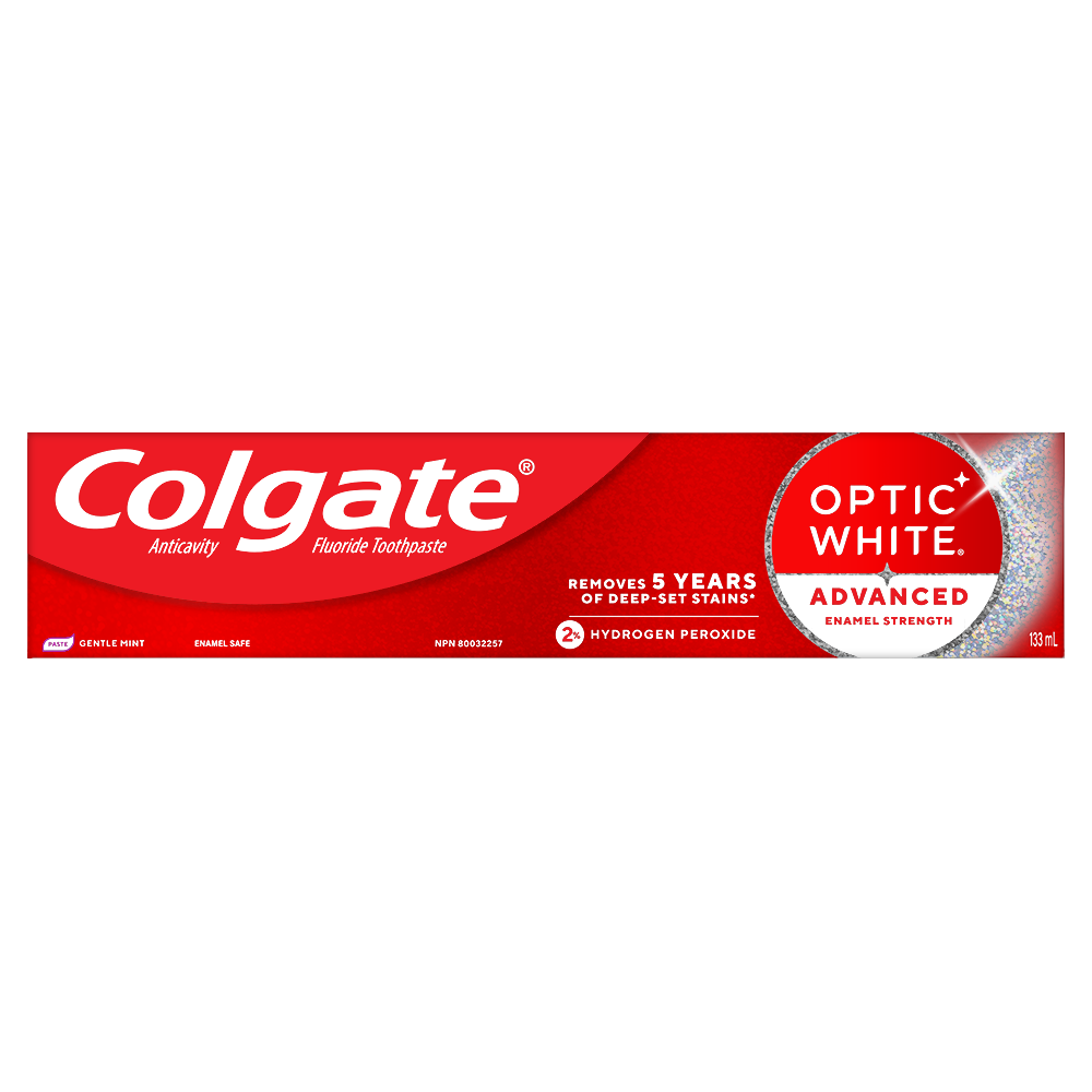 Product Title Colgate Optic White Advanced Enamel Strength Toothpaste with 2% Hydrogen Peroxide, 133 mL SKU 61030027 SKU eCommerce Name Colgate Optic White Advanced Teeth Whitening Toothpaste, Oxygenating White, 133 mL, 1 pack Consumer Unit - GTIN 00827854006626 Case - GTIN 10827854006623 Product Category Oral Care Product Sub Category Toothpaste Brand Colgate Product Sub Brand Colgate Optic White TP Consumer Unit Gross Weight 0.204 KG / 0.450 LB Consumer Unit Net Weight 0.165 KG / 0.364 LB Consumer Unit Length 42.000 MM / 1.654 IN Consumer Unit Width 232.000 MM / 9.134 IN Consumer Unit Height 51.000 MM / 2.008 IN Consumer Unit Volume 0.497 C8 / 0.018 CF Product Title Colgate Optic White Advanced Enamel Strength Toothpaste with 2% Hydrogen Peroxide, 133 mL Product Description Powered by HP Complex, our whitening formulation of Hydrogen Peroxide, Colgate Optic White Advanced toothpaste removes 5 years of deep-set stains for visibly whiter teeth*. This clinically proven whitening formula contains Hydrogen Peroxide, the same whitening ingredient used by dentists. For those who want to get visibly whiter teeth* without tooth sensitivity, our mint toothpaste provides enamel-safe stain removal for noticeable results*. Colgate Optic White Advanced is an anticavity fluoride toothpaste that whitens teeth with 2% hydrogen peroxide. Most other whitening toothpastes** only target surface stains, but Colgate Optic White's dual-action whitening formula with HP Complex gently diffuses below the surface of teeth as a deep-set stain remover toothpaste while micropolishers brush the surface clean. Colgate Optic White Advanced Enamel Strength helps protect and strengthen enamel. It’s a whitening toothpaste designed to dissolve deep-set stains without weakening enamel. Get visibly whiter teeth* without tooth sensitivity. With a delicate balance of peppermint and wintergreen flavours, Colgate Optic White Advanced Enamel Strength mint toothpaste delivers a mild sensation from start to finish. *when brushing twice daily for 2 weeks **without hydrogen peroxide eCommerce Copy <bulletlist><bullet>One 133 mL tube of Colgate Optic White Advanced Oxygenating White</bullet> <bullet>Deeply whitens teeth for up to 4 shades(1) with hydrogen peroxide</bullet> <bullet>Contains dentist recommended Hydrogen Peroxide for teeth whitening</bullet> <bullet>Goes beyond surface stains with Colgate’s patented 2% hydrogen peroxide formula</bullet> <bullet>Deeply whitens teeth inside and out, unlike ordinary toothpaste</bullet> <bullet>Enamel-safe teeth whitening, that’s good for daily use</bullet> <bullet>Fluoride toothpaste formula to protect against cavities</bullet> <bullet>Vegan toothpaste</bullet> <bullet>Sugar free and gluten free toothpaste</bullet></bulletlist> eCommerce Copy- Long Description Colgate Optic White Advanced Oxygenating White Teeth Whitening Toothpaste, Oxygenating White, 133 mL, 1 pack