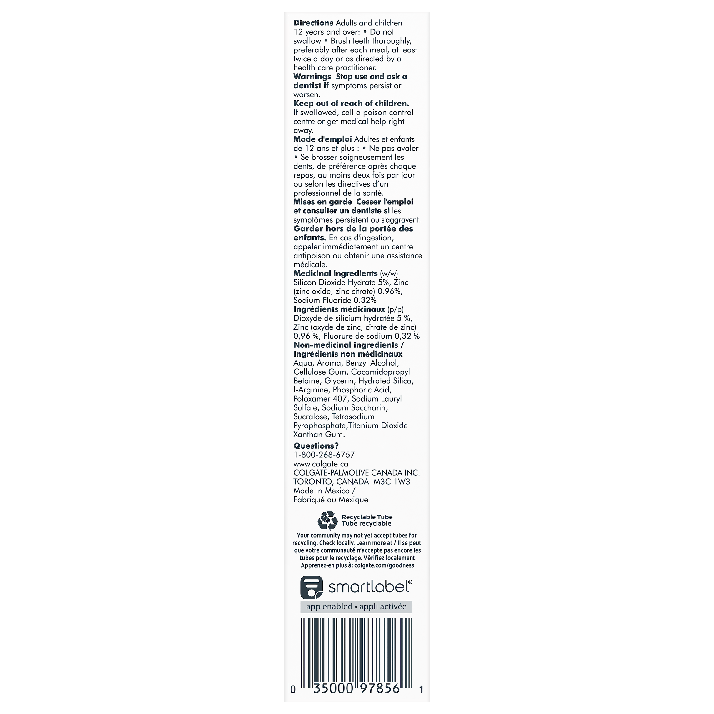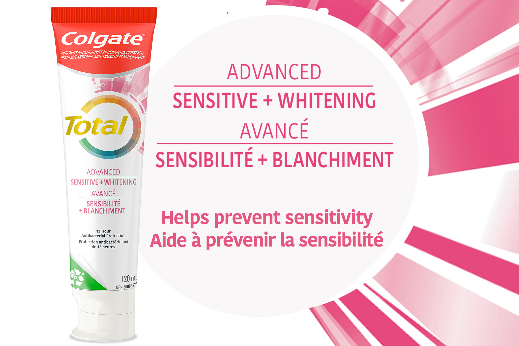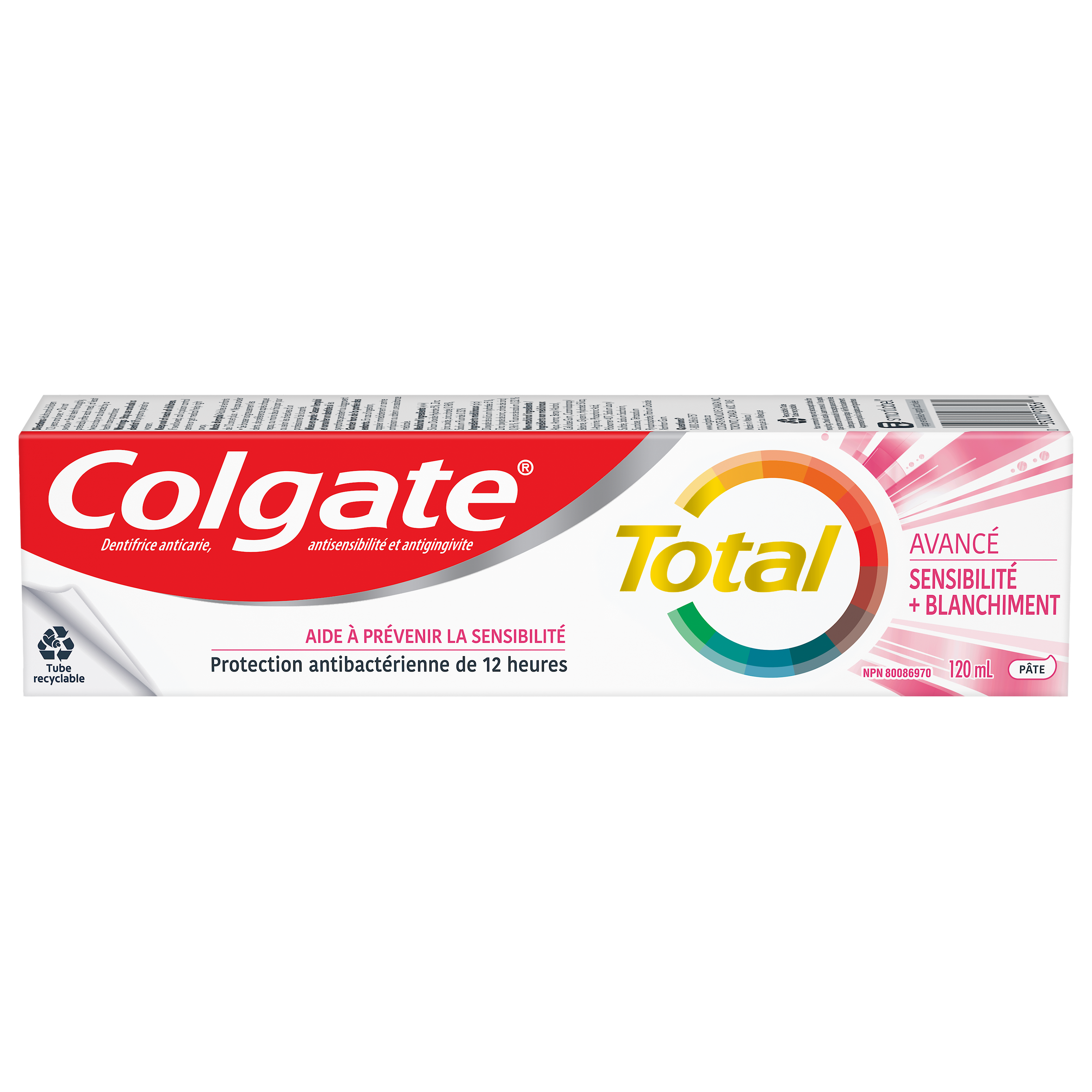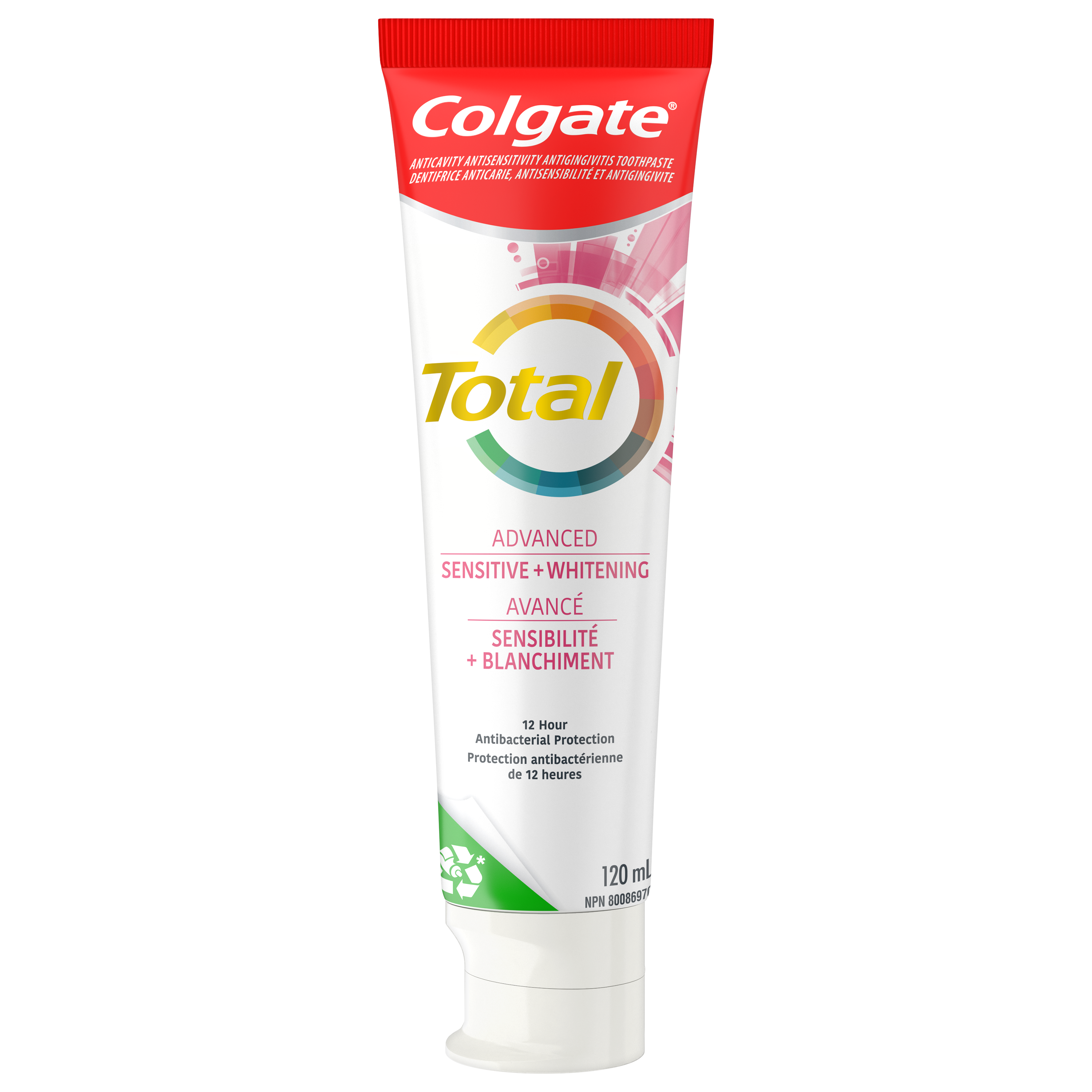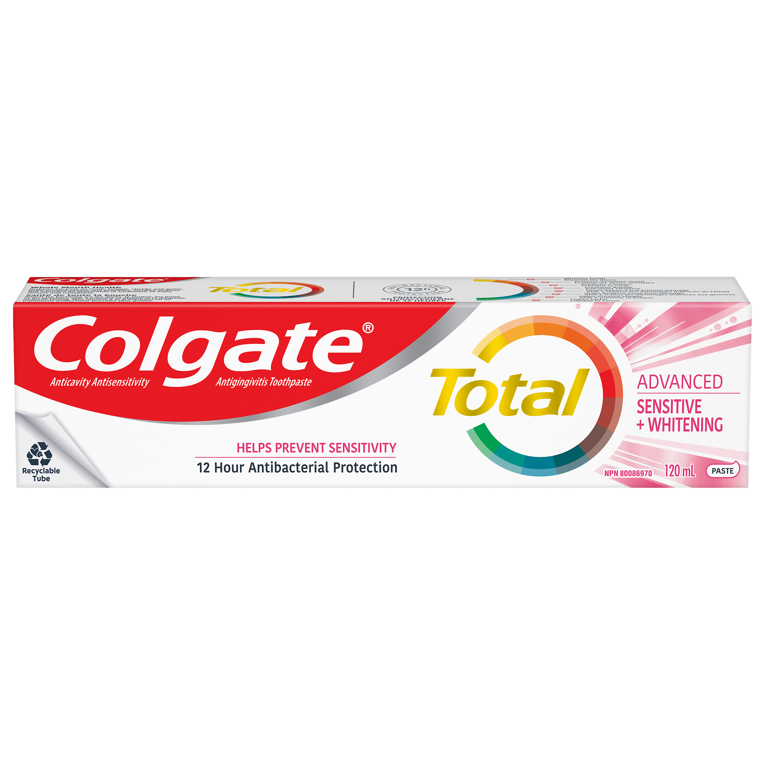 Product Title Colgate Total Advanced Sensitive + Whitening Toothpaste, Multi-Benefit Teeth Whitening Toothpaste That Protects Sensitive Teeth For A Beautiful Smile, 120 mL, 1 Pack SKU 61030166 SKU eCommerce Name Colgate Total Advanced Sensitive + Whitening Toothpaste, Multi-Benefit Teeth Whitening Toothpaste That Protects Sensitive Teeth For A Beautiful Smile, 120 mL, 1 Pack Consumer Unit - GTIN 00035000978561 Case - GTIN 10827854006715 Product Category Oral Care Product Sub Category Toothpaste Brand Colgate Product Sub Brand Colgate Total TP Consumer Unit Gross Weight 0.190 KG / 0.419 LB Consumer Unit Net Weight 0.161 KG / 0.355 LB Consumer Unit Length 41.000 MM / 1.614 IN Consumer Unit Width 196.000 MM / 7.717 IN Consumer Unit Height 50.000 MM / 1.969 IN Consumer Unit Volume 0.402 C8 / 0.014 CF Product Title Colgate Total Advanced Sensitive + Whitening Toothpaste, Multi-Benefit Teeth Whitening Toothpaste That Protects Sensitive Teeth For A Beautiful Smile, 120 mL, 1 Pack eCommerce Copy <bulletlist><bullet>One 120 mL tube of Colgate Total Advanced Sensitive + Whitening Toothpaste</bullet> <bullet>Use Colgate Total Advanced Sensitive + Whitening toothpaste for protection for sensitive teeth and a beautiful smile</bullet> <bullet>Get more for your mouth with a breakthrough formula featuring 10 benefits, including effective sensitivity relief</bullet> <bullet>Colgate Total Advanced toothpaste whitens teeth, protects sensitive teeth, freshens breath, prevents cavities, and strengthens enamel</bullet> <bullet>Provides 12 hour antibacterial protection against germs that cause plaque and gingivitis</bullet> <bullet>Colgate Total is also a sensitive toothpaste and its breakthrough technology provides sensitivity relief Help repair early enamel damage, help reverse early gum damage, and freshen breath with Colgate Total</bullet> <bullet>Actively helps to fight a number of teeth and gum problems* (*Helps prevent plaque, gingivitis, cavities and tooth sensitivity.)</bullet> <bullet>Mint gel toothpaste instantly neutralizes odours associated with bad breath</bullet></bulletlist> eCommerce Copy- Long Description Colgate Total Advanced Sensitive + Whitening, 120 mL Tube, 1 Pack