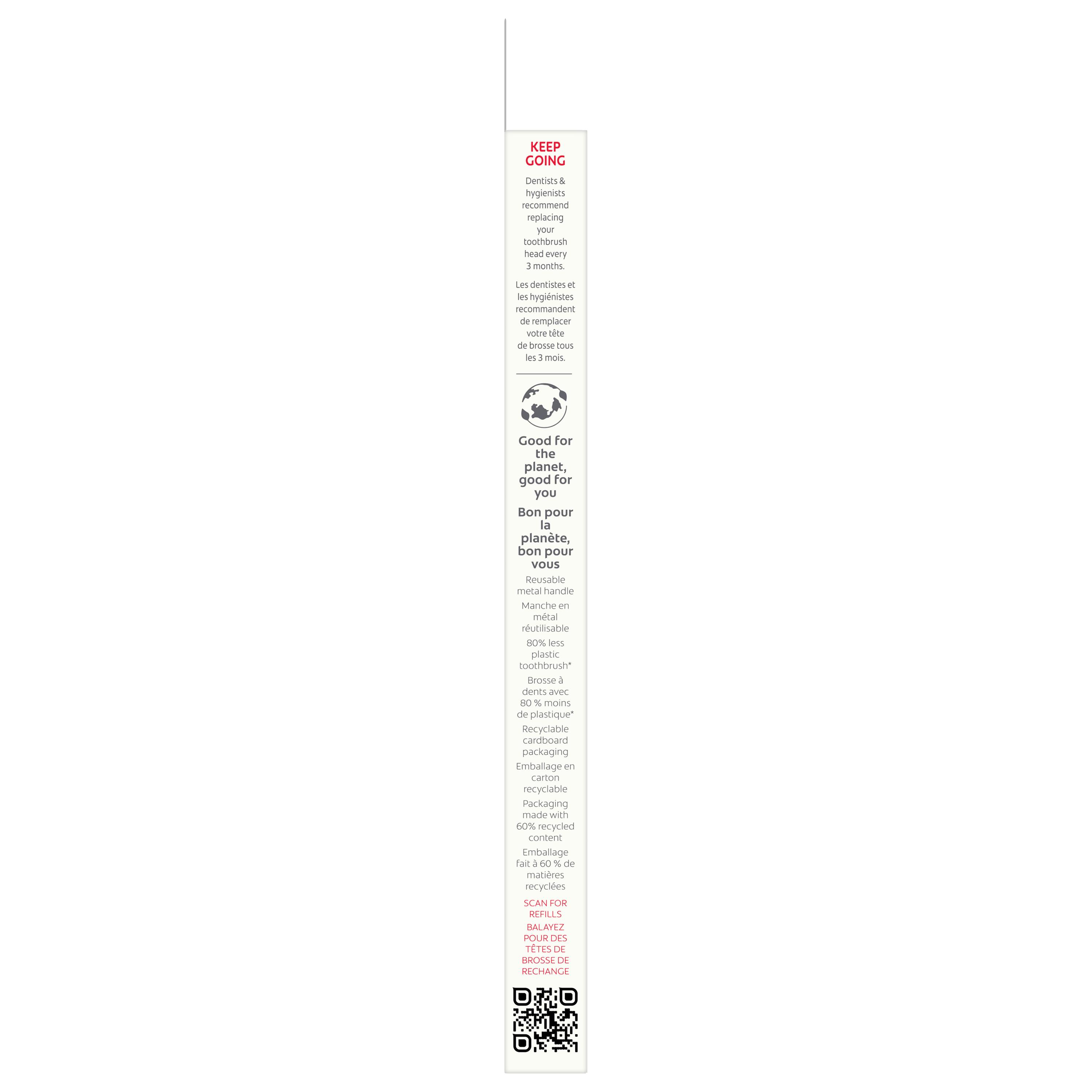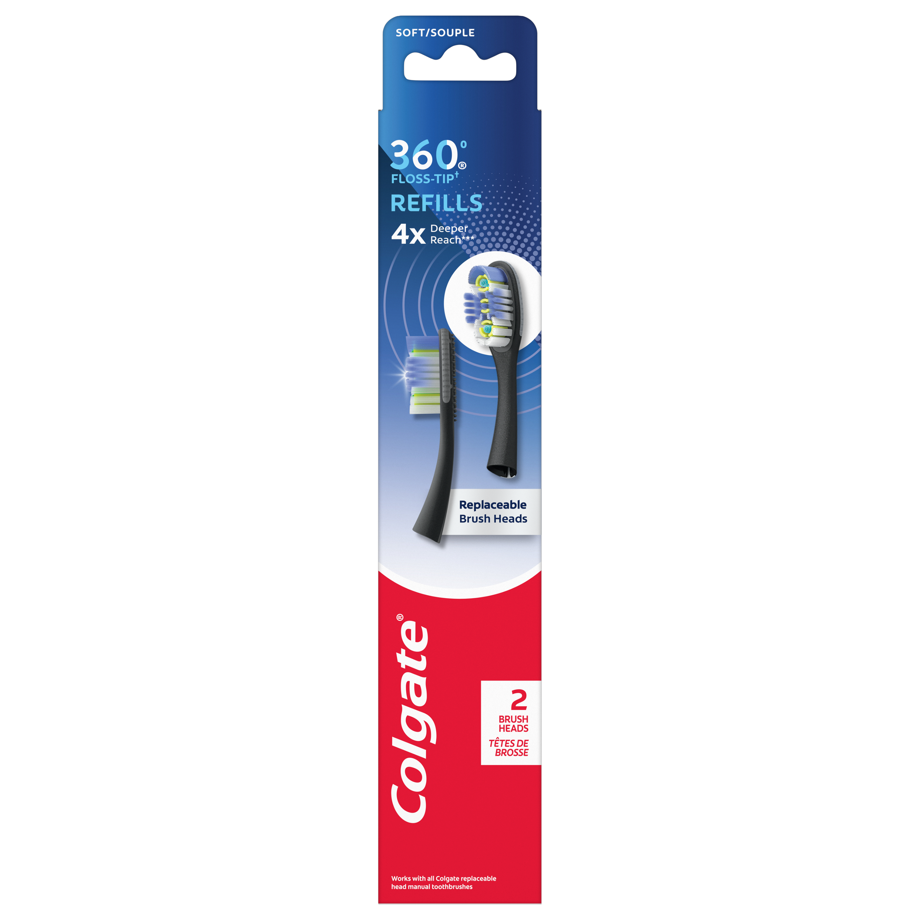 Product Title Colgate 360 Floss Tip Replaceable Head Toothbrush Refill Kit, 2 Brush Heads SKU 61031729 SKU eCommerce Name Colgate 360 Floss Tip Replaceable Head Toothbrush Refill Kit, 2 Brush Heads Consumer Unit - GTIN 00035000982018 Case - GTIN 10035000982015 Product Category Oral Care Product Sub Category Manual TB Brand Colgate Product Sub Brand Colgate Keep Man TB Consumer Unit Gross Weight 0.017 KG / 0.037 LB Consumer Unit Net Weight 0.006 KG / 0.013 LB Consumer Unit Length 18.000 MM / 0.709 IN Consumer Unit Width 42.000 MM / 1.654 IN Consumer Unit Height 229.000 MM / 9.016 IN Consumer Unit Volume 0.173 C8 / 0.006 CF Product Title Colgate 360 Floss Tip Replaceable Head Toothbrush Refill Kit, 2 Brush Heads eCommerce Copy The Colgate 360 Floss Tip† Replaceable Head Toothbrush Refill kit includes two replaceable heads that feature Colgate’s best selling toothbrush head with Floss Tip† bristles for a 4x deeper reach*** between teeth and along the gumline. Switching to a Colgate reusable head toothbrush uses 80% less plastic*, without losing any of the benefits of a disposable toothbrush! † This toothbrush does not replace flossing ***Below the gumline compared to an ordinary flat-trim toothbrush *compared to an ordinary flat trim toothbrush Walmart Bullet 1 Cleans teeth, tongue, cheeks and gums Walmart Bullet 2 Two replaceable floss-tip brush heads Walmart Bullet 3 Floss-Tip bristles† gently reach 4x deeper below the gum line‡ and between teeth. † This toothbrush does not replace flossing ‡vs. an ordinary flat trim toothbrush Walmart Bullet 4 Reusable product - Use these manual toothbrush replacement heads with any Colgate reusable metal toothbrush handle Walmart Bullet 5 Colgate’s best selling Floss Tip† bristles † This toothbrush does not replace flossing.