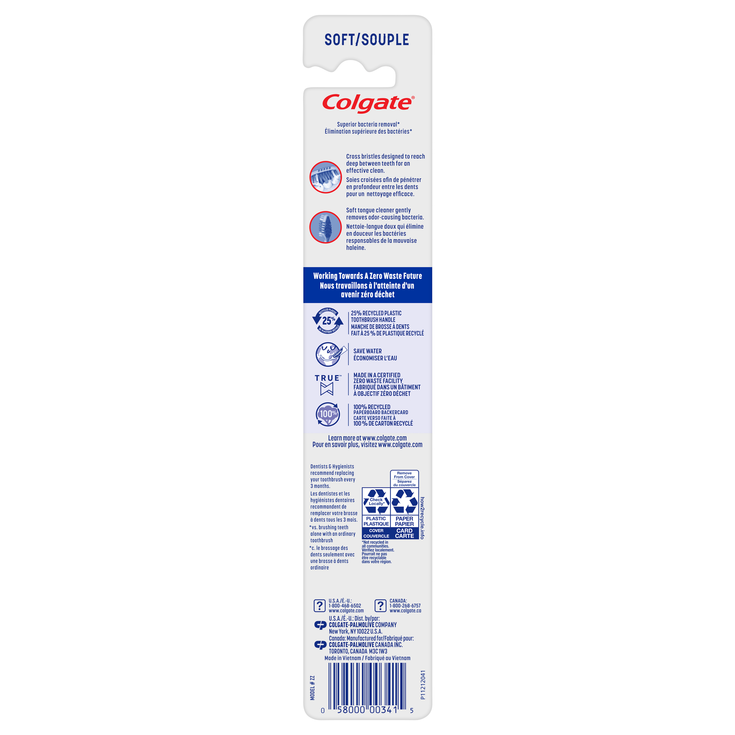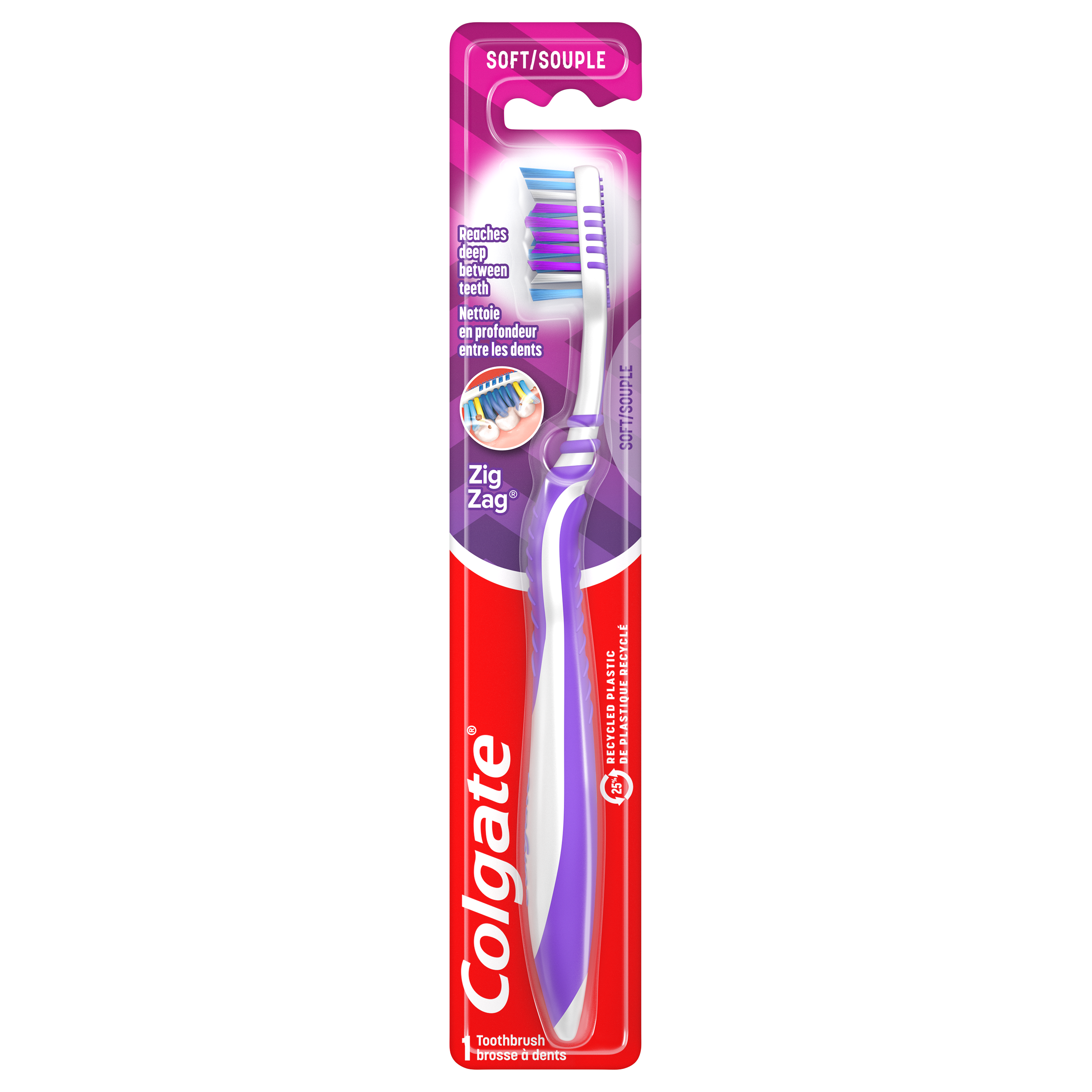 Product Title Colgate Zig Zag Deep Clean Soft Toothbrush with Soft Bristles, Adult Toothbrushes, 1 Pack SKU 61034564 SKU eCommerce Name Colgate Zig Zag Deep Clean Soft Toothbrush with Soft Bristles, Adult Toothbrushes, 1 Pack Consumer Unit - GTIN 00058000003415 Product Category Oral Care Product Sub Category Manual TB Brand Colgate Product Sub Brand Colgate Zigzag Man TB Consumer Unit Gross Weight 0.023 KG / 0.051 LB Consumer Unit Net Weight 0.015 KG / 0.033 LB Consumer Unit Length 25.000 MM / 0.984 IN Consumer Unit Width 42.000 MM / 1.654 IN Consumer Unit Height 229.000 MM / 9.016 IN Consumer Unit Volume 0.240 C8 / 0.008 CF Product Title Colgate Zig Zag Deep Clean Soft Toothbrush with Soft Bristles, Adult Toothbrushes, 1 Pack eCommerce Copy Colgate ZigZag Toothbrush is designed with v-shaped cross bristles to reach deep between teeth for an effective clean that reaches the right places. This toothbrush is made with 25% recycled plastic and in a true zero waste facility. eCommerce Copy- Long Description Colgate ZigZag Toothbrush is a soft toothbrush designed with v-shaped cross bristles to reach deep between teeth for an effective clean that reaches the right places. This toothbrush also has a soft tongue cleaner that gently removes odor causing bacteria from your tongue and cheeks. Not only comfortable to allow more control during your brushing routine, the Colgate ZigZag Toothbrush is also responsibly made.* Made in a zero true waste, LEED-certified facility, the ZigZag toothbrush features a 25% recycled plastic toothbrush handle and a 100% recycled paperboard backercard. These deep clean toothbrushes come in different colors for multiple people in a household or for a replenishment. Remember to change your toothbrush every 3 months. *To learn more, visit www.colgatepalmolive.com/responsibly-made Keywords (eCommerce) colgate toothbrush, manual toothbrush, soft toothbrush bristles, adult toothbrush, cheek tongue cleaner, full head, travel toothbrush, bulk toothbrushes, family toothbrushes, value pack toothbrushes, toothbrushes Walmart Bullet 1 Soft toothbrush with superior bacteria removal* *vs. brushing teeth alone with an ordinary toothbrush Walmart Bullet 2 Adult toothbrush with angled bristles designed to reach deep between teeth for an effective clean Walmart Bullet 3 Soft tongue cleaner gently removes odor-causing bacteria Walmart Bullet 4 25% recycled plastic toothbrush handle Walmart Bullet 5 100% recycled paperboard backercard Walmart Bullet 6 Made in a true zero waste facility Walmart Bullet 7 Responsibly made* *To learn more, visit www.colgatepalmolive.com/responsibly-made Walmart Bullet 8 Made in a LEED certified facility
