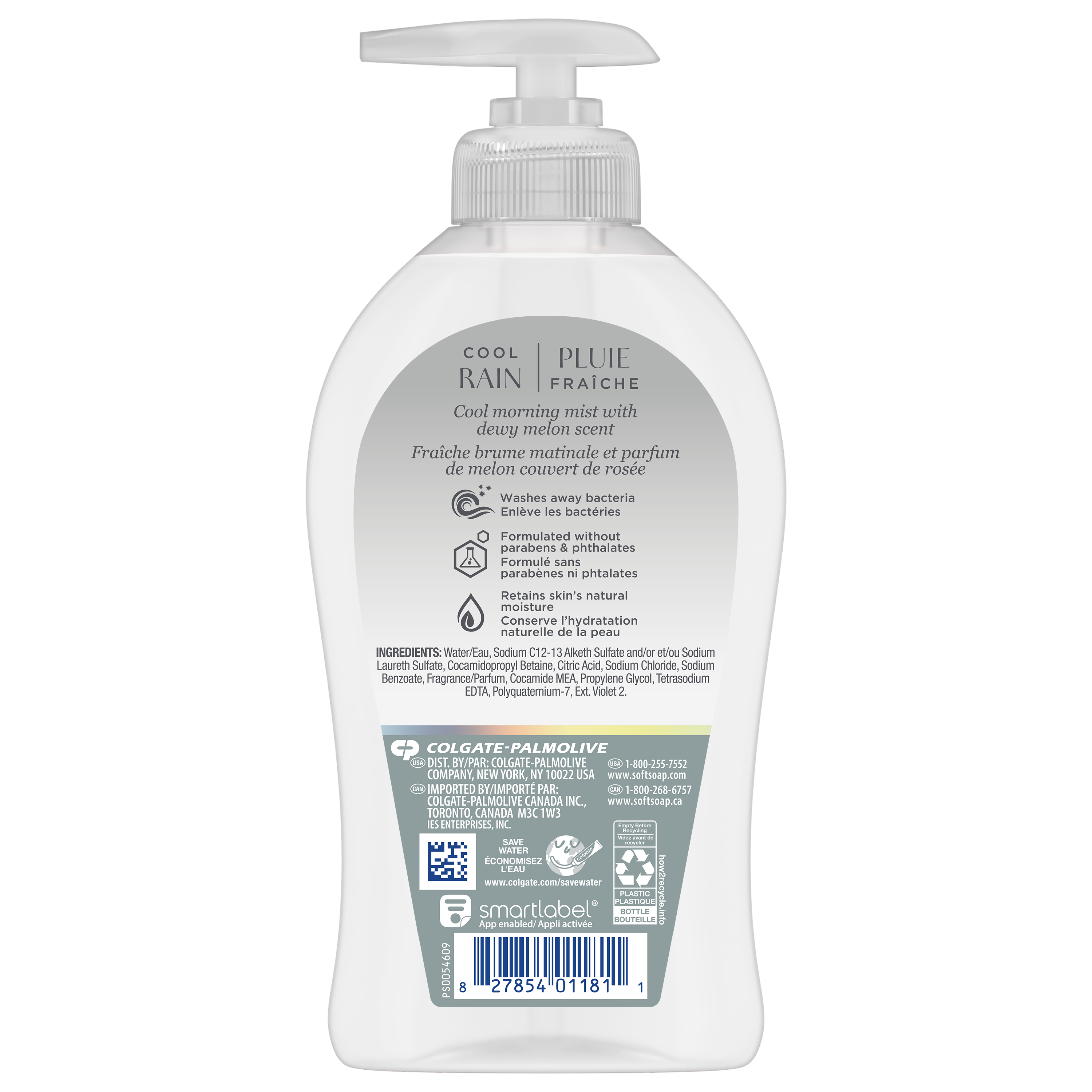 Product Title Softsoap Cool Rain Liquid Hand Soap, 11.25 Oz (332ml) SKU 61038040 SKU eCommerce Name Softsoap Cool Rain Liquid Hand Soap, 11.25 Oz (332ml) Consumer Unit - GTIN 00827854011811 Case - GTIN 10827854011818 Product Category Personal Care Product Sub Category Liquid Hand Wash Brand Softsoap Product Sub Brand Softsoap Maison LHW Consumer Unit Gross Weight 0.376 KG / 0.829 LB Consumer Unit Net Weight 0.348 KG / 0.767 LB Consumer Unit Length 45.000 MM / 1.772 IN Consumer Unit Width 84.000 MM / 3.307 IN Consumer Unit Height 184.000 MM / 7.244 IN Consumer Unit Volume 0.696 C8 / 0.025 CF Product Title Softsoap Cool Rain Liquid Hand Soap, 11.25 Oz (332ml) eCommerce Copy- Long Description Softsoap Cool Rain Liquid Hand Soap, with its beautiful design and modern chrome pump head, perfectly complements the elegance of your bathroom or kitchen sink. From the #1 liquid hand soap brand (1) comes an uplifting dewy melon scent that you’ll want to show off on your sink. Our clear hand soap is inspired by nature. This watery, marine fresh, dewy melon, and fruity fragrance will infuse joy into small moments in your day. Our formula retains skin’s natural moisture and is formulated without parabens and phthalates. Elevate your senses while effectively washing away bacteria with this bathroom hand soap. Feel the joy of clean!