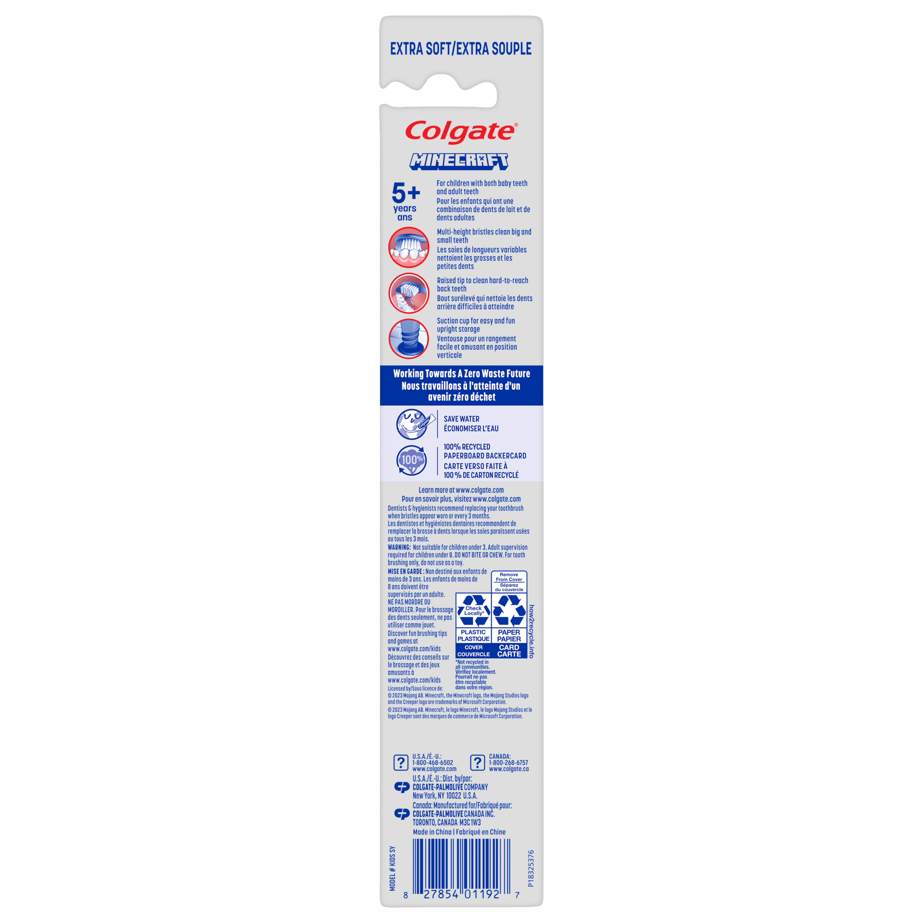 Product Title Minecraft TB 5+ SKU 61038328 Consumer Unit - GTIN 00827854011927 Product Category Oral Care Product Sub Category Manual TB Brand Colgate Product Sub Brand Colgate Kids Man TB Consumer Unit Gross Weight 0.025 KG / 0.055 LB Consumer Unit Net Weight 0.017 KG / 0.037 LB Consumer Unit Length 23.000 MM / 0.906 IN Consumer Unit Width 42.000 MM / 1.654 IN Consumer Unit Height 229.000 MM / 9.016 IN Consumer Unit Volume 0.221 C8 / 0.008 CF Product Title Minecraft TB 5+ OS Amazon Product Title Colgate Kids Manual Minecraft Toothbrush, Extra Soft Kids Toothbrush with Suction Cup and Soft Tongue Cleaner, Built In Thumb Rest for Easier Control, Helps Clean Baby and Adult Teeth, 1 Count OS Amazon Product Description Colgate Kids Manual Minecraft Toothbrush is the perfect kids toothbrush to encourage good oral habits early on! This Minecraft themed childrens toothbrush is uniquely designed to make brushing fun and easy. The extra soft toothbrush bristles provide effective yet gentle cleaning making it a great manual toothbrush for kids. Plus, this extra soft bristle toothbrush for kids is great for children with both baby and adult teeth and the soft tongue cleaner on the back of the toothbrush head helps clean beyond teeth. For small children, teeth brushing is something completely new! And helping them get used to having a toothbrush in their mouth can make the teeth brushing routine a positive experience right from the start. Whether it’s letting your child hold their kids toothbrush with suction cup to get used to it and try to brush their own teeth, the Colgate Kids Manual Minecraft Toothbrush is designed to make teeth brushing fun. The kids toothbrush features a raised tip and multi-height bristles to clean big and small teeth in hard-to-reach places, a soft tongue cleaner, a suction cup for easy and fun upright storage, and a thumb rest and rounded handle for a comfortable grip. OS Amazon Bullet 1 Includes one (1) individual Colgate Kids Manual Minecraft Toothbrush with Suction Cup OS Amazon Bullet 2 Features a thumb rest for great control when brushing and comes with a built-in suction cup for easy and fun upright storage OS Amazon Bullet 3 The extra soft bristles on this kids toothbrush gently clean teeth and gums OS Amazon Bullet 4 This kids manual toothbrush features a comfortable thumb grip and a rounded easy-to-hold handle which are perfect for little hands to use OS Amazon Bullet 5 Multi-height extra soft bristle toothbrush cleans both baby teeth and adult teeth and uses a raised tip to clean hard-to-reach back teeth OS Amazon On Page Keywords minecraft toothbrush, kids toothbrush, manual toothbrush, extra soft bristle toothbrush, soft bristle toothbrush, childrens toothbrush, extra soft toothbrush OS Walmart Product Title Colgate Kids Manual Minecraft Toothbrush, Toddler Toothbrush, Extra Soft, 1 Ct OS Walmart Product Description ### Colgate Kids Manual Minecraft Toothbrush, 1 Count Colgate Kids Manual Minecraft Toothbrush is the perfect kids toothbrush to encourage good oral habits early on! This Minecraft themed childrens toothbrush is uniquely designed to make brushing fun and easy. The extra soft toothbrush bristles provide effective yet gentle cleaning making it a great manual toothbrush for kids. Plus, this extra soft bristle toothbrush for kids is great for children with both baby and adult teeth and the soft tongue cleaner on the back of the toothbrush head helps clean beyond teeth. ### Kids Tooth Brushing Made Fun For small children, teeth brushing is something completely new! And helping them get used to having a toothbrush in their mouth can make the teeth brushing routine a positive experience right from the start. Whether it’s letting your child hold their kids toothbrush with suction cup to get used to it and try to brush their own teeth, the Colgate Kids Manual Minecraft Toothbrush is designed to make teeth brushing fun. The kids toothbrush features a raised tip and multi-height bristles to clean big and small teeth in hard-to-reach places, a soft tongue cleaner, a suction cup for easy and fun upright storage, and a thumb rest and rounded handle for a comfortable grip. OS Walmart Bullet 1 Includes one (1) individual Colgate Kids Manual Minecraft Toothbrush with Suction Cup OS Walmart Bullet 2 Features a thumb rest for great control when brushing and comes with a built-in suction cup for easy and fun upright storage OS Walmart Bullet 3 The extra soft bristles on this kids toothbrush gently clean teeth and gums OS Walmart Bullet 4 This kids manual toothbrush features a comfortable thumb grip and a rounded easy-to-hold handle which are perfect for little hands to use OS Walmart Bullet 5 Multi-height extra soft bristle toothbrush cleans both baby teeth and adult teeth and uses a raised tip to clean hard-to-reach back teeth OS Walmart Bullet 6 Tongue cleaner on the back of this Minecraft toothbrush helps clean beyond teeth OS Walmart Bullet 7 The small kid toothbrush head easily fits in little mouths and can help reach back teeth to help brush in hard-to-reach places OS Walmart On Page Keywords minecraft toothbrush, kids toothbrush, manual toothbrush, extra soft bristle toothbrush, soft bristle toothbrush, childrens toothbrush, extra soft toothbrush Walmart Bullet 1 Includes one (1) individual Colgate Kids Manual Minecraft Toothbrush with Suction Cup Walmart Bullet 2 Features a thumb rest for great control when brushing and comes with a built-in suction cup for easy and fun upright storage Walmart Bullet 3 The extra soft bristles on this kids toothbrush gently clean teeth and gums Walmart Bullet 4 This kids manual toothbrush features a comfortable thumb grip and a rounded easy-to-hold handle which are perfect for little hands to use Walmart Bullet 5 Multi-height extra soft bristle toothbrush cleans both baby teeth and adult teeth and uses a raised tip to clean hard-to-reach back teeth Walmart Bullet 6 Tongue cleaner on the back of this Minecraft toothbrush help