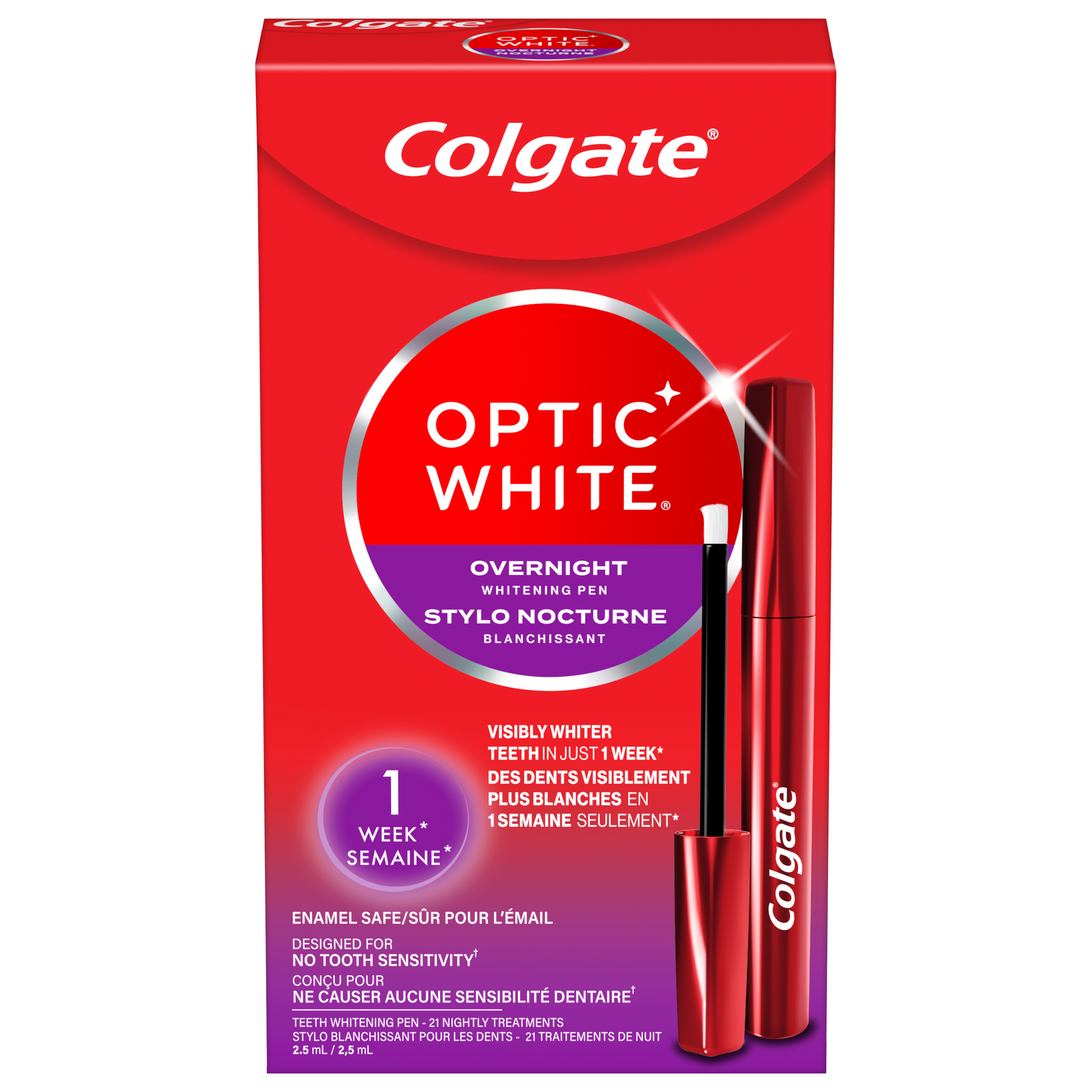 Product Title Colgate Optic White Overnight Teeth Whitening Pen SKU 61039544 SKU eCommerce Name Colgate Optic White Overnight Teeth Whitening Pen Consumer Unit - GTIN 00035000980861 Case - GTIN 10035000980868 Product Category Oral Care Product Sub Category At Home Whitening Brand Colgate Product Sub Brand Colgate OW Overnight Pen AHW Consumer Unit Gross Weight 0.064 KG / 0.141 LB Consumer Unit Net Weight 0.002 KG / 0.004 LB Consumer Unit Length 39.000 MM / 1.535 IN Consumer Unit Width 93.000 MM / 3.661 IN Consumer Unit Height 172.000 MM / 6.772 IN Consumer Unit Volume 0.624 C8 / 0.022 CF Product Title Colgate Optic White Overnight Teeth Whitening Pen eCommerce Copy Whiten teeth while you sleep. In as little as a week (two weeks of treatment is recommended for best results), the optic white teeth whitening pen whiten your teeth up to two shades and have 15X more whitening power in 1 treatment versus brushing alone, unlike other tooth whitening pens. The whitening pen pack includes one tooth whitener pen and one overnight stand for easy storage next to the sink or countertop. eCommerce Copy- Long Description Whiten your teeth while you sleep: the Colgate Optic White Overnight Whitening pen removes 15 years of stains in just 1 week when used as directed (two weeks of treatment is recommended for the best results). Each pen has 35 nightly treatments, with an enamel safe formula containing 3% hydrogen peroxide. It is designed for no tooth sensitivity during and after the whitening process. It's easy to use: click the back of the pen and apply the unique formula onto clean, dry teeth. The formula dries within seconds, and will stay on your teeth while you sleep. To remove, simply brush your teeth when you wake up the next morning and enjoy a whiter smile. Keywords (eCommerce) teeth whitening pen gel whitener white tooth sensitive bleach stain remover whiten bleaching whiteners instant whiting vegan professional hydrogen peroxide carbamide bright flawless dental fast stick perfect removal gentle travel easy enamel safe Walmart Bullet 1 Removes 15 Years of Stains in Just 1 Week Walmart Bullet 2 35 Nightly Treatments in 1 Pen Walmart Bullet 3 Designed for No Tooth Sensitivity (during and after the whitening process) Walmart Bullet 4 Easy and Effective Whitening While You Sleep Walmart Bullet 5 Sugar Free Walmart Bullet 6 Gluten Free Walmart Bullet 7 Vegan