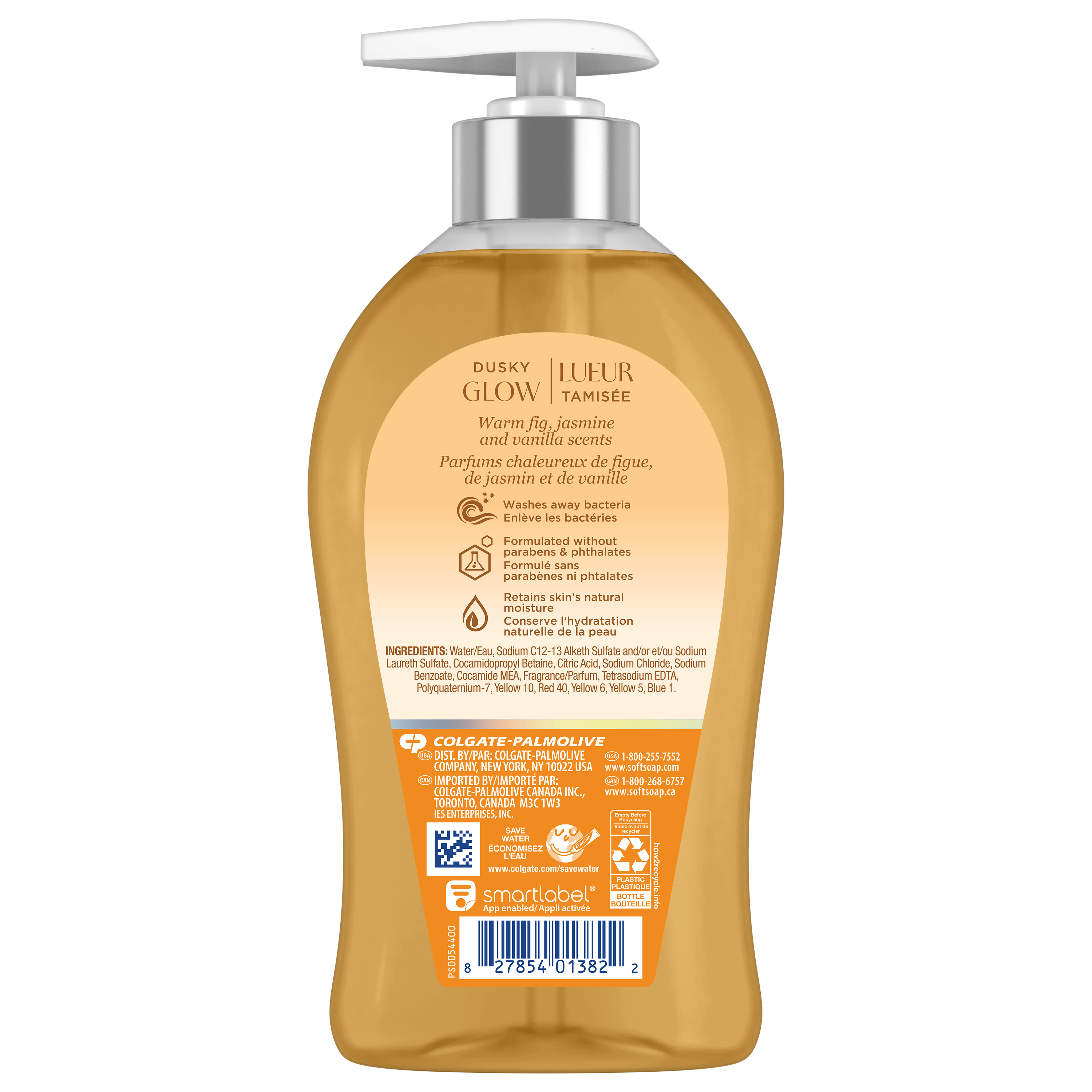 Product Title Softsoap Dusky Glow Liquid Hand Soap, 11.25 Oz (332ml) SKU 61040266 SKU eCommerce Name Softsoap Dusky Glow Liquid Hand Soap, 11.25 Oz (332ml) Consumer Unit - GTIN 00827854013822 Case - GTIN 10827854013829 Product Category Personal Care Product Sub Category Liquid Hand Wash Brand Softsoap Product Sub Brand Softsoap Maison LHW Consumer Unit Gross Weight 0.377 KG / 0.831 LB Consumer Unit Net Weight 0.341 KG / 0.752 LB Consumer Unit Length 45.000 MM / 1.772 IN Consumer Unit Width 84.000 MM / 3.307 IN Consumer Unit Height 184.000 MM / 7.244 IN Consumer Unit Volume 0.696 C8 / 0.025 CF Product Title Softsoap Dusky Glow Liquid Hand Soap, 11.25 Oz (332ml) eCommerce Copy- Long Description Softsoap Dusky Glow Liquid Hand Soap, with its beautiful design and modern chrome pump head, perfectly complements the elegance of your bathroom or kitchen sink. From the #1 liquid hand soap brand (1) comes an uplifting fragrance that you’ll want to show off on your sink. Our luxury hand soap is inspired by nature. Its warm fig, jasmine and vanilla scents will infuse joy into small moments in your day. Our formula retains skin’s natural moisture and is formulated without parabens and phthalates. Elevate your senses while effectively washing away bacteria with this bathroom hand soap. Feel the joy of clean!