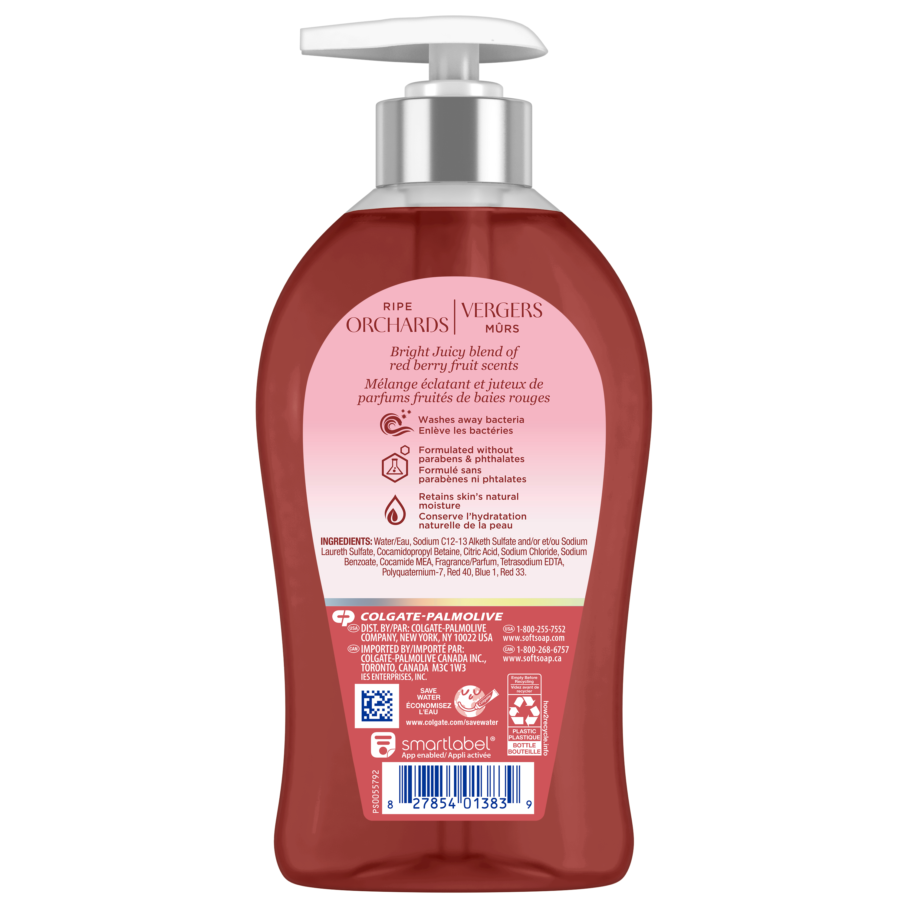 OS Amazon Product Title Softsoap Ripe Orchards Liquid Hand Soap, Red Berry Fruit Scent, 332 ml Bottle, 6 Pack OS Amazon Product Description Softsoap Ripe Orchards Liquid Hand Soap, with its beautiful design and modern chrome pump head, perfectly complements the elegance of your bathroom or kitchen sink. From the #1 liquid hand soap brand (1) comes an uplifting fragrance that you’ll want to show off on your sink. Our luxury hand soap is inspired by nature. Its juicy blend of red berry fruit scents will infuse joy into small moments in your day. Our formula retains skin’s natural moisture and is formulated without parabens and phthalates. Elevate your senses while effectively washing away bacteria with this bathroom hand soap. Feel the joy of clean! (1) Based in part on data reported by Nielsen through its Market Track Service for the Liquid Hand Soap Category for the 52 week period ending 15/02/2025, for the All Outlet market. Copyright © 2025 Nielsen. OS Amazon Bullet 1 Six (6) 332 ml Bottles of Softsoap Ripe Orchards Liquid Hand Soap Pump - The #1 Liquid Hand Soap Brand (1) OS Amazon Bullet 2 Bright juicy blend of red berry fruit scents that was inspired by nature OS Amazon Bullet 3 Designed with an updated hand soap pump head and metal collar that is iridescent and will look beautiful in your bathroom or used as kitchen hand soap OS Amazon Bullet 4 Our luxury hand soap retains skin’s natural moisture and is formulated without parabens and phthalates OS Amazon Bullet 5 Elevate your senses while effectively washing away bacteria with this bathroom and kitchen hand soap OS Walmart Product Title Softsoap Ripe Orchards Liquid Hand Soap, Red Berry Fruit Scent, 332 ml Bottle OS Walmart Product Description Softsoap Ripe Orchards Liquid Hand Soap, with its beautiful design and modern chrome pump head, perfectly complements the elegance of your bathroom or kitchen sink. From the #1 liquid hand soap brand (1) comes an uplifting fragrance that you’ll want to show off on your sink. Our luxury hand soap is inspired by nature. Its juicy blend of red berry fruit scents will infuse joy into small moments in your day. Our formula retains skin’s natural moisture and is formulated without parabens and phthalates. Elevate your senses while effectively washing away bacteria with this bathroom hand soap. Feel the joy of clean! (1) Based in part on data reported by Nielsen through its Market Track Service for the Liquid Hand Soap Category for the 52 week period ending 15/02/2025, for the All Outlet market. Copyright © 2025 Nielsen. OS Walmart Bullet 1 One 332 ml Bottle of Softsoap Ripe Orchards Liquid Hand Soap Pump - The #1 Liquid Hand Soap Brand (1) OS Walmart Bullet 2 Bright juicy blend of red berry fruit scents that was inspired by nature OS Walmart Bullet 3 Designed with an updated hand soap pump head and metal collar that is iridescent and will look beautiful in your bathroom or used as kitchen hand soap OS Walmart Bullet 4 Our luxury hand soap retains skin’s natural moisture and is formulated without parabens and phthalates OS Walmart Bullet 5 Elevate your senses while effectively washing away bacteria with this bathroom and kitchen hand soap Walmart Bullet 1 One 11.25 oz Bottle of Softsoap Ripe Orchards Liquid Hand Soap Pump - The #1 Liquid Hand Soap Brand (1) Walmart Bullet 2 Bright juicy blend of red berry fruit scents that was inspired by nature Walmart Bullet 3 The stylish design of Softsoap Ripe Orchards Liquid Hand Soap will look beautiful in your bathroom or be perfect for use as kitchen hand soap Walmart Bullet 4 Our luxury hand soap retains skin’s natural moisture and is formulated without parabens and phthalates Walmart Bullet 5 Elevate your senses while effectively washing away bacteria with this bathroom and kitchen hand soap Walmart Bullet 9 Suitable for all ages and all skin types. OS Loblaws Product Title Softsoap Ripe Orchards Liquid Hand Soap, Red Berry Fruit Scent, 332 ml Bottle OS Loblaws Product Description Softsoap Ripe Orchards Liquid Hand Soap, with its beautiful design and modern chrome pump head, perfectly complements the elegance of your bathroom or kitchen sink. From the #1 liquid hand soap brand (1) comes an uplifting fragrance that you’ll want to show off on your sink. Our luxury hand soap is inspired by nature. Its juicy blend of red berry fruit scents will infuse joy into small moments in your day. Our formula retains skin’s natural moisture and is formulated without parabens and phthalates. Elevate your senses while effectively washing away bacteria with this bathroom hand soap. (1) Based in part on data reported by Nielsen through its Market Track Service for the Liquid Hand Soap Category for the 52 week period ending 15/02/2025, for the All Outlet market. Copyright © 2025 Nielsen OS Loblaws Bullet 1 One 332 ml Bottle of Softsoap Ripe Orchards Liquid Hand Soap Pump - The #1 Liquid Hand Soap Brand (1) OS Loblaws Bullet 2 Bright juicy blend of red berry fruit scents that was inspired by nature OS Loblaws Bullet 3 Designed with an updated hand soap pump head and metal collar that is iridescent and will look beautiful in your bathroom or used as kitchen hand soap OS Loblaws Bullet 4 Our luxury hand soap retains skin’s natural moisture and is formulated without parabens and phthalates OS Loblaws Bullet 5 Elevate your senses while effectively washing away bacteria with this bathroom and kitchen hand soap