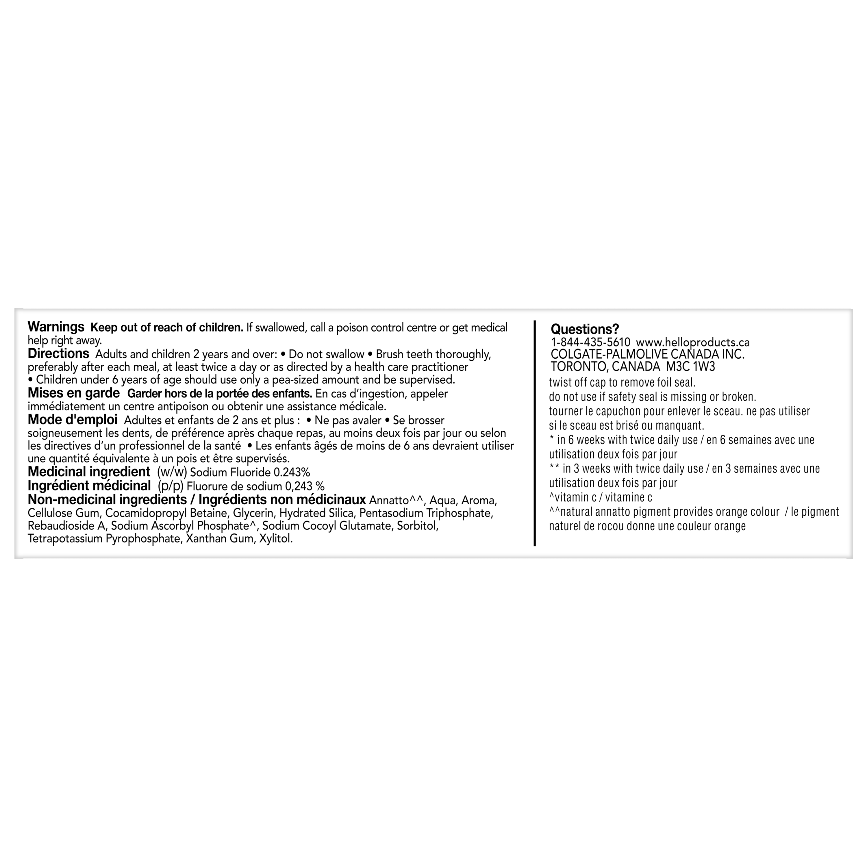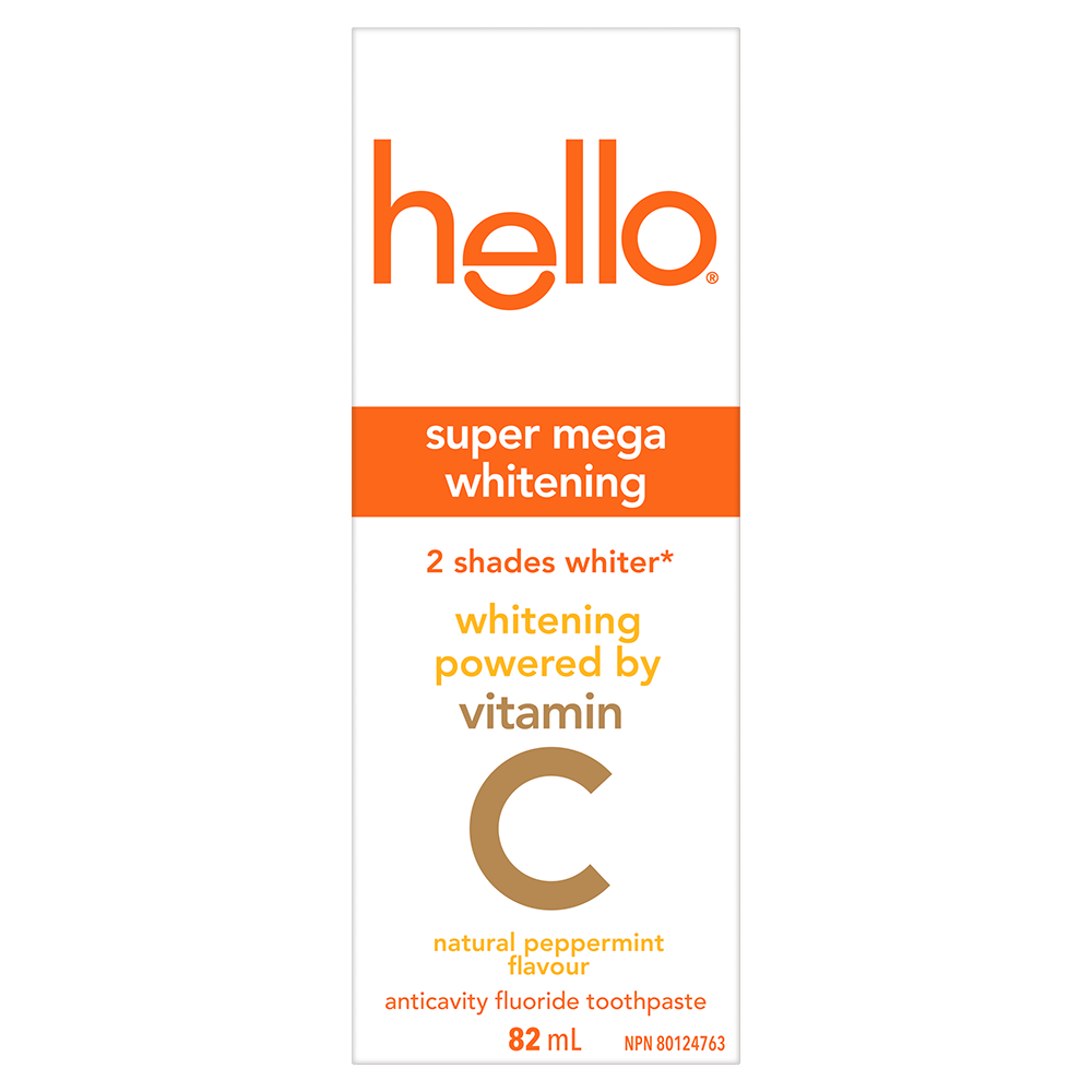 Product Title Hello Super Mega Whitening Toothpaste with Fluoride, Natural Peppermint Flavour, 82 mL Tube SKU 61040748 SKU eCommerce Name Hello Super Mega Whitening Toothpaste with Fluoride, Natural Peppermint Flavour, 82 mL Tube Consumer Unit - GTIN 00827854014201 Case - GTIN 10827854014208 Product Category Oral Care Product Sub Category Toothpaste Brand Hello Product Sub Brand Hello Adult TP Consumer Unit Gross Weight 0.142 KG / 0.313 LB Consumer Unit Net Weight 0.113 KG / 0.249 LB Consumer Unit Length 44.000 MM / 1.732 IN Consumer Unit Width 55.000 MM / 2.165 IN Consumer Unit Height 147.000 MM / 5.787 IN Consumer Unit Volume 0.356 C8 / 0.013 CF Product Title Hello Super Mega Whitening Toothpaste with Fluoride, Natural Peppermint Flavour, 82 mL Tube Product Description Say hello to a brighter smile and c ya later stains with hello Super Mega Whitening Toothpaste with Fluoride. This whitening toothpaste for adults has a delightful Peppermint toothpaste flavour and whitens teeth up to 2 shades whiter.* This anticavity fluoride toothpaste is infused with naturally derived Vitamin C**, an alternative to peroxide for whitening teeth, and is safe for everyday use. Experience whitening powered by Vitamin C with hello Super Mega Whitening Toothpaste. This whitening, mint toothpaste freshens breath with natural peppermint flavour and removes 94% of surface stains*** so you can truly c the sparkle. Use hello Super Mega Whitening Toothpaste with Fluoride to help remineralize tooth enamel, prevent cavities and stains, and experience 2 shades of whiter teeth.* hello Super Mega Whitening Toothpaste is an anticavity toothpaste with fluoride that helps prevent cavities. This SLS free toothpaste also contains no peroxide, parabens, preservatives, sugar, artificial sweeteners, artificial flavours, titanium dioxide, gluten, or dyes****. Now that’s a no-brainer. Plus, this stain removal whitening toothpaste is vegan, not tested on animals, and comes in a recyclable carton and tube†. C the difference yourself with the hello Super Mega Whitening Toothpaste. *in 6 weeks with twice daily use **this toothpaste contains sodium ascorbyl phosphate (Vitamin C) ***in 3 weeks with twice daily use ****natural annatto pigment provides orange color †check locally: your community may not accept tubes for recycling just yet eCommerce Copy Say hello to a brighter smile and c ya later stains with Hello Super Mega Whitening Toothpaste with Fluoride. This whitening toothpaste for adults has a delightful Peppermint toothpaste flavour and whitens teeth up to 2 shades whiter.* This anticavity fluoride toothpaste is infused with naturally derived Vitamin C**, an alternative to peroxide for whitening teeth, and is safe for everyday use. *in 6 weeks with twice daily use **this toothpaste contains sodium ascorbyl phosphate (vitamin c) eCommerce Copy- Long Description Hello Super Mega Whitening Toothpaste with Fluoride, Natural Peppermint Flavour, 82 mL Tube Say hello to a brighter smile and c ya later stains with Hello Super Mega Whitening Toothpaste with Fluoride. This whitening toothpaste for adults has a delightful Peppermint toothpaste flavour and whitens teeth up to 2 shades whiter.* This anticavity fluoride toothpaste is infused with naturally derived Vitamin C**, an alternative to peroxide for whitening teeth, and is safe for everyday use. Whitening Powered by Vitamin C Experience whitening powered by Vitamin C with Hello Super Mega Whitening Toothpaste. This whitening, mint toothpaste freshens breath with natural peppermint flavour and removes 94% of surface stains*** so you can truly c the sparkle. Use Hello Super Mega Whitening Toothpaste with Fluoride to help remineralize tooth enamel, prevent cavities and stains, and experience 2 shades of whiter teeth.* Your Mouth Says Thank You Hello Super Mega Whitening Toothpaste is an anticavity toothpaste with fluoride that helps prevent cavities. This SLS free toothpaste also contains no peroxide, parabens, preservatives, sugar, artificial sweeteners, artificial flavours, titanium dioxide, gluten, or dyes****. Now that’s a no brainer. Plus, this stain removal whitening toothpaste is vegan, not tested on animals, and comes in a recyclable carton and tube†. C the difference yourself with the Hello Super Mega Whitening Toothpaste. *in 6 weeks with twice daily use **this toothpaste contains sodium ascorbyl phosphate (vitamin c) ***in 3 weeks with twice daily use ****natural annatto pigment provides orange color †check locally: your community may not accept tubes for recycling just yet Bullet 1 Includes one (1) 82 mL tube of hello Super Mega Whitening Toothpaste with Fluoride Bullet 2 This whitening anticavity toothpaste whitens teeth up to 2 shades whiter* (*in 6 weeks with twice daily use) Bullet 3 This whitening toothpaste removes 94% of stains*** using Vitamin C** (***in 3 wks with 2x daily use, **contains sodium ascorbyl phosphate (Vitamin C)) Bullet 4 The refreshing Natural Peppermint toothpaste flavour tastes awesome and helps freshen breath Bullet 5 hello Super Mega Whitening Toothpaste for Adults is safe for everyday use and helps prevent cavities with its anticavity fluoride-based formula Bullet 6 Made with no peroxide, parabens, preservatives, sugar, artificial sweeteners, artificial flavours, titanium dioxide, or gluten Keywords (eCommerce) whitening toothpaste, whitening toothpaste for adults, fluoride toothpaste, mint toothpaste, peppermint toothpaste, sls free toothpaste, toothpaste with fluoride, anticavity toothpaste, OS Amazon Product Title hello Super Mega Whitening Toothpaste with Fluoride, Teeth Whitening Toothpaste Powered by Vitamin C, Peroxide Free, Removes 94% of Surface Stains, Natural Peppermint Flavour, 82 mL Tube OS Amazon Product Description Say hello to a brighter smile and c ya later stains with hello Super Mega Whitening Toothpaste with Fluoride. This whitening toothpaste for adults has a delightful Peppermint toothpaste flavour and whitens