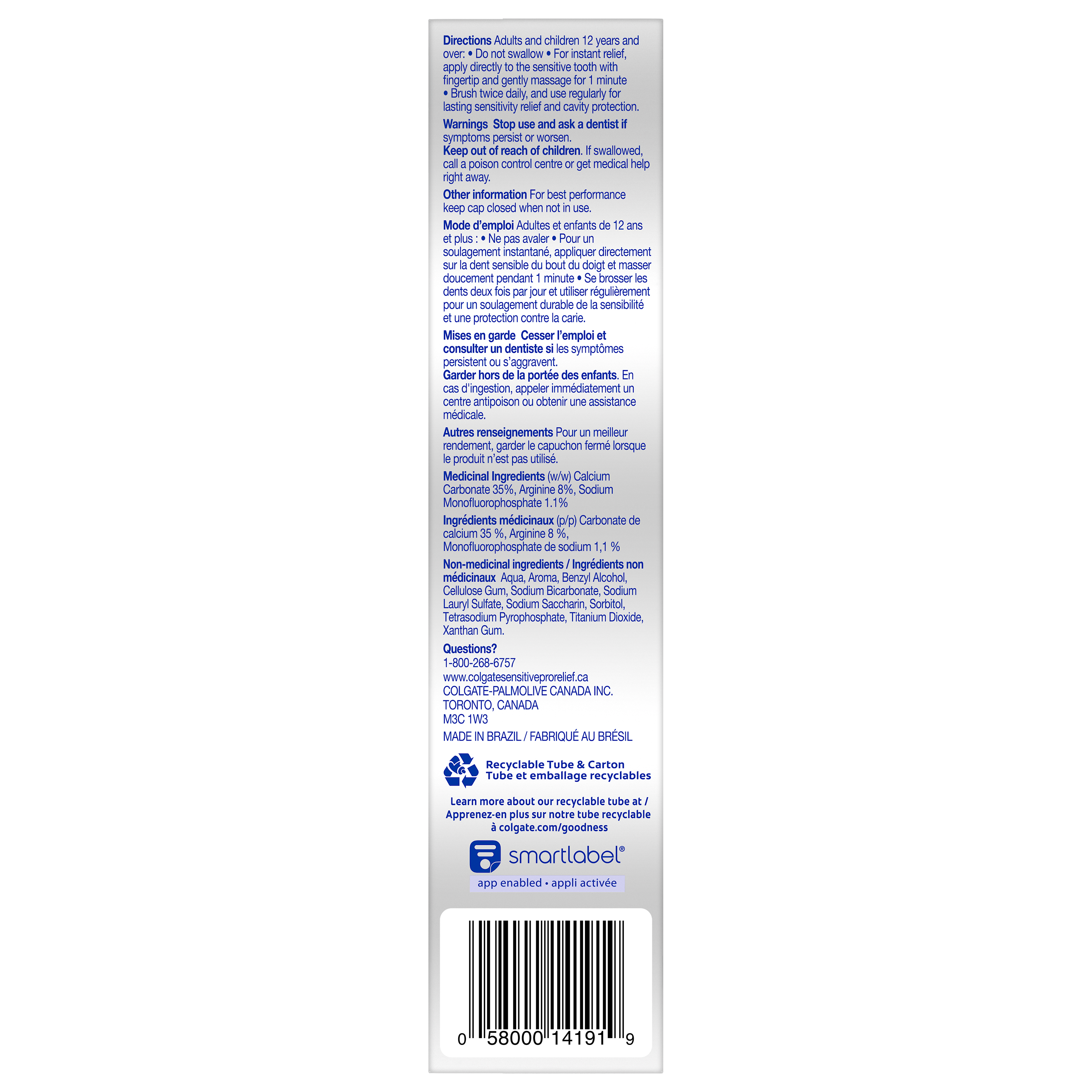 Product Title Colgate Sensitive Pro-Relief Repair & Prevent Toothpaste 75mL (2 pack) SKU 61041944 SKU eCommerce Name Colgate Sensitive Pro-Relief Repair & Prevent Toothpaste 75mL (2 pack) Consumer Unit - GTIN 00058000141919 Case - GTIN 10058000141916 Product Category Oral Care Product Sub Category Toothpaste Brand Colgate Product Sub Brand Colgate Sensitive Pro-Relief TP Consumer Unit Gross Weight 0.290 KG / 0.639 LB Consumer Unit Net Weight 0.222 KG / 0.490 LB Consumer Unit Length 39.000 MM / 1.535 IN Consumer Unit Width 170.000 MM / 6.693 IN Consumer Unit Height 101.000 MM / 3.976 IN Consumer Unit Volume 0.670 C8 / 0.024 CF Product Title Colgate Sensitive Pro-Relief Repair & Prevent Toothpaste 75mL (2 pack) eCommerce Copy Colgate Sensitive Pro-Relief Repair & Prevent sensitivity toothpaste helps reduce factors that contribute to gum recession, fights cavities, and helps reduce plaque and gingivitis. Plus it has the freshness you trust from Colgate. eCommerce Copy- Long Description Colgate Sensitive Pro-Relief Repair & Prevent sensitivity toothpaste is clinically proven for instant and lasting† relief from sensitivity pain. With regular use, the Pro-Argin formula builds a long-lasting protective barrier that acts like a seal against sensitivity. Colgate Sensitive Pro-Relief Repair & Prevent sensitivity toothpaste helps reduce factors that contribute to gum recession, fights cavities and helps reduce plaque and gingivitis. Plus it has the freshness you trust from Colgate. †For instant relief, apply directly to the sensitive tooth with fingertip and gently massage for 1 minute. Brush twice daily and use regularly for lasting sensitivity relief, cavity protection and gum health benefits. Keywords (eCommerce) hypersensitivity, antisensitivity, tooth paste, toothpastes, toohpaste, best, great taste, cavity protection, safe, stain removing, strengthen, brightening, dentist recommended, tooth pain, sensitivity, bad breath, tooth paste, toothpastes, toothpaste for sensitive teeth, at home teeth whitening toothpaste, anticavity fluoride toothpaste, white paste toothpaste, colgate, toothpaste, acid erosion, proenamel, pronenamel, weak, restore, restoration, remineralizing, softening tooth enamel, acid erosion, preserving