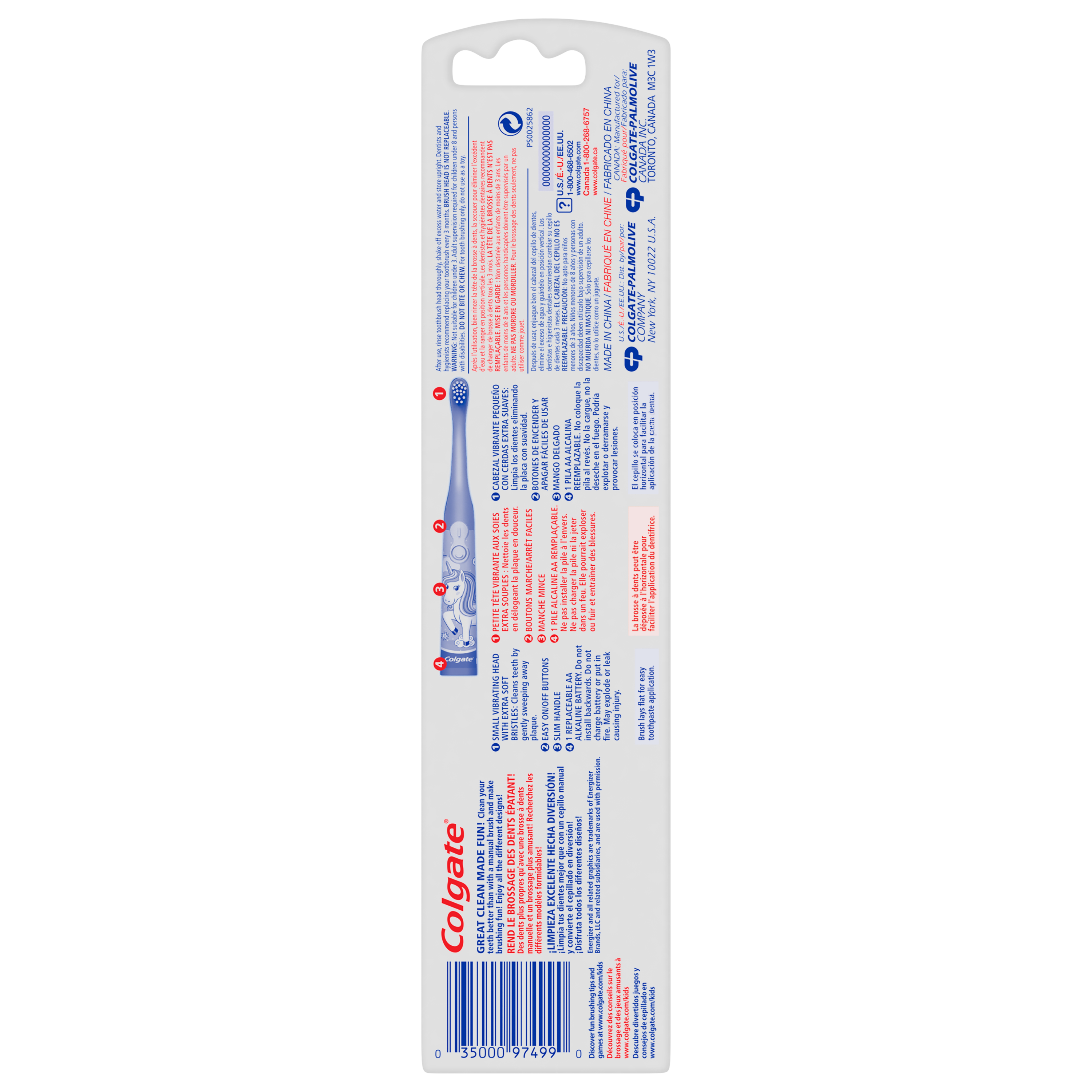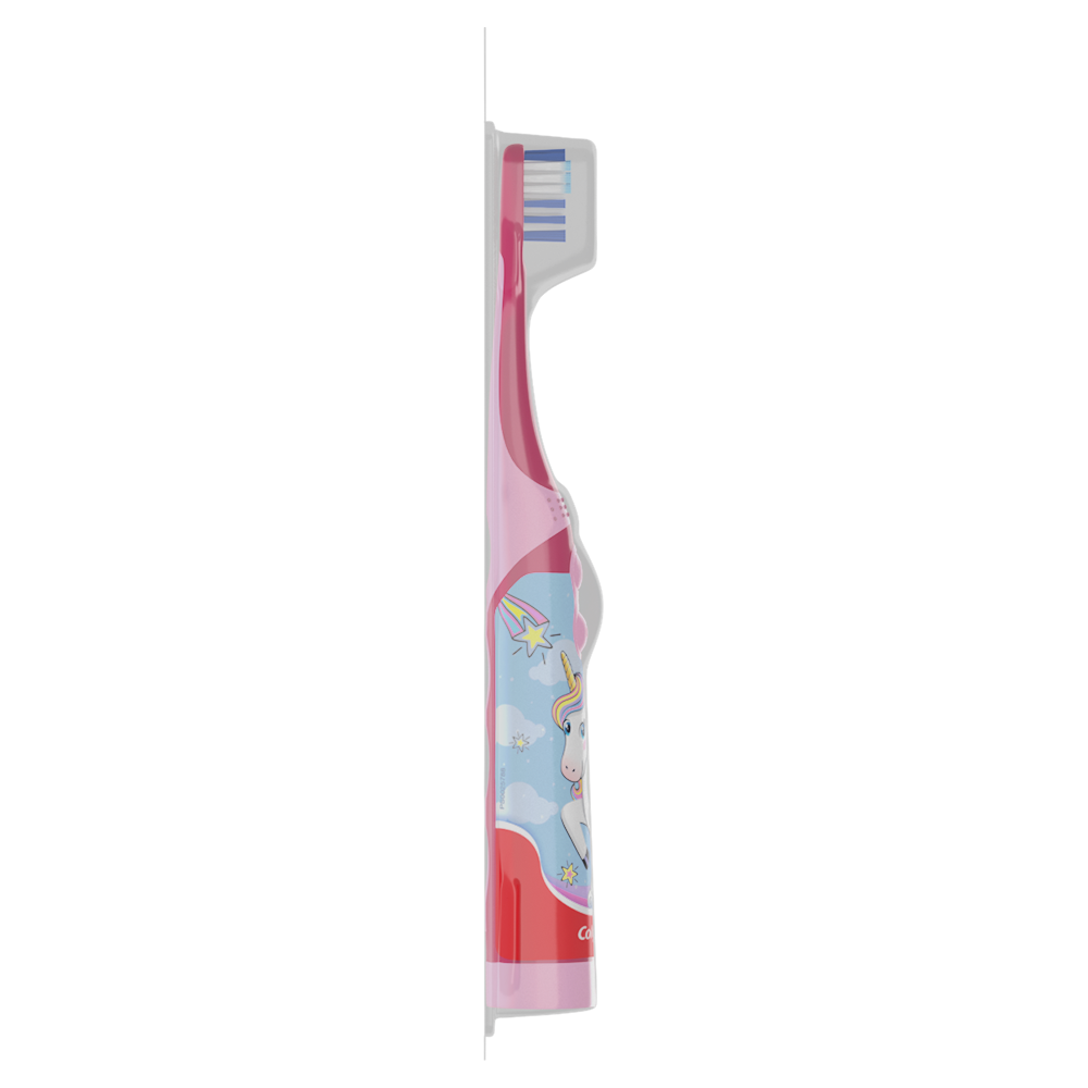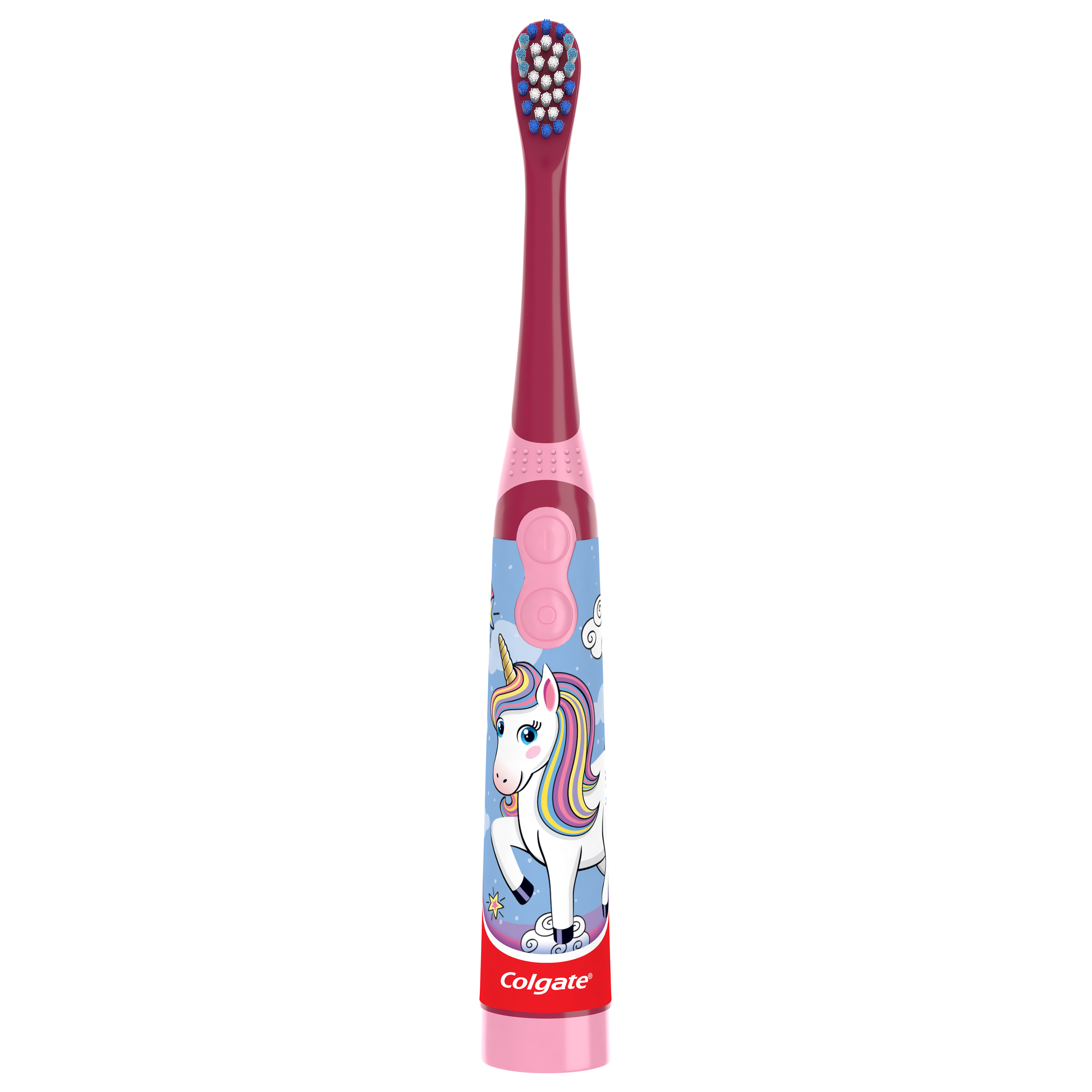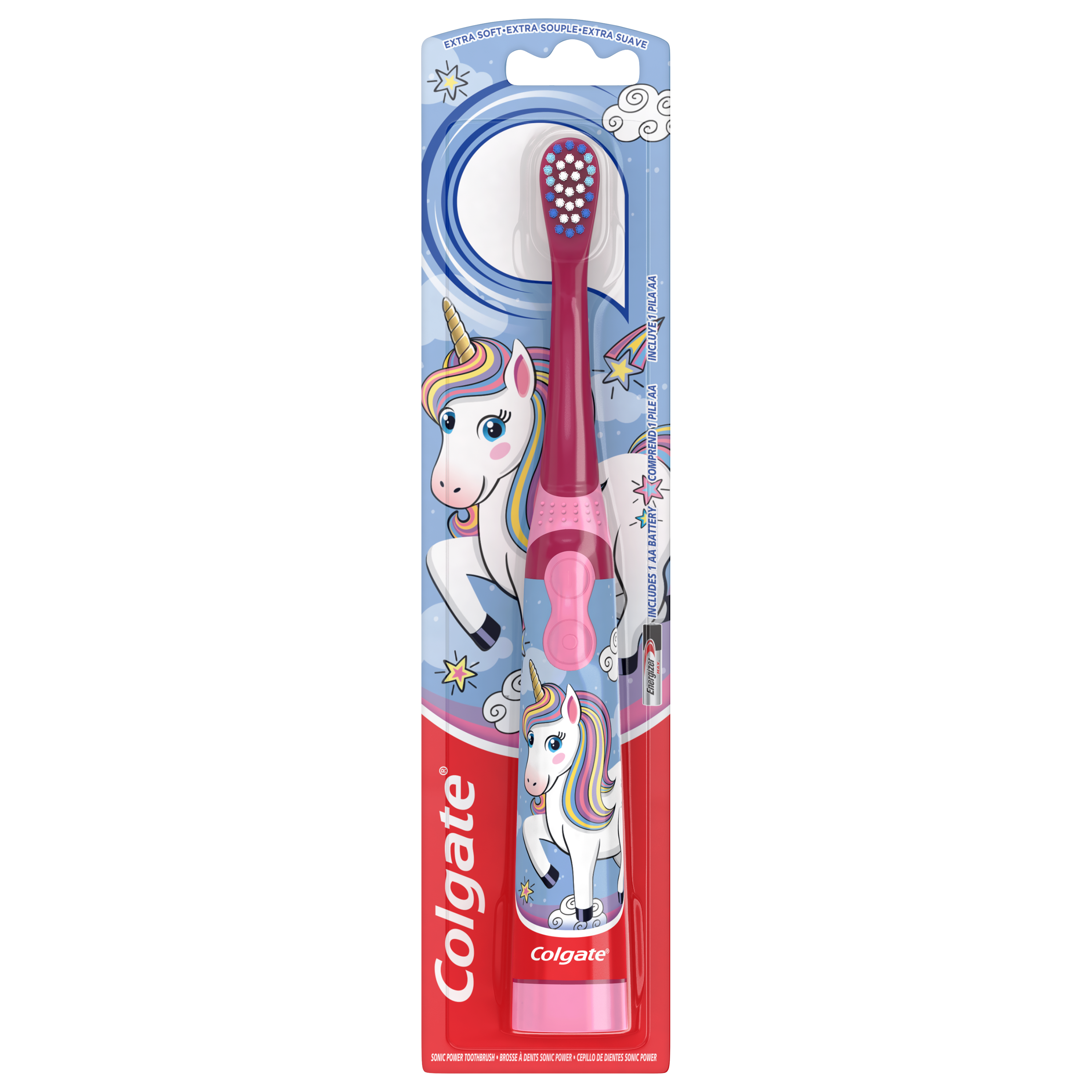 Product Title COL KIDS PWR TB CS SP UNICORN SONIC 12CT SKU 61043824 Consumer Unit - GTIN 00035000974990 Case - GTIN 10827854016387 Product Category Oral Care Product Sub Category Battery TB Brand Colgate Product Sub Brand Colgate Kids BTB Consumer Unit Gross Weight 0.071 KG / 0.157 LB Consumer Unit Net Weight 0.059 KG / 0.130 LB Consumer Unit Length 26.000 MM / 1.024 IN Consumer Unit Width 54.000 MM / 2.126 IN Consumer Unit Height 229.000 MM / 9.016 IN Consumer Unit Volume 0.322 C8 / 0.011 CF Product Title COL KIDS PWR TB CS SP UNICORN SONIC 12CT Walmart Bullet 1 The Colgate Kids Battery Toothbrush is made for children ages 3 and up. Walmart Bullet 2 A small, vibrating brush head with extra soft bristles cleans teeth and sweeps away plaque. Walmart Bullet 3 The extra soft bristles are gentle on gums and makes teeth brushing fun for kids Walmart Bullet 4 A flat-laying handle makes it easy for kids to apply toothpaste without the brush rolling over or away. Walmart Bullet 5 A slim, easy-to-hold handle makes this kids toothbrush perfect for little hands. Walmart Bullet 6 The battery-operated toothbrush for kids has a convenient on/off switch. Walmart Bullet 7 Has an easily replaceable battery for kids toothbrush to function (1 AA battery included).
