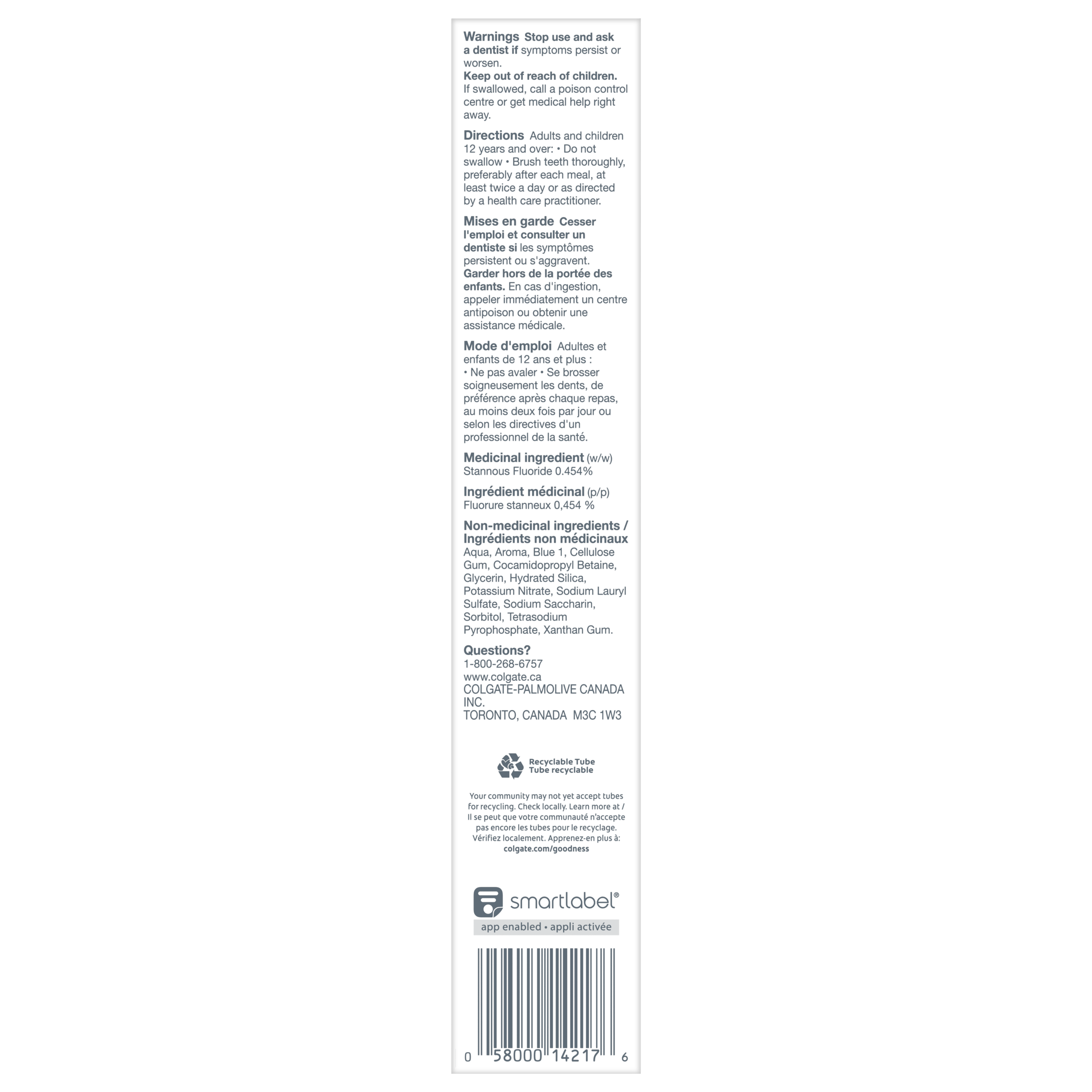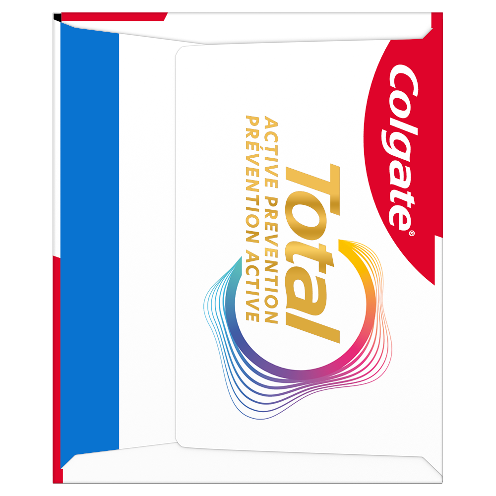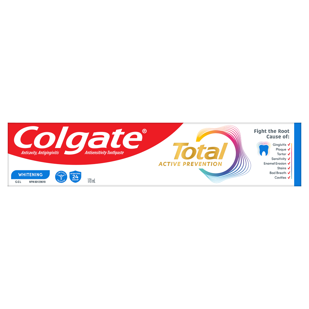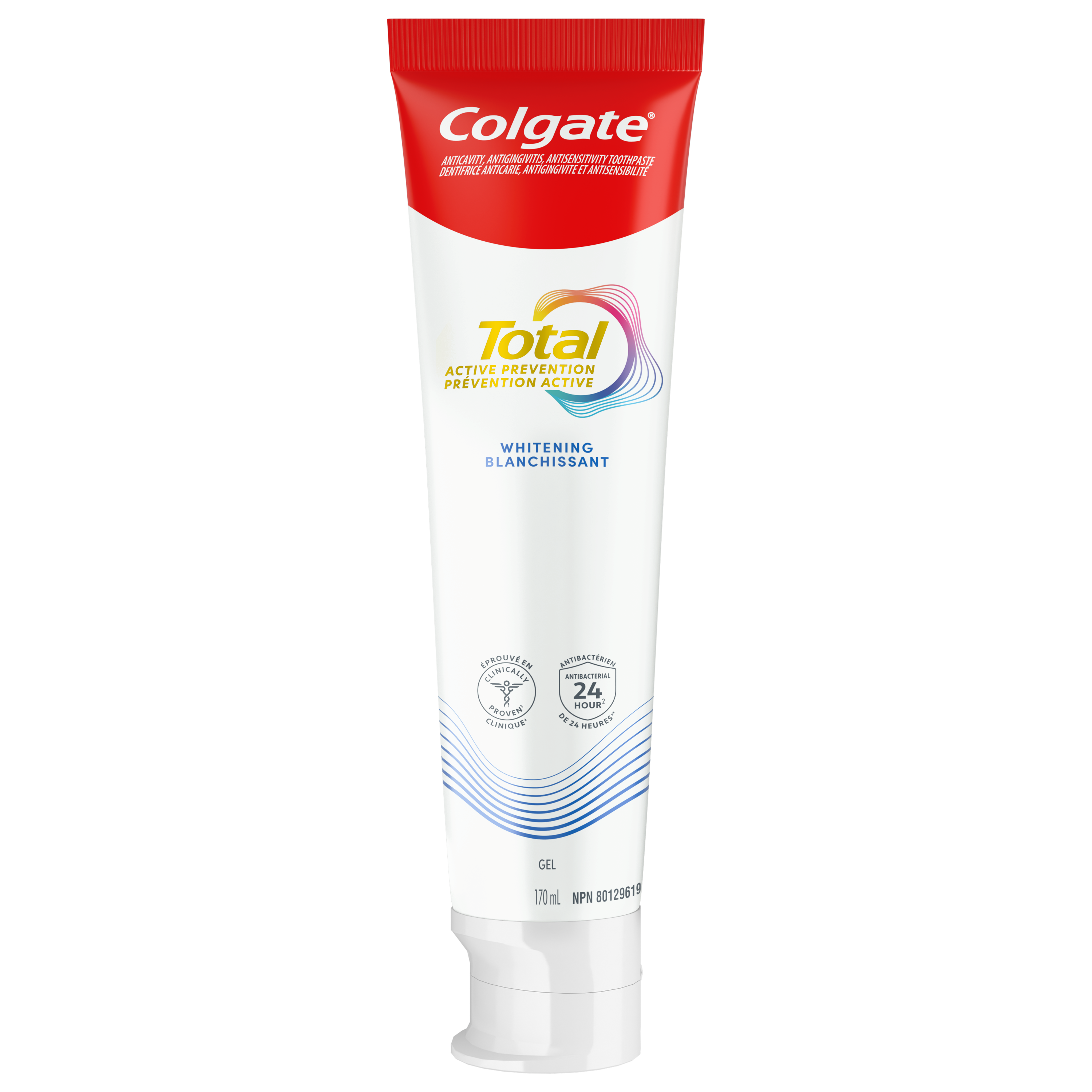 OS Walmart Bullet 1 Includes one (1) 170 mL tube of Colgate Total Active Prevention Whitening Toothpaste Gel OS Walmart Bullet 2 Helps fight the root cause of common oral health issues like cavities, stains, gingivitis, bad breath, plaque, enamel erosion, sensitivity, and tartar OS Walmart Bullet 3 This fluoride toothpaste is clinically proven to help reduce plaque in just 12 weeks OS Walmart Bullet 4 The whitening gel toothpaste formula helps freshen breath and whitens teeth OS Walmart Bullet 5 For superior prevention** against sensitivity, plaque, gingivitis, and tartar, use Colgate Total Active Prevention Whitening Anticavity Toothpaste OS Walmart Bullet 6 New Colgate Total fights the root cause of common oral health issues such as cavities, gingivitis, plaque, enamel erosion, sensitivity and tartar OS Walmart Bullet 7 Proactive prevention against cavities, sensitivity, plaque, tartar, gingivitis OS Walmart Bullet 8 Multibenefit Oral Care for superior prevention against sensitivity, plaque, gingivitis, tartar vs. regular fluoride toothpaste Walmart Bullet 1 Includes one (1) 170 mL tube of Colgate Total Active Prevention Whitening Toothpaste Gel Walmart Bullet 2 Helps fight the root cause of common oral health issues like cavities, stains, gingivitis, bad breath, plaque, enamel erosion, sensitivity, and tartar Walmart Bullet 3 This fluoride toothpaste is clinically proven to help reduce plaque in just 12 weeks Walmart Bullet 4 The whitening gel toothpaste formula helps freshen breath and whitens teeth Walmart Bullet 5 For superior prevention** against sensitivity, plaque, gingivitis, and tartar, use Colgate Total Active Prevention Whitening Anticavity Toothpaste OS Loblaws Product Title Total Active Prevention Whitening Toothpaste Gel, Mint OS Loblaws Product Description Help prevent common oral health problems* before they start with Colgate Total Active Prevention Whitening Toothpaste Gel. This anticavity toothpaste gel fights the root cause of cavities, stains, gingivitis, bad breath, plaque, enamel erosion, sensitivity, and tartar. Colgate Total Active Prevention Whitening Toothpaste uses a clinically proven and advanced formula, backed by science, to help reduce plaque in just 12 weeks. Plus this whitening mint toothpaste helps with bad breath and helps whiten teeth. For superior prevention** against sensitivity, plaque, gingivitis, and tartar, choose Colgate Total Active Prevention Whitening Anticavity Toothpaste. *such as plaque, tartar, gingivitis, sensitivity **vs. a regular fluoride toothpaste OS Loblaws Bullet 1 Includes one (1) 170 mL tube of Colgate Total Active Prevention Whitening Toothpaste Gel OS Loblaws Bullet 2 Helps fight the root cause of common oral health issues like cavities, stains, gingivitis, bad breath, plaque, enamel erosion, sensitivity, and tartar OS Loblaws Bullet 3 New Colgate Total fights the root cause of common oral health issues such as cavities, gingivitis, plaque, enamel erosion, sensitivity and tartar OS Loblaws Bullet 4 Proactive prevention against cavities, sensitivity, plaque, tartar, gingivitis OS Loblaws Bullet 5 Multibenefit Oral Care for superior prevention against sensitivity, plaque, gingivitis, tartar vs. regular fluoride toothpaste