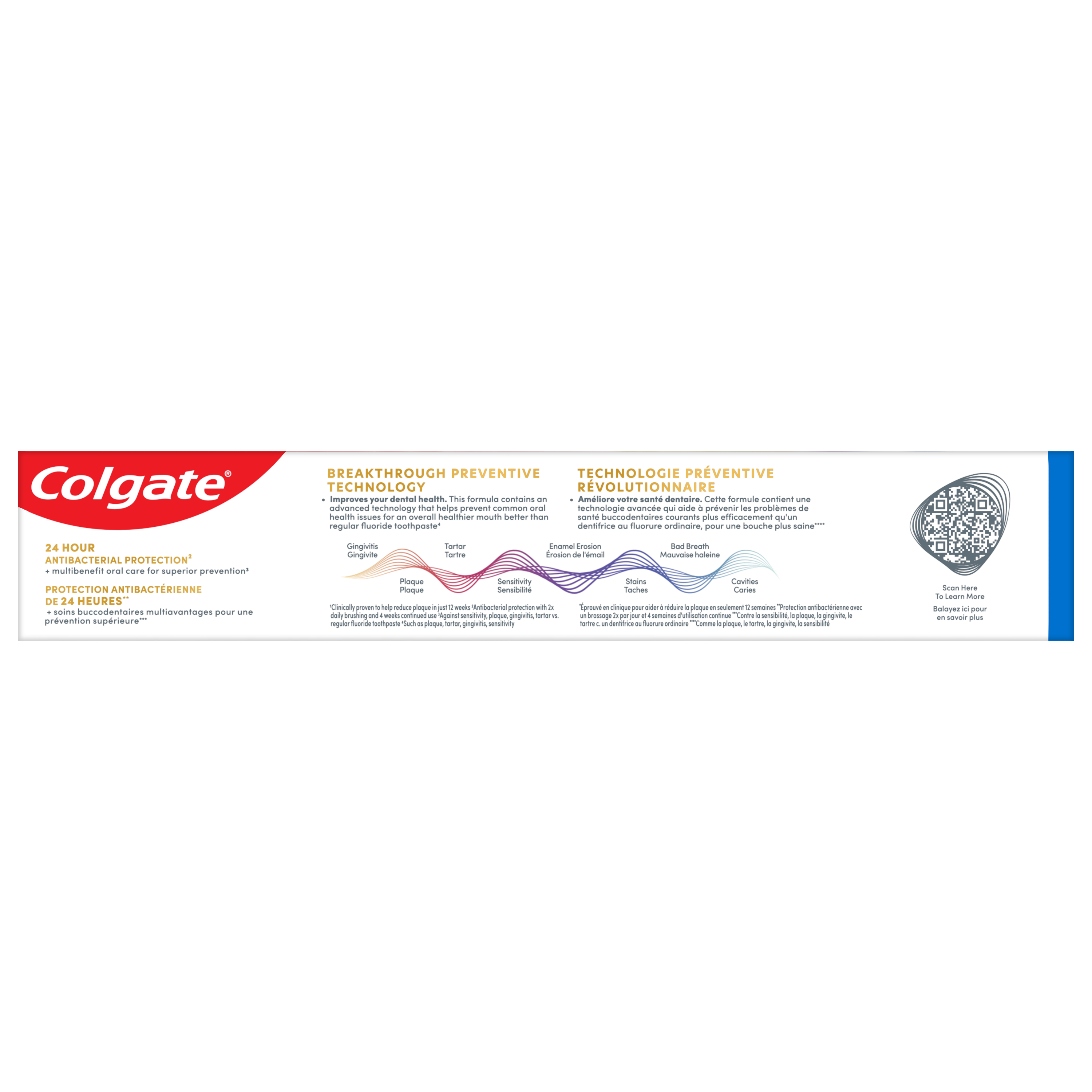 Colgate Total Active Prevention Whitening Toothpaste Gel uses a clinically proven and advanced formula, backed by science, to help reduce plaque in just 12 weeks. This advanced fluoride toothpaste improves your dental health and contains an advanced technology that helps prevent common oral health issues for an overall healthier mouth better than regular fluoride toothpaste.** Plus this whitening mint toothpaste helps with bad breath and helps whiten teeth.