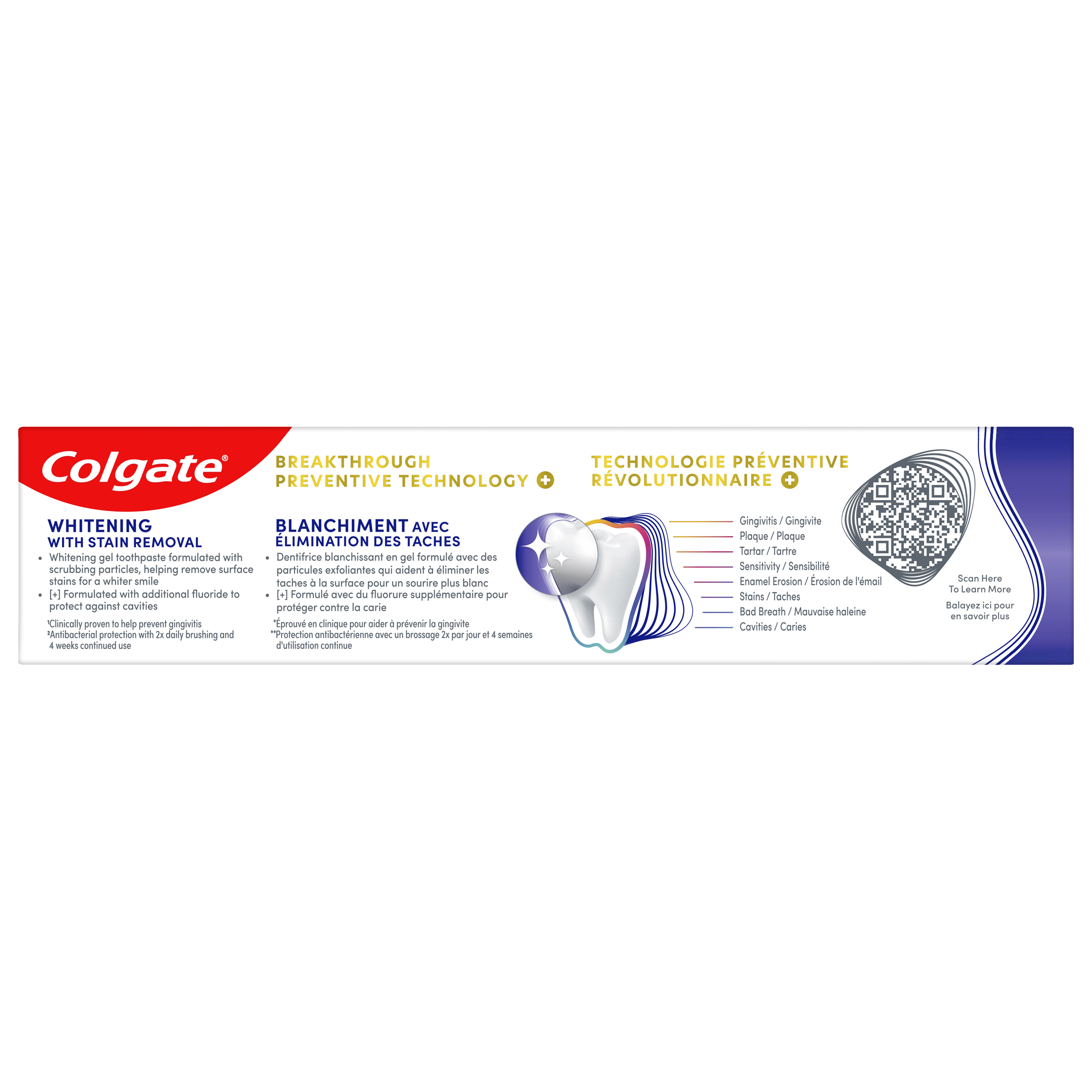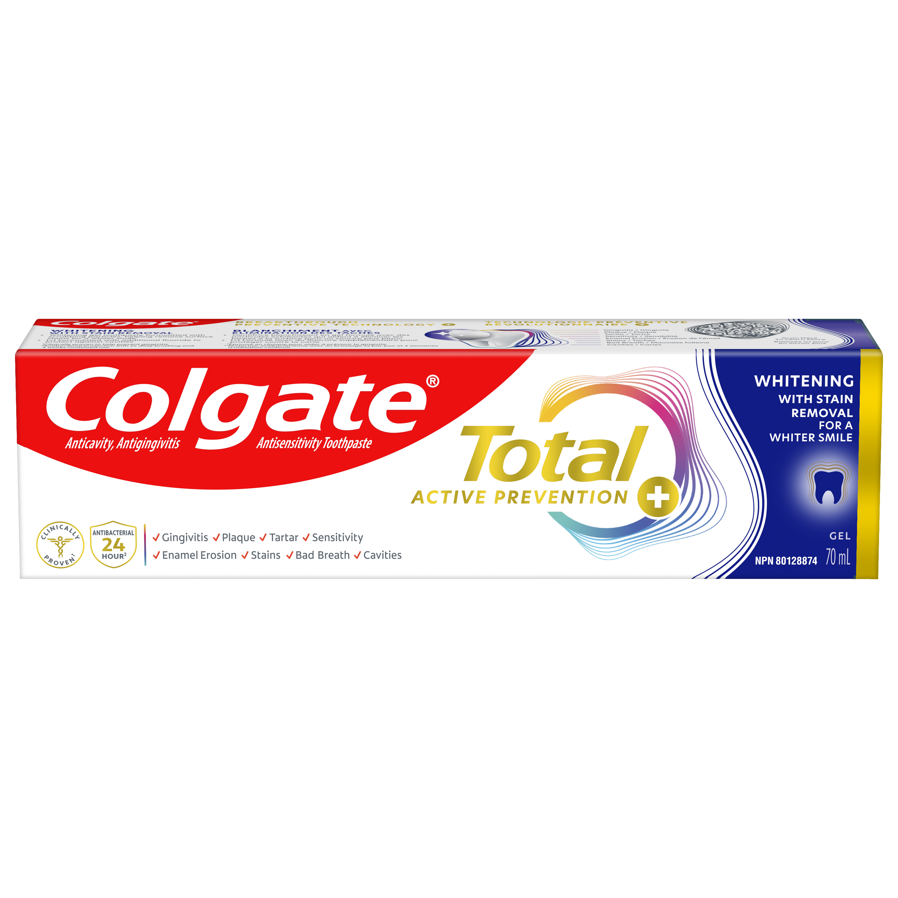 OS Walmart Bullet 1 Includes one (1) 70 mL tube of Colgate Total Active Prevention Plus Stain Removal Whitening Toothpaste Gel OS Walmart Bullet 2 This whitening gel toothpaste is formulated with scrubbing particles which help remove surface stains for a whiter smile OS Walmart Bullet 3 Helps fight the root cause of common oral health problems such as cavities, gingivitis, plaque, enamel erosion, sensitivity, and tartar OS Walmart Bullet 4 This fluoride toothpaste developed by experts is formulated with additional fluoride to protect against cavities OS Walmart Bullet 5 Help prevent common oral care problems(1) before they start using Colgate Total Active Prevention Plus Stain Removal Whitening Toothpaste Gel OS Walmart Bullet 6 New Colgate Total fights the root cause of common oral health issues such as cavities, gingivitis, plaque, enamel erosion, sensitivity and tartar OS Walmart Bullet 7 Proactive prevention against cavities, sensitivity, plaque, tartar, gingivitis Walmart Bullet 1 Includes one (1) 70 mL tube of Colgate Total Active Prevention Plus Stain Removal Whitening Toothpaste Gel Walmart Bullet 2 This whitening gel toothpaste is formulated with scrubbing particles which help remove surface stains for a whiter smile Walmart Bullet 3 Helps fight the root cause of common oral health problems such as cavities, gingivitis, plaque, enamel erosion, sensitivity, and tartar Walmart Bullet 4 This fluoride toothpaste developed by experts is formulated with additional fluoride to protect against cavities Walmart Bullet 5 Help prevent common oral care problems* before they start using Colgate Total Active Prevention Plus Stain Removal Whitening Toothpaste Gel OS Loblaws Product Title Total Stain Removal Whitening Toothpaste Gel, Mint OS Loblaws Product Description Help stop common oral health problems* before they start with Colgate Total Active Prevention Plus Stain Removal Whitening Toothpaste Gel. This whitening gel toothpaste is specially formulated with scrubbing particles which help remove surface stains for a whiter smile. Plus, this anticavity toothpaste fights the root cause of common oral health issues including cavities, gingivitis, plaque, enamel erosion, sensitivity, and tartar for an overall healthier mouth**. Provide superior prevention and protection of your oral care health when you use this anticavity toothpaste twice daily with 4 weeks of continued use. *such as plaque, tartar, gingivitis, sensitivity **vs. a regular fluoride toothpaste OS Loblaws Bullet 1 Includes one (1) 70 mL tube of Colgate Total Active Prevention Plus Stain Removal Whitening Toothpaste Gel OS Loblaws Bullet 2 This whitening gel toothpaste is formulated with scrubbing particles which help remove surface stains for a whiter smile OS Loblaws Bullet 3 New Colgate Total fights the root cause of common oral health issues such as cavities, gingivitis, plaque, enamel erosion, sensitivity and tartar OS Loblaws Bullet 4 Proactive prevention against cavities, sensitivity, plaque, tartar, gingivitis OS Loblaws Bullet 5 Help prevent common oral care problems* before they start using Colgate Total Active Prevention Plus Stain Removal Whitening Toothpaste Gel