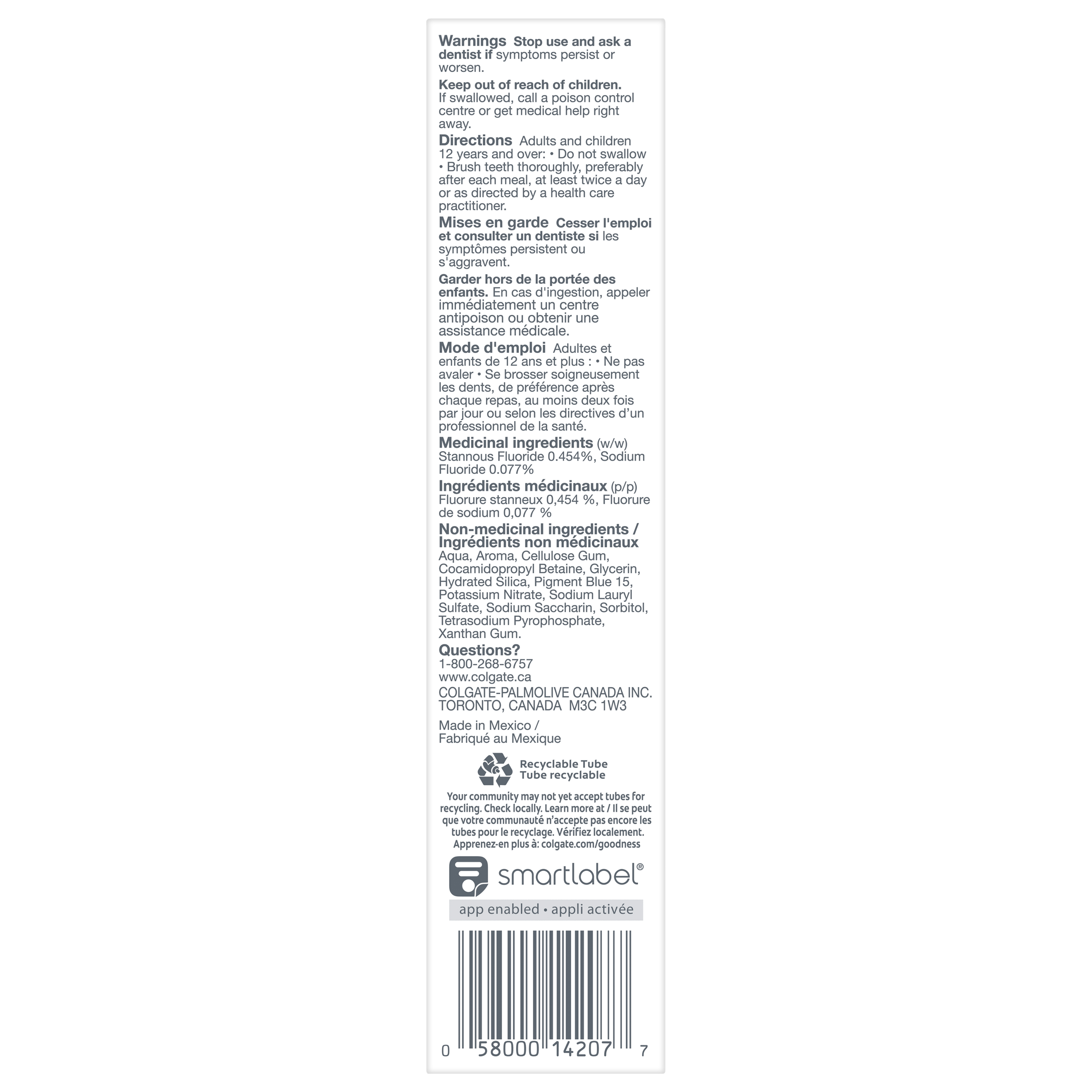 Product Title Colgate Total Active Prevention Plus Whitening with Stain Removal Whitening Toothpaste Gel, Mint Flavour, 70 mL SKU 61044256 SKU eCommerce Name Colgate Total Active Prevention Plus Whitening with Stain Removal Whitening Toothpaste Gel, Mint Flavour, 70 mL Consumer Unit - GTIN 00058000142077 Case - GTIN 10058000142074 Product Category Oral Care Product Sub Category Toothpaste Brand Colgate Product Sub Brand Colgate Total TP Consumer Unit Gross Weight 0.115 KG / 0.254 LB Consumer Unit Net Weight 0.092 KG / 0.203 LB Consumer Unit Length 39.000 MM / 1.535 IN Consumer Unit Width 173.000 MM / 6.811 IN Consumer Unit Height 47.000 MM / 1.850 IN Consumer Unit Volume 0.317 C8 / 0.011 CF Product Title Colgate Total Active Prevention Plus Whitening with Stain Removal Whitening Toothpaste Gel, Mint Flavour, 70 mL Product Description Help stop common oral health problems* before they start with Colgate Total Active Prevention Plus Stain Removal Whitening Toothpaste Gel. This whitening gel toothpaste is specially formulated with scrubbing particles which help remove surface stains for a whiter smile. Plus, this anticavity toothpaste fights the root cause of common oral health issues including cavities, gingivitis, plaque, enamel erosion, sensitivity, and tartar for an overall healthier mouth**. Colgate Total Active Prevention Plus Stain Removal Whitening Toothpaste uses an advanced scientific formula that is clinically proven to help fight gingivitis. This fluoride toothpaste developed by experts is also formulated with additional fluoride to protect against cavities. Plus, this whitening mint toothpaste helps freshen your breath. Colgate Total Active Prevention Plus Stain Removal Whitening Toothpaste can help improve your dental health by tackling common oral health issues before they begin. Provide superior prevention and protection of your oral care health when you use this anticavity toothpaste twice daily with 4 weeks of continued use. Feel secure knowing that Colgate Total Active Prevention Plus Stain Removal Whitening Toothpaste Gel has your oral care needs covered. *such as plaque, tartar, gingivitis, sensitivity **vs. a regular fluoride toothpaste eCommerce Copy <bulletlist><bullet>Includes one (1) 70 mL tube of Colgate Total Active Prevention Plus Whitening with Stain Removal Whitening Toothpaste Gel</bullet> <bullet>This whitening gel toothpaste is formulated with scrubbing particles which help remove surface stains for a whiter smile</bullet> <bullet>New Colgate Total fights the root cause of common oral health issues such as cavities, gingivitis, plaque, enamel erosion, sensitivity and tartar</bullet> <bullet>This fluoride toothpaste developed by experts is formulated with additional fluoride to protect against cavities</bullet> <bullet>Help prevent common oral care problems* before they start with this whitening toothpaste gel (*such as cavities and gingivitis)</bullet> <bullet>Proactive prevention against cavities, sensitivity, plaque, tartar, gingivitis</bullet></bulletlist> eCommerce Copy- Long Description Colgate Total Active Prevention Plus Whitening with Stain Removal Whitening Toothpaste Gel, 70 mL