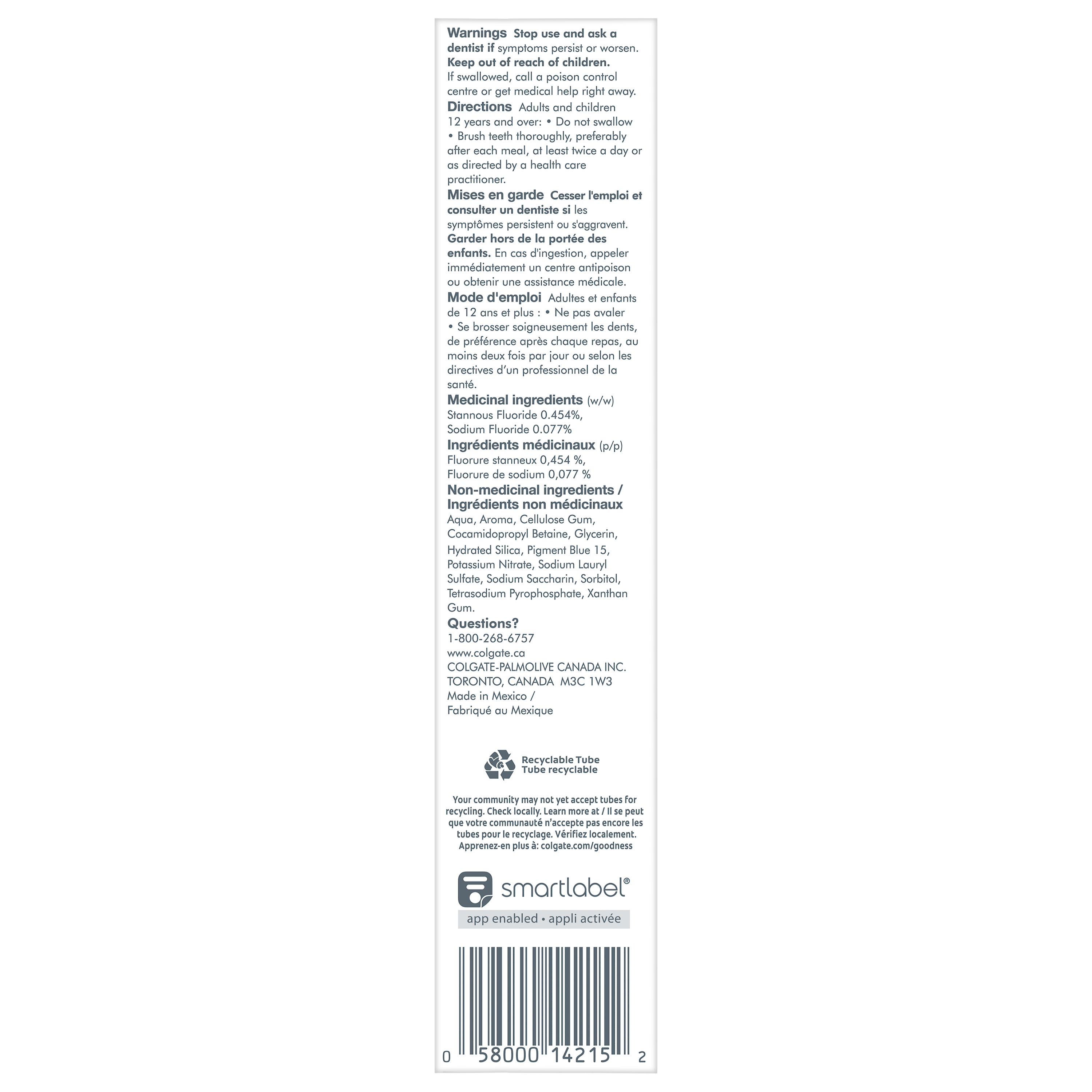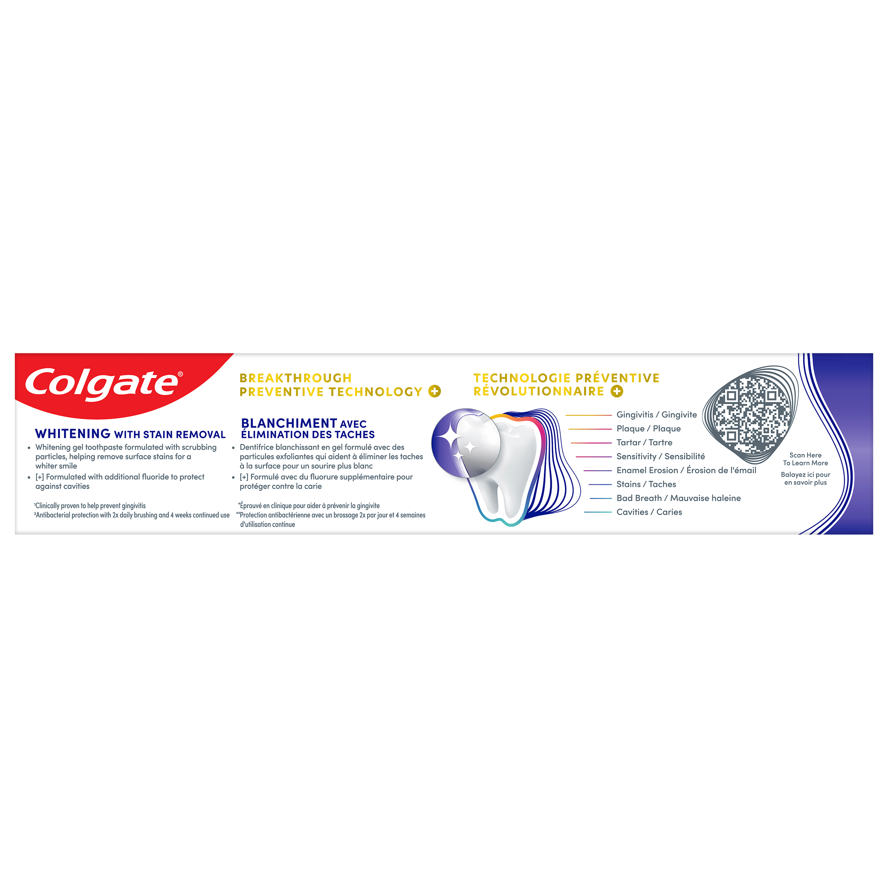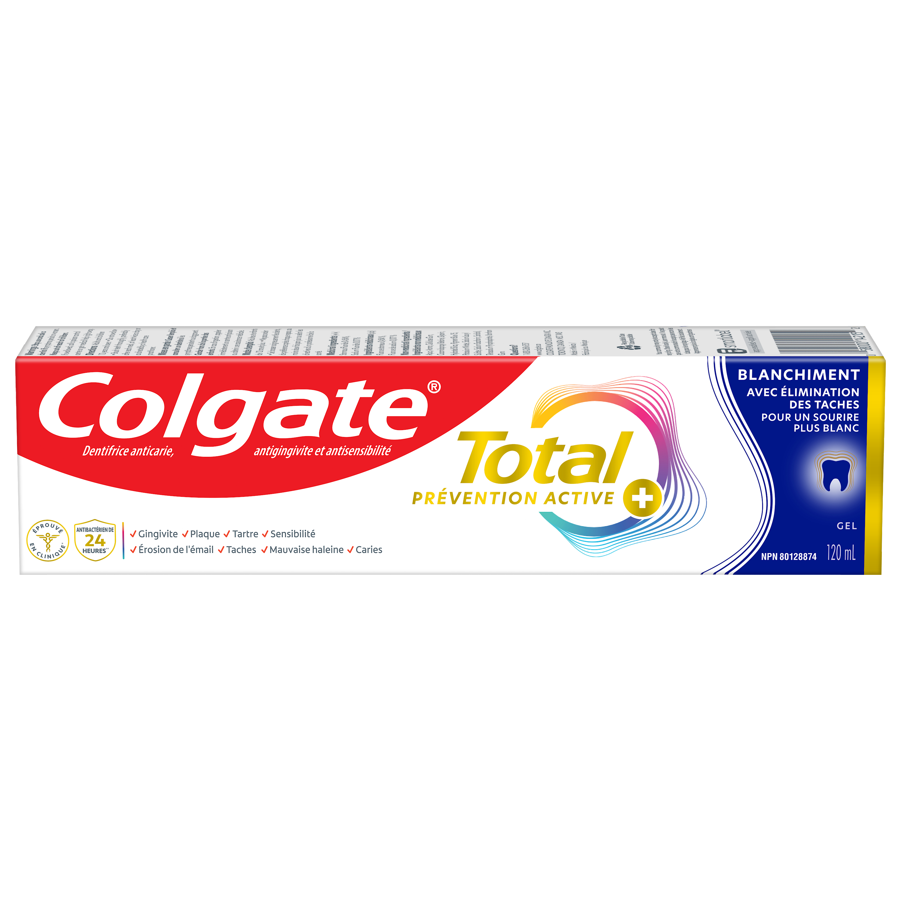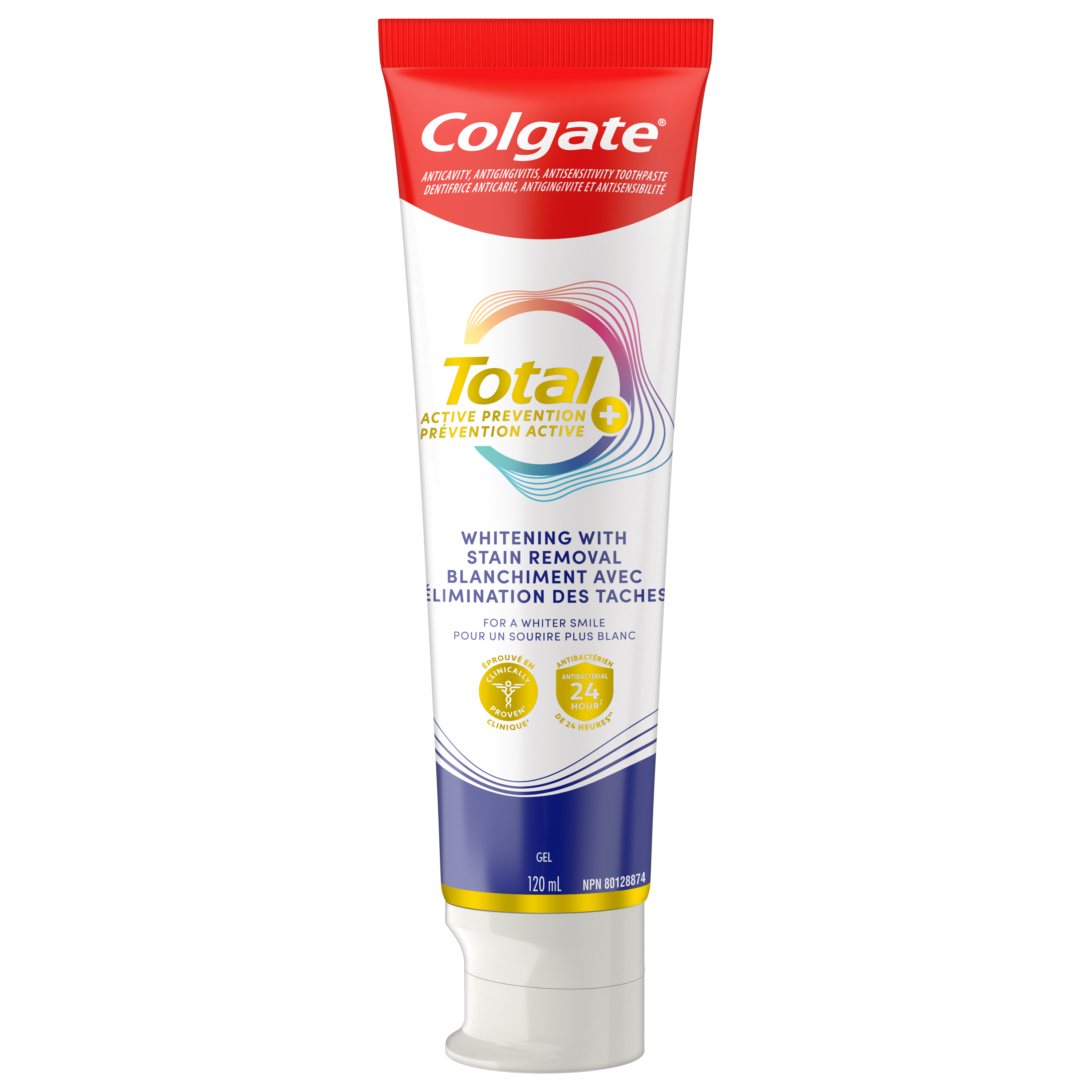 OS Walmart Bullet 1 Includes one (1) 120 mL tube of Colgate Total Active Prevention Plus Stain Removal Whitening Toothpaste Gel OS Walmart Bullet 2 This whitening gel toothpaste is formulated with scrubbing particles which help remove surface stains for a whiter smile OS Walmart Bullet 3 Helps fight the root cause of common oral health problems such as cavities, gingivitis, plaque, enamel erosion, sensitivity, and tartar OS Walmart Bullet 4 This fluoride toothpaste developed by experts is formulated with additional fluoride to protect against cavities OS Walmart Bullet 5 Help prevent common oral care problems(1) before they start using Colgate Total Active Prevention Plus Stain Removal Whitening Toothpaste Gel OS Walmart Bullet 6 New Colgate Total fights the root cause of common oral health issues such as cavities, gingivitis, plaque, enamel erosion, sensitivity and tartar OS Walmart Bullet 7 Proactive prevention against cavities, sensitivity, plaque, tartar, gingivitis Walmart Bullet 1 Includes one (1) 120 mL tube of Colgate Total Active Prevention Plus Stain Removal Whitening Toothpaste Gel Walmart Bullet 2 This whitening gel toothpaste is formulated with scrubbing particles which help remove surface stains for a whiter smile Walmart Bullet 3 Helps fight the root cause of common oral health problems such as cavities, gingivitis, plaque, enamel erosion, sensitivity, and tartar Walmart Bullet 4 This fluoride toothpaste developed by experts is formulated with additional fluoride to protect against cavities Walmart Bullet 5 Help prevent common oral care problems* before they start using Colgate Total Active Prevention Plus Stain Removal Whitening Toothpaste Gel OS Loblaws Product Title Total Stain Removal Whitening Toothpaste Gel, Mint OS Loblaws Product Description Help stop common oral health problems* before they start with Colgate Total Active Prevention Plus Stain Removal Whitening Toothpaste Gel. This whitening gel toothpaste is specially formulated with scrubbing particles which help remove surface stains for a whiter smile. Plus, this anticavity toothpaste fights the root cause of common oral health issues including cavities, gingivitis, plaque, enamel erosion, sensitivity, and tartar for an overall healthier mouth**. Provide superior prevention and protection of your oral care health when you use this anticavity toothpaste twice daily with 4 weeks of continued use. *such as plaque, tartar, gingivitis, sensitivity **vs. a regular fluoride toothpaste OS Loblaws Bullet 1 Includes one (1) 120 mL tube of Colgate Total Active Prevention Plus Stain Removal Whitening Toothpaste Gel OS Loblaws Bullet 2 This whitening gel toothpaste is formulated with scrubbing particles which help remove surface stains for a whiter smile OS Loblaws Bullet 3 New Colgate Total fights the root cause of common oral health issues such as cavities, gingivitis, plaque, enamel erosion, sensitivity and tartar OS Loblaws Bullet 4 Proactive prevention against cavities, sensitivity, plaque, tartar, gingivitis OS Loblaws Bullet 5 Help prevent common oral care problems* before they start using Colgate Total Active Prevention Plus Stain Removal Whitening Toothpaste Gel