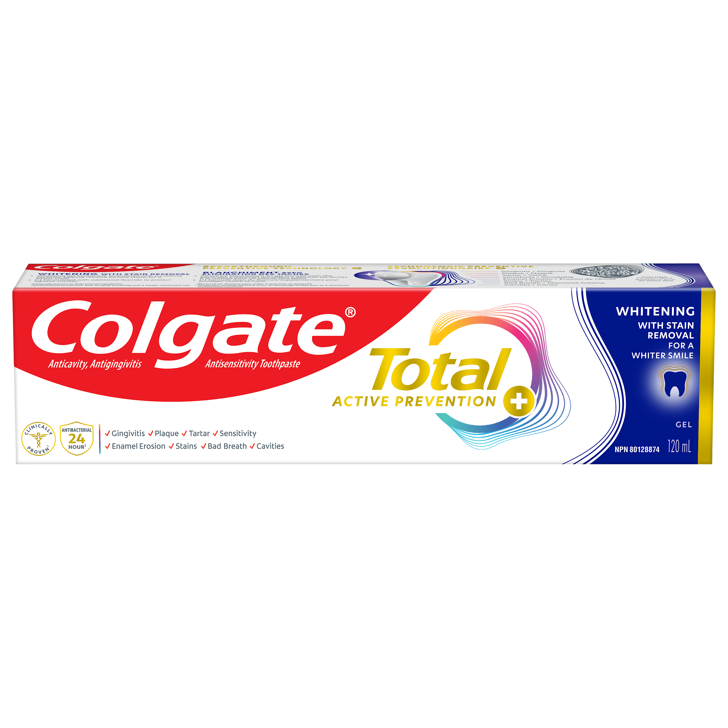 Product Title Colgate Total Active Prevention Plus Whitening with Stain Removal Whitening Toothpaste Gel, Mint Flavour, 120 mL SKU 61044257 SKU eCommerce Name Colgate Total Active Prevention Plus Whitening with Stain Removal Whitening Toothpaste Gel, Mint Flavour, 120 mL Consumer Unit - GTIN 00058000142152 Case - GTIN 10058000142159 Product Category Oral Care Product Sub Category Toothpaste Brand Colgate Product Sub Brand Colgate Total TP Consumer Unit Gross Weight 0.187 KG / 0.412 LB Consumer Unit Net Weight 0.158 KG / 0.348 LB Consumer Unit Length 41.000 MM / 1.614 IN Consumer Unit Width 196.000 MM / 7.717 IN Consumer Unit Height 50.000 MM / 1.969 IN Consumer Unit Volume 0.402 C8 / 0.014 CF Product Title Colgate Total Active Prevention Plus Whitening with Stain Removal Whitening Toothpaste Gel, Mint Flavour, 120 mL Product Description Help stop common oral health problems* before they start with Colgate Total Active Prevention Plus Stain Removal Whitening Toothpaste Gel. This whitening gel toothpaste is specially formulated with scrubbing particles which help remove surface stains for a whiter smile. Plus, this anticavity toothpaste fights the root cause of common oral health issues including cavities, gingivitis, plaque, enamel erosion, sensitivity, and tartar for an overall healthier mouth**. Colgate Total Active Prevention Plus Stain Removal Whitening Toothpaste uses an advanced scientific formula that is clinically proven to help fight gingivitis. This fluoride toothpaste developed by experts is also formulated with additional fluoride to protect against cavities. Plus, this whitening mint toothpaste helps freshen your breath. Colgate Total Active Prevention Plus Stain Removal Whitening Toothpaste can help improve your dental health by tackling common oral health issues before they begin. Provide superior prevention and protection of your oral care health when you use this anticavity toothpaste twice daily with 4 weeks of continued use. Feel secure knowing that Colgate Total Active Prevention Plus Stain Removal Whitening Toothpaste Gel has your oral care needs covered. *such as plaque, tartar, gingivitis, sensitivity **vs. a regular fluoride toothpaste eCommerce Copy <bulletlist><bullet>Includes one (1) 120 mL tube of Colgate Total Active Prevention Plus Whitening with Stain Removal Whitening Toothpaste Gel</bullet> <bullet>This whitening gel toothpaste is formulated with scrubbing particles which help remove surface stains for a whiter smile</bullet> <bullet>New Colgate Total fights the root cause of common oral health issues such as cavities, gingivitis, plaque, enamel erosion, sensitivity and tartar</bullet> <bullet>This fluoride toothpaste developed by experts is formulated with additional fluoride to protect against cavities</bullet> <bullet>Help prevent common oral care problems* before they start with this whitening toothpaste gel (*such as cavities and gingivitis)</bullet> <bullet>Proactive prevention against cavities, sensitivity, plaque, tartar, gingivitis</bullet></bulletlist> eCommerce Copy- Long Description Colgate Total Active Prevention Plus Whitening with Stain Removal Whitening Toothpaste Gel, 120 mL