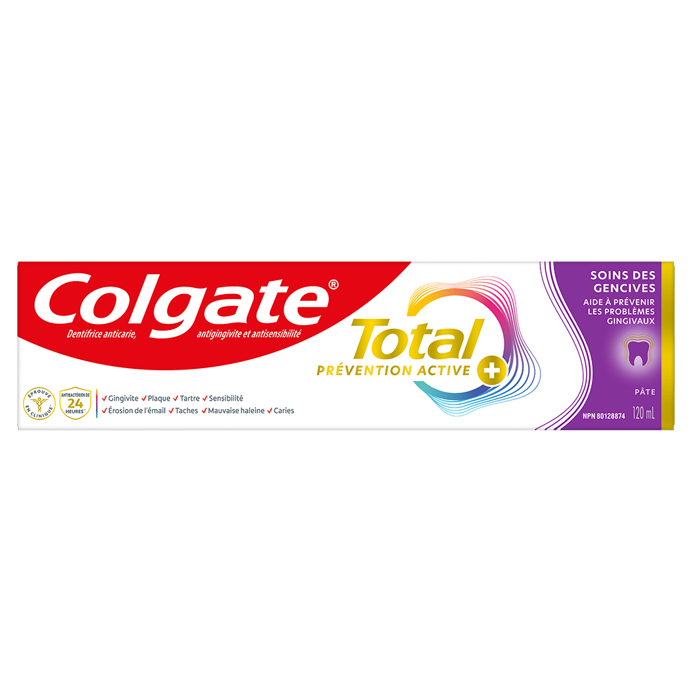 OS Walmart Bullet 1 Includes one (1) 120 mL tube of Colgate Total Active Prevention Plus Gum Care Toothpaste OS Walmart Bullet 2 This gum toothpaste for bleeding gums uses an advanced formula to help prevent gum bleeding and gum inflammation OS Walmart Bullet 3 Helps fight the root cause of common oral health problems such as cavities, gingivitis, plaque, enamel erosion, sensitivity, and tartar OS Walmart Bullet 4 This fluoride toothpaste developed by experts is formulated with additional fluoride to protect against cavities OS Walmart Bullet 5 To help protect your teeth from sensitivity, plaque, gingivitis, and tartar, use Colgate Total Active Prevention Plus Gum Care Toothpaste OS Walmart Bullet 6 New Colgate Total fights the root cause of common oral health issues such as cavities, gingivitis, plaque, enamel erosion, sensitivity and tartar OS Walmart Bullet 7 Proactive prevention against cavities, sensitivity, plaque, tartar, gingivitis Walmart Bullet 1 Includes one (1) 120 mL tube of Colgate Total Active Prevention Plus Gum Care Toothpaste Walmart Bullet 2 This gum toothpaste for bleeding gums uses an advanced formula to help prevent gum bleeding and gum inflammation Walmart Bullet 3 Helps fight the root cause of common oral health problems such as cavities, gingivitis, plaque, enamel erosion, sensitivity, and tartar Walmart Bullet 4 This fluoride toothpaste developed by experts is formulated with additional fluoride to protect against cavities Walmart Bullet 5 To help protect your teeth from sensitivity, plaque, gingivitis, and tartar, use Colgate Total Active Prevention Plus Gum Care Toothpaste OS Loblaws Product Title Total Active Prevention Plus Gum Care Toothpaste, Mint OS Loblaws Product Description Help prevent common oral care problems* before they start with Colgate Total Active Prevention Plus Gum Care Toothpaste. This gum toothpaste uses an advanced formula to help prevent gum bleeding and gum inflammation. Plus, this anticavity toothpaste fights the root cause of cavities, gingivitis, plaque, enamel erosion, sensitivity, and tartar. Colgate Total Active Prevention Plus Gum Care Toothpaste is clinically proven to reduce gum inflammation. Help prevent gum problems like gingivitis, gum bleeding, and gum inflammation using this toothpaste for bleeding gums. To help prevent sensitivity, plaque, gingivitis, and tartar, choose Colgate Total Active Prevention Plus Gum Care Toothpaste. *such as cavities and gingivitis OS Loblaws Bullet 1 Includes one (1) 120 mL tube of Colgate Total Active Prevention Plus Gum Care Toothpaste OS Loblaws Bullet 2 This gum toothpaste for bleeding gums uses an advanced formula to help prevent gum bleeding and gum inflammation OS Loblaws Bullet 3 New Colgate Total fights the root cause of common oral health issues such as cavities, gingivitis, plaque, enamel erosion, sensitivity and tartar OS Loblaws Bullet 4 Proactive prevention against cavities, sensitivity, plaque, tartar, gingivitis OS Loblaws Bullet 5 To help protect your teeth from sensitivity, plaque, gingivitis, and tartar, use Colgate Total Active Prevention Plus Gum Care Toothpaste