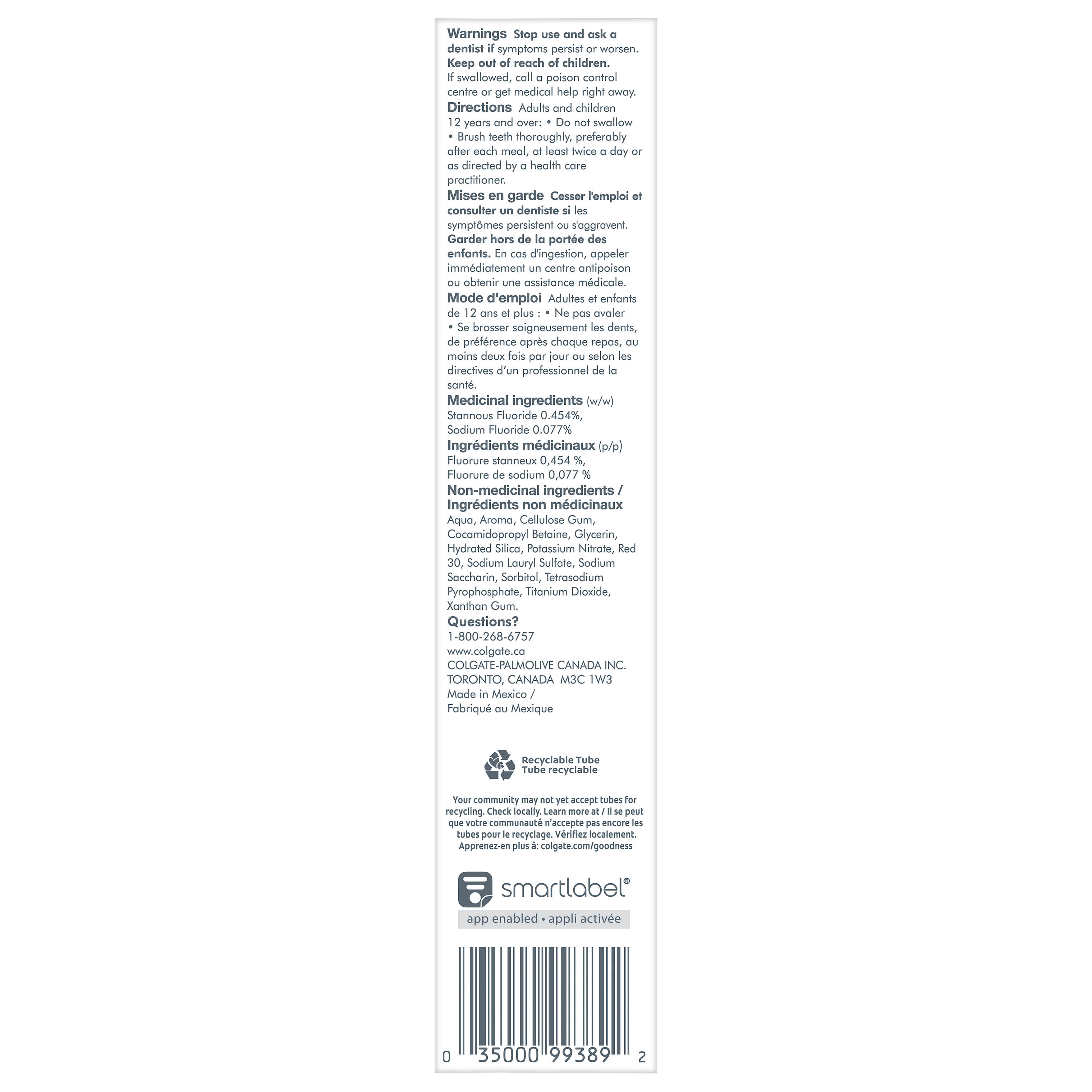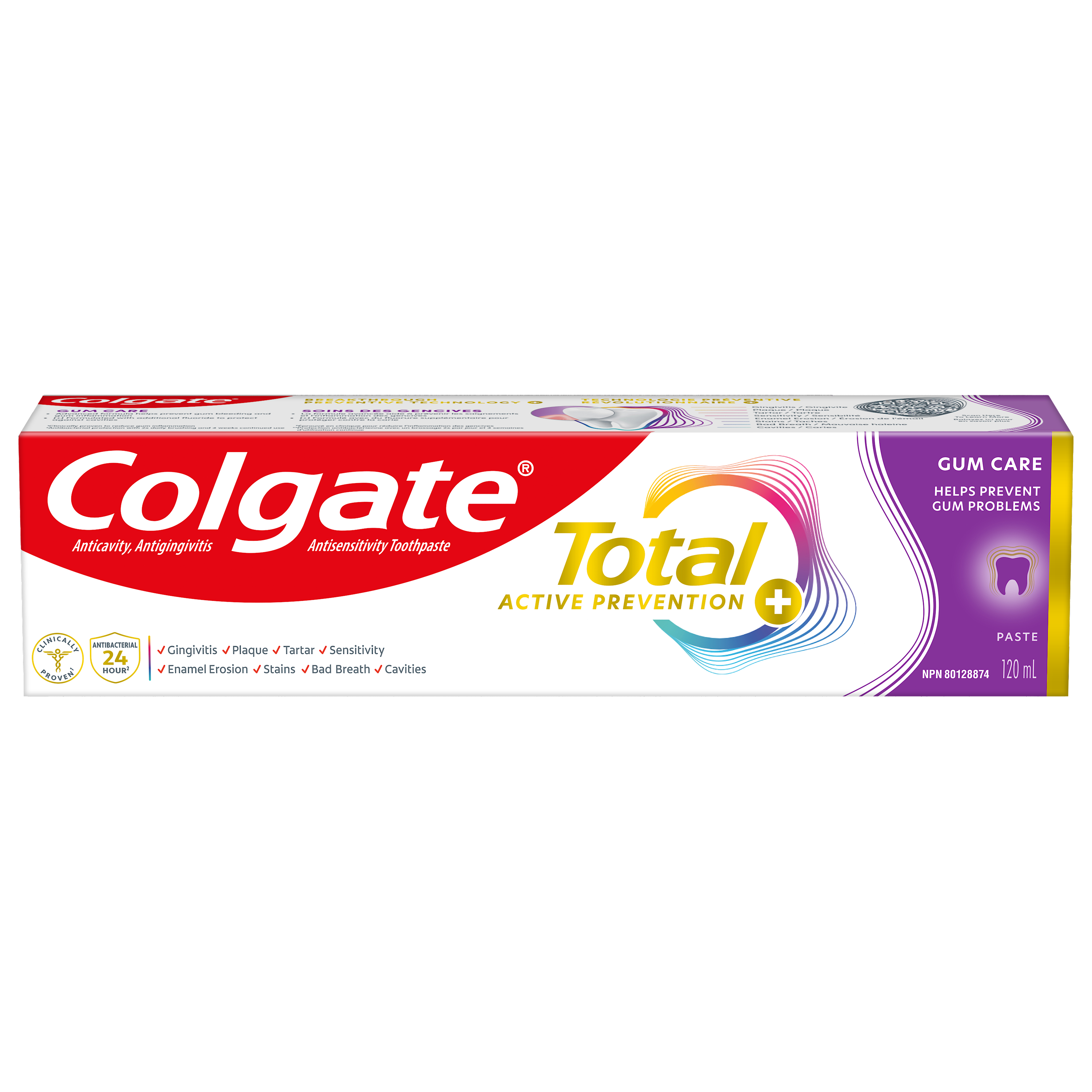 Product Title Colgate Total Active Prevention Plus Gum Care Toothpaste, Mint Flavour, 120 mL SKU 61044259 SKU eCommerce Name Colgate Total Active Prevention Plus Gum Care Toothpaste, Mint Flavour, 120 mL Consumer Unit - GTIN 00035000993892 Case - GTIN 10035000993899 Product Category Oral Care Product Sub Category Toothpaste Brand Colgate Product Sub Brand Colgate Total TP Consumer Unit Gross Weight 0.187 KG / 0.412 LB Consumer Unit Net Weight 0.158 KG / 0.348 LB Consumer Unit Length 41.000 MM / 1.614 IN Consumer Unit Width 196.000 MM / 7.717 IN Consumer Unit Height 50.000 MM / 1.969 IN Consumer Unit Volume 0.402 C8 / 0.014 CF Product Title Colgate Total Active Prevention Plus Gum Care Toothpaste, Mint Flavour, 120 mL Product Description Help prevent common oral care problems* before they start with Colgate Total Active Prevention Plus Gum Care Toothpaste. This gum toothpaste uses an advanced formula to help prevent gum bleeding and gum inflammation. Plus, this anticavity toothpaste fights the root cause of cavities, gingivitis, plaque, enamel erosion, sensitivity, and tartar. Colgate Total Active Prevention Plus Gum Care Toothpaste is clinically proven to reduce gum inflammation. This fluoride toothpaste developed by experts is also formulated with additional fluoride to protect against cavities. Help prevent gum problems like gingivitis, gum bleeding, and gum inflammation using this toothpaste for bleeding gums. To help prevent sensitivity, plaque, gingivitis, and tartar, choose Colgate Total Active Prevention Plus Gum Care Toothpaste. Feel secure knowing that Colgate Total Active Prevention Gum Care Toothpaste has your cavities, gingivitis, and sensitivity needs covered for a confident smile. *such as cavities and gingivitis eCommerce Copy <bulletlist><bullet>Includes one (1) 120 mL tube of Colgate Total Active Prevention Plus Gum Care Toothpaste</bullet> <bullet>This gum toothpaste for bleeding gums uses an advanced formula to help prevent gum bleeding and gum inflammation</bullet> <bullet>New Colgate Total fights the root cause of common oral health issues such as cavities, gingivitis, plaque, enamel erosion, sensitivity and tartar</bullet> <bullet>This fluoride toothpaste developed by experts is formulated with additional fluoride to protect against cavities</bullet> <bullet>For superior prevention** against sensitivity, plaque, gingivitis, and tartar, use this anticavity toothpaste (**vs. regular fluoride toothpaste)</bullet> <bullet>Proactive prevention against cavities, sensitivity, plaque, tartar, gingivitis</bullet></bulletlist> eCommerce Copy- Long Description Colgate Total Active Prevention Plus Gum Care Toothpaste, 120 mL