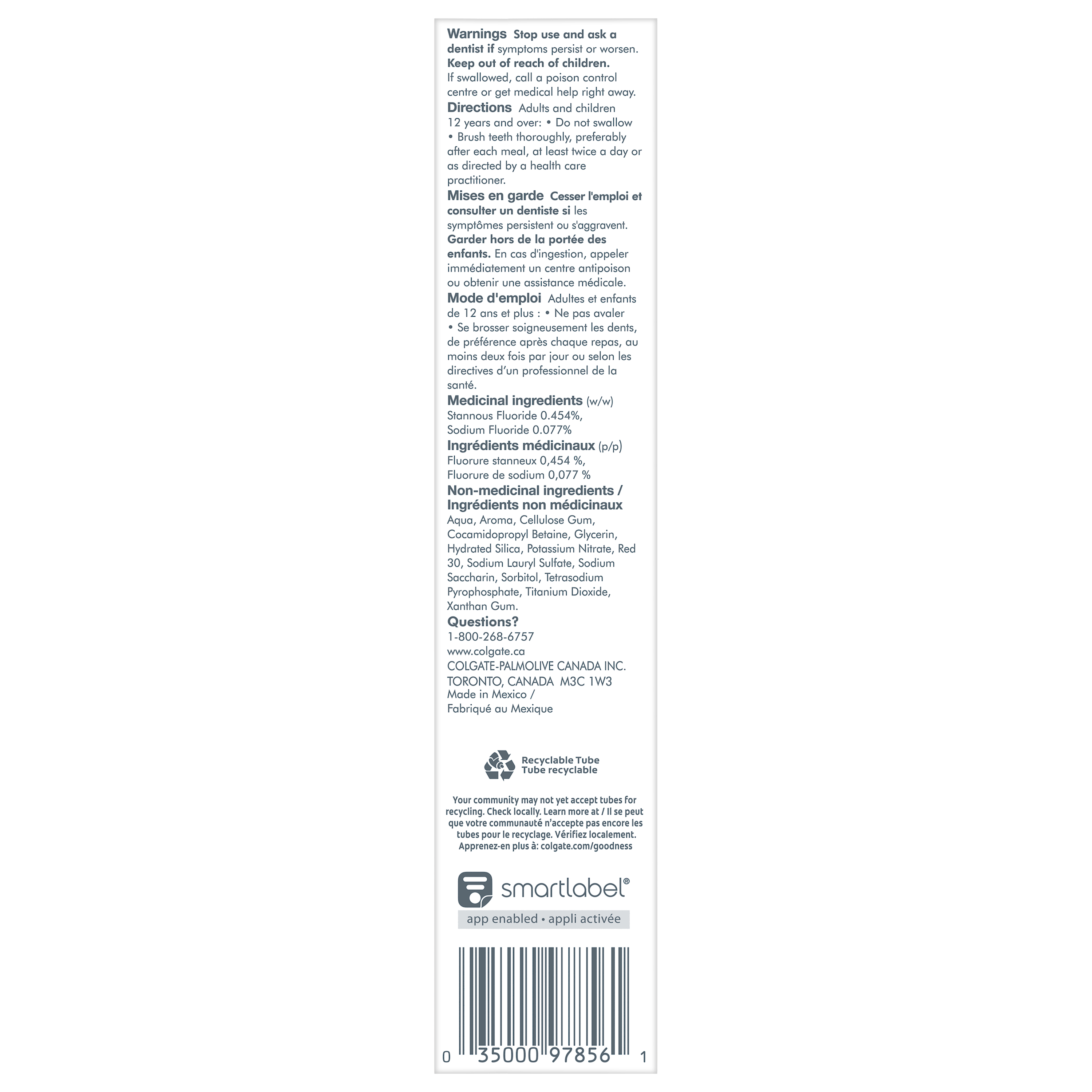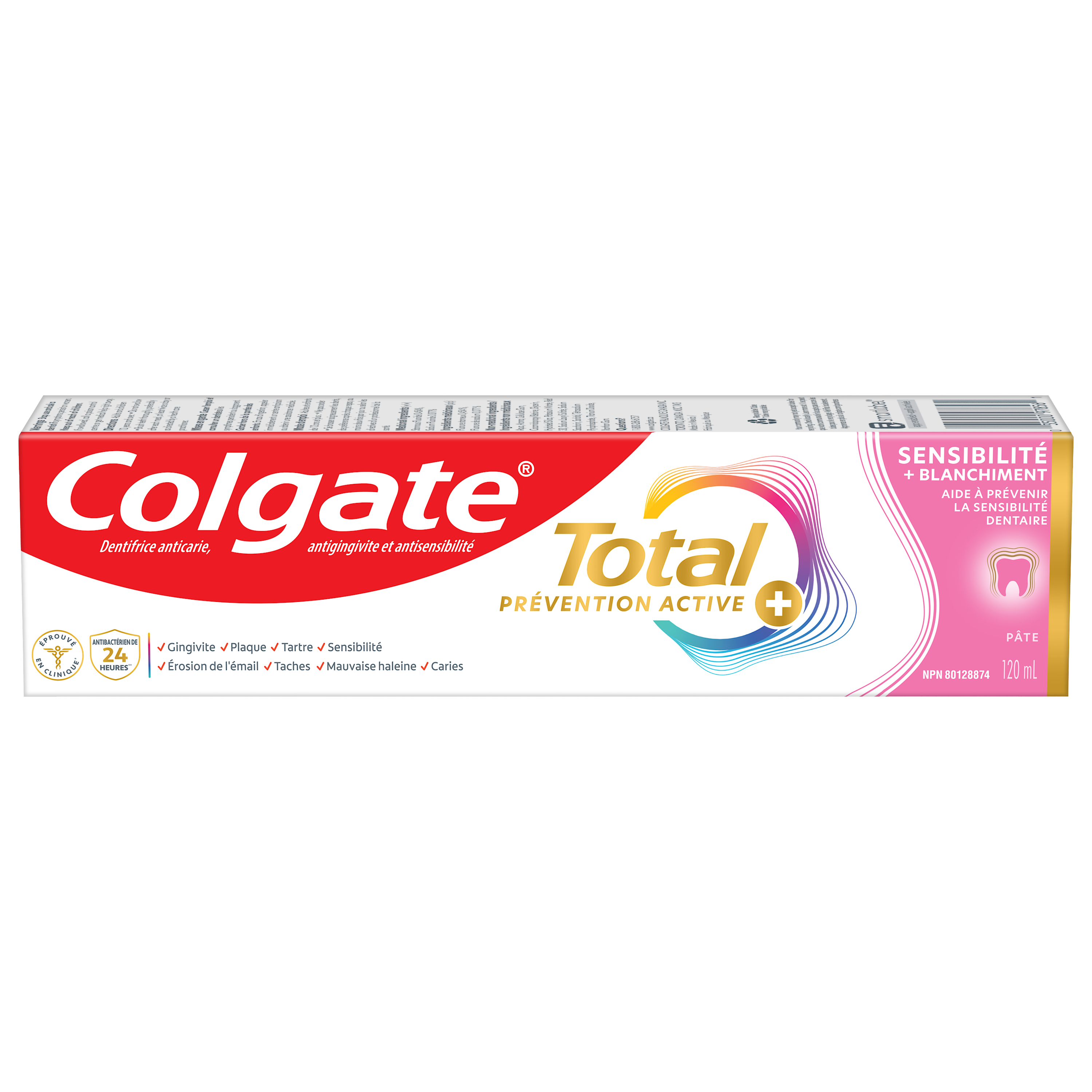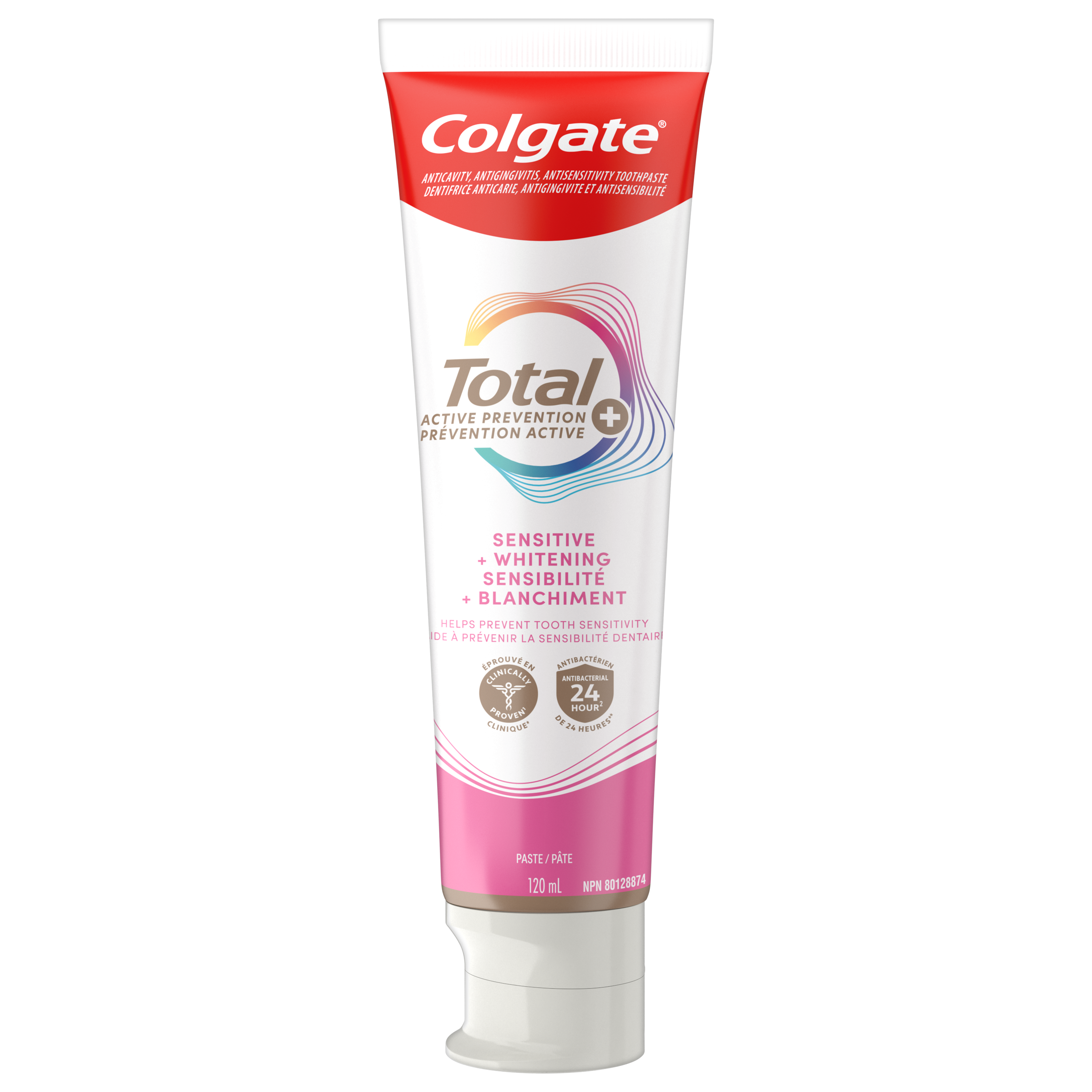 OS Walmart Bullet 1 Includes one (1) 120 mL tube of Colgate Total Active Prevention Plus Sensitive and Whitening Toothpaste OS Walmart Bullet 2 This toothpaste for sensitive teeth is clinically proven and starts working immediately to relieve and protect sensitive teeth within 1 day OS Walmart Bullet 3 Helps fight the root cause of common oral health issues including cavities, gingivitis, plaque, enamel erosion, sensitivity, and tartar OS Walmart Bullet 4 This fluoride toothpaste is formulated with additional fluoride to protect against cavities OS Walmart Bullet 5 Provide superior prevention and protection of your oral care health when you use this anticavity toothpaste twice daily with 4 weeks of continued use OS Walmart Bullet 6 New Colgate Total fights the root cause of common oral health issues such as cavities, gingivitis, plaque, enamel erosion, sensitivity and tartar OS Walmart Bullet 7 Proactive prevention against cavities, sensitivity, plaque, tartar, gingivitis Walmart Bullet 1 Includes one (1) 120 mL tube of Colgate Total Active Prevention Plus Sensitive and Whitening Toothpaste Walmart Bullet 2 This toothpaste for sensitive teeth is clinically proven and starts working immediately to relieve and protect sensitive teeth within 1 day Walmart Bullet 3 Helps fight the root cause of common oral health issues including cavities, gingivitis, plaque, enamel erosion, sensitivity, and tartar Walmart Bullet 4 This fluoride toothpaste is formulated with additional fluoride to protect against cavities Walmart Bullet 5 Provide superior prevention and protection of your oral care health when you use this anticavity toothpaste twice daily with 4 weeks of continued use OS Loblaws Product Title Colgate Total Active Prevention Sensitive Whitening Toothpaste, 120 mL OS Loblaws Product Description Help stop common oral health problems* before they start with Colgate Total Active Prevention Plus Sensitive and Whitening Toothpaste. This toothpaste offers clinically proven sensitivity relief and starts working immediately to relieve and protect sensitive teeth within 1 day. Plus, this anticavity toothpaste fights the root cause of common oral health issues including cavities, gingivitis, plaque, enamel erosion, sensitivity, and tartar for an overall healthier mouth**. This whitening fluoride toothpaste developed by experts is also formulated with additional fluoride to protect against cavities. Help prevent tooth sensitivity and freshen your breath with this mint toothpaste for sensitive teeth. *such as cavities and gingivitis **vs. a regular fluoride toothpaste OS Loblaws Bullet 1 Includes one (1) 120 mL tube of Colgate Total Active Prevention Plus Sensitive and Whitening Toothpaste OS Loblaws Bullet 2 This toothpaste for sensitive teeth is clinically proven and starts working immediately to relieve and protect sensitive teeth within 1 day OS Loblaws Bullet 3 New Colgate Total fights the root cause of common oral health issues such as cavities, gingivitis, plaque, enamel erosion, sensitivity and tartar OS Loblaws Bullet 4 Proactive prevention against cavities, sensitivity, plaque, tartar, gingivitis OS Loblaws Bullet 5 Provide superior prevention and protection of your oral care health when you use this anticavity toothpaste twice daily with 4 weeks of continued use