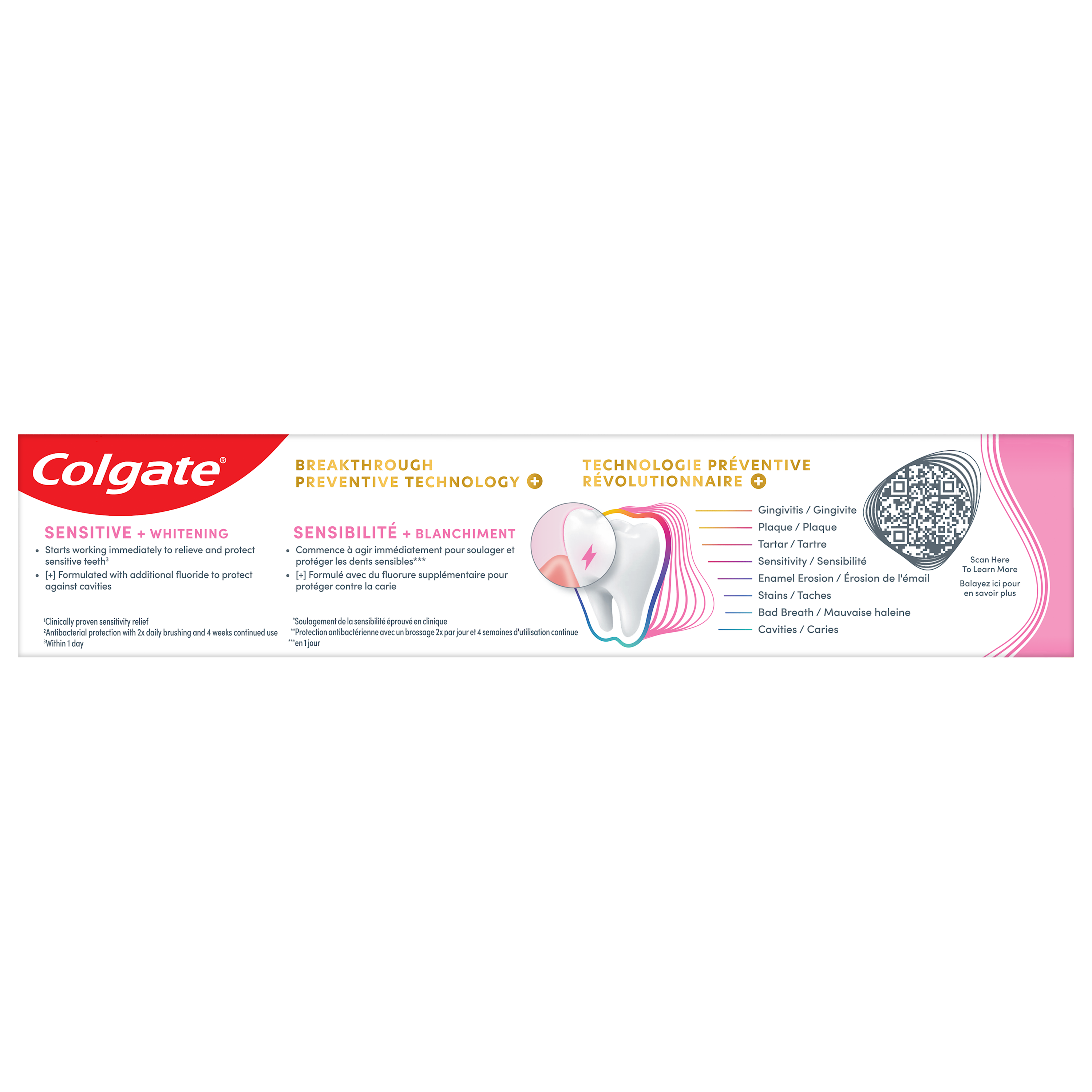 To help prevent sensitivity, plaque, gingivitis, and tartar, choose the Colgate Total Active Prevention Plus Sensitive and Whitening Toothpaste. Feel secure knowing that Colgate Total Active Prevention Plus Sensitive Toothpaste has your cavities, gingivitis, and sensitivity needs covered for a confident smile.