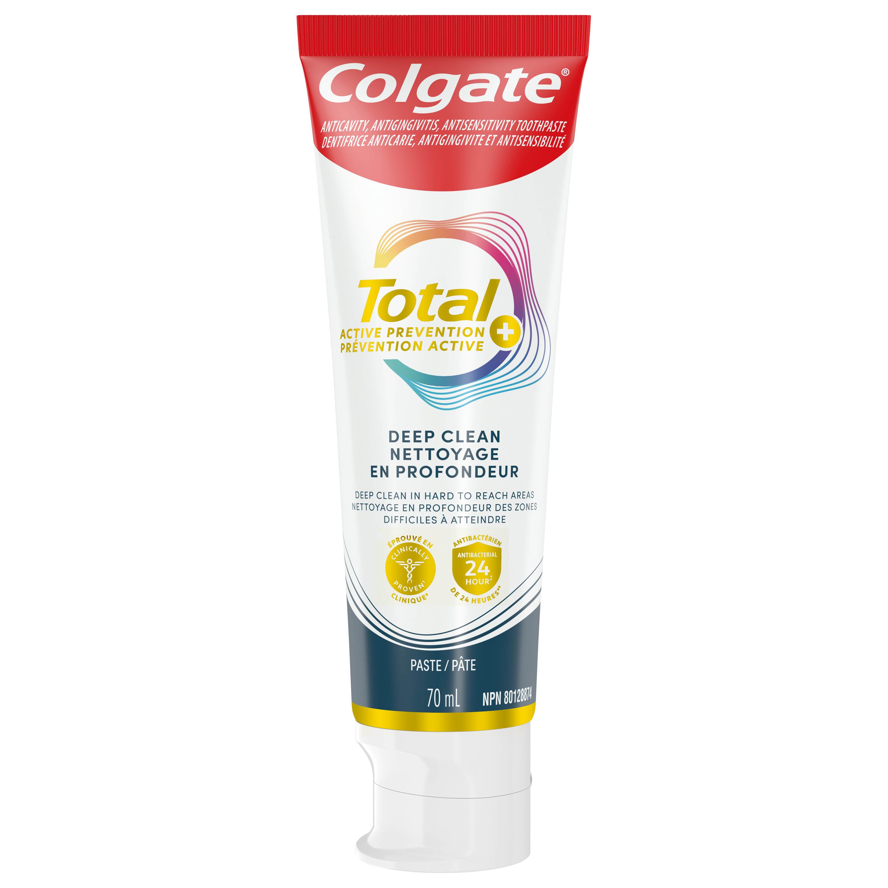 OS Walmart Bullet 1 Includes one (1) 70 mL tube of Colgate Total Active Prevention Plus Deep Clean Toothpaste OS Walmart Bullet 2 This deep cleaning mint toothpaste uses an active cleaning formula with micro particles to help fight plaque between teeth and hard-to-reach spaces OS Walmart Bullet 3 Helps fight the root cause of common oral health issues including cavities, gingivitis, plaque, enamel erosion, sensitivity, and tartar OS Walmart Bullet 4 This fluoride toothpaste developed by experts is formulated with additional fluoride to protect against cavities OS Walmart Bullet 5 Help prevent common oral care problems(1) before they start using Colgate Total Active Prevention Plus Deep Clean Toothpaste OS Walmart Bullet 6 New Colgate Total fights the root cause of common oral health issues such as cavities, gingivitis, plaque, enamel erosion, sensitivity and tartar OS Walmart Bullet 7 Proactive prevention against cavities, sensitivity, plaque, tartar, gingivitis Walmart Bullet 1 Includes one (1) 70 mL tube of Colgate Total Active Prevention Plus Deep Clean Toothpaste Walmart Bullet 2 This deep cleaning mint toothpaste uses an active cleaning formula with micro particles to help fight plaque between teeth and hard-to-reach spaces Walmart Bullet 3 Helps fight the root cause of common oral health issues including cavities, gingivitis, plaque, enamel erosion, sensitivity, and tartar Walmart Bullet 4 This fluoride toothpaste developed by experts is formulated with additional fluoride to protect against cavities Walmart Bullet 5 Help prevent common oral care problems* before they start using Colgate Total Active Prevention Plus Deep Clean Toothpaste OS Loblaws Product Title Total Active Prevention Plus Deep Clean Toothpaste, Mint OS Loblaws Product Description Help prevent common oral care problems* before they start with Colgate Total Active Prevention Plus Deep Clean Toothpaste. This fluoride toothpaste uses an active cleaning formula with micro particles to help fight plaque between teeth and hard-to-reach spaces. This fluoride toothpaste is also formulated with additional fluoride to protect against cavities. Plus, this toothpaste fights the root cause of cavities, gingivitis, plaque, enamel erosion, sensitivity, and tartar. Colgate Total Active Prevention Plus Deep Clean Toothpaste is clinically proven to help prevent plaque buildup. Help deep clean hard-to-reach areas and freshen your breath with this deep cleaning mint toothpaste. *such as cavities and gingivitis OS Loblaws Bullet 1 Includes one (1) 70 mL tube of Colgate Total Active Prevention Plus Deep Clean Toothpaste OS Loblaws Bullet 2 This deep cleaning mint toothpaste uses an active cleaning formula with micro particles to help fight plaque between teeth and hard-to-reach spaces OS Loblaws Bullet 3 New Colgate Total fights the root cause of common oral health issues such as cavities, gingivitis, plaque, enamel erosion, sensitivity and tartar OS Loblaws Bullet 4 Proactive prevention against cavities, sensitivity, plaque, tartar, gingivitis OS Loblaws Bullet 5 Help prevent common oral care problems* before they start using Colgate Total Active Prevention Plus Deep Clean Toothpaste