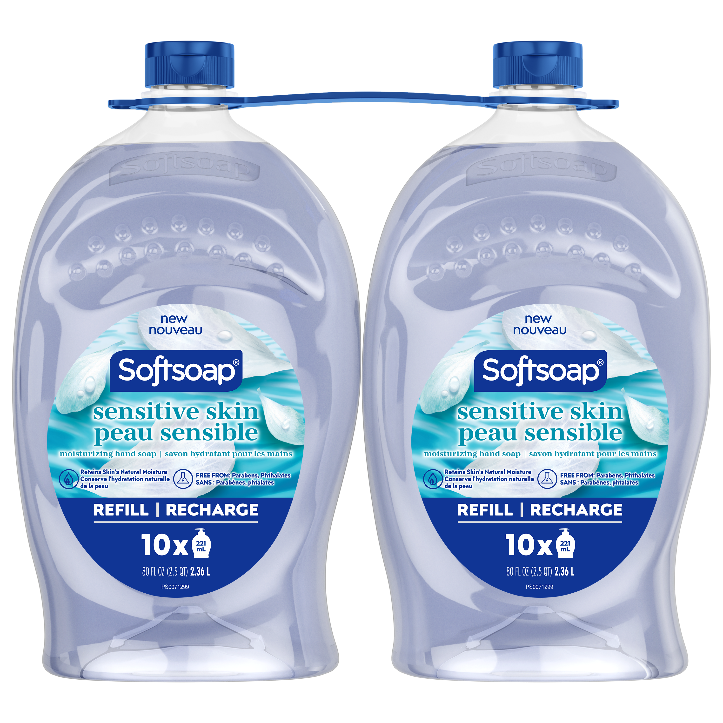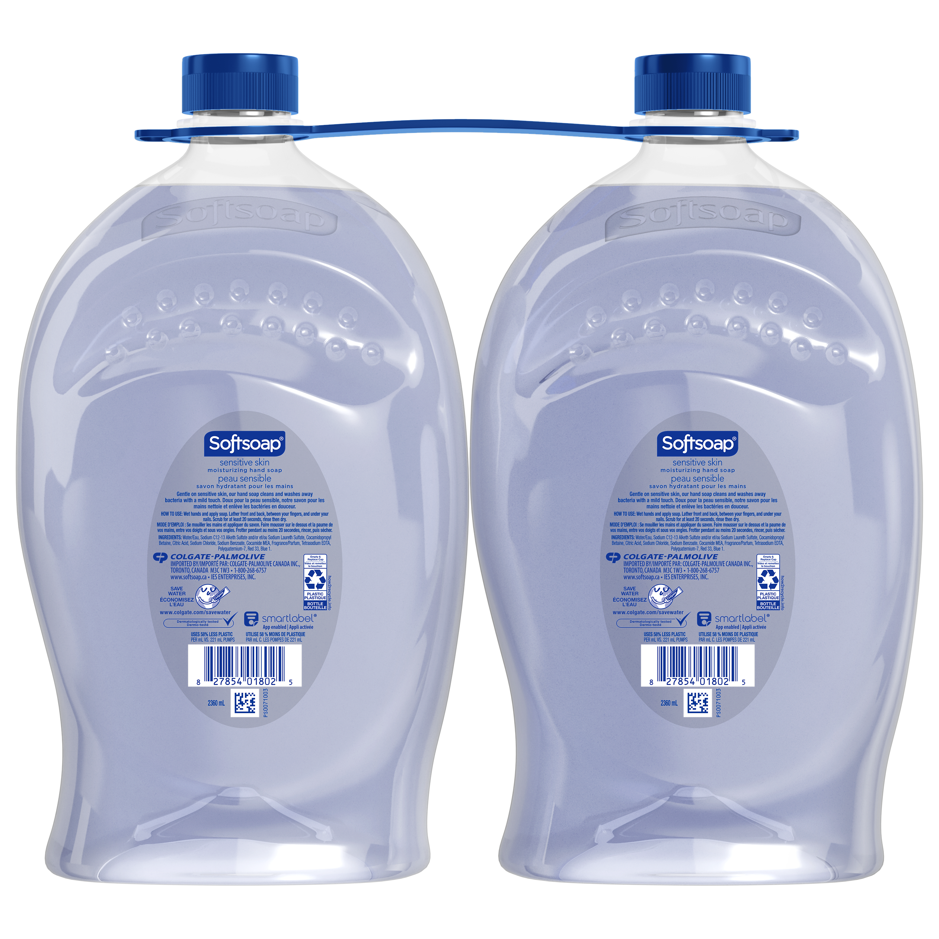 Product Title Softsoap Sensitive Skin Liquid Hand Soap Refill Bottle, Moisturizing Hand Soap, 2 Pack, 2.36 L SKU 61044859 SKU eCommerce Name Softsoap Sensitive Skin Liquid Hand Soap Refill Bottle, Moisturizing Hand Soap, 2 Pack, 2.36 L Consumer Unit - GTIN 00827854018025 Product Category Personal Care Product Sub Category Liquid Hand Wash Brand Softsoap Product Sub Brand Softsoap LHW Consumer Unit Gross Weight 4.826 KG / 10.641 LB Consumer Unit Net Weight 4.826 KG / 10.641 LB Consumer Unit Length 239.000 MM / 9.409 IN Consumer Unit Width 138.000 MM / 5.433 IN Consumer Unit Height 242.000 MM / 9.528 IN Consumer Unit Volume 7.982 C8 / 0.282 CF Product Title Softsoap Sensitive Skin Liquid Hand Soap Refill Bottle, Moisturizing Hand Soap, 2 Pack, 2.36 L Product Description From Canada’s #1 liquid hand soap brand (1) comes Softsoap Sensitive Skin liquid hand soap. Gentle on sensitive skin, our hand soap cleans and washes away bacteria with a mild touch. Two 2.36 L of liquid hand soap refill bottles are included in this package so you can have fresh scents on hand when you need a refill. Each refill bottle holds enough liquid to refill a standard 221 mL liquid hand soap pump bottle 10x. Whether you use them to restock your kitchen hand soap bottle or your bathroom soap bottles, Softsoap Sensitive Skin Hand Soap is a delightful way to enjoy a light, fresh scent. This dermatologically tested and pH balanced hand soap washes away bacteria, helps retain skin’s natural moisture, and is paraben-free and formulated without phthalates. Health care agencies recommend washing hands with soap and clean running water for 20 seconds to wash away dirt and bacteria. These refreshing liquid hand soap refill bottles are great for the kitchen, bathroom, or anywhere else you want to add a touch of freshness to your routine. (1) Based in part on data reported by Nielsen through its Market Track Service for the Liquid Hand Soap Category for the 52 week period ending 31/7/24, for the All Outlet market. Copyright © 2024 Nielsen. Bullet 1 Two 2.36 liter refill bottles of Softsoap Sensitive Skin Liquid Hand Soap Bullet 2 Each refill bottle holds enough hand soap to refill a standard 221 mL liquid hand soap pump bottle 10x Bullet 3 Gentle on sensitive skin, our hand soap cleans and washes away bacteria with a mild touch Bullet 4 Canada’s #1 Liquid Hand Soap Brand (1) Bullet 5 Dermatologically tested hand soap formula helps retain skin’s natural moisture Bullet 6 Paraben-free and formulated without phthalates with a gentle scent for sensitive skin Walmart Bullet 1 Two 2.36 liter refill bottles of Softsoap Sensitive Skin Liquid Hand Soap Walmart Bullet 2 Each refill bottle holds enough hand soap to refill a standard 221 mL liquid hand soap pump bottle 10x Walmart Bullet 3 Gentle on sensitive skin, our hand soap cleans and washes away bacteria with a mild touch Walmart Bullet 4 Canada’s #1 Liquid Hand Soap Brand (1) Walmart Bullet 5 Dermatologically tested hand soap formula helps retain skin’s natural moisture Walmart Bullet 6 Paraben-free and formulated without phthalates with a gentle scent for sensitive skin Walmart Bullet 7 Versatile liquid hand wash soap refill bottles for the kitchen, bathroom or any other space Walmart Bullet 9 Suitable for all ages and all skin types.