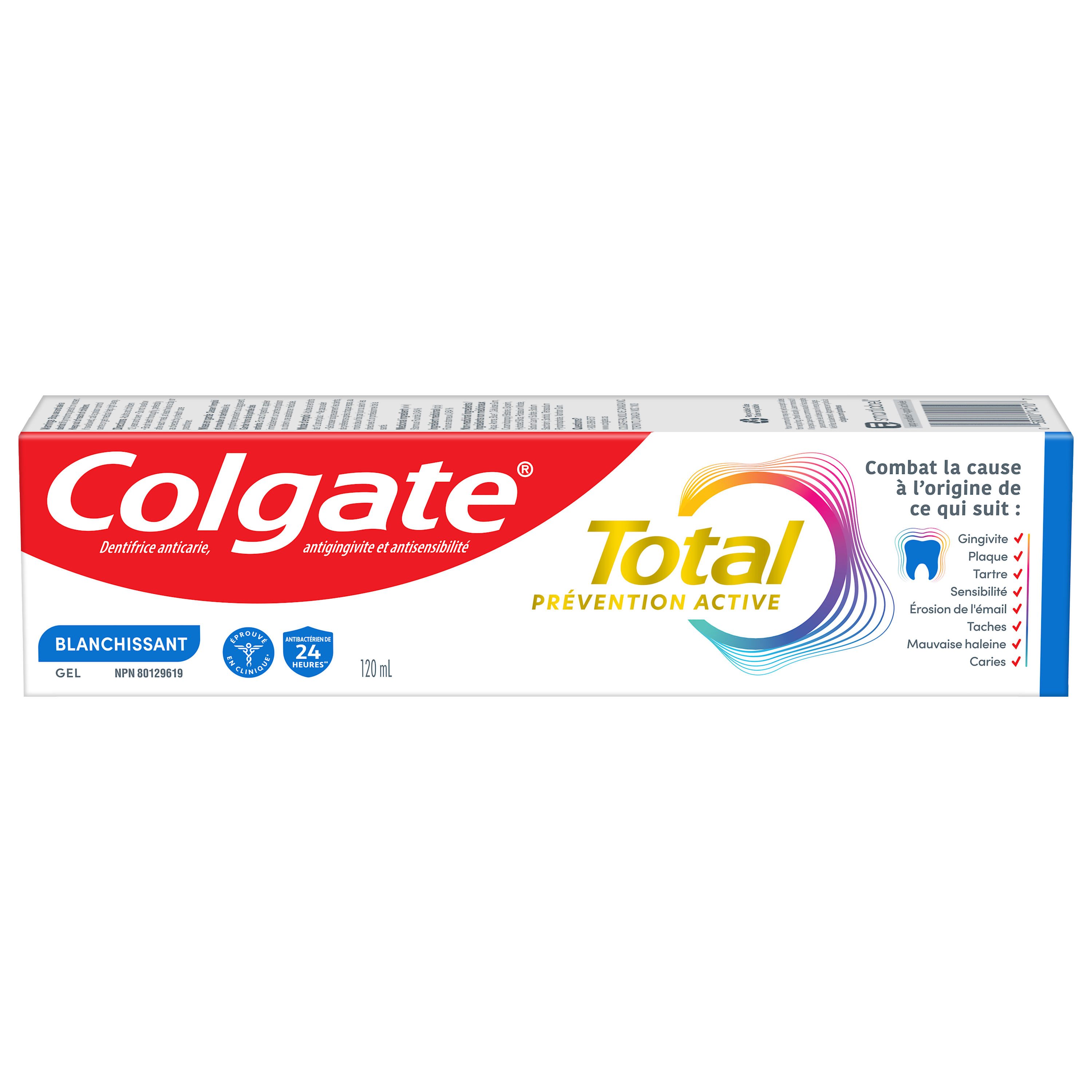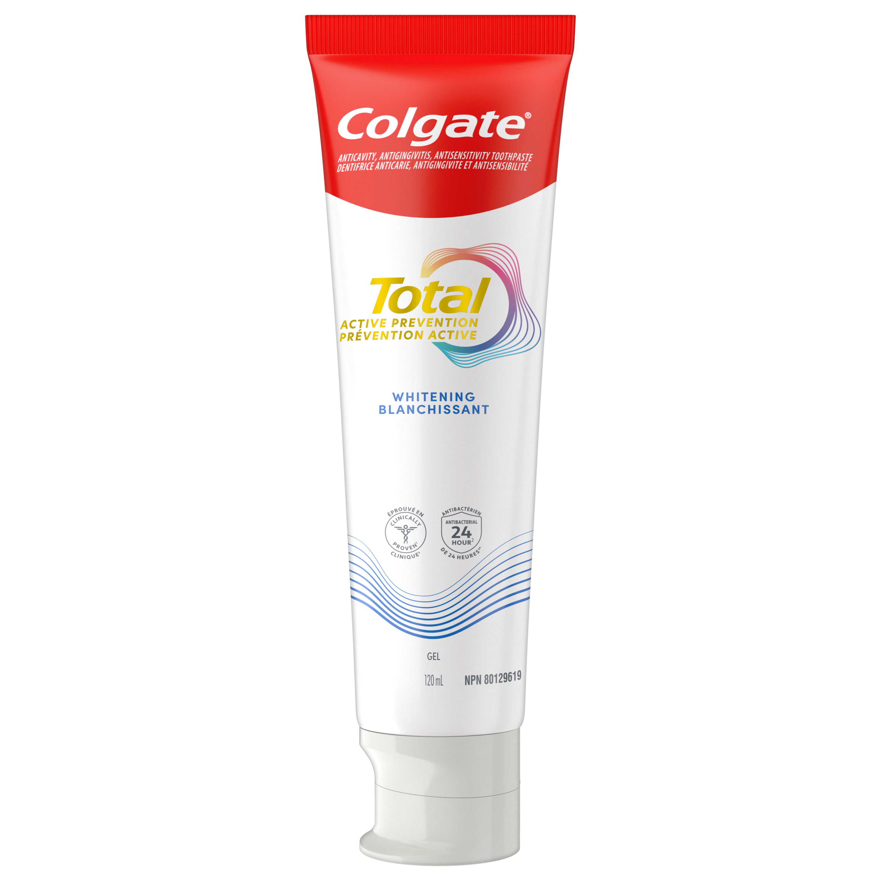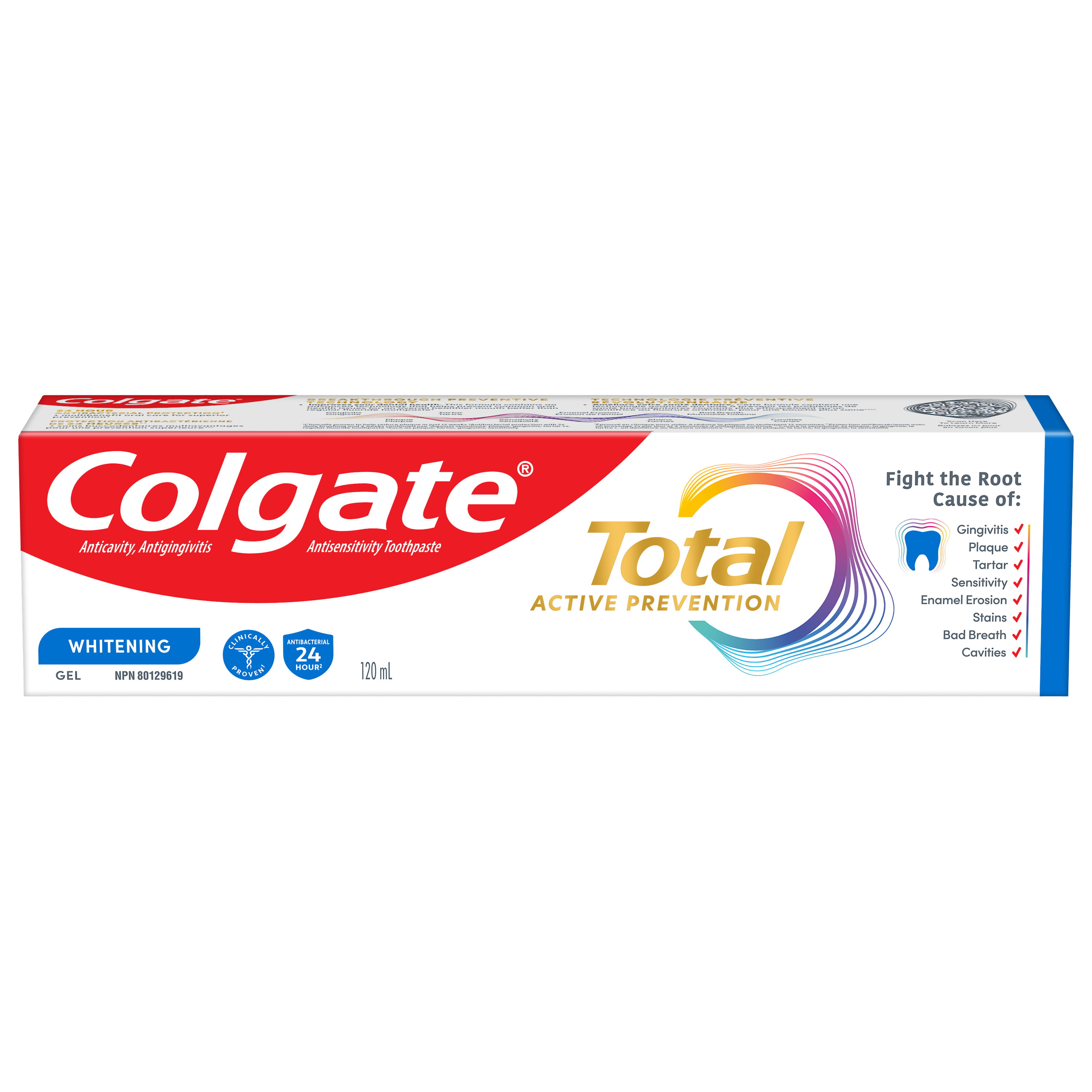 OS Walmart Bullet 1 Includes one (1) 120 mL tube of Colgate Total Active Prevention Whitening Toothpaste Gel OS Walmart Bullet 2 Helps fight the root cause of common oral health issues like cavities, stains, gingivitis, bad breath, plaque, enamel erosion, sensitivity, and tartar OS Walmart Bullet 3 This fluoride toothpaste is clinically proven to help reduce plaque in just 12 weeks OS Walmart Bullet 4 The whitening gel toothpaste formula helps freshen breath and whitens teeth OS Walmart Bullet 5 For superior prevention(2) against sensitivity, plaque, gingivitis, and tartar, use Colgate Total Active Prevention Whitening Anticavity Toothpaste OS Walmart Bullet 6 New Colgate Total fights the root cause of common oral health issues such as cavities, gingivitis, plaque, enamel erosion, sensitivity and tartar OS Walmart Bullet 7 Proactive prevention against cavities, sensitivity, plaque, tartar, gingivitis OS Walmart Bullet 8 Multibenefit Oral Care for superior prevention against sensitivity, plaque, gingivitis, tartar vs. regular fluoride toothpaste Walmart Bullet 1 Includes one (1) 120 mL tube of Colgate Total Active Prevention Whitening Toothpaste Gel Walmart Bullet 2 Helps fight the root cause of common oral health issues like cavities, stains, gingivitis, bad breath, plaque, enamel erosion, sensitivity, and tartar Walmart Bullet 3 This fluoride toothpaste is clinically proven to help reduce plaque in just 12 weeks Walmart Bullet 4 The whitening gel toothpaste formula helps freshen breath and whitens teeth Walmart Bullet 5 For superior prevention** against sensitivity, plaque, gingivitis, and tartar, use Colgate Total Active Prevention Whitening Anticavity Toothpaste OS Loblaws Product Title Total Active Prevention Whitening Toothpaste Gel, Mint OS Loblaws Product Description Help prevent common oral health problems* before they start with Colgate Total Active Prevention Whitening Toothpaste Gel. This anticavity toothpaste gel fights the root cause of cavities, stains, gingivitis, bad breath, plaque, enamel erosion, sensitivity, and tartar. Colgate Total Active Prevention Whitening Toothpaste uses a clinically proven and advanced formula, backed by science, to help reduce plaque in just 12 weeks. Plus this whitening mint toothpaste helps with bad breath and helps whiten teeth. For superior prevention** against sensitivity, plaque, gingivitis, and tartar, choose the Colgate Total Active Prevention Whitening Anticavity Toothpaste. *such as plaque, tartar, gingivitis, sensitivity **vs. a regular fluoride toothpaste OS Loblaws Bullet 1 Includes one (1) 120 mL tube of Colgate Total Active Prevention Whitening Toothpaste Gel OS Loblaws Bullet 2 Helps fight the root cause of common oral health issues like cavities, stains, gingivitis, bad breath, plaque, enamel erosion, sensitivity, and tartar OS Loblaws Bullet 3 New Colgate Total fights the root cause of common oral health issues such as cavities, gingivitis, plaque, enamel erosion, sensitivity and tartar OS Loblaws Bullet 4 Proactive prevention against cavities, sensitivity, plaque, tartar, gingivitis OS Loblaws Bullet 5 Multibenefit Oral Care for superior prevention against sensitivity, plaque, gingivitis, tartar vs. regular fluoride toothpaste