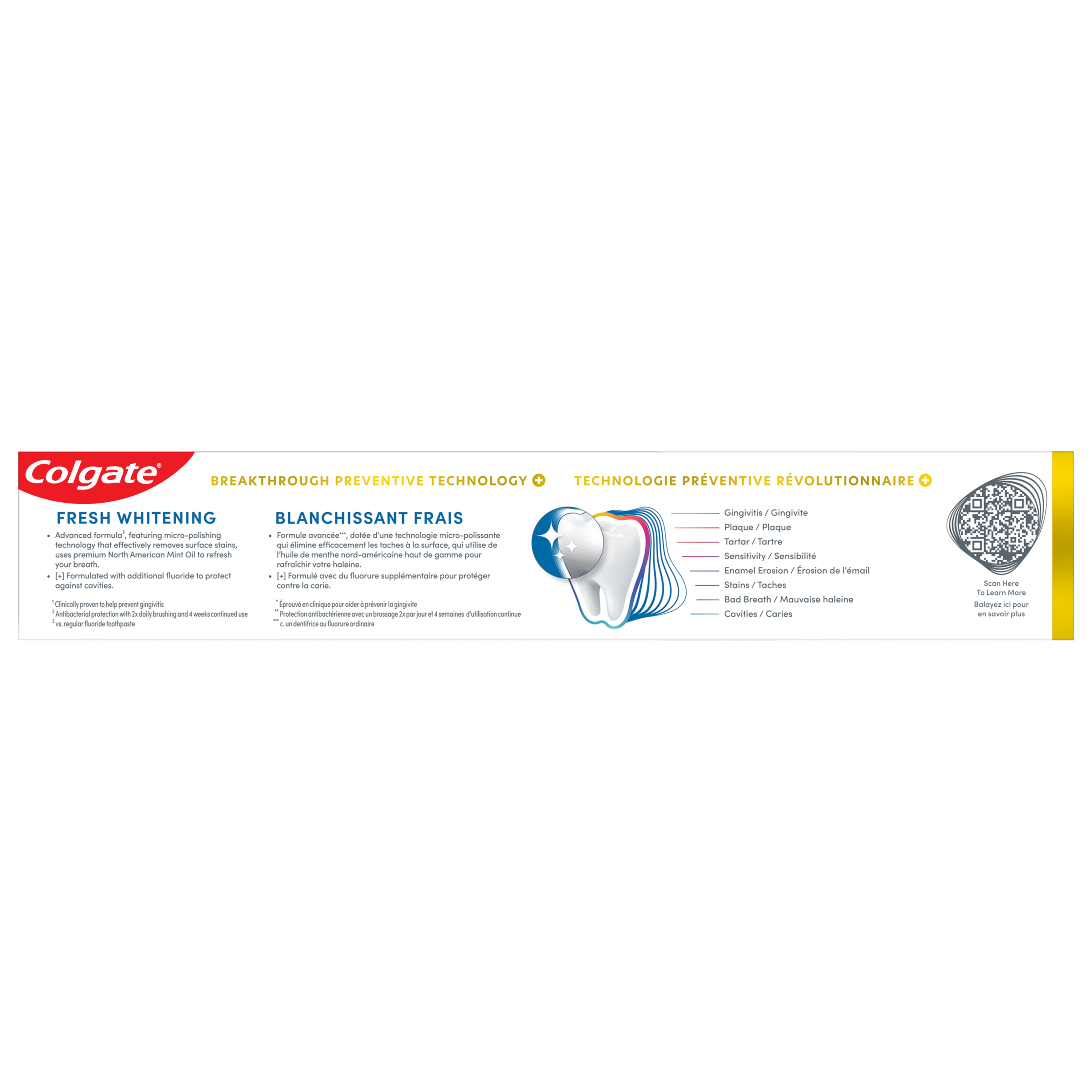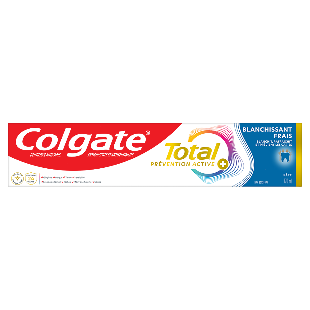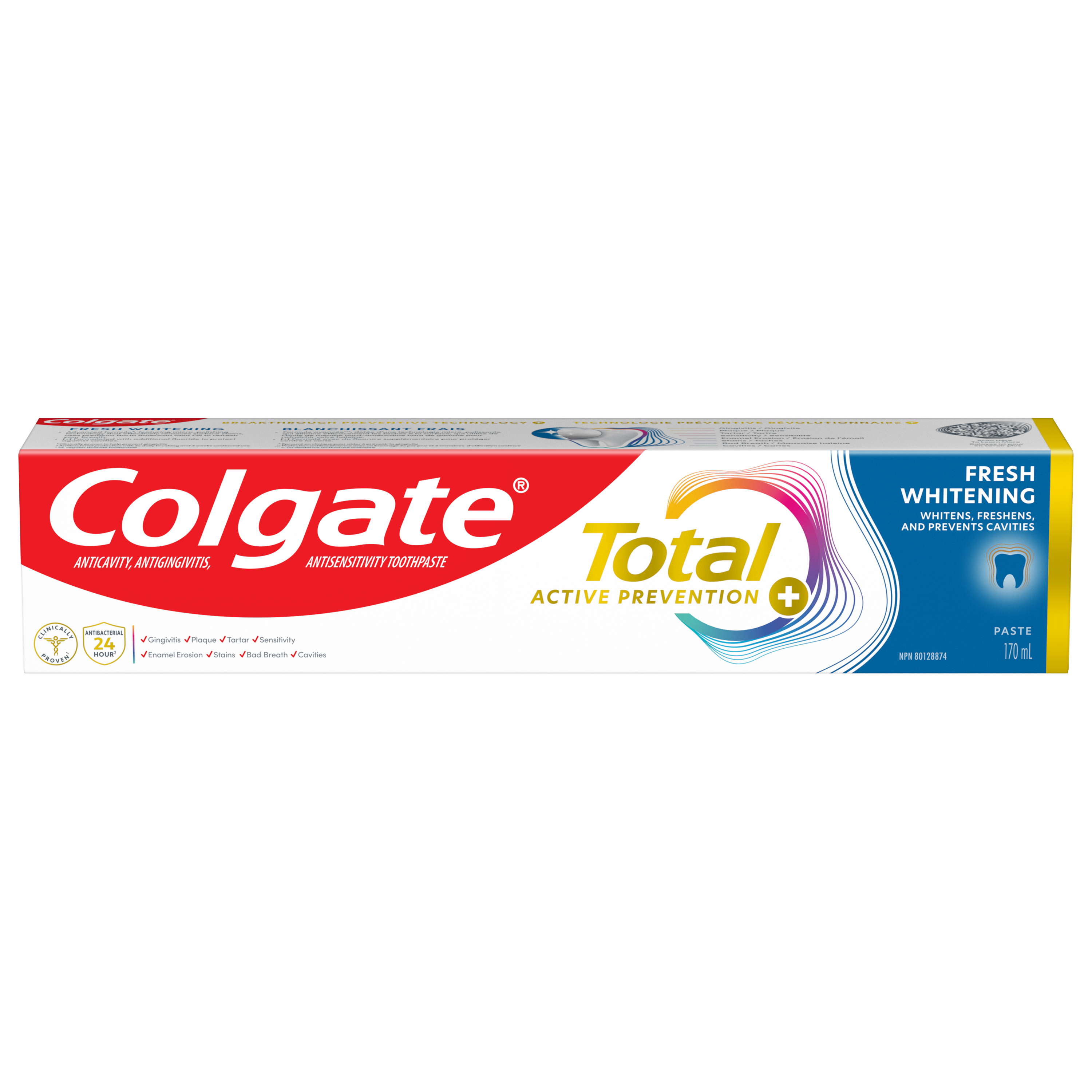 Product Title Colgate Total Active Prevention Plus Fresh Whitening Toothpaste, Mint Flavour, 170mL SKU 61045447 SKU eCommerce Name Colgate Total Active Prevention Plus Fresh Whitening Toothpaste, Mint Flavour, 170mL Consumer Unit - GTIN 00827854018551 Case - GTIN 10827854018541 Product Category Oral Care Product Sub Category Toothpaste Brand Colgate Product Sub Brand Colgate Total TP Consumer Unit Gross Weight 0.263 KG / 0.580 LB Consumer Unit Net Weight 0.224 KG / 0.494 LB Consumer Unit Length 42.000 MM / 1.654 IN Consumer Unit Width 232.000 MM / 9.134 IN Consumer Unit Height 51.000 MM / 2.008 IN Consumer Unit Volume 0.497 C8 / 0.018 CF Product Title Colgate Total Active Prevention Plus Fresh Whitening Toothpaste, Mint Flavour, 170mL eCommerce Copy <bulletlist><bullet>Includes one (1) 170 mL tubes of Colgate Total Active Prevention Plus Fresh Whitening Toothpaste</bullet> <bullet>New Colgate Total fights the root cause of common oral health issues such as cavities, gingivitis, plaque, enamel erosion, sensitivity and tartar</bullet> <bullet>This whitening fluoride toothpaste offers 24 hour antibacterial protection** (**with 2x daily brushing and 4 weeks continued use)</bullet> <bullet>This mint toothpaste pack helps freshen breath and is also formulated with additional fluoride to protect against cavities</bullet> <bullet>Help prevent common oral care problems* before they start with this whitening toothpaste pack (*such as cavities and gingivitis)</bullet> <bullet>Proactive prevention against cavities, sensitivity, plaque, tartar, gingivitis</bullet></bulletlist> eCommerce Copy- Long Description Help prevent common oral care problems* before they start with Colgate Total Active Prevention Plus Fresh Whitening Toothpaste. This whitening fluoride toothpaste uses fluoride to help prevent cavities and also helps whiten teeth and freshen breath. This mint toothpaste developed by experts is also formulated with additional fluoride to protect against cavities. Feel secure knowing that Colgate Total Active Prevention Plus Fresh Whitening Anticavity Toothpaste has your cavities, gingivitis, and sensitivity needs covered for a confident smile.