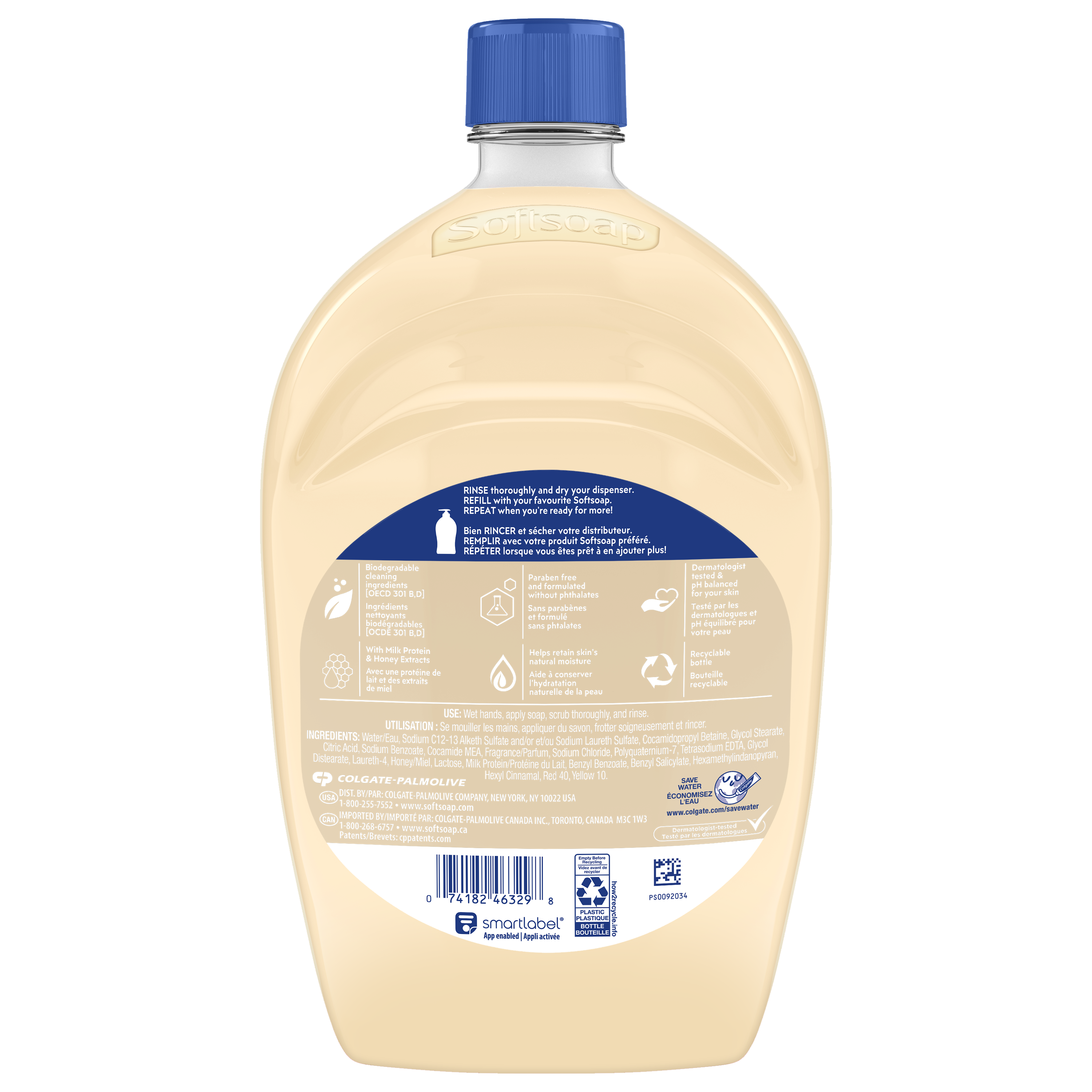 Product Title Softsoap Moisturizing Liquid Hand Soap Refill, Milk & Golden Honey - 1.47 L SKU 61046110 SKU eCommerce Name Softsoap Moisturizing Liquid Hand Soap Refill, Milk & Golden Honey - 1.47 L Consumer Unit - GTIN 00074182463298 Case - GTIN 10827854019364 Product Category Personal Care Product Sub Category Liquid Hand Wash Brand Softsoap Product Sub Brand Softsoap LHW Consumer Unit Gross Weight 1.574 KG / 3.471 LB Consumer Unit Net Weight 1.508 KG / 3.325 LB Consumer Unit Length 79.000 MM / 3.110 IN Consumer Unit Width 143.000 MM / 5.630 IN Consumer Unit Height 239.000 MM / 9.409 IN Consumer Unit Volume 2.700 C8 / 0.095 CF Product Title Softsoap Moisturizing Liquid Hand Soap Refill, Milk & Golden Honey - 1.47 L eCommerce Copy Softsoap Moisturizing Liquid Hand Soap, Milk & Golden Honey, helps leave your hands feeling soft and smooth. Indulge in an unforgettable hand washing experience with milk protein and honey extracts. Bring a moment of joy to your day. eCommerce Copy- Long Description From the #1 liquid hand soap* brand comes a moisturizing hand soap refill in a Milk & Honey scent, that will leave your skin feeling soft and smooth.This 1.47 L bottle refills over six 221 mL bottles. This liquid hand soap effectively washes away bacteria for clean and fresh hands. Feel the joy of clean with Softsoap hand soap! *Based in part on data reported by Nielsen through its Market Track Service for the Liquid Hand Soap Category for the 52 week period ending 1/1/22, for the All Outlet market. Copyright © 2022 Nielsen. Great Clean. For Everyone. Confidently wash your hands with Softsoap while enjoying fragrant scents and fun labels that will bring you joy. For everyone, every mood, and every sink, Softsoap hand soap is designed to make you feel joyfully clean. Use Softsoap Milk & Honey liquid hand soap in the bathroom or the kitchen to uplift every small moment while keeping your hands clean. Feel Good About Washing Your Hands This liquid hand soap washes away bacteria and is an effective way to keep hands clean. Plus, this liquid soap is paraben free and formulated without phthalates, uses 48% less plastic* and retains skin’s natural moisture, so you can feel good about washing your hands. *per mL vs. 221 mL pumps Feel the Joy of Clean We believe that the little moments throughout your day should be fun! With delightful bubbles and fragrant scents, every trip to the sink and every shower leaves you feeling uplifted. Enjoy those small moments of joy, get brilliantly clean with our liquid hand soaps and body washes—now, you’re ready to take on the world! Keywords (eCommerce) handsoap, hand wash, best, hydrating, nice smell, protection, colds, virus, sensitive skin, allergies, non-irritating, bar soap, non-drying, easy rinse, illness, infection, lather, environmentally friendly, value, quality, premium, safe, children, kids, schools, fresh scent, lightly scented, milk, golden honey, moisturizing Walmart Bullet 1 One 50 fl oz refill bottle of Softsoap Moisturizing Liquid Hand Soap with new easy pour spout, Milk & Honey Scent Walmart Bullet 2 Softsoap is the #1 liquid hand soap brand (1) Walmart Bullet 3 This liquid hand soap is formulated with extracts of milk protein and sweet honey Walmart Bullet 4 Our hand soap refill is mess free making it versatile to use in the bathroom or as a kitchen hand soap Walmart Bullet 5 Proudly formulated without parabens or phthalates, this dermatologist-tested hand soap will keep your hands clean and fresh Walmart Bullet 6 Retains Skin's Natural Moisture Walmart Bullet 7 Refills over six 7.5oz bottles Walmart Bullet 8 Uses 48% less plastic* *per ounce vs 7.5oz bottles Walmart Bullet 9 - Suitable for all ages and all skin types.