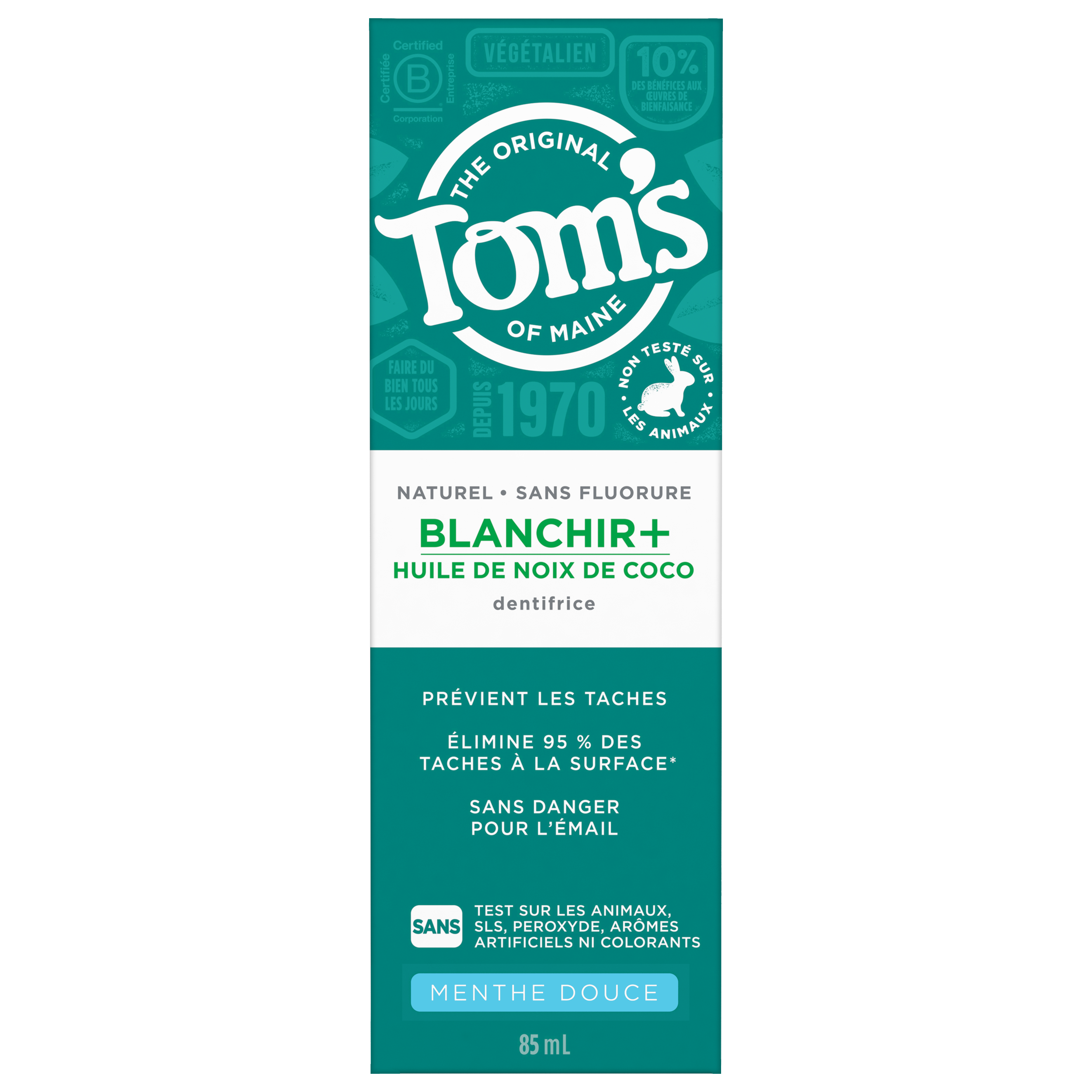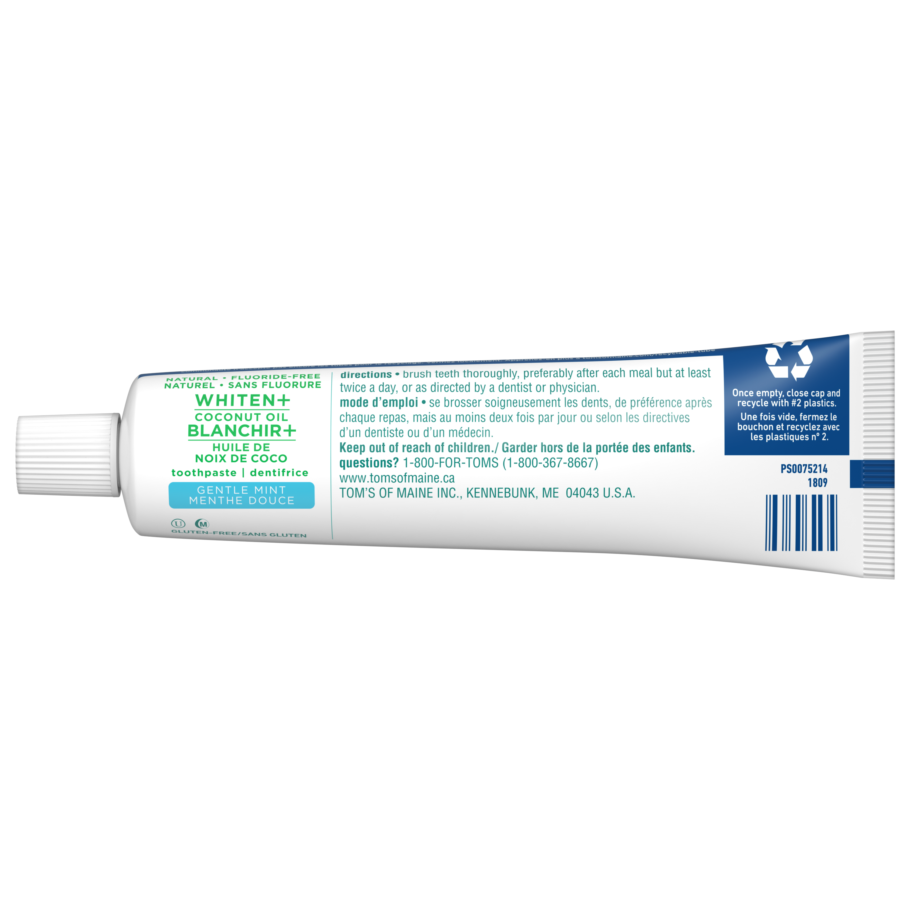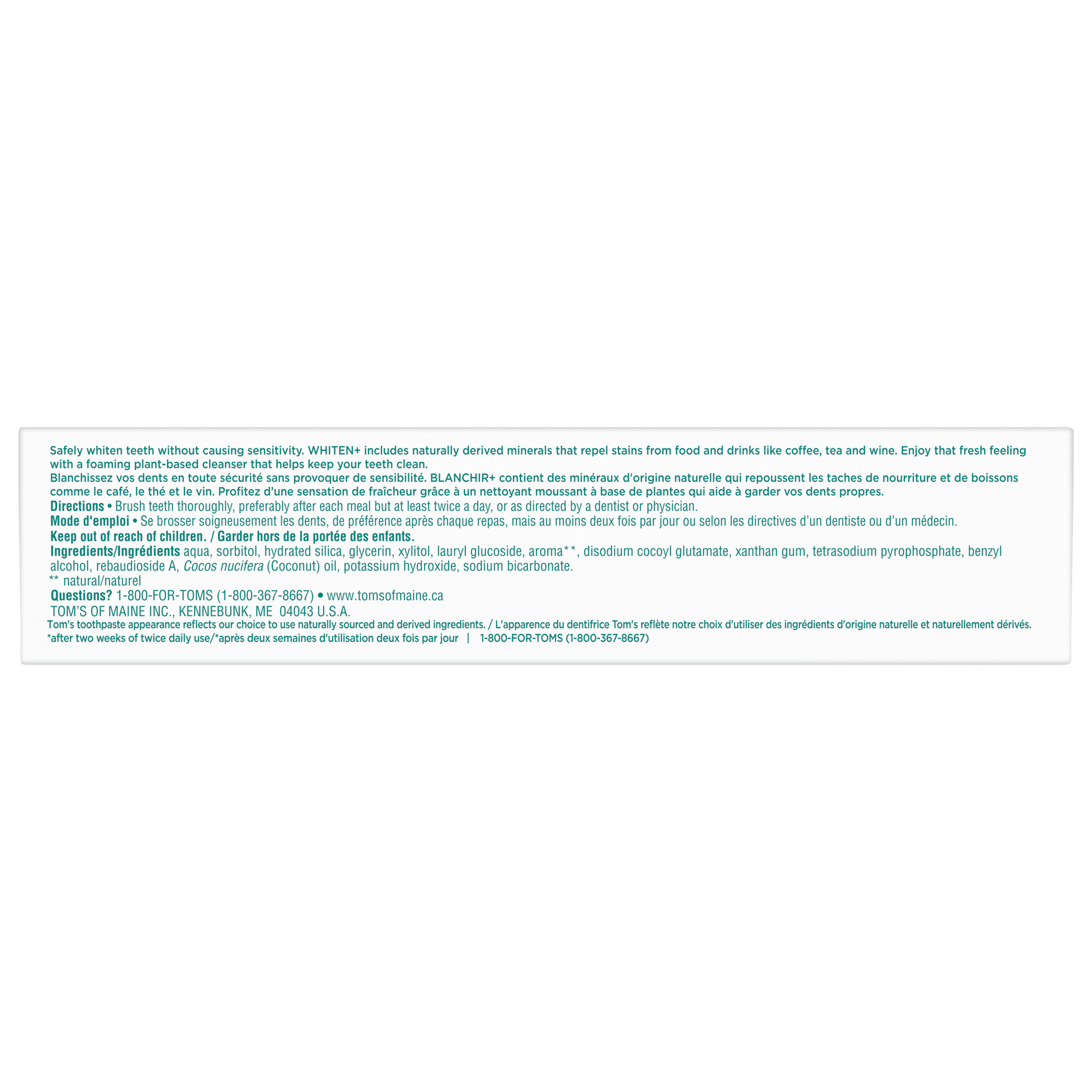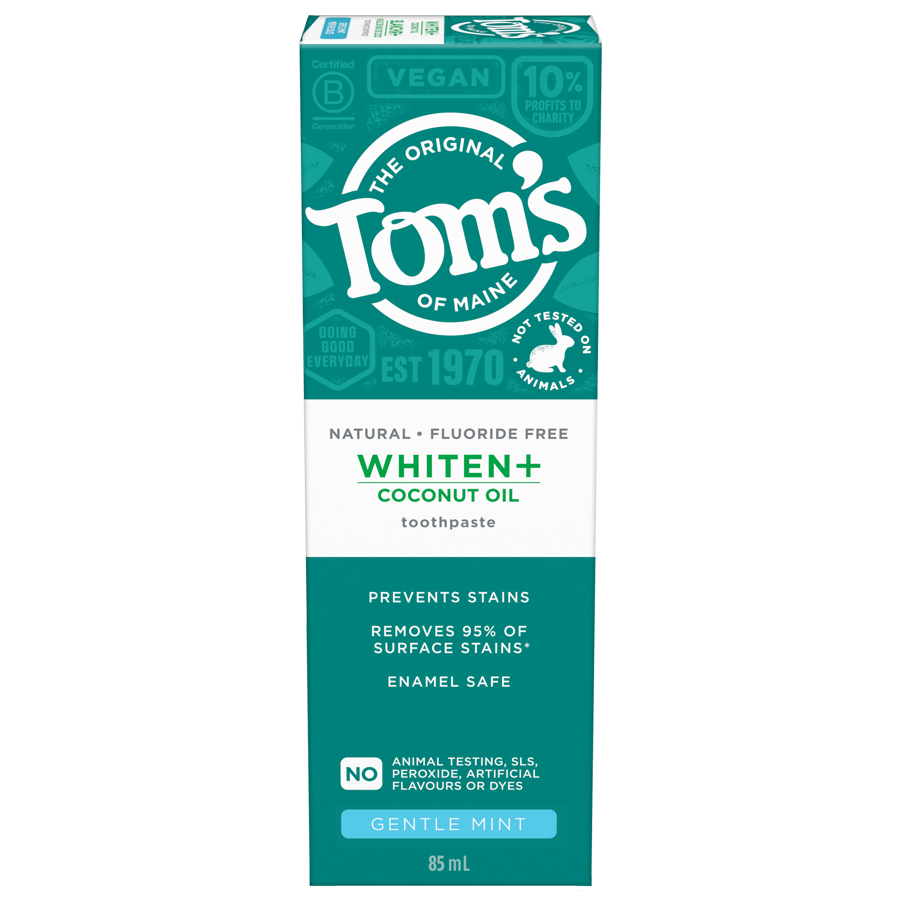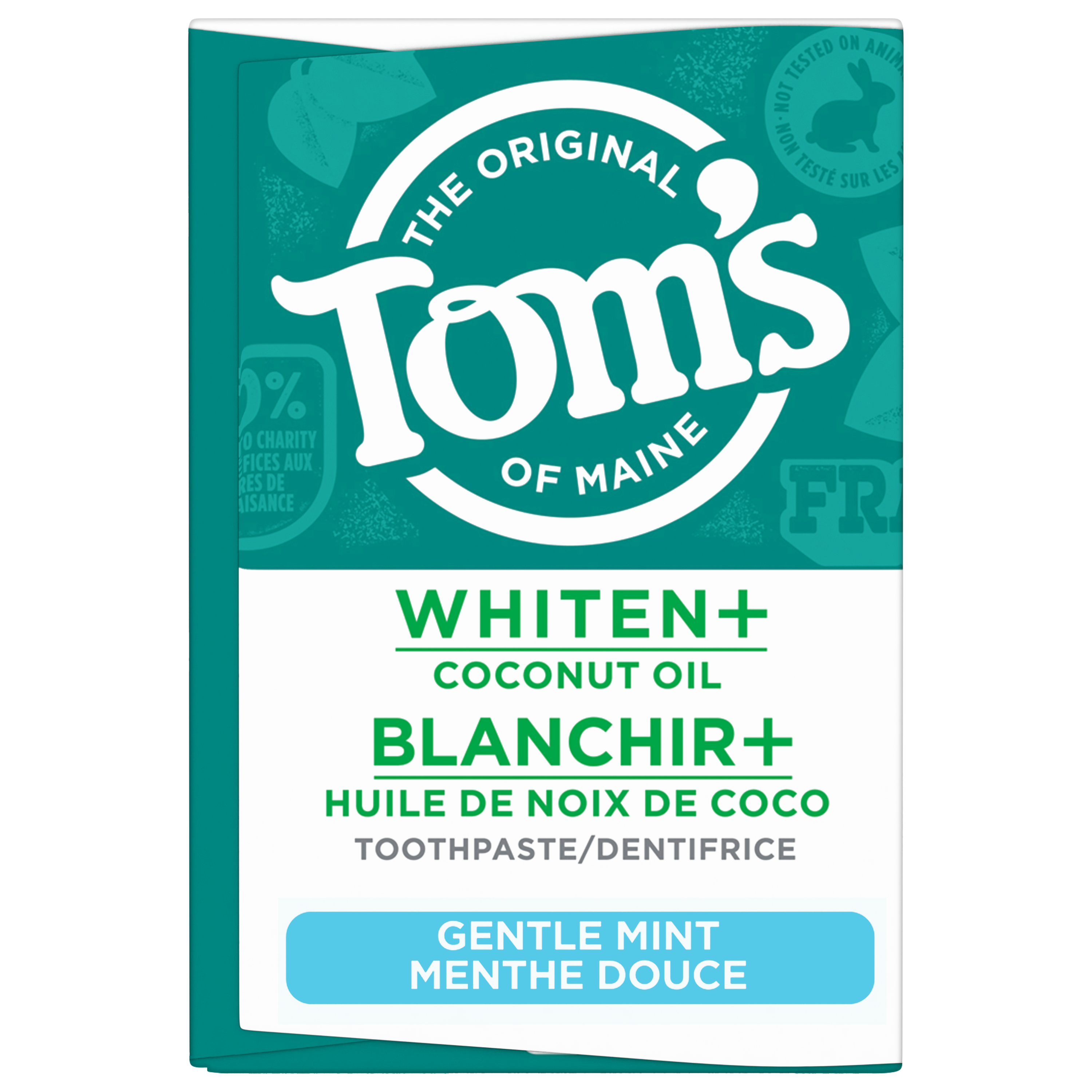OS Walmart Bullet 1 What's Inside: Includes one (1) 113 g tube of Tom’s of Maine Whiten Plus Coconut Oil Fluoride Free Toothpaste, Gentle Mint OS Walmart Bullet 2 Removes Stains: After 2 weeks of twice daily use, this whitening toothpaste removes up to 95% of surface stains to help with a whiter, brighter smile OS Walmart Bullet 3 Enamel Safe Whitening Toothpaste: This natural whitening toothpaste safely whitens teeth without causing sensitivity OS Walmart Bullet 4 Clinically Proven Whitening: Whitens teeth using plant-based cleansers and naturally derived micro-polishers that remove and prevent new stains OS Walmart Bullet 5 Natural Oral Care: Tom’s of Maine Whiten Plus Coconut Oil is not tested on animals and is made with no peroxide, artificial flavours, SLS, or dyes OS Walmart On Page Keywords fluoride free toothpaste, whitening toothpaste, vegan toothpaste, toothpaste with baking soda, coconut oil toothpaste Walmart Bullet 1 What's Inside: Includes one (1) 113 g tube of Tom’s of Maine Whiten Plus Coconut Oil Fluoride Free Toothpaste with Baking Soda, Gentle Mint Walmart Bullet 2 Removes Stains: After 2 weeks of twice daily use, this whitening toothpaste removes up to 95% of surface stains to help with a whiter, brighter smile Walmart Bullet 3 Enamel Safe Whitening Toothpaste: This natural whitening toothpaste with baking soda safely whitens teeth without causing sensitivity Walmart Bullet 4 Clinically Proven Whitening: Whitens teeth using plant-based cleansers and naturally derived micro-polishers that remove and prevent new stains Walmart Bullet 5 Natural Oral Care: Tom’s of Maine Whiten Plus Coconut Oil is not tested on animals and is made with no peroxide, artificial flavors, SLS, or dyes OS Loblaws Product Title Tom’s of Maine Whiten Plus Coconut Oil Fluoride Free Toothpaste, 113 g OS Loblaws Product Description Discover a whiter smile with Tom’s of Maine Whiten Plus Coconut Oil Fluoride Free Toothpaste. This fluoride free, enamel safe whitening toothpaste helps whiten without causing sensitivity and removes up to 95% of surface stains*. Plus, Tom’s of Maine Whiten Plus Coconut Oil Fluoride Free Toothpaste is clinically shown to prevent stains. This minty vegan toothpaste is formulated with plant-based cleansers and naturally derived micro-polishers and contains no peroxide, SLS, artificial flavours, or artificial dyes and is not tested on animals. *after 2 weeks of twice daily use OS Loblaws Bullet 1 What's Inside: Includes one (1) 113 g tube of Tom’s of Maine Whiten Plus Coconut Oil Fluoride Free Toothpaste, Gentle Mint OS Loblaws Bullet 2 Removes Stains: After 2 weeks of twice daily use, this whitening toothpaste removes up to 95% of surface stains to help with a whiter, brighter smile OS Loblaws Bullet 3 Enamel Safe Whitening Toothpaste: This natural whitening toothpaste safely whitens teeth without causing sensitivity OS Loblaws Bullet 4 Clinically Proven Whitening: Whitens teeth using plant-based cleansers and naturally derived micro-polishers that remove and prevent new stains OS Loblaws Bullet 5 Natural Oral Care: Tom’s of Maine Whiten Plus Coconut Oil is not tested on animals and is made with no peroxide, artificial flavours, SLS, or dyes