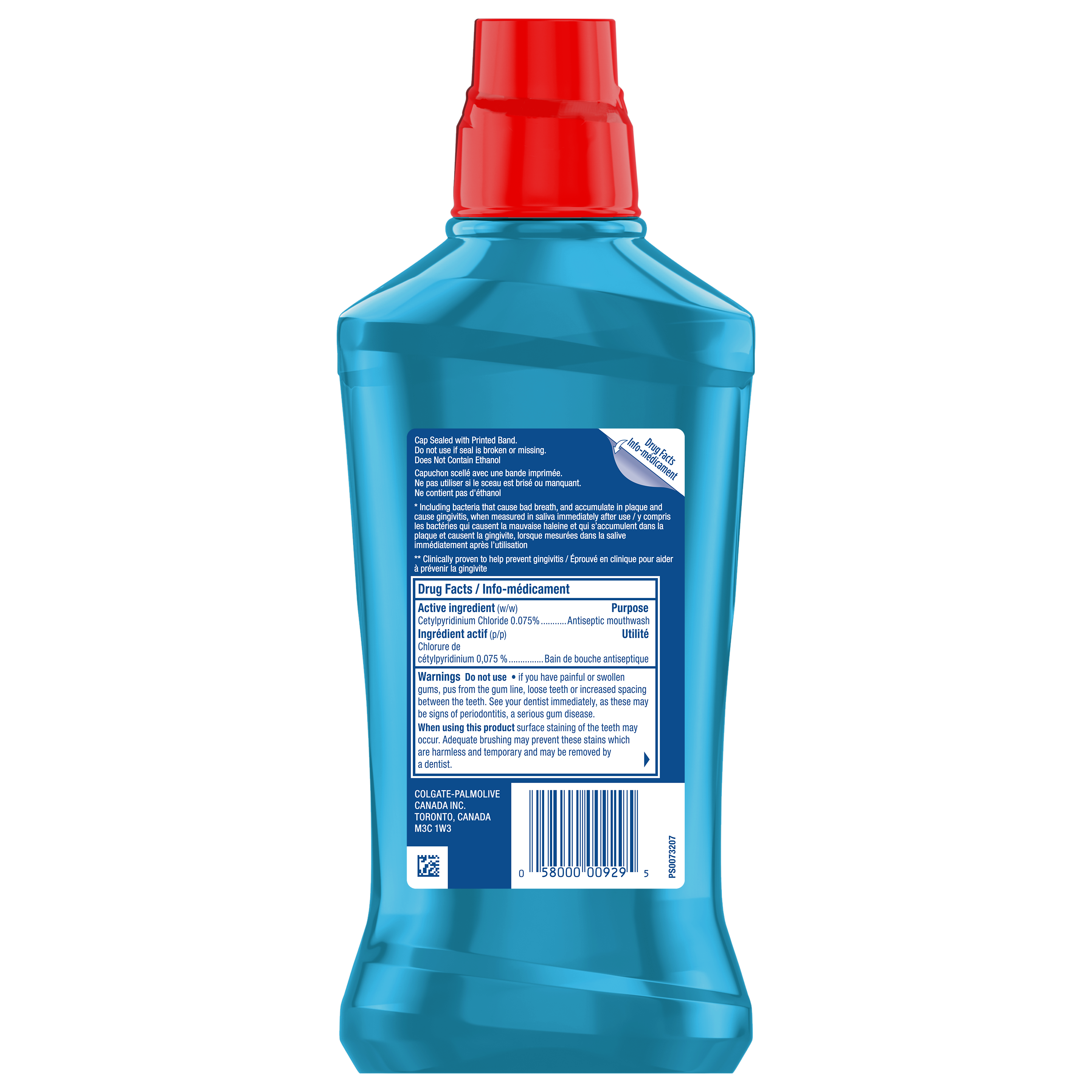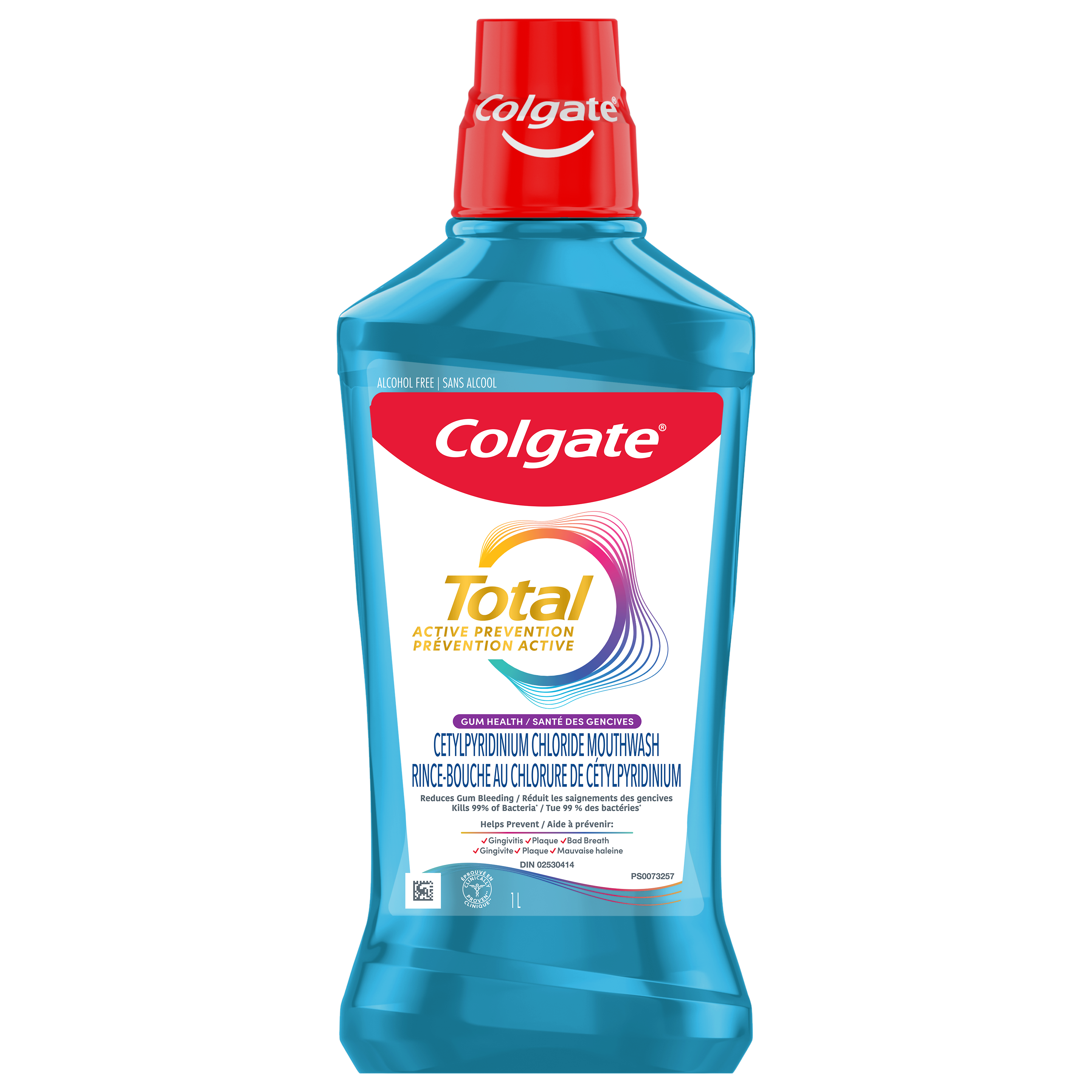 OS Walmart Bullet 1 Includes one (1) 1.0 litre bottle of Colgate Total Active Prevention Gum Health Alcohol Free Mouthwash (1), Mint OS Walmart Bullet 2 Colgate Total Active Prevention Gum Health Non Alcohol Mouthwash (1) reduces gum bleeding and kills 99% of bacteria (2) OS Walmart Bullet 3 This minty non alcohol mouthwash (1) helps prevent plaque and bad breath and is clinically proven to help prevent gingivitis OS Walmart Bullet 4 This Colgate mouthwash contains Cetylpyridinium Chloride (CPC) OS Walmart Bullet 5 Colgate Total Active Prevention Alcohol Free Gum Mouthwash (1) also contains zinc for added freshness OS Loblaws Product Title Total Active Prevention Gum Health Alcohol Free Mouthwash OS Loblaws Product Description Reduce gum bleeding and freshen breath using Colgate Total Active Prevention Gum Health Alcohol Free Mouthwash*. This minty gum mouthwash reduces gum bleeding and helps prevent gingivitis, plaque, bad breath, and kills 99% of bacteria**. Colgate Total Active Prevention Alcohol Free Mouthwash* also contains zinc for added freshness and is clinically proven to help prevent gingivitis. Colgate Total Active Prevention Alcohol Free Mouthwash* contains Cetylpyridinium Chloride (CPC). To support your oral care, try this minty CPC mouthwash in combination with Colgate Total toothpaste and the Colgate Total Active Prevention toothbrush. *does not contain ethanol **including bacteria that cause bad breath, and accumulate in plaque and cause gingivitis, when measured in saliva immediately after use OS Loblaws Bullet 1 Includes one (1) 1.0 litre bottle of Colgate Total Active Prevention Gum Health Alcohol Free Mouthwash*, Mint OS Loblaws Bullet 2 Colgate Total Active Prevention Gum Health Non Alcohol Mouthwash* reduces gum bleeding and kills 99% of bacteria** OS Loblaws Bullet 3 This minty non alcohol mouthwash* helps prevent plaque and bad breath and is clinically proven to help prevent gingivitis OS Loblaws Bullet 4 This Colgate mouthwash contains Cetylpyridinium Chloride (CPC) OS Loblaws Bullet 5 Colgate Total Active Prevention Alcohol Free Gum Mouthwash* also contains zinc for added freshness